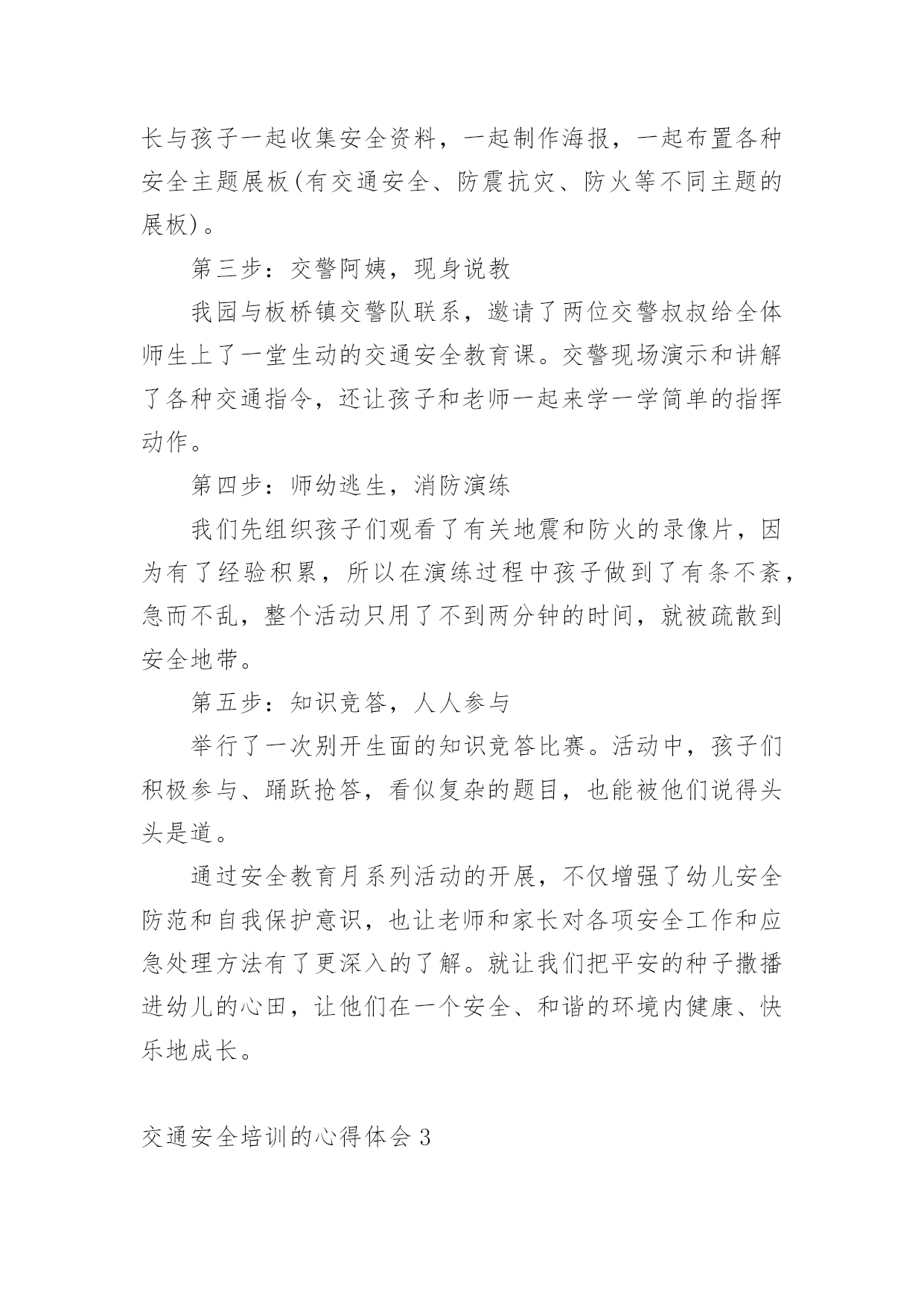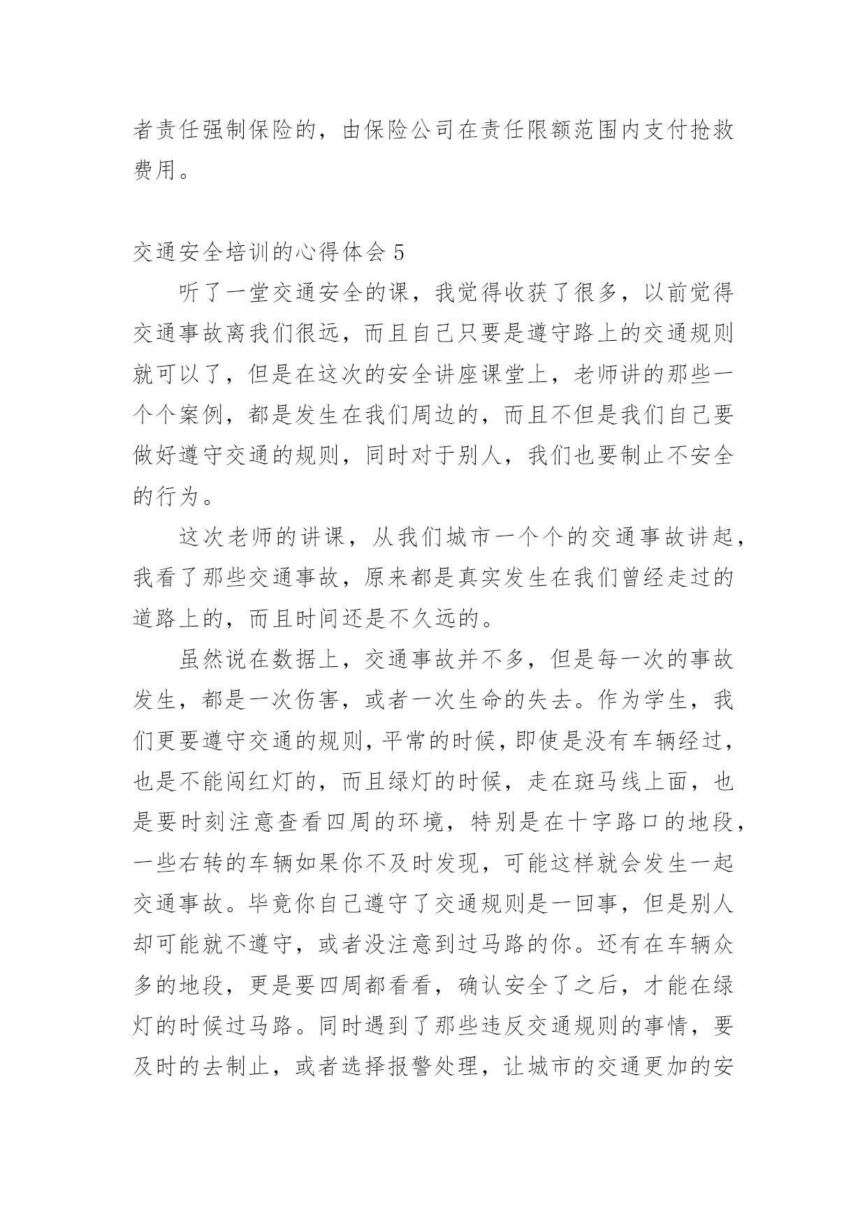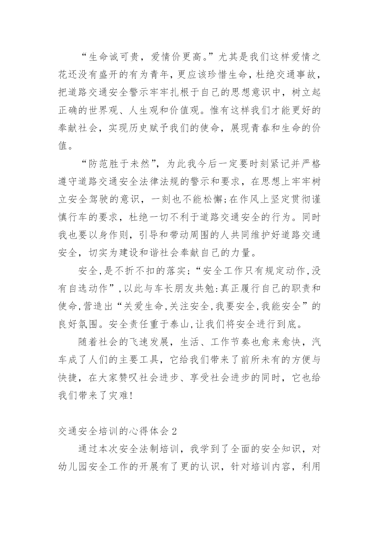交通安全培训的心得体会2021年交通安全培训的心得体会范文(精选8篇)当我们经过反思,有了新的启发时,就十分有必须要写一篇心得体会,这样有利于培养我们思考的习惯。你想好怎么写心得体会了吗?以下是小编整理的2021年交通安全培训的心得体会范文(精选8篇),仅供参考,欢迎大家阅读。交通安全培训的心得体会1汽车的出现,不但方便了人们出行、运输,还成为社会结构中身份认同的一个不可或缺的元素。时至今日,不可否认汽车推动了人类文明的发展。随着汽车逐渐普及之后,汽车和我们的生活中越来越密不可分。一直以来,我都觉得自己不会那么倒霉,交通安全事故不会找上我,我稍微注意一点就行了。学习过程中繁文缛节般的道路交通安全法律法规不免让人心生倦意,但是学习了交通安全事故案例之后,一幕幕触目惊心的事件和惨不忍睹的苦果徘徊在我的脑海久久挥之不去。这些事故无一例外都是因为忽视思想作风建设、忽略道路交通安全而引发的,事故的后果给国家和人民的生命财产造成无法弥补的重大损失。在学习道路交通安全警示的现场,我深刻体会到道路交通安全就存在于我们道路驾驶过程中的每一个细节里,稍有懈怠都有可能酿出恶果,毕竟“车祸猛于虎”。“生命诚可贵,爱情价更高。”尤其是我们这样爱情之花还没有盛开的有为青年,更应该珍惜生命,杜绝交通事故,把道路交通安全警示牢牢扎根于自己的思想意识中,树立起正确的世界观、人生观和价值观。惟有这样我们才能更好的奉献社会,实现历史赋予我们的使命,展现青春和生命的价值。“防范胜于未然”,为此我今后一定要时刻紧记并严格遵守道路交通安全法律法规的警示和要求,在思想上牢牢树立安全驾驶的意识,一刻也不能松懈;在作风上坚定贯彻谨慎行车的要求,杜绝一切不利于道路交通安全的行为。同时我也要以身作则,引导和带动周围的人共同维护好道路交通安全,切实为建设和谐社会奉献自己的力量。安全,是不折不扣的落实;“安全工作只有规定动作,没有自选动作”,以此与车长朋友共勉:真正履行自己的职责和使命,营造出“关爱生命,关注安全,我要安全,我能安全”的良好氛围。安全责任重于泰山,让我们将安全进行到底。随着社会的飞速发展,生活、工作节奏也愈来愈快,汽车成了人们的主要工具,它给我们带来了前所未有的方便与快捷,在大家赞叹社会进步、享受社会进步的同时,它也给我们带来了灾难!交通安全培训的心得体会2通过本次安全法制培训,我学到了全面的安全知识,对幼儿园安全工作的开展有了更的认识,针对培训内容,利用短暂的培训,我认真听课和做笔记,通过整个培训,深刻理解、领悟幼儿园安全对整个社会,对学校教育的重要意义。自身对幼儿园安全思想认识得到进一步提高。对安全培训的意义,自己也有全方位领悟。幼儿园安全,无小事;安全责任,重泰山。通过学习培训感触最深的一点是幼儿园的安全管理:关键在前期的预防工作,而在前期的预防工作中,除了物防、技防、人防外,更重要的是对幼儿的有效的安全教育。作为一个幼儿园教师,我再一次审视了自己的工作性质,从事幼教工作多年,幼儿的安全事故看到和听到的不少,幼儿园每次开会,不厌其烦的强调也是幼儿安全问题,而在幼儿园发生最多的就是幼儿人身伤害事故诸如:走失、摔伤、烫伤、抓伤、打伤、咬伤等等。如出现这些事故时,作为教师的我们首先必须要展现出一种专业的关爱,即能用有如父母一般的心思来爱孩子,因为爱而产生责任感,因为责任感而小心谨慎地注意和关心任何和孩子安全相关的事物,用心周到地处理孩子的问题。这样的幼儿教师,出于一种专业的关爱,对幼儿的操心和牵挂是主动的,由于发自内心的主动,所以处处能防范于未然,孩子的安全于是更有保障。其次,作为幼儿教师要了解的是幼儿意外伤害发生的一些要素是哪些,才能有针对性地加以防范。作为一名有责任心的幼儿教师,应该是充分地了解幼儿意外产生的一些相关知识,在保证幼儿安全的情况下,仍能提供给他们最大的游戏学习空间,而不是以安全为借口而限制孩子。我们应该给孩子最丰富的学习环境,努力提供各种玩具材料以满足幼儿的探索需求,但我们也应以一颗专业的关爱之心,不断观察孩子的能力和发展,以判断其是否能够进行安全的游戏。最后,要加强幼儿的安全教育。教师必须清楚地认识到,不要忽视对孩子的安全教育,因为对幼儿再多的保护措施,如果幼儿不能自我警惕也难以避免发生意外。不要因为幼儿小而不进行安全教育,在幼儿园中进行安全教育是一种渗透式的教育,如在游戏中建立一些安全规则,在操作中学会正确使用各种工具的方法等,教师适时的指导能使幼儿慢慢地建立安全的行为方式。安全教育工作一直是幼儿园工作的重中之重,平安稳定、和谐文明的幼儿园环境是幼儿园顺利开展各项工作的前提条件。我园历来重视安全教育工作,因此本学期我们把3.11——4.11定为“安全教育月”,通过围绕“增强师生防范意识,营造幼儿园安全环境”之主题,以“五步曲”的形式有序的开展