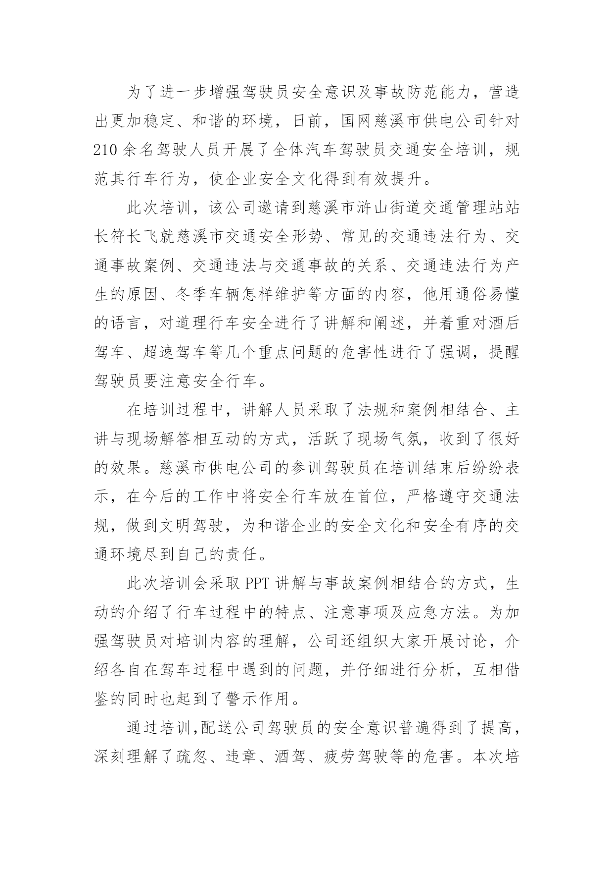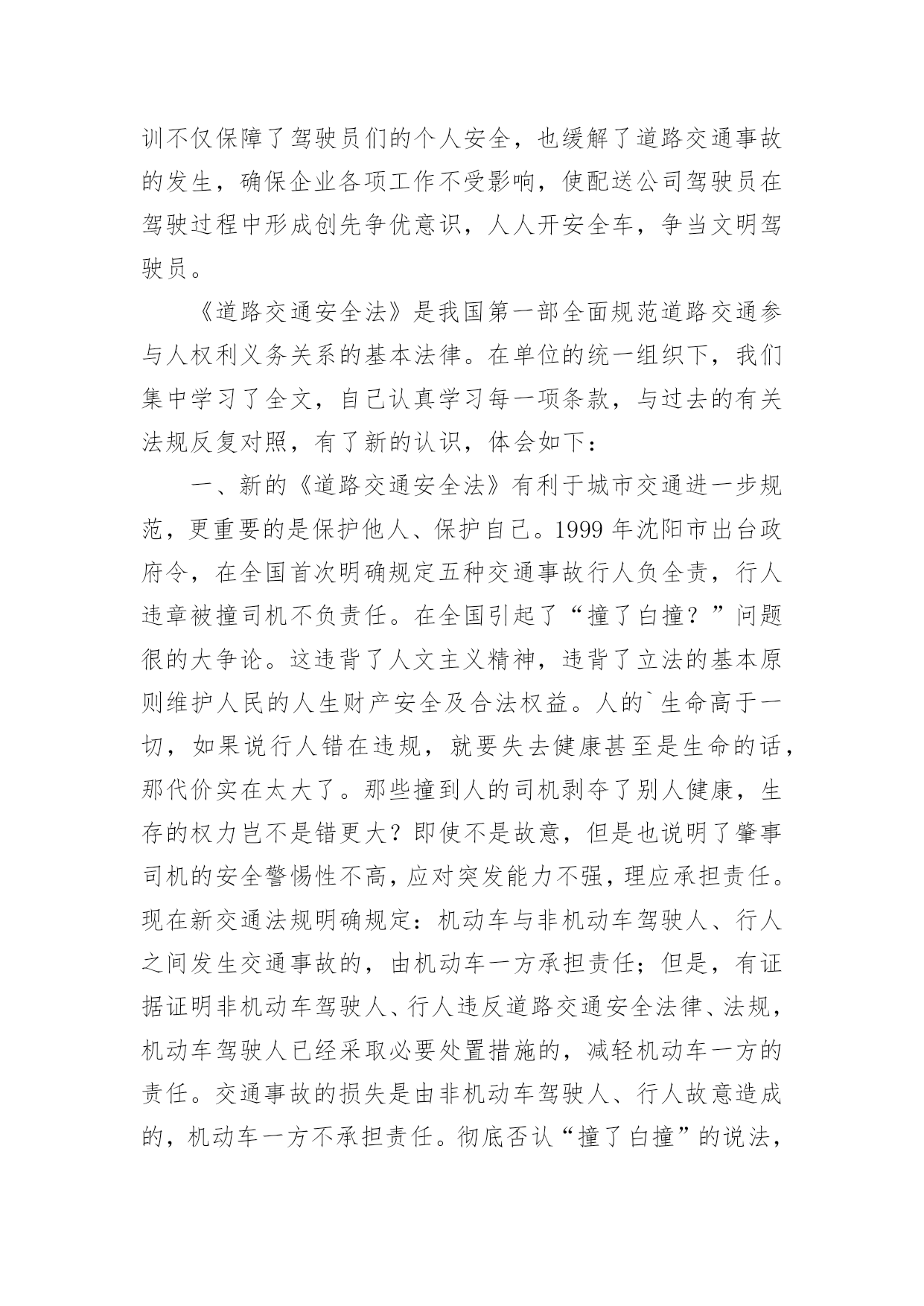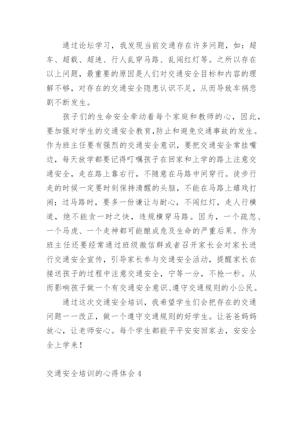 交通安全培训的心得体会2021年交通安全培训的心得体会范文(精选8篇)当我们经过反思,有了新的启发时,就十分有必须要写一篇心得体会,这样有利于培养我们思考的习惯。你想好怎么写心得体会了吗?以下是小编整理的2021年交通安全培训的心得体会范文(精选8篇),仅供参考,欢迎大家阅读。交通安全培训的心得体会1汽车的出现,不但方便了人们出行、运输,还成为社会结构中身份认同的一个不可或缺的元素。时至今日,不可否认汽车推动了人类文明的发展。随着汽车逐渐普及之后,汽车和我们的生活中越来越密不可分。一直以来,我都觉得自己不会那么倒霉,交通安全事故不会找上我,我稍微注意一点就行了。学习过程中繁文缛节般的道路交通安全法律法规不免让人心生倦意,但是学习了交通安全事故案例之后,一幕幕触目惊心的事件和惨不忍睹的苦果徘徊在我的脑海久久挥之不去。这些事故无一例外都是因为忽视思想作风建设、忽略道路交通安全而引发的,事故的后果给国家和人民的生命财产造成无法弥补的重大损失。在学习道路交通安全警示的现场,我深刻体会到道路交通安全就存在于我们道路驾驶过程中的每一个细节里,稍有懈怠都有可能酿出恶果,毕竟“车祸猛于虎”。“生命诚可贵,爱情价更高。”尤其是我们这样爱情之花还没有盛开的有为青年,更应该珍惜生命,杜绝交通事故,把道路交通安全警示牢牢扎根于自己的思想意识中,树立起正确的世界观、人生观和价值观。惟有这样我们才能更好的奉献社会,实现历史赋予我们的使命,展现青春和生命的价值。“防范胜于未然”,为此我今后一定要时刻紧记并严格遵守道路交通安全法律法规的警示和要求,在思想上牢牢树立安全驾驶的意识,一刻也不能松懈;在作风上坚定贯彻谨慎行车的要求,杜绝一切不利于道路交通安全的行为。同时我也要以身作则,引导和带动周围的人共同维护好道路交通安全,切实为建设和谐社会奉献自己的力量。安全,是不折不扣的落实;“安全工作只有规定动作,没有自选动作”,以此与车长朋友共勉:真正履行自己的职责和使命,营造出“关爱生命,关注安全,我要安全,我能安全”的良好氛围。安全责任重于泰山,让我们将安全进行到底。随着社会的飞速发展,生活、工作节奏也愈来愈快,汽车成了人们的主要工具,它给我们带来了前所未有的方便与快捷,在大家赞叹社会进步、享受社会进步的同时,它也给我们带来了灾难!交通安全培训的心得体会2通过本次安全法制培训,我学到了全面的安全知识,对幼儿园安全工作的开展有了更的认识,针对培训内容,利用短暂的培训,我认真听课和做笔记,通过整个培训,深刻理解、领悟幼儿园安全对整个社会,对学校教育的重要意义。自身对幼儿园安全思想认识得到进一步提高。对安全培训的意义,自己也有全方位领悟。幼儿园安全,无小事;安全责任,重泰山。通过学习培训感触最深的一点是幼儿园的安全管理:关键在前期的预防工作,而在前期的预防工作中,除了物防、技防、人防外,更重要的是对幼儿的有效的安全教育。作为一个幼儿园教师,我再一次审视了自己的工作性质,从事幼教工作多年,幼儿的安全事故看到和听到的不少,幼儿园每次开会,不厌其烦的强调也是幼儿安全问题,而在幼儿园发生最多的就是幼儿人身伤害事故诸如:走失、摔伤、烫伤、抓伤、打伤、咬伤等等。如出现这些事故时,作为教师的我们首先必须要展现出一种专业的关爱,即能用有如父母一般的心思来爱孩子,因为爱而产生责任感,因为责任感而小心谨慎地注意和关心任何和孩子安全相关的事物,用心周到地处理孩子的问题。这样的幼儿教师,出于一种专业的关爱,对幼儿的操心和牵挂是主动的,由于发自内心的主动,所以处处能防范于未然,孩子的安全于是更有保障。其次,作为幼儿教师要了解的是幼儿意外伤害发生的一些要素是哪些,才能有针对性地加以防范。作为一名有责任心的幼儿教师,应该是充分地了解幼儿意外产生的一些相关知识,在保证幼儿安全的情况下,仍能提供给他们最大的游戏学习空间,而不是以安全为借口而限制孩子。我们应该给孩子最丰富的学习环境,努力提供各种玩具材料以满足幼儿的探索需求,但我们也应以一颗专业的关爱之心,不断观察孩子的能力和发展,以判断其是否能够进行安全的游戏。最后,要加强幼儿的安全教育。教师必须清楚地认识到,不要忽视对孩子的安全教育,因为对幼儿再多的保护措施,如果幼儿不能自我警惕也难以避免发生意外。不要因为幼儿小而不进行安全教育,在幼儿园中进行安全教育是一种渗透式的教育,如在游戏中建立一些安全规则,在操作中学会正确使用各种工具的方法等,教师适时的指导能使幼儿慢慢地建立安全的行为方式。安全教育工作一直是幼儿园工作的重中之重,平安稳定、和谐文明的幼儿园环境是幼儿园顺利开展各项工作的前提条件。我园历来重视安全教育工作,因此本学期我们把3.11——4.11定为“安全教育月”,通过围绕“增强师生防范意识,营造幼儿园安全环境”之主题,以“五步曲”的形式有序的开展