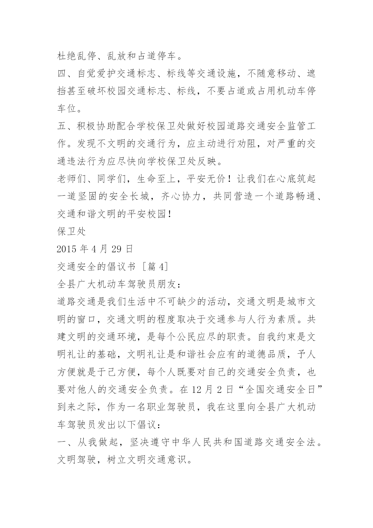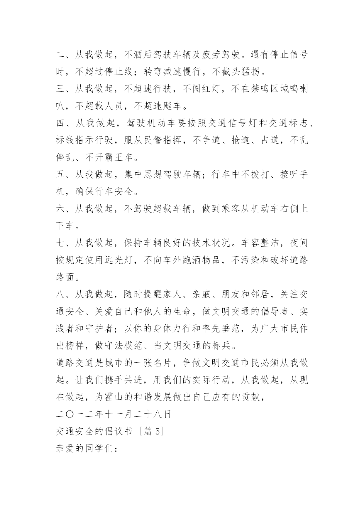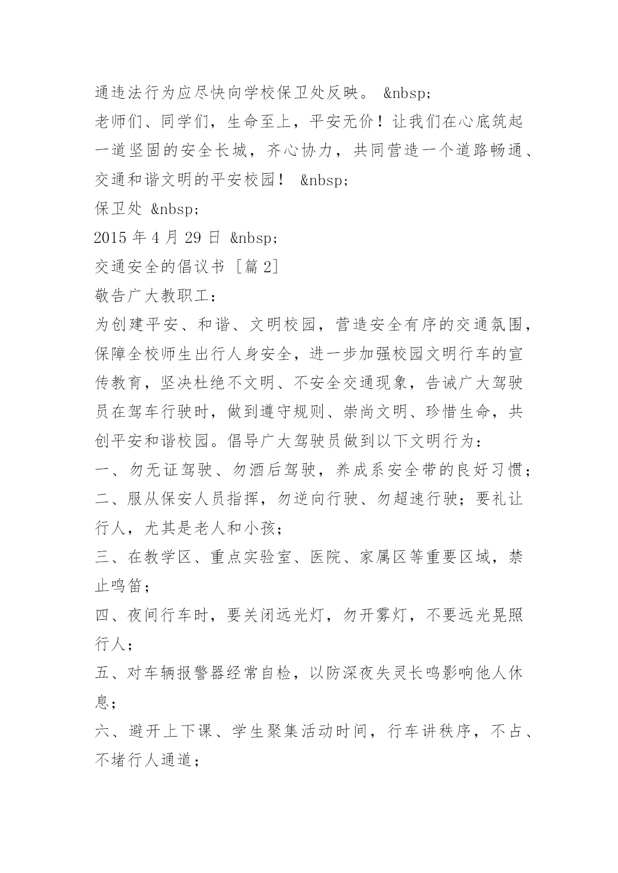 交通安全的倡议书交通安全的倡议书全校师生员工: 为了营造一个良好的校园环境,增强我校师生员工的交通安全意识,规范校园交通安全秩序,保障广大师生员工的人身、财产安全。针对近期校园内部分车辆车速过快、乱鸣笛、不按要求停放车辆等安全隐患问题,学校保卫处特向全体师生员工发出如下倡议: 一、认真学习各种有关交通安全的法律、法规和规章制度,树立交通安全文明意识,增强交通法制观念,为营造平安和谐的校园环境尽到责任。 二、抵制外来、违规车辆进入校园,请大家带好通行证,通行证请不要外借。 三、驾驶车辆须遵章守法,谨慎驾驶。严禁酒后驾车、无证驾驶、超速行驶、飙车以及在校园内违规学习驾驶机动车辆等存在严重安全隐患的行为。校园内所有车辆应低速行驶、主动避让行人、禁止鸣笛。车辆要停放到校园内指定地点,杜绝乱停、乱放和占道停车。 四、自觉爱护交通标志、标线等交通设施,不随意移动、遮挡甚至破坏校园交通标志、标线,不要占道或占用机动车停车位。 五、积极协助配合学校保卫处做好校园道路交通安全监管工作。发现不文明的交通行为,应主动进行劝阻,对严重的交通违法行为应尽快向学校保卫处反映。 老师们、同学们,生命至上,平安无价!让我们在心底筑起一道坚固的安全长城,齐心协力,共同营造一个道路畅通、交通和谐文明的平安校园! 保卫处 2015年4月29日 交通安全的倡议书[篇2]敬告广大教职工:为创建平安、和谐、文明校园,营造安全有序的交通氛围,保障全校师生出行人身安全,进一步加强校园文明行车的宣传教育,坚决杜绝不文明、不安全交通现象,告诫广大驾驶员在驾车行驶时,做到遵守规则、崇尚文明、珍惜生命,共创平安和谐校园。倡导广大驾驶员做到以下文明行为:一、勿无证驾驶、勿酒后驾驶,养成系安全带的良好习惯;二、服从保安人员指挥,勿逆向行驶、勿超速行驶;要礼让行人,尤其是老人和小孩;三、在教学区、重点实验室、医院、家属区等重要区域,禁止鸣笛;四、夜间行车时,要关闭远光灯,勿开雾灯,不要远光晃照行人;五、对车辆报警器经常自检,以防深夜失灵长鸣影响他人休息;六、避开上下课、学生聚集活动时间,行车讲秩序,不占、不堵行人通道;七、在雨雪天气行车时,要减速慢行,以防泥水飞溅,损及他人;八、不从车窗往外随意扔果皮、纸张等垃圾物品;九、在15号主楼四周,按规定交通线路行驶,按划定车位和指示箭头停放车辆,确保办公大楼外整体的停车秩序和对外窗口形象;十、在学校重大活动中,提倡绿色出行、缓解交通压力。请遵守交通规则,关爱生命,平安出行!携手共创美好明天!交通安全的倡议书[篇3]全校师生员工:为了营造一个良好的校园环境,增强我校师生员工的交通安全意识,规范校园交通安全秩序,保障广大师生员工的人身、财产安全。针对近期校园内部分车辆车速过快、乱鸣笛、不按要求停放车辆等安全隐患问题,学校保卫处特向全体师生员工发出如下倡议:一、认真学习各种有关交通安全的法律、法规和规章制度,树立交通安全文明意识,增强交通法制观念,为营造平安和谐的校园环境尽到责任。二、抵制外来、违规车辆进入校园,请大家带好通行证,通行证请不要外借。三、驾驶车辆须遵章守法,谨慎驾驶。严禁酒后驾车、无证驾驶、超速行驶、飙车以及在校园内违规学习驾驶机动车辆等存在严重安全隐患的行为。校园内所有车辆应低速行驶、主动避让行人、禁止鸣笛。车辆要停放到校园内指定地点,杜绝乱停、乱放和占道停车。四、自觉爱护交通标志、标线等交通设施,不随意移动、遮挡甚至破坏校园交通标志、标线,不要占道或占用机动车停车位。五、积极协助配合学校保卫处做好校园道路交通安全监管工作。发现不文明的交通行为,应主动进行劝阻,对严重的交通违法行为应尽快向学校保卫处反映。老师们、同学们,生命至上,平安无价!让我们在心底筑起一道坚固的安全长城,齐心协力,共同营造一个道路畅通、交通和谐文明的平安校园!保卫处2015年4月29日交通安全的倡议书[篇4]全县广大机动车驾驶员朋友:道路交通是我们生活中不可缺少的活动,交通文明是城市文明的窗口,交通文明的程度取决于交通参与人行为素质。共建文明的交通环境,是每个公民应尽的职责。自我约束是文明礼让的基础,文明礼让是和谐社会应有的道德品质,予人方便就是于己方便,每个人既要对自己的交通安全负责,也要对他人的交通安全负责。在12月2日“全国交通安全日”到来之际,作为一名职业驾驶员,我在这里向全县广大机动车驾驶员发出以下倡议:一、从我做起,坚决遵守中华人民共和国道路交通安全法。文明驾驶,树立文明交通意识。二、从我做起,不酒后驾驶车辆及疲劳驾驶。遇有停止信号时,不超过停止线;转弯减速慢行,不截头猛拐。三、从我做起,不超速行驶,不闯红灯,不在禁鸣区域鸣喇叭,不超载人员,不超速飚
