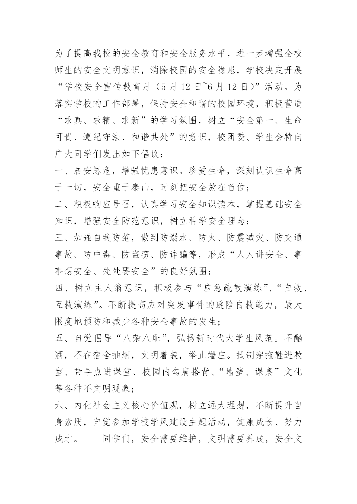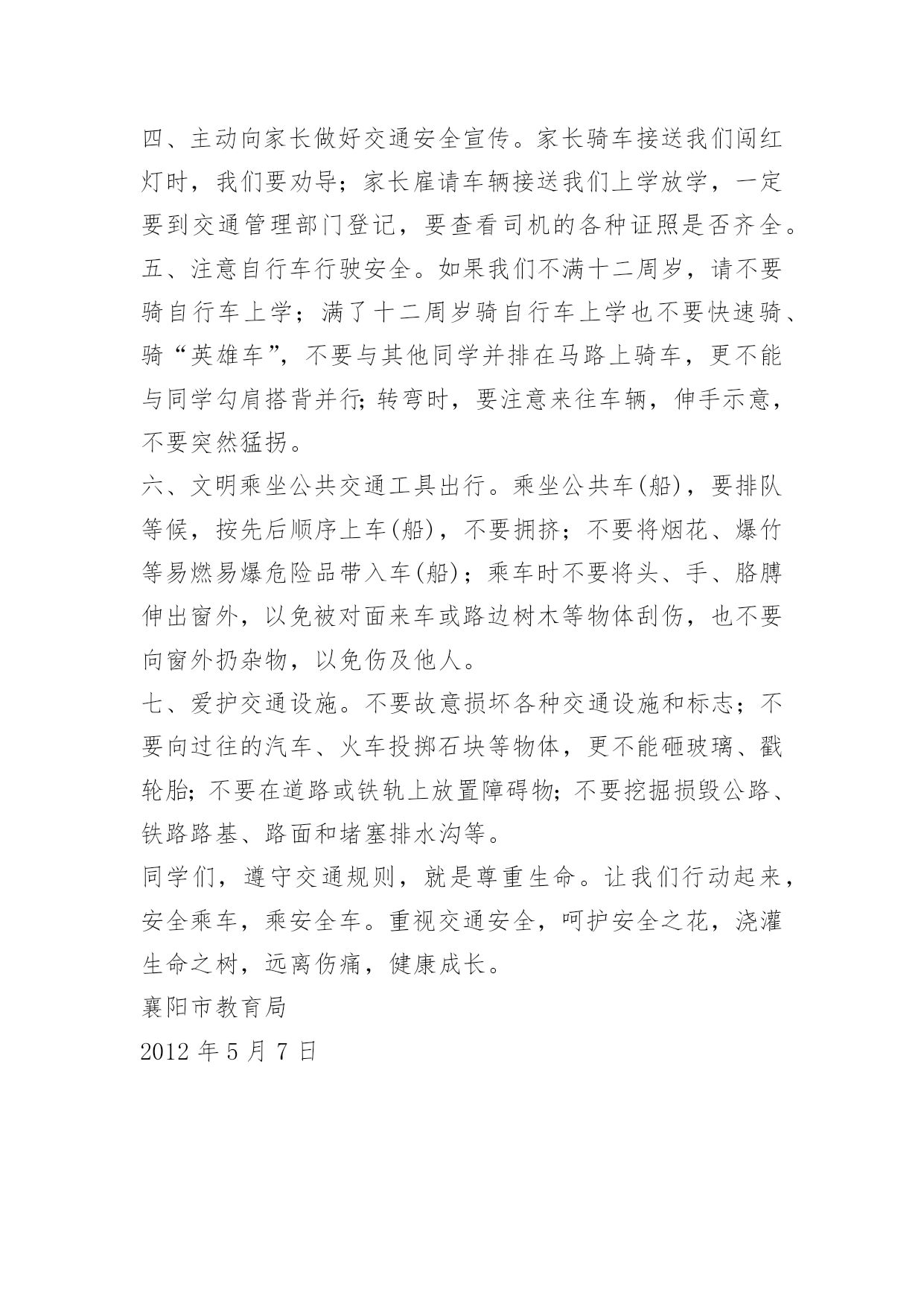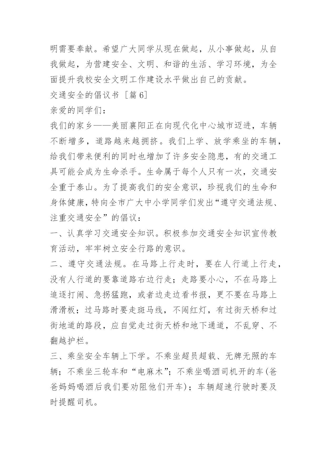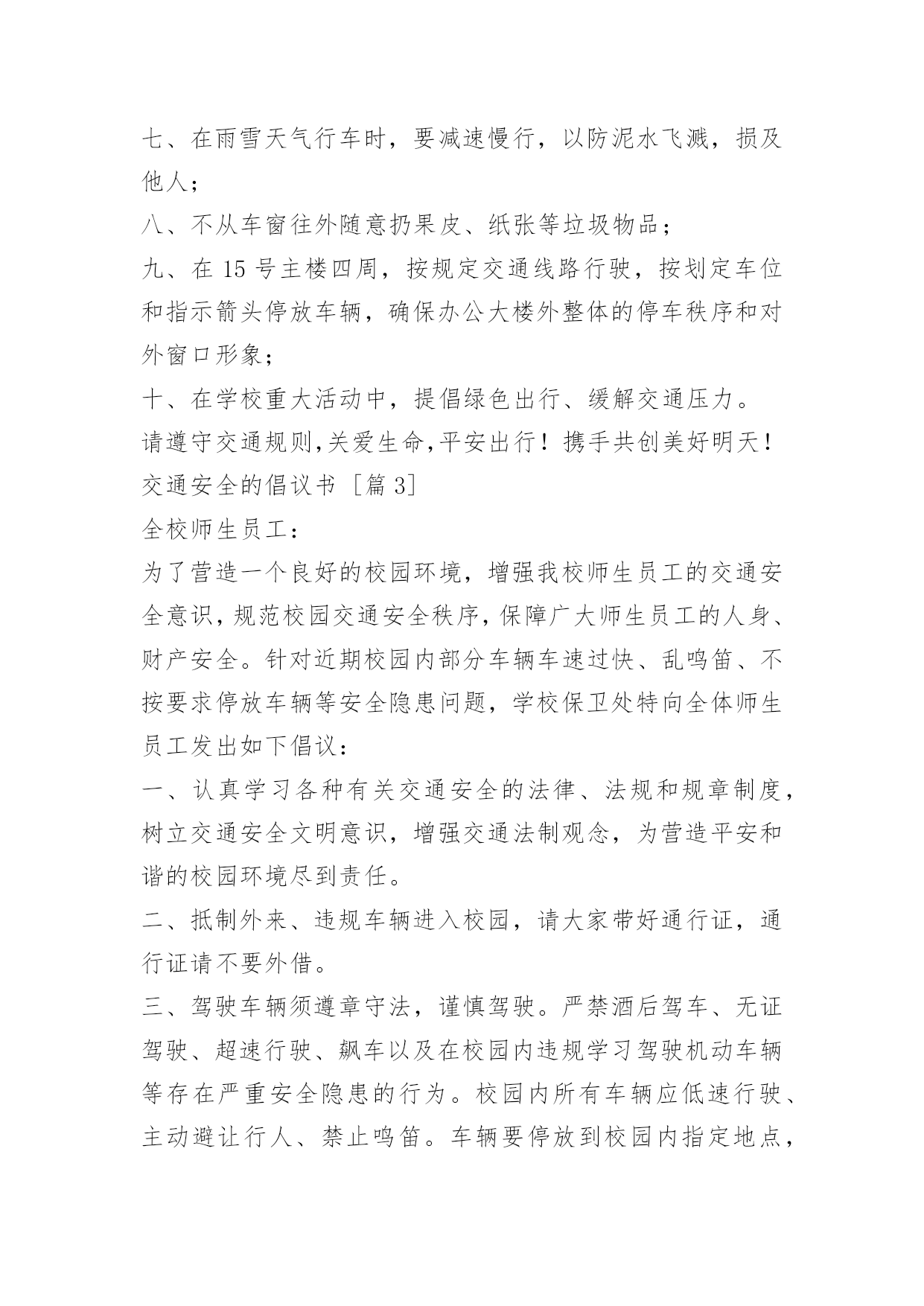 交通安全的倡议书交通安全的倡议书全校师生员工: 为了营造一个良好的校园环境,增强我校师生员工的交通安全意识,规范校园交通安全秩序,保障广大师生员工的人身、财产安全。针对近期校园内部分车辆车速过快、乱鸣笛、不按要求停放车辆等安全隐患问题,学校保卫处特向全体师生员工发出如下倡议: 一、认真学习各种有关交通安全的法律、法规和规章制度,树立交通安全文明意识,增强交通法制观念,为营造平安和谐的校园环境尽到责任。 二、抵制外来、违规车辆进入校园,请大家带好通行证,通行证请不要外借。 三、驾驶车辆须遵章守法,谨慎驾驶。严禁酒后驾车、无证驾驶、超速行驶、飙车以及在校园内违规学习驾驶机动车辆等存在严重安全隐患的行为。校园内所有车辆应低速行驶、主动避让行人、禁止鸣笛。车辆要停放到校园内指定地点,杜绝乱停、乱放和占道停车。 四、自觉爱护交通标志、标线等交通设施,不随意移动、遮挡甚至破坏校园交通标志、标线,不要占道或占用机动车停车位。 五、积极协助配合学校保卫处做好校园道路交通安全监管工作。发现不文明的交通行为,应主动进行劝阻,对严重的交通违法行为应尽快向学校保卫处反映。 老师们、同学们,生命至上,平安无价!让我们在心底筑起一道坚固的安全长城,齐心协力,共同营造一个道路畅通、交通和谐文明的平安校园! 保卫处 2015年4月29日 交通安全的倡议书[篇2]敬告广大教职工:为创建平安、和谐、文明校园,营造安全有序的交通氛围,保障全校师生出行人身安全,进一步加强校园文明行车的宣传教育,坚决杜绝不文明、不安全交通现象,告诫广大驾驶员在驾车行驶时,做到遵守规则、崇尚文明、珍惜生命,共创平安和谐校园。倡导广大驾驶员做到以下文明行为:一、勿无证驾驶、勿酒后驾驶,养成系安全带的良好习惯;二、服从保安人员指挥,勿逆向行驶、勿超速行驶;要礼让行人,尤其是老人和小孩;三、在教学区、重点实验室、医院、家属区等重要区域,禁止鸣笛;四、夜间行车时,要关闭远光灯,勿开雾灯,不要远光晃照行人;五、对车辆报警器经常自检,以防深夜失灵长鸣影响他人休息;六、避开上下课、学生聚集活动时间,行车讲秩序,不占、不堵行人通道;七、在雨雪天气行车时,要减速慢行,以防泥水飞溅,损及他人;八、不从车窗往外随意扔果皮、纸张等垃圾物品;九、在15号主楼四周,按规定交通线路行驶,按划定车位和指示箭头停放车辆,确保办公大楼外整体的停车秩序和对外窗口形象;十、在学校重大活动中,提倡绿色出行、缓解交通压力。请遵守交通规则,关爱生命,平安出行!携手共创美好明天!交通安全的倡议书[篇3]全校师生员工:为了营造一个良好的校园环境,增强我校师生员工的交通安全意识,规范校园交通安全秩序,保障广大师生员工的人身、财产安全。针对近期校园内部分车辆车速过快、乱鸣笛、不按要求停放车辆等安全隐患问题,学校保卫处特向全体师生员工发出如下倡议:一、认真学习各种有关交通安全的法律、法规和规章制度,树立交通安全文明意识,增强交通法制观念,为营造平安和谐的校园环境尽到责任。二、抵制外来、违规车辆进入校园,请大家带好通行证,通行证请不要外借。三、驾驶车辆须遵章守法,谨慎驾驶。严禁酒后驾车、无证驾驶、超速行驶、飙车以及在校园内违规学习驾驶机动车辆等存在严重安全隐患的行为。校园内所有车辆应低速行驶、主动避让行人、禁止鸣笛。车辆要停放到校园内指定地点,杜绝乱停、乱放和占道停车。四、自觉爱护交通标志、标线等交通设施,不随意移动、遮挡甚至破坏校园交通标志、标线,不要占道或占用机动车停车位。五、积极协助配合学校保卫处做好校园道路交通安全监管工作。发现不文明的交通行为,应主动进行劝阻,对严重的交通违法行为应尽快向学校保卫处反映。老师们、同学们,生命至上,平安无价!让我们在心底筑起一道坚固的安全长城,齐心协力,共同营造一个道路畅通、交通和谐文明的平安校园!保卫处2015年4月29日交通安全的倡议书[篇4]全县广大机动车驾驶员朋友:道路交通是我们生活中不可缺少的活动,交通文明是城市文明的窗口,交通文明的程度取决于交通参与人行为素质。共建文明的交通环境,是每个公民应尽的职责。自我约束是文明礼让的基础,文明礼让是和谐社会应有的道德品质,予人方便就是于己方便,每个人既要对自己的交通安全负责,也要对他人的交通安全负责。在12月2日“全国交通安全日”到来之际,作为一名职业驾驶员,我在这里向全县广大机动车驾驶员发出以下倡议:一、从我做起,坚决遵守中华人民共和国道路交通安全法。文明驾驶,树立文明交通意识。二、从我做起,不酒后驾驶车辆及疲劳驾驶。遇有停止信号时,不超过停止线;转弯减速慢行,不截头猛拐。三、从我做起,不超速行驶,不闯红灯,不在禁鸣区域鸣喇叭,不超载人员,不超速飚