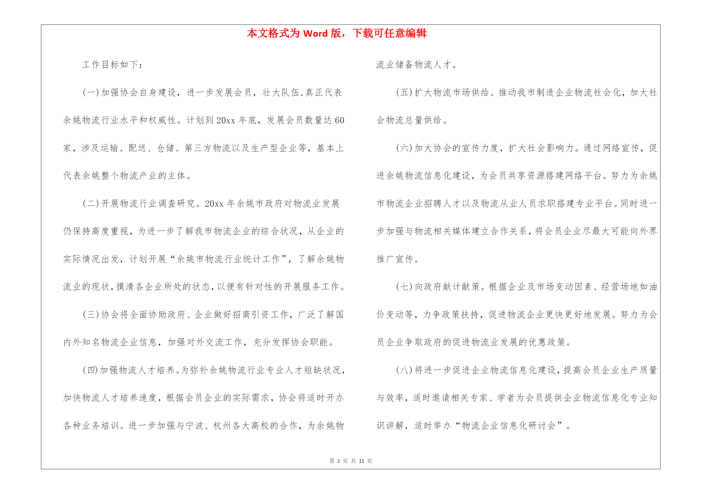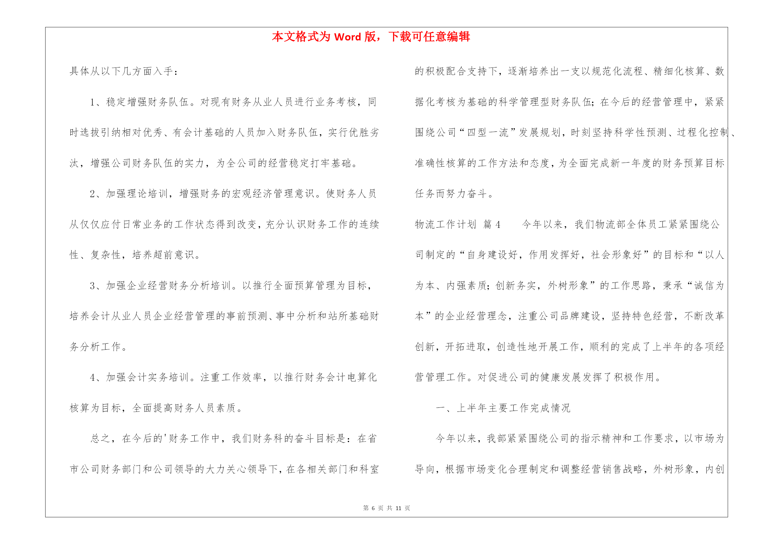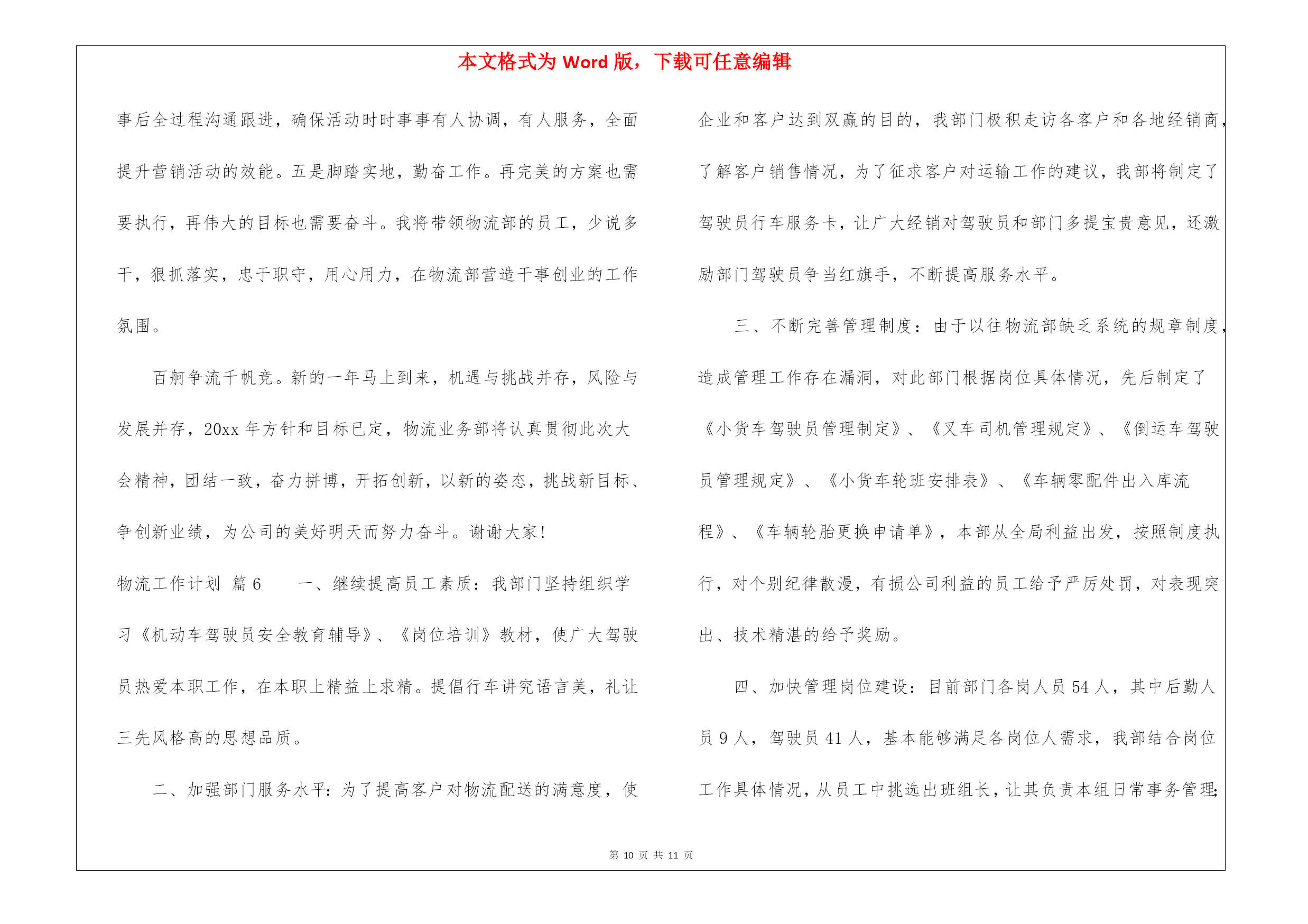 本文格式为Word版,下载可任意编辑第PAGE\*MERGEFORMAT11页共NUMPAGES\*MERGEFORMAT11页物流工作计划6篇物流工作计划6篇日子在弹指一挥间就毫无声息的流逝,我们又将迎来新的喜悦、新的收获,写一份计划,为接下来的工作做准备吧!什么样的计划才是有效的呢?下面是我为大家编写的物流工作计划6篇,欢迎大家分享。物流工作计划篇1作为一名火腿肠生产公司的生产车间的物流人员,我深深地感受到这一行业蕴藏的巨大知识财富。过去一年,我在工作岗位上没有做的非常好,工作当中存在很多不足与缺点,在一定程度上让领导感到失望。对于,我详细制定了生产车间物流工作计划,以求最大程度上避免工作当中的问题。如下:第一,加强生产车间物流工作的思想觉悟建设。生产车间物流工作是一项非常注重严谨的工作,要我们这样每一名参与其中的员工懂得以客观、认真的态度面对。第二,加强物流工作当中的防盗工作。生产车间到物流部门期间环节是企业最易失窃的环节,今年已经发生过失窃事故多起,为此今年我部门必须切身加强生产车间物流防盗工作。第三,定期开展物流工作培训工作汇报会议。在会议上就工作当中容易产生的问题展开讨论,对于一些细节加强沟通与交流。以上就是生产车间物流20xx年的工作计划了。物流工作计划篇2物流协会成立初始,还存在着不足之处。协会力争在新的一年里,围绕余姚市政府新物流发展规划的实施以及急需解决的问题,推动企业在新的政策环境下做大做强,从而带动整个余姚物流业健康、规范的发展。为此,现将《余姚市物流协会20xx年工作计划(草案)》制定如下,请大家多提宝贵意见,共同促进协会工作顺利、有效开展。工作目标如下:(一)加强协会自身建设,进一步发展会员,壮大队伍,真正代表余姚物流行业水平和权威性。计划到20xx年底,发展会员数量达60家,涉及运输、配送、仓储、第三方物流以及生产型企业等,基本上代表余姚整个物流产业的主体。(二)开展物流行业调查研究。20xx年余姚市政府对物流业发展仍保持高度重视,为进一步了解我市物流企业的综合状况,从企业的实际情况出发,计划开展“余姚市物流行业统计工作”,了解余姚物流业的现状,摸清各企业所处的状态,以便有针对性的开展服务工作。(三)协会将全面协助政府、企业做好招商引资工作,广泛了解国内外知名物流企业信息,加强对外交流工作,充分发挥协会职能。(四)加强物流人才培养。为弥补余姚物流行业专业人才短缺状况,加快物流人才培养速度,根据会员企业的实际需求,协会将适时开办各种业务培训。进一步加强与宁波、杭州各大高校的合作,为余姚物流业储备物流人才。(五)扩大物流市场供给。推动我市制造企业物流社会化,加大社会物流总量供给。(六)加大协会的宣传力度,扩大社会影响力。通过网络宣传,促进余姚物流信息化建设,为会员共享资源搭建网络平台。努力为余姚市物流企业招聘人才以及物流从业人员求职搭建专业平台。同时进一步加强与物流相关媒体建立合作关系,将会员企业尽最大可能向外界推广宣传。(七)向政府献计献策。根据企业及市场变动因素、经营场地如油价变动等,力争政策扶持,促进物流企业更快更好地发展。努力为会员企业争取政府的促进物流业发展的优惠政策。(八)将进一步促进企业物流信息化建设,提高会员企业生产质量与效率,适时邀请相关专家、学者为会员提供企业物流信息化专业知识讲解,适时举办“物流企业信息化研讨会”。(九)加强协会间合作。加强与其他物流协会、联合会的联系,构筑合作联盟,寻求与较发达城市物流人才、物流信息化等多方面的交流。(十)协会将创建简报——“余姚物流”,将最新的物流信息、政策法规、专业知识等定期向会员传播,使会员及时掌握行业动态、前沿信息。具体工作安排如下:1、组织物流人才培训:参加20xx年国家级物流师考试培训(培训时间:20xx.5)2、组织外出考察3、开展调查研究4、政府宣传推广5、进行横向协会合作,参与兄弟协会间交流与合作6、参加各类物流相关业务的的宣传推介会7、其他日常工作同志们,在新的一年里,我们将放眼世界,展望未来,全力以赴协助会员企业做大做强,共同推动余姚现代物流业跃上新台阶。物流工作计划篇3在新的一年里,财务科将一如既往的紧紧围绕公司的总体经营思路,从严管理,积极为公司领导经营决策当好参谋,具体有以下20xx年财务工作计划安排。一、财务工作计划要顾全大局,服从领导,坚定目标不动摇。年初财务预算,是通过公司职代会集体意见表决制订的,它反映了公司新的一年总体经营目标和任务。财务科全体人员要端正态度,积极发挥主观能动性,时刻坚持以公司大局为重,不折不扣的完成公司安排的各项工作任务。1、按财务预算科学合理安排调度资金,充分发挥资金利用效率。平时要积极提供全面、准确的经济分析和建议,为公司领导决策当好参谋。2、积极争取政策。积极利用行