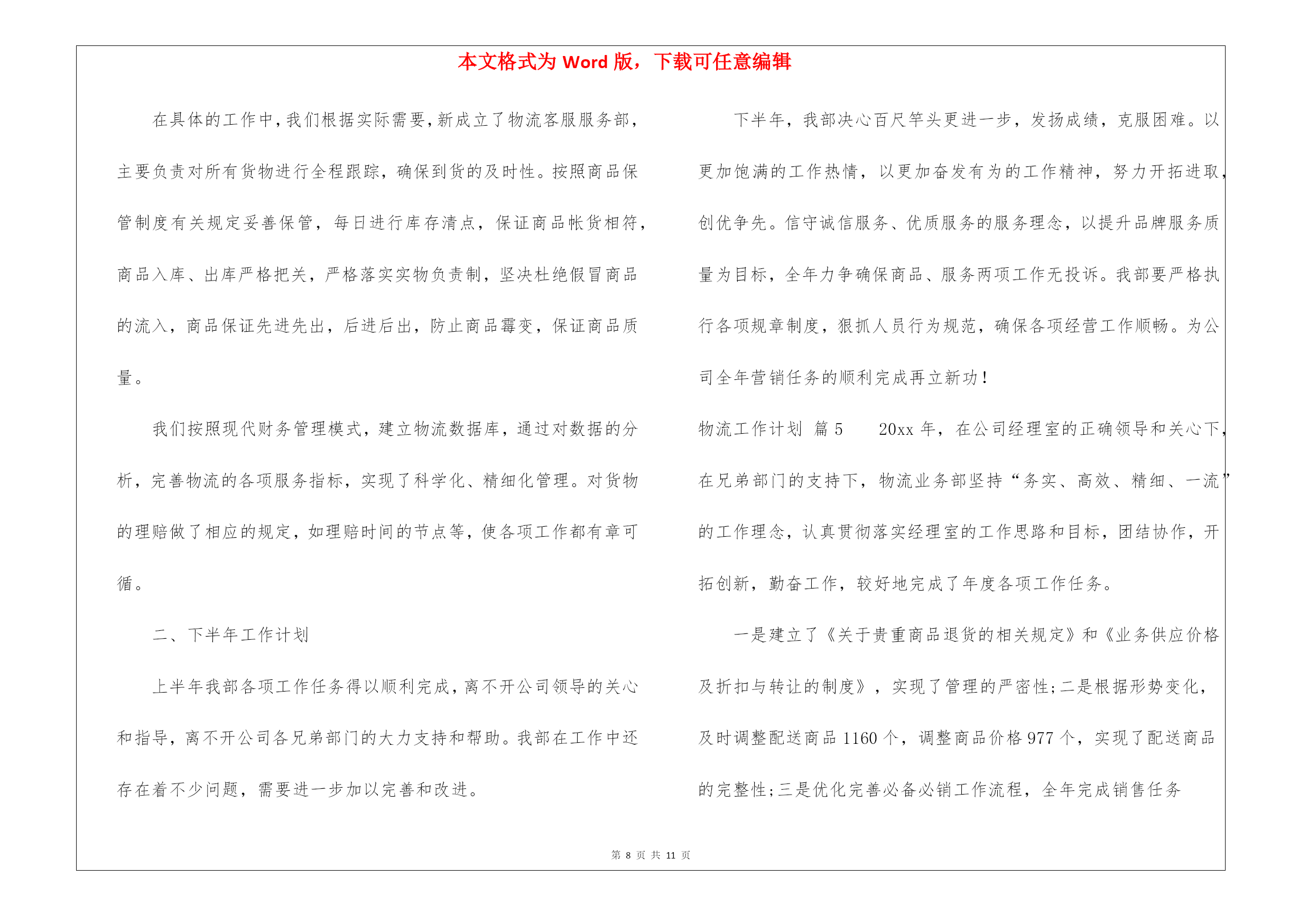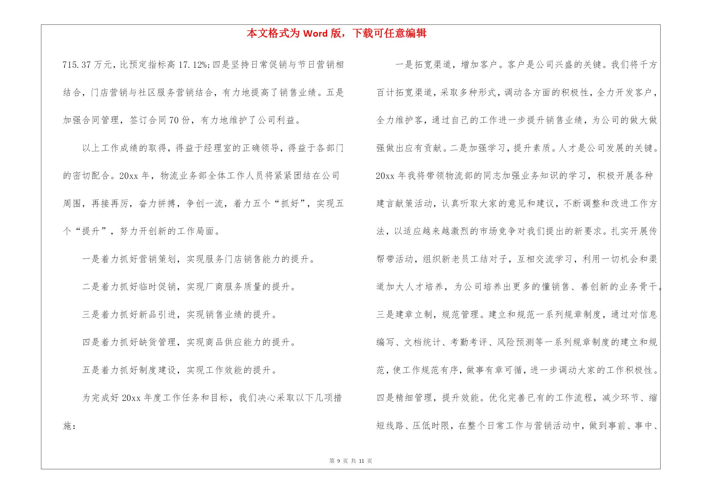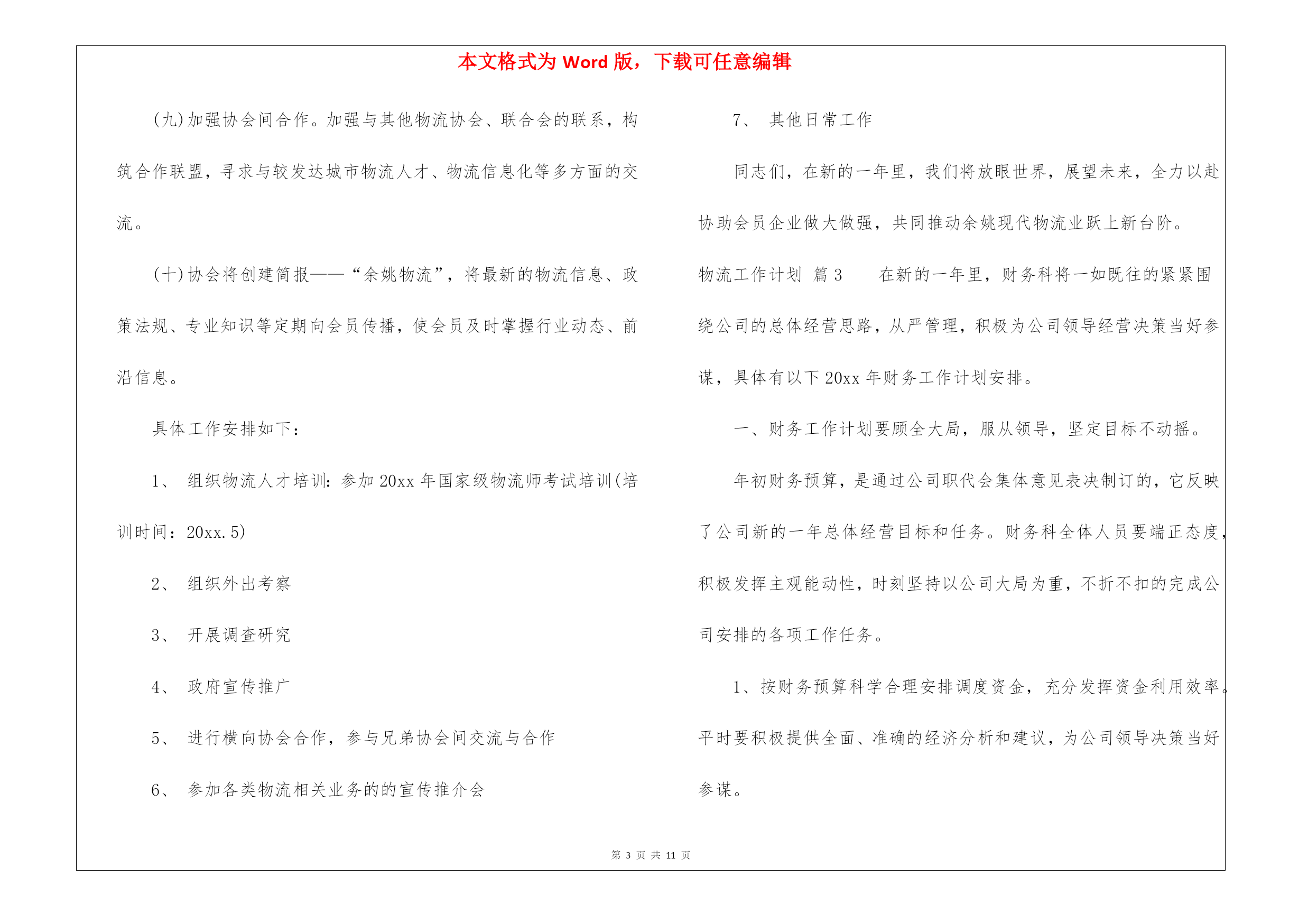 本文格式为Word版,下载可任意编辑第PAGE\*MERGEFORMAT11页共NUMPAGES\*MERGEFORMAT11页物流工作计划6篇物流工作计划6篇日子在弹指一挥间就毫无声息的流逝,我们又将迎来新的喜悦、新的收获,写一份计划,为接下来的工作做准备吧!什么样的计划才是有效的呢?下面是我为大家编写的物流工作计划6篇,欢迎大家分享。物流工作计划篇1作为一名火腿肠生产公司的生产车间的物流人员,我深深地感受到这一行业蕴藏的巨大知识财富。过去一年,我在工作岗位上没有做的非常好,工作当中存在很多不足与缺点,在一定程度上让领导感到失望。对于,我详细制定了生产车间物流工作计划,以求最大程度上避免工作当中的问题。如下:第一,加强生产车间物流工作的思想觉悟建设。生产车间物流工作是一项非常注重严谨的工作,要我们这样每一名参与其中的员工懂得以客观、认真的态度面对。第二,加强物流工作当中的防盗工作。生产车间到物流部门期间环节是企业最易失窃的环节,今年已经发生过失窃事故多起,为此今年我部门必须切身加强生产车间物流防盗工作。第三,定期开展物流工作培训工作汇报会议。在会议上就工作当中容易产生的问题展开讨论,对于一些细节加强沟通与交流。以上就是生产车间物流20xx年的工作计划了。物流工作计划篇2物流协会成立初始,还存在着不足之处。协会力争在新的一年里,围绕余姚市政府新物流发展规划的实施以及急需解决的问题,推动企业在新的政策环境下做大做强,从而带动整个余姚物流业健康、规范的发展。为此,现将《余姚市物流协会20xx年工作计划(草案)》制定如下,请大家多提宝贵意见,共同促进协会工作顺利、有效开展。工作目标如下:(一)加强协会自身建设,进一步发展会员,壮大队伍,真正代表余姚物流行业水平和权威性。计划到20xx年底,发展会员数量达60家,涉及运输、配送、仓储、第三方物流以及生产型企业等,基本上代表余姚整个物流产业的主体。(二)开展物流行业调查研究。20xx年余姚市政府对物流业发展仍保持高度重视,为进一步了解我市物流企业的综合状况,从企业的实际情况出发,计划开展“余姚市物流行业统计工作”,了解余姚物流业的现状,摸清各企业所处的状态,以便有针对性的开展服务工作。(三)协会将全面协助政府、企业做好招商引资工作,广泛了解国内外知名物流企业信息,加强对外交流工作,充分发挥协会职能。(四)加强物流人才培养。为弥补余姚物流行业专业人才短缺状况,加快物流人才培养速度,根据会员企业的实际需求,协会将适时开办各种业务培训。进一步加强与宁波、杭州各大高校的合作,为余姚物流业储备物流人才。(五)扩大物流市场供给。推动我市制造企业物流社会化,加大社会物流总量供给。(六)加大协会的宣传力度,扩大社会影响力。通过网络宣传,促进余姚物流信息化建设,为会员共享资源搭建网络平台。努力为余姚市物流企业招聘人才以及物流从业人员求职搭建专业平台。同时进一步加强与物流相关媒体建立合作关系,将会员企业尽最大可能向外界推广宣传。(七)向政府献计献策。根据企业及市场变动因素、经营场地如油价变动等,力争政策扶持,促进物流企业更快更好地发展。努力为会员企业争取政府的促进物流业发展的优惠政策。(八)将进一步促进企业物流信息化建设,提高会员企业生产质量与效率,适时邀请相关专家、学者为会员提供企业物流信息化专业知识讲解,适时举办“物流企业信息化研讨会”。(九)加强协会间合作。加强与其他物流协会、联合会的联系,构筑合作联盟,寻求与较发达城市物流人才、物流信息化等多方面的交流。(十)协会将创建简报——“余姚物流”,将最新的物流信息、政策法规、专业知识等定期向会员传播,使会员及时掌握行业动态、前沿信息。具体工作安排如下:1、组织物流人才培训:参加20xx年国家级物流师考试培训(培训时间:20xx.5)2、组织外出考察3、开展调查研究4、政府宣传推广5、进行横向协会合作,参与兄弟协会间交流与合作6、参加各类物流相关业务的的宣传推介会7、其他日常工作同志们,在新的一年里,我们将放眼世界,展望未来,全力以赴协助会员企业做大做强,共同推动余姚现代物流业跃上新台阶。物流工作计划篇3在新的一年里,财务科将一如既往的紧紧围绕公司的总体经营思路,从严管理,积极为公司领导经营决策当好参谋,具体有以下20xx年财务工作计划安排。一、财务工作计划要顾全大局,服从领导,坚定目标不动摇。年初财务预算,是通过公司职代会集体意见表决制订的,它反映了公司新的一年总体经营目标和任务。财务科全体人员要端正态度,积极发挥主观能动性,时刻坚持以公司大局为重,不折不扣的完成公司安排的各项工作任务。1、按财务预算科学合理安排调度资金,充分发挥资金利用效率。平时要积极提供全面、准确的经济分析和建议,为公司领导决策当好参谋。2、积极争取政策。积极利用行
