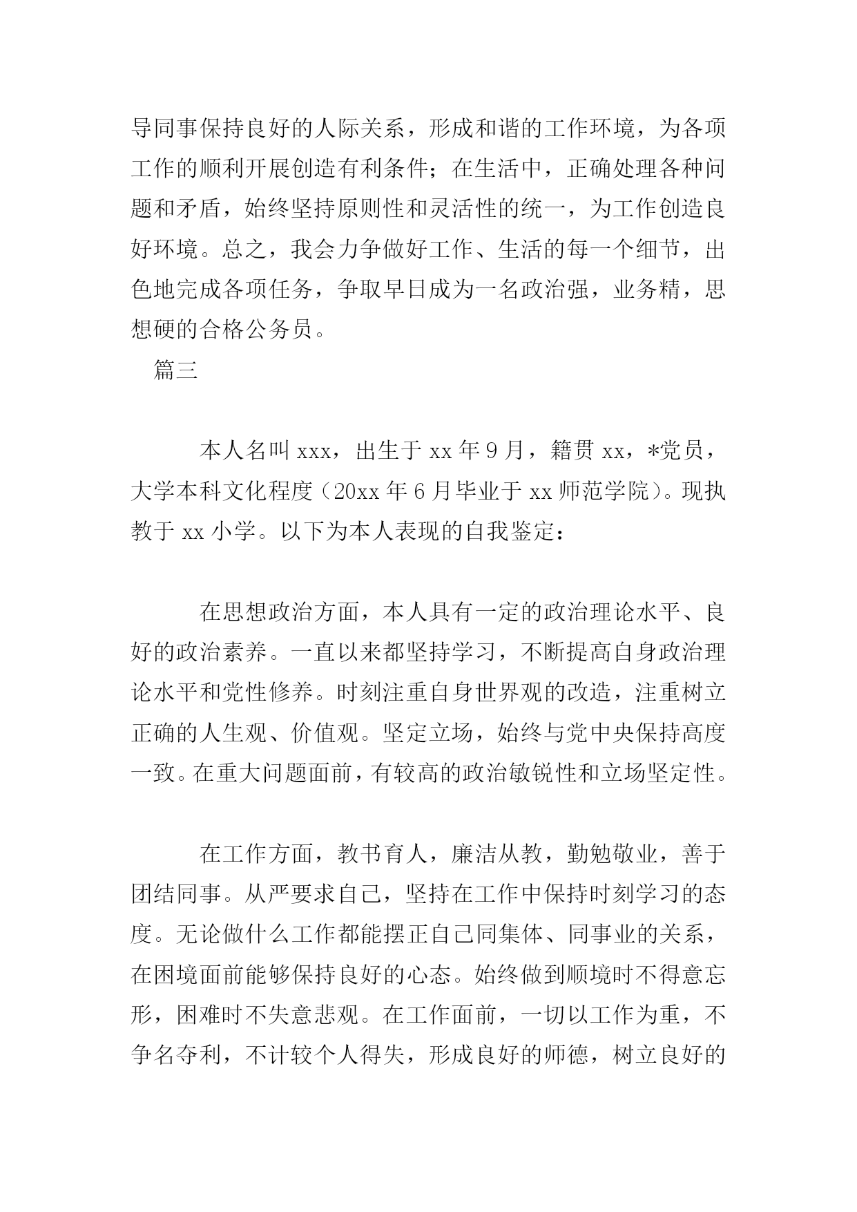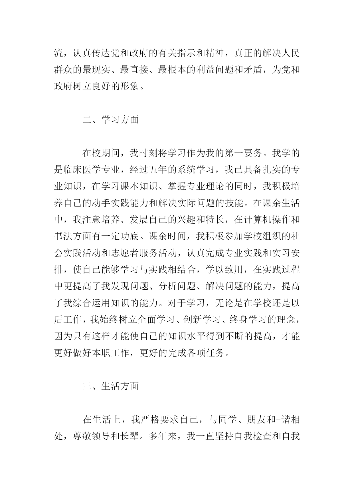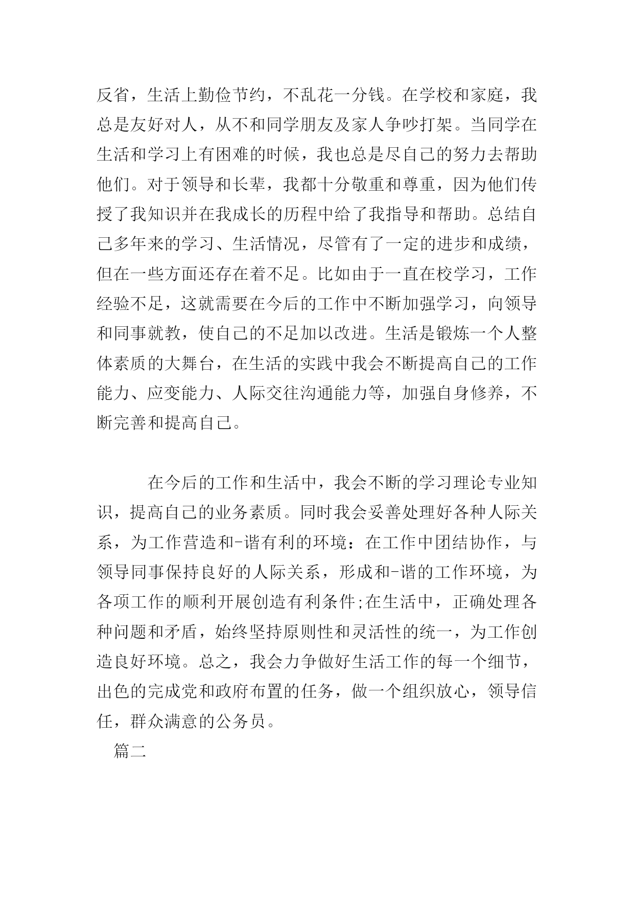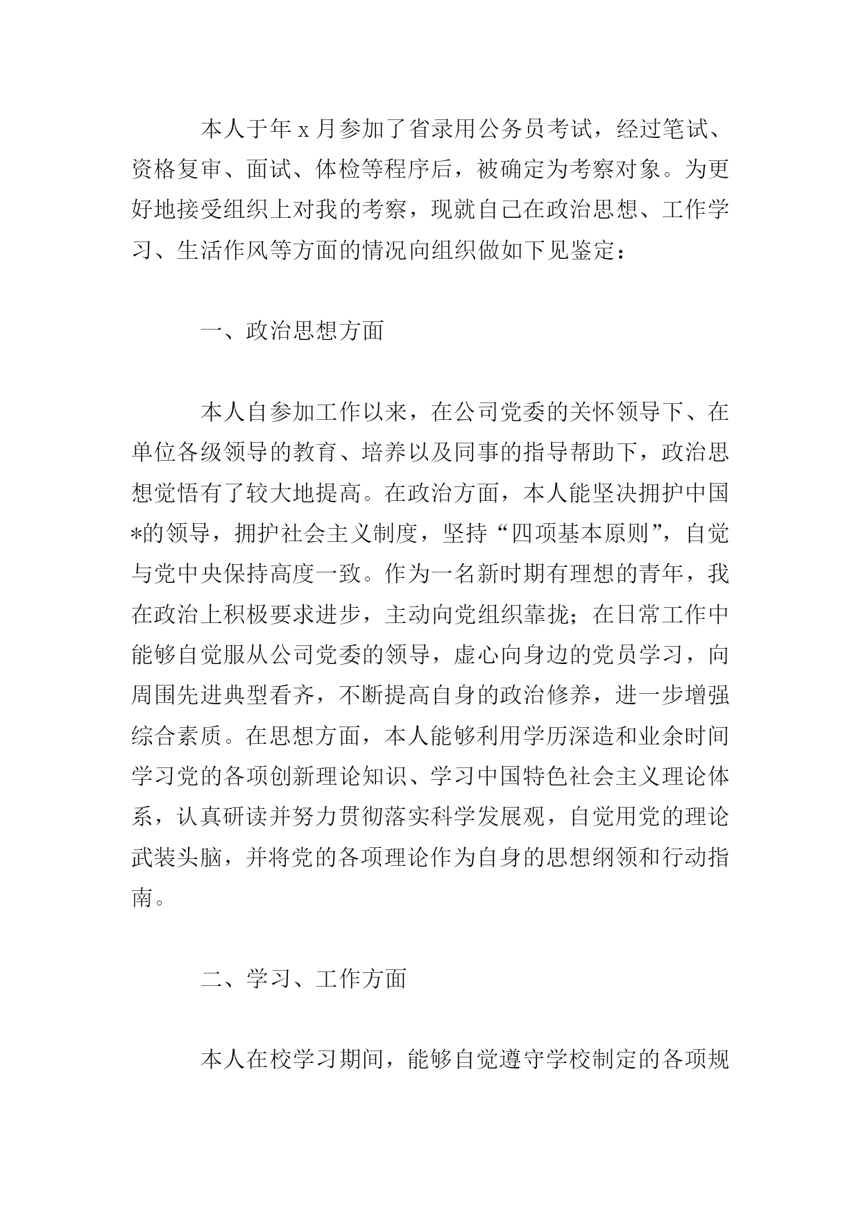 公务员政审自我鉴定三篇篇一我叫XX,男,XX年X月出生于XX省XX县,汉族。XX年X月考入XX大学XX专业学习,XX年X月毕业,学制X年,大学本科学历,共青团团员。为了能更好的走向工作岗位,让领导对我有更深的了解,现对自己以往的思想、学习、生活情况做如下小结。一、思想方面长期以来,我思想上积极上进,行动上时刻以优秀共青团员模范标兵为指引,时时处处严格要求自己。通过马克思主义哲学等课程的学习,我树立了全心全意为人民服务的人生观,坚决抵制各种错误人生观的侵蚀,反对拜金主义,享乐主义和个人主义。同时,用马克思主义思想武装自己,加强自己的理论修养,争取在自己工作岗位上实现人生的价值。在日常的工作、学习和生活中,我能够认真学习党的基本路线方针政策,主动通过报纸、杂志、书籍、网络等积极学习政治理论,不断提高自己的理论和思想水平。作为一名公务员,要始终把党和政府交给自己的任务放在第一位并坚决贯彻落实,以实际行动践行科学发展观。多与群众沟通交流,认真传达党和政府的有关指示和精神,真正的解决人民群众的最现实、最直接、最根本的利益问题和矛盾,为党和政府树立良好的形象。二、学习方面在校期间,我时刻将学习作为我的第一要务。我学的是临床医学专业,经过五年的系统学习,我已具备扎实的专业知识,在学习课本知识、掌握专业理论的同时,我积极培养自己的动手实践能力和解决实际问题的技能。在课余生活中,我注意培养、发展自己的兴趣和特长,在计算机操作和书法方面有一定功底。课余时间,我积极参加学校组织的社会实践活动和志愿者服务活动,认真完成专业实践和实习安排,使自己能够学习与实践相结合,学以致用,在实践过程中更提高了我发现问题、分析问题、解决问题的能力,提高了我综合运用知识的能力。对于学习,无论是在学校还是以后工作,我始终树立全面学习、创新学习、终身学习的理念,因为只有这样才能使自己的知识水平得到不断的提高,才能更好做好本职工作,更好的完成各项任务。三、生活方面在生活上,我严格要求自己,与同学、朋友和-谐相处,尊敬领导和长辈。多年来,我一直坚持自我检查和自我反省,生活上勤俭节约,不乱花一分钱。在学校和家庭,我总是友好对人,从不和同学朋友及家人争吵打架。当同学在生活和学习上有困难的时候,我也总是尽自己的努力去帮助他们。对于领导和长辈,我都十分敬重和尊重,因为他们传授了我知识并在我成长的历程中给了我指导和帮助。总结自己多年来的学习、生活情况,尽管有了一定的进步和成绩,但在一些方面还存在着不足。比如由于一直在校学习,工作经验不足,这就需要在今后的工作中不断加强学习,向领导和同事就教,使自己的不足加以改进。生活是锻炼一个人整体素质的大舞台,在生活的实践中我会不断提高自己的工作能力、应变能力、人际交往沟通能力等,加强自身修养,不断完善和提高自己。在今后的工作和生活中,我会不断的学习理论专业知识,提高自己的业务素质。同时我会妥善处理好各种人际关系,为工作营造和-谐有利的环境:在工作中团结协作,与领导同事保持良好的人际关系,形成和-谐的工作环境,为各项工作的顺利开展创造有利条件;在生活中,正确处理各种问题和矛盾,始终坚持原则性和灵活性的统一,为工作创造良好环境。总之,我会力争做好生活工作的每一个细节,出色的完成党和政府布置的任务,做一个组织放心,领导信任,群众满意的公务员。篇二本人于年x月参加了省录用公务员考试,经过笔试、资格复审、面试、体检等程序后,被确定为考察对象。为更好地接受组织上对我的考察,现就自己在政治思想、工作学习、生活作风等方面的情况向组织做如下见鉴定:一、政治思想方面本人自参加工作以来,在公司党委的关怀领导下、在单位各级领导的教育、培养以及同事的指导帮助下,政治思想觉悟有了较大地提高。在政治方面,本人能坚决拥护中国*的领导,拥护社会主义制度,坚持“四项基本原则”,自觉与党中央保持高度一致。作为一名新时期有理想的青年,我在政治上积极要求进步,主动向党组织靠拢;在日常工作中能够自觉服从公司党委的领导,虚心向身边的党员学习,向周围先进典型看齐,不断提高自身的政治修养,进一步增强综合素质。在思想方面,本人能够利用学历深造和业余时间学习党的各项创新理论知识、学习中国特色社会主义理论体系,认真研读并努力贯彻落实科学发展观,自觉用党的理论武装头脑,并将党的各项理论作为自身的思想纲领和行动指南。二、学习、工作方面本人在校学习期间,能够自觉遵守学校制定的各项规章制度,尊重师长,团结同学,努力学习,以优异成绩修完教学计划规定的全部课程,并参加全国组织的职业资格考试,取得了助理物流师资格证书。xx年参加工作后,本人抱着“主动进入新角色、尽快适应新环境”的原则,积极钻研岗位业务