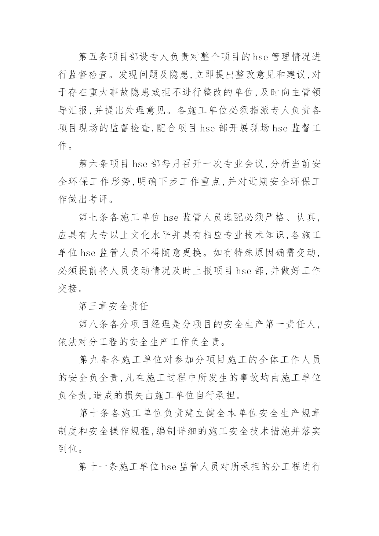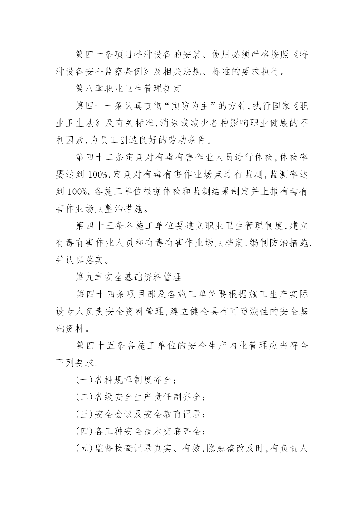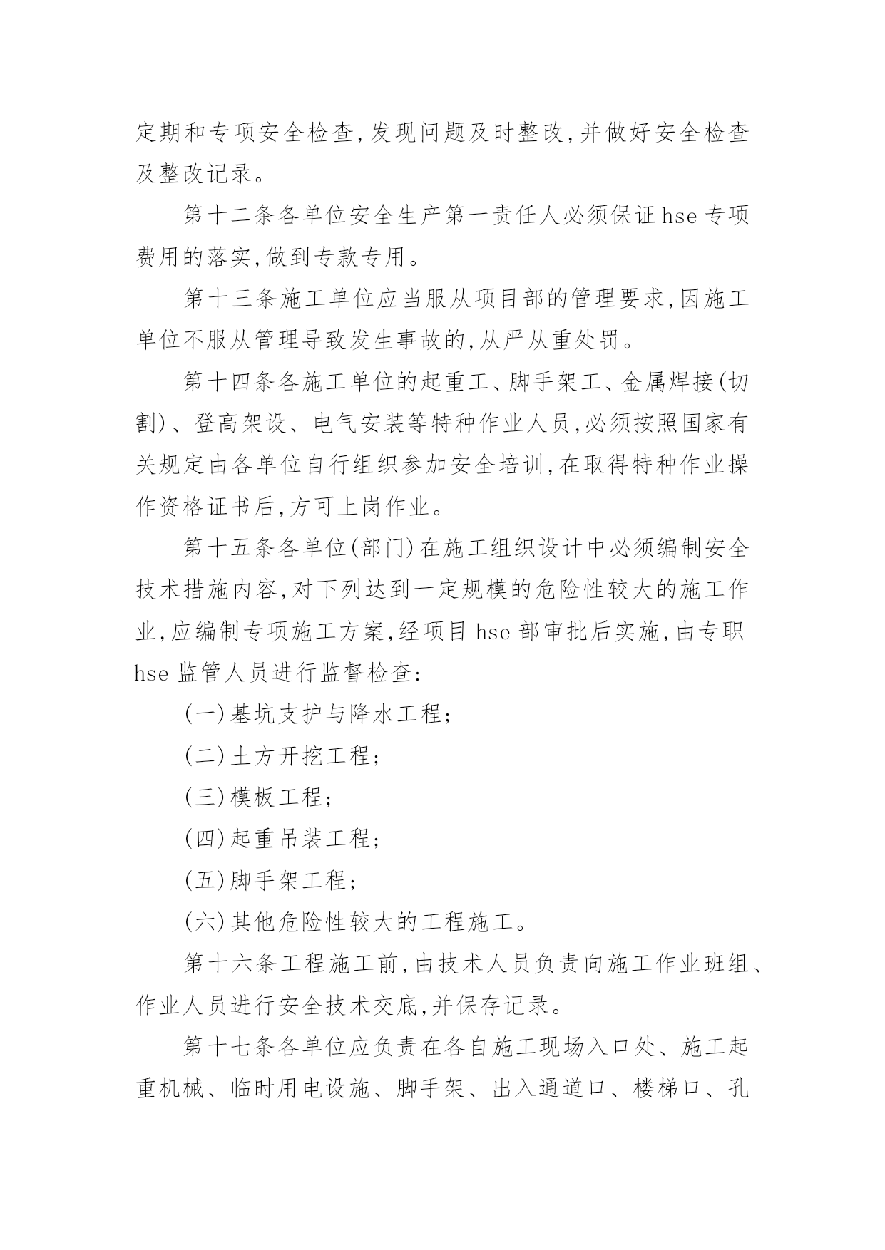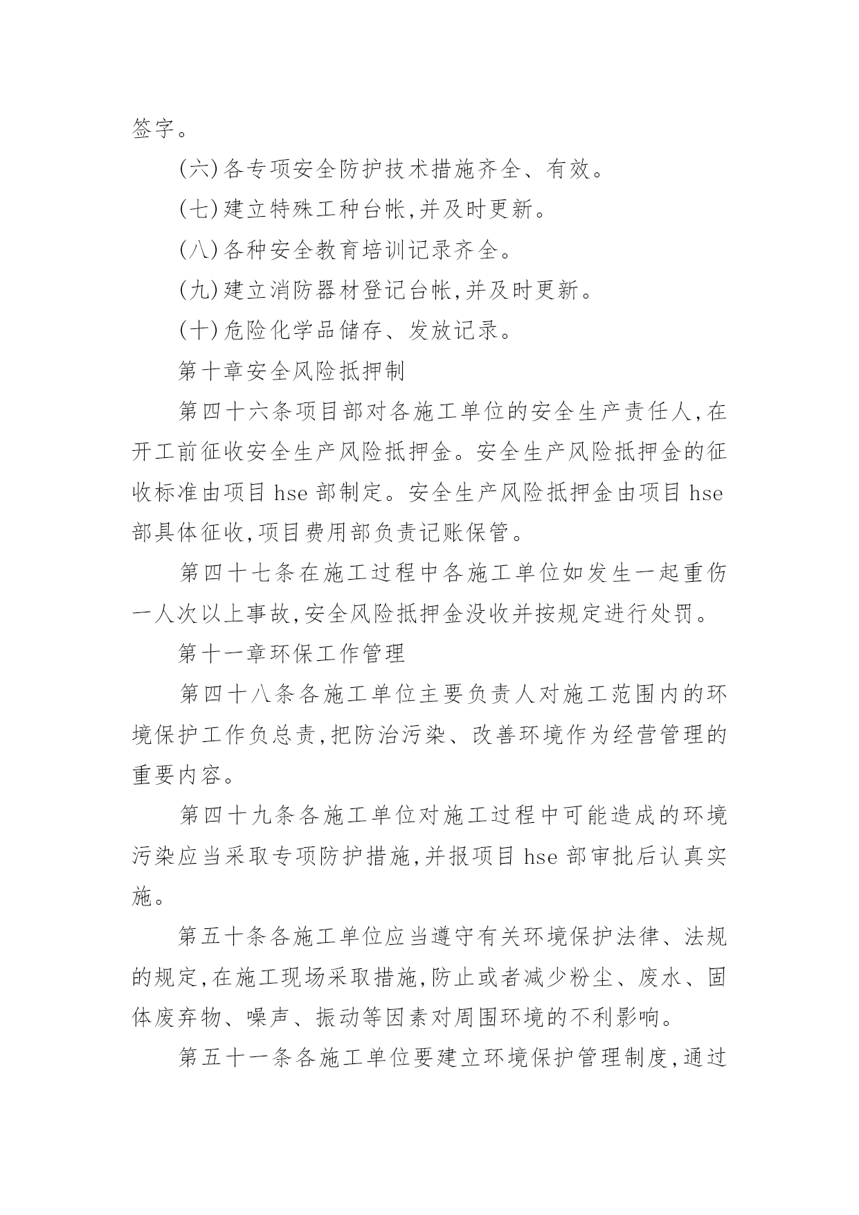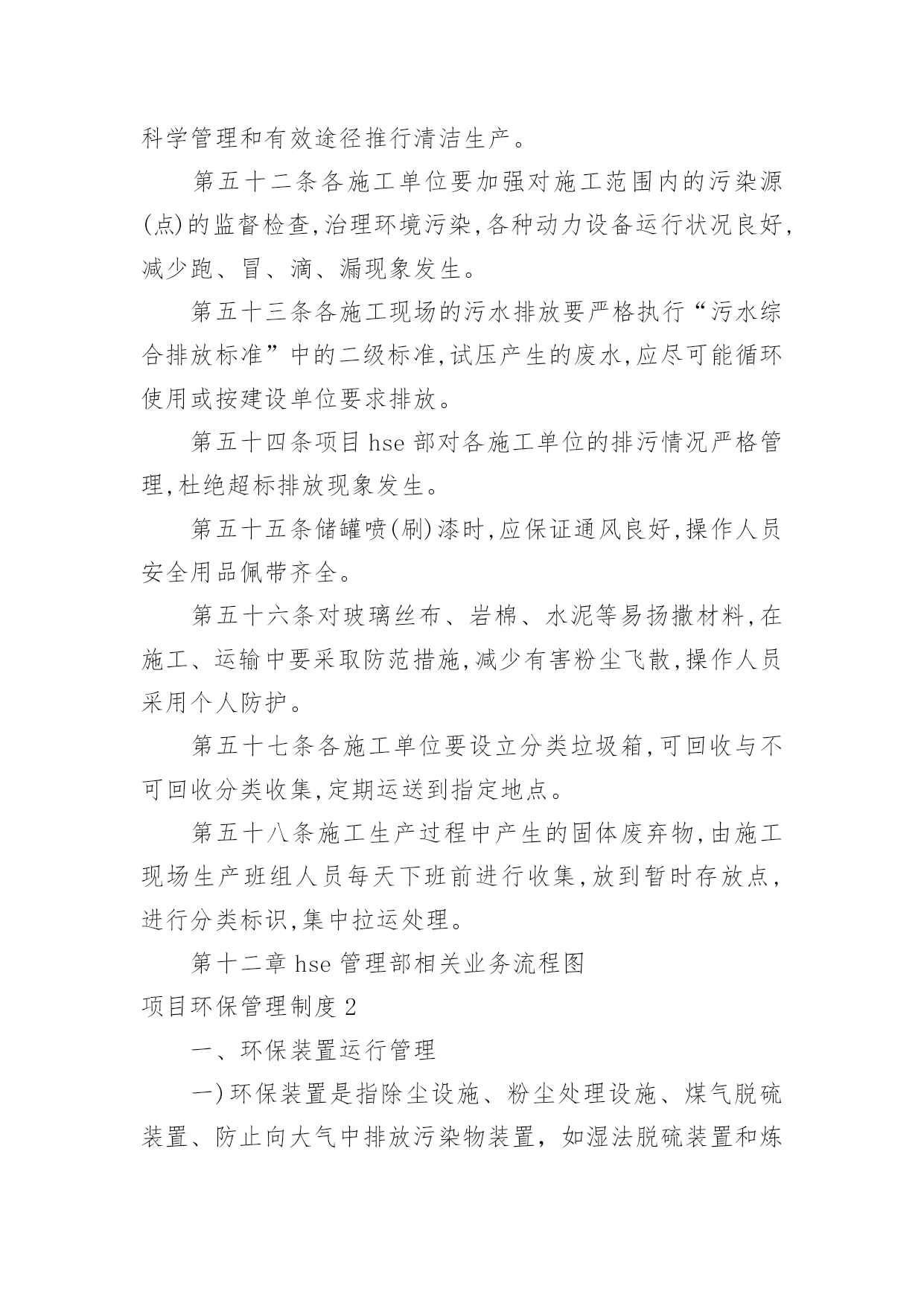 项目环保管理制度项目环保管理制度在社会一步步向前发展的今天,制度对人们来说越来越重要,制度一般指要求大家共同遵守的办事规程或行动准则,也指在一定历史条件下形成的法令、礼俗等规范或一定的规格。制度到底怎么拟定才合适呢?下面是小编精心整理的项目环保管理制度,希望能够帮助到大家。项目环保管理制度1第一章总则第一条为了加强中国北京润滑油厂配套完善项目施工的安全环保管理,根据相关法规制度制定本办法。第二条本办法适用于中国北京润滑油厂配套完善项目各参建施工单位。第二章组织机构第三条中国北京润滑油厂配套完善项目部成立hse管理部,下设资料、现场、营区、交通等业务部门,由项目hse经理负责管理。第四条各施工单位成立相应hse组织机构,成员必须具备大专以上文化程度,并具有三年以上现场管理经验和相应专业知识,将组织机构、人员名单及联系方式上报项目部hse管理部门备案保存。第五条项目部设专人负责对整个项目的hse管理情况进行监督检查。发现问题及隐患,立即提出整改意见和建议,对于存在重大事故隐患或拒不进行整改的单位,及时向主管领导汇报,并提出处理意见。各施工单位必须指派专人负责各项目现场的监督检查,配合项目hse部开展现场hse监督工作。第六条项目hse部每月召开一次专业会议,分析当前安全环保工作形势,明确下步工作重点,并对近期安全环保工作做出考评。第七条各施工单位hse监管人员选配必须严格、认真,应具有大专以上文化水平并具有相应专业技术知识,各施工单位hse监管人员不得随意更换。如有特殊原因确需变动,必须提前将人员变动情况及时上报项目hse部,并做好工作交接。第三章安全责任第八条各分项目经理是分项目的安全生产第一责任人,依法对分工程的安全生产工作负全责。第九条各施工单位对参加分项目施工的全体工作人员的安全负全责,凡在施工过程中所发生的事故均由施工单位负全责,造成的损失由施工单位自行承担。第十条各施工单位负责建立健全本单位安全生产规章制度和安全操作规程,编制详细的施工安全技术措施并落实到位。第十一条施工单位hse监管人员对所承担的分工程进行定期和专项安全检查,发现问题及时整改,并做好安全检查及整改记录。第十二条各单位安全生产第一责任人必须保证hse专项费用的落实,做到专款专用。第十三条施工单位应当服从项目部的管理要求,因施工单位不服从管理导致发生事故的,从严从重处罚。第十四条各施工单位的起重工、脚手架工、金属焊接(切割)、登高架设、电气安装等特种作业人员,必须按照国家有关规定由各单位自行组织参加安全培训,在取得特种作业操作资格证书后,方可上岗作业。第十五条各单位(部门)在施工组织设计中必须编制安全技术措施内容,对下列达到一定规模的危险性较大的施工作业,应编制专项施工方案,经项目hse部审批后实施,由专职hse监管人员进行监督检查:(一)基坑支护与降水工程;(二)土方开挖工程;(三)模板工程;(四)起重吊装工程;(五)脚手架工程;(六)其他危险性较大的工程施工。第十六条工程施工前,由技术人员负责向施工作业班组、作业人员进行安全技术交底,并保存记录。第十七条各单位应负责在各自施工现场入口处、施工起重机械、临时用电设施、脚手架、出入通道口、楼梯口、孔洞口、基坑边沿、有害危险气体及液体存放处等危险部位,设置明显的安全警示标志,安全警示标志必须符合国家标准。第十八条各单位应根据不同的施工阶段和周围环境、季节、气候的变化,在施工现场采取相应的`安全施工措施。施工现场暂时停工的,各施工单位应当做好现场防护。第十九条参加施工的单位必须将施工现场的办公、生活区与作业区分开设置,并保持适当距离;办公、生活区的选址及设施应当符合安全要求。职工的膳食、饮水、休息场所等应当符合卫生标准。第二十条各单位必须在办公、生活及施工现场确定消防安全责任人,制定用火、用电等各项安全管理制度,设置消防通道,配备足够好用的消防设施和灭火器材。第二十一条各单位在施工中使用的特种设备应按规定报主管部门进行定期检验;租赁使用的机械设备和施工机具必须经相关单位(部门)联合验收合格后方可使用。《特种设备安全监察条例》规定的施工起重机械,应当经有相应资质的检验检测机构监督检验合格。第二十二条项目部为施工现场从事危险作业的人员办理意外伤害保险,费用按实际由各家列支,意外伤害保险期限自本工程开工之日起至竣工验收合格止。第四章安全教育培训第二十三条参加施工人员进入施工现场前必须进行入场安全教育,内容应包括:当地常见病、流行病防治、安全纪律、施工安全规程、规范、应急救护常识等方面,安全教育应有记录、签字,妥善保存。第二十四条施工过程中,各单位应采取多种方式,开展安全教育培训,提高职工安全意识和安全操作技能。内容主要包括:(一)新入厂的员工必须经过三级安全教育,并建立相应的培训、考核记录,合格后方可进入施工现