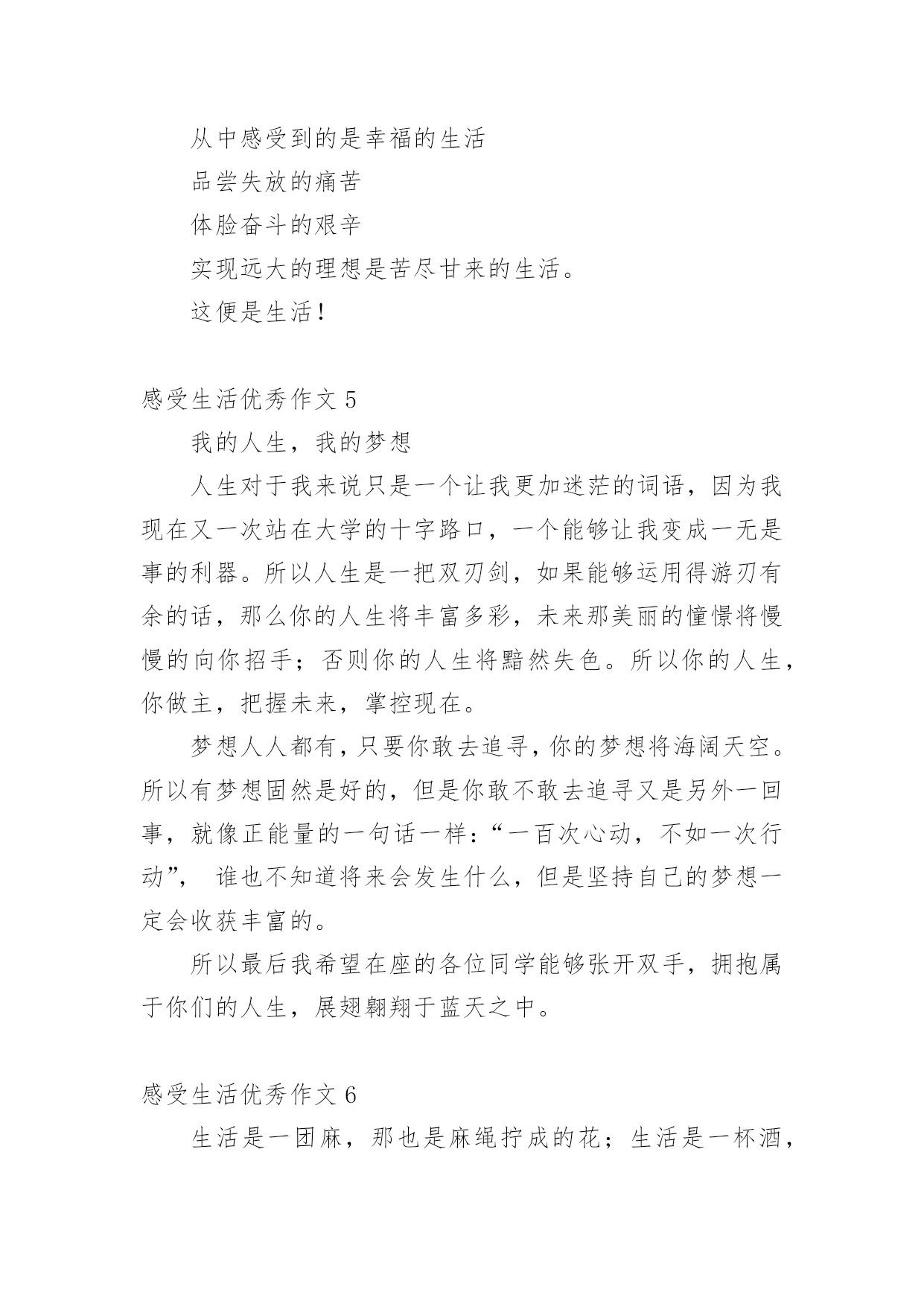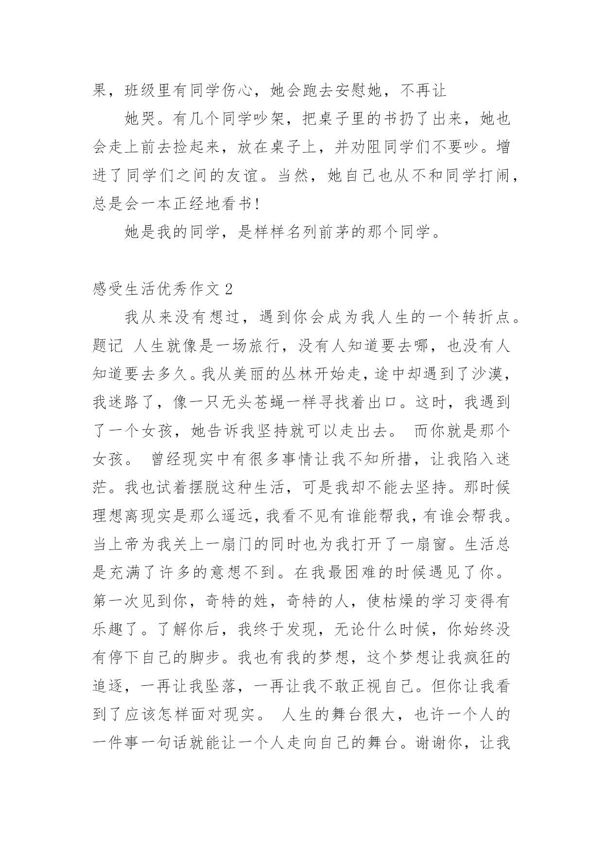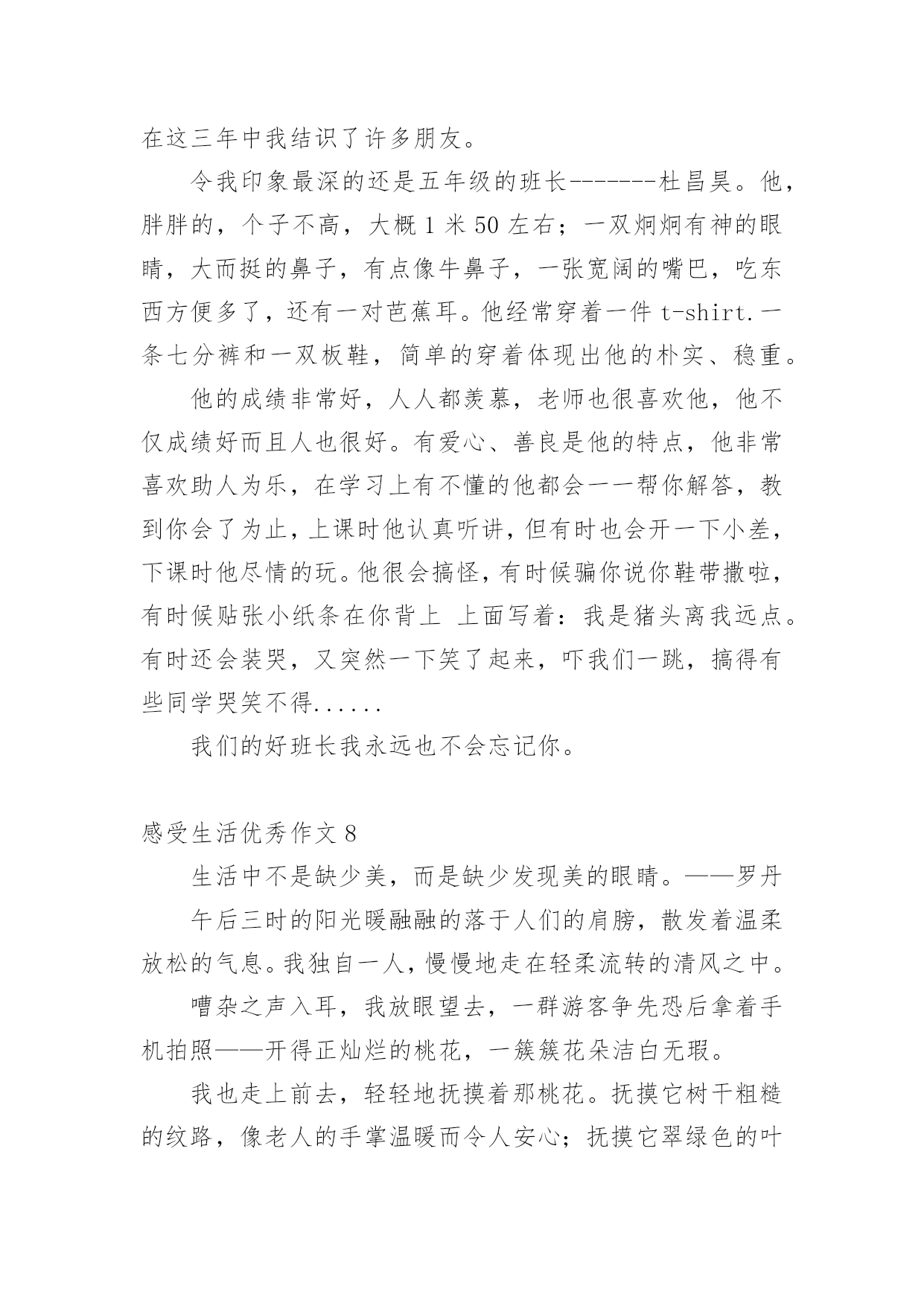 感受生活优秀作文感受生活优秀作文(8篇)在生活、工作和学习中,大家都尝试过写作文吧,写作文可以锻炼我们的独处习惯,让自己的心静下来,思考自己未来的方向。相信写作文是一个让许多人都头痛的问题,以下是小编精心整理的感受生活优秀作文,仅供参考,欢迎大家阅读。感受生活优秀作文1我有一个非常要好的同学,她在每次考试中都能排第一,还在班级里当副班长,样样都好。她总会去帮助一些困难的同学。比如,有些同学请假没来上学,来上学时作业写不出她会去帮助完成作业。仿佛一位老师在教学生一般。记得有一次,我的作业没有写好,她是语文组长,就要收作业了,我还没有一点头绪,差我一本了,原本以为她去交作业本了,没有等我,可谁也没想到,她竟然放下作业本,向我走来,问我:“好了吗?我要去交了,如果你实在写不出来的话!我可以来教教你!”“谢谢!”她教我说可以怎样写,并给我举了几个例子。讲完,我有了头绪也构思好了,写得也快,不一会儿,就写好了。虽然,这只是件小小的事,但这也体现出了她爱学习,爱帮助困难的同学。她也是我学习的榜样!运动会上,她管理同学,让她们没有半点声音。在60米跑和垒球比赛中她也名列前茅,如果,班级里有同学伤心,她会跑去安慰她,不再让她哭。有几个同学吵架,把桌子里的书扔了出来,她也会走上前去捡起来,放在桌子上,并劝阻同学们不要吵。增进了同学们之间的友谊。当然,她自己也从不和同学打闹,总是会一本正经地看书!她是我的同学,是样样名列前茅的那个同学。感受生活优秀作文2我从来没有想过,遇到你会成为我人生的一个转折点。题记人生就像是一场旅行,没有人知道要去哪,也没有人知道要去多久。我从美丽的丛林开始走,途中却遇到了沙漠,我迷路了,像一只无头苍蝇一样寻找着出口。这时,我遇到了一个女孩,她告诉我坚持就可以走出去。而你就是那个女孩。曾经现实中有很多事情让我不知所措,让我陷入迷茫。我也试着摆脱这种生活,可是我却不能去坚持。那时候理想离现实是那么遥远,我看不见有谁能帮我,有谁会帮我。当上帝为我关上一扇门的同时也为我打开了一扇窗。生活总是充满了许多的意想不到。在我最困难的时候遇见了你。第一次见到你,奇特的姓,奇特的人,使枯燥的学习变得有乐趣了。了解你后,我终于发现,无论什么时候,你始终没有停下自己的脚步。我也有我的梦想,这个梦想让我疯狂的追逐,一再让我坠落,一再让我不敢正视自己。但你让我看到了应该怎样面对现实。人生的舞台很大,也许一个人的一件事一句话就能让一个人走向自己的舞台。谢谢你,让我明白我应该去干什么!我自笑看今朝事,喜厌勿谈随心为。欢语笑言自为乐,要山江河为牵绊。艺术唯有自然真,潇潇洒洒心中存。永世不换自由心,选下青山终不还。六年级:潇雨诗颖感受生活优秀作文3初三是一首歌如果说,初一我们还是个小孩,初二还是少年布不知愁,那么,初3便是一首难唱、难懂、难学的歌!本想再一次抱起蒙上灰的足球,走进黑和白的世界;本想再一次把摆棋艺擂台,与对手杀个天昏地暗;本想再一次寻觅一方属于自己的天空,尽情地放纵自己可是……初三了。是的,初三了,父母眼中的希望与企盼幻化成一个美好的前程与未来;老师的殷殷告诫,暗示着初三的重要与关键;亲戚邻人的关爱与呵护,汇聚成无数的真心祝福与美好愿望。然而,惟有学生们的心情却日益沉重与压抑,因为,他们失去了这个年龄该有的换森声与笑语。这个世界本来就充满众多矛盾,自然,“失去”和“拥有”的同时存在也无可厚非。初三,尽管失去了许多,但同时又拥有了许多。初三的一份份侵满心血的讲义,是老师眼中无言的红丝;初三的一道道费尽思索的习题,是我们心中对中考的憧景;初三的一句句融进征程的赠言,是同窗真心的祝福;初三的一次次的无悔的选择,是学子们对人生的谨慎思索……终于,我会唱了这首歌。它的旋律时而低缓时而高亢;它的乐章或快或向上;他的主题清亮而携永……哦!初三是一首歌。感受生活优秀作文4当我们降临到这个世上从出生到成长,从中年到衰亡生活带给我们的足生命的起点与终结当我们在沙滩上玩委玲粉金色的童年生活带给我们的是大海的宽容和柔和当我们在苹丛中汉步伴着多彩的青春生活带给我们的是青苹的天真与无那当我们路程过丰走向录辉垃的时候生活带给我们的是人生的成功与收获当我们步及蹒跚乘看小舟去钓鱼生活带给我们的足鱼儿的悠闲与欢乐仰望名山的徽峨俯看湖水的清漱玲听动人的旋律——是优美的`生活亲情带来注暖友情带来真诚从中感受到的是幸福的生活品尝失放的痛苦体脸奋斗的艰辛实现远大的理想是苦尽甘来的生活。这便是生活!感受生活优秀作文5我的人生,我的梦想人生对于我来说只是一个让我更加迷茫的词语,因为我现在又一次站在大学的十字路口,一个能够让我变成一无是事的利器。所以人生是一把双刃剑,如果能够运用得游刃有余的话,那么你的人生将丰富多彩,未来那美丽的憧憬将慢慢的向你招手;否则你的人生将黯然失色。所以你的人生