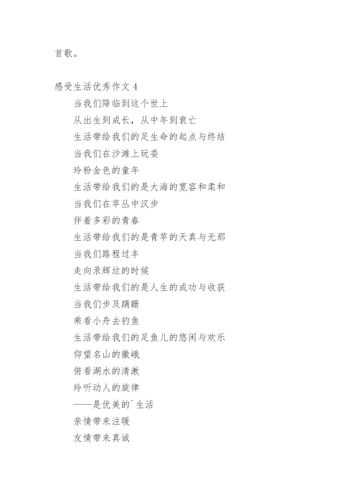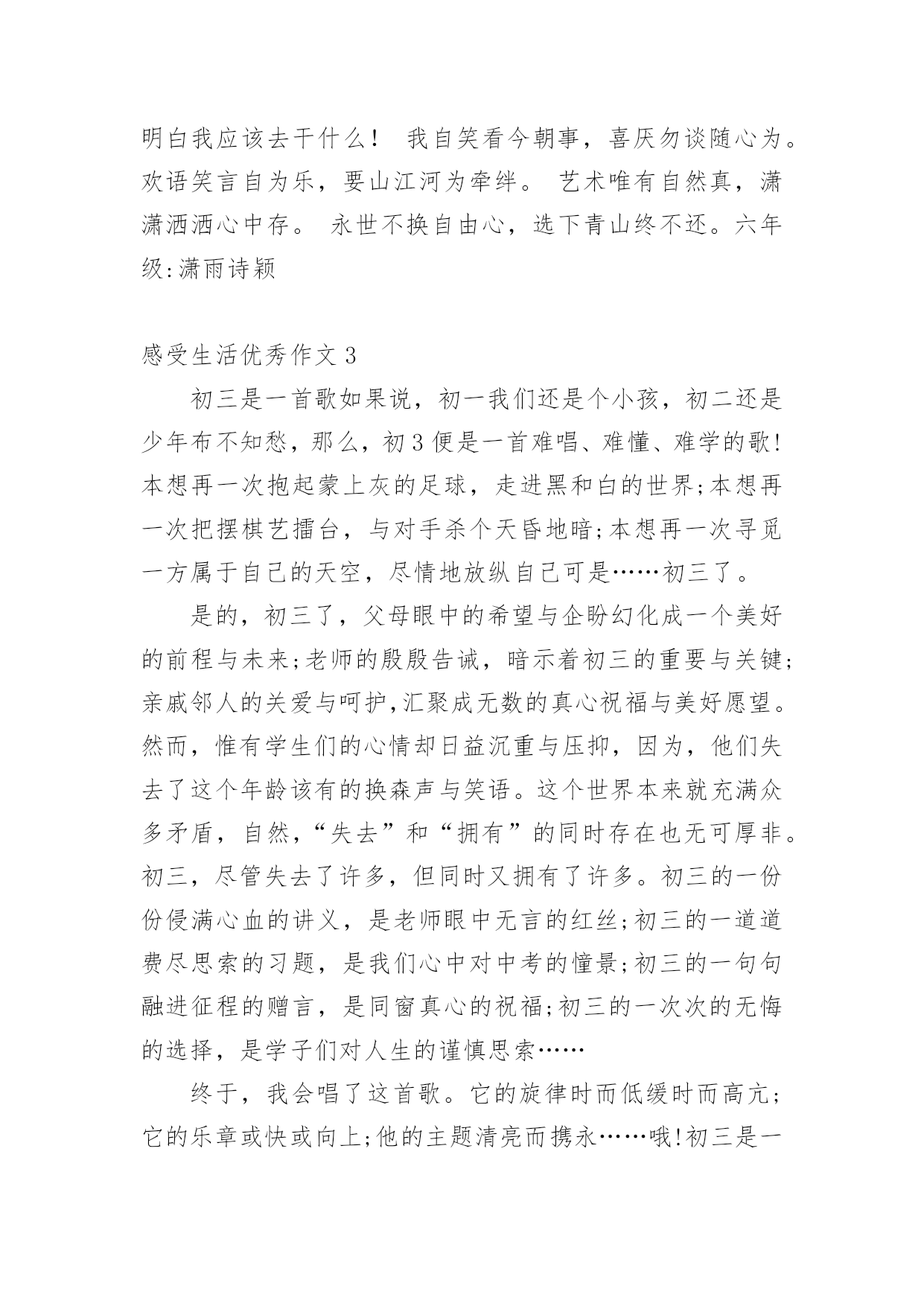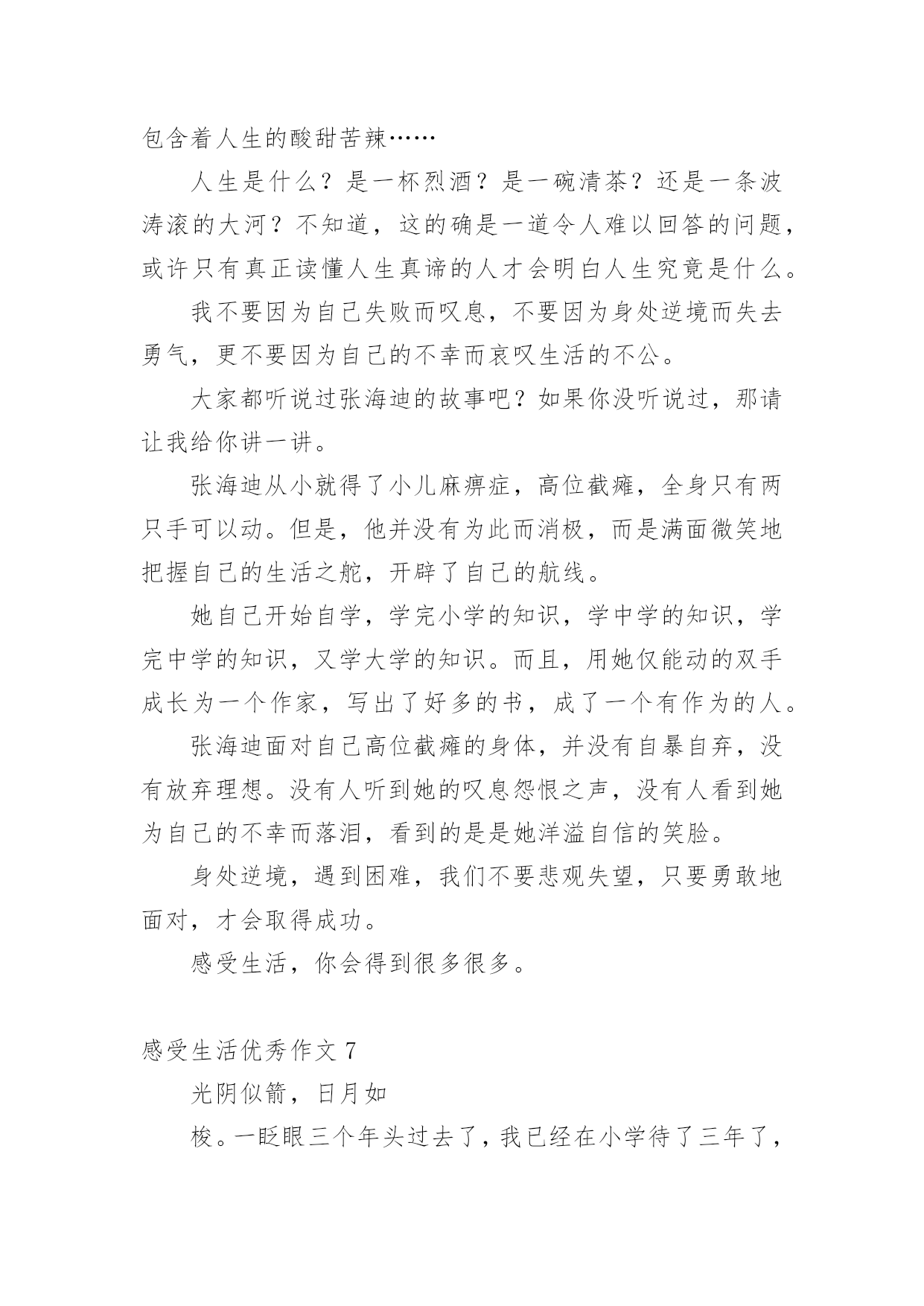 感受生活优秀作文感受生活优秀作文(8篇)在生活、工作和学习中,大家都尝试过写作文吧,写作文可以锻炼我们的独处习惯,让自己的心静下来,思考自己未来的方向。相信写作文是一个让许多人都头痛的问题,以下是小编精心整理的感受生活优秀作文,仅供参考,欢迎大家阅读。感受生活优秀作文1我有一个非常要好的同学,她在每次考试中都能排第一,还在班级里当副班长,样样都好。她总会去帮助一些困难的同学。比如,有些同学请假没来上学,来上学时作业写不出她会去帮助完成作业。仿佛一位老师在教学生一般。记得有一次,我的作业没有写好,她是语文组长,就要收作业了,我还没有一点头绪,差我一本了,原本以为她去交作业本了,没有等我,可谁也没想到,她竟然放下作业本,向我走来,问我:“好了吗?我要去交了,如果你实在写不出来的话!我可以来教教你!”“谢谢!”她教我说可以怎样写,并给我举了几个例子。讲完,我有了头绪也构思好了,写得也快,不一会儿,就写好了。虽然,这只是件小小的事,但这也体现出了她爱学习,爱帮助困难的同学。她也是我学习的榜样!运动会上,她管理同学,让她们没有半点声音。在60米跑和垒球比赛中她也名列前茅,如果,班级里有同学伤心,她会跑去安慰她,不再让她哭。有几个同学吵架,把桌子里的书扔了出来,她也会走上前去捡起来,放在桌子上,并劝阻同学们不要吵。增进了同学们之间的友谊。当然,她自己也从不和同学打闹,总是会一本正经地看书!她是我的同学,是样样名列前茅的那个同学。感受生活优秀作文2我从来没有想过,遇到你会成为我人生的一个转折点。题记人生就像是一场旅行,没有人知道要去哪,也没有人知道要去多久。我从美丽的丛林开始走,途中却遇到了沙漠,我迷路了,像一只无头苍蝇一样寻找着出口。这时,我遇到了一个女孩,她告诉我坚持就可以走出去。而你就是那个女孩。曾经现实中有很多事情让我不知所措,让我陷入迷茫。我也试着摆脱这种生活,可是我却不能去坚持。那时候理想离现实是那么遥远,我看不见有谁能帮我,有谁会帮我。当上帝为我关上一扇门的同时也为我打开了一扇窗。生活总是充满了许多的意想不到。在我最困难的时候遇见了你。第一次见到你,奇特的姓,奇特的人,使枯燥的学习变得有乐趣了。了解你后,我终于发现,无论什么时候,你始终没有停下自己的脚步。我也有我的梦想,这个梦想让我疯狂的追逐,一再让我坠落,一再让我不敢正视自己。但你让我看到了应该怎样面对现实。人生的舞台很大,也许一个人的一件事一句话就能让一个人走向自己的舞台。谢谢你,让我明白我应该去干什么!我自笑看今朝事,喜厌勿谈随心为。欢语笑言自为乐,要山江河为牵绊。艺术唯有自然真,潇潇洒洒心中存。永世不换自由心,选下青山终不还。六年级:潇雨诗颖感受生活优秀作文3初三是一首歌如果说,初一我们还是个小孩,初二还是少年布不知愁,那么,初3便是一首难唱、难懂、难学的歌!本想再一次抱起蒙上灰的足球,走进黑和白的世界;本想再一次把摆棋艺擂台,与对手杀个天昏地暗;本想再一次寻觅一方属于自己的天空,尽情地放纵自己可是……初三了。是的,初三了,父母眼中的希望与企盼幻化成一个美好的前程与未来;老师的殷殷告诫,暗示着初三的重要与关键;亲戚邻人的关爱与呵护,汇聚成无数的真心祝福与美好愿望。然而,惟有学生们的心情却日益沉重与压抑,因为,他们失去了这个年龄该有的换森声与笑语。这个世界本来就充满众多矛盾,自然,“失去”和“拥有”的同时存在也无可厚非。初三,尽管失去了许多,但同时又拥有了许多。初三的一份份侵满心血的讲义,是老师眼中无言的红丝;初三的一道道费尽思索的习题,是我们心中对中考的憧景;初三的一句句融进征程的赠言,是同窗真心的祝福;初三的一次次的无悔的选择,是学子们对人生的谨慎思索……终于,我会唱了这首歌。它的旋律时而低缓时而高亢;它的乐章或快或向上;他的主题清亮而携永……哦!初三是一首歌。感受生活优秀作文4当我们降临到这个世上从出生到成长,从中年到衰亡生活带给我们的足生命的起点与终结当我们在沙滩上玩委玲粉金色的童年生活带给我们的是大海的宽容和柔和当我们在苹丛中汉步伴着多彩的青春生活带给我们的是青苹的天真与无那当我们路程过丰走向录辉垃的时候生活带给我们的是人生的成功与收获当我们步及蹒跚乘看小舟去钓鱼生活带给我们的足鱼儿的悠闲与欢乐仰望名山的徽峨俯看湖水的清漱玲听动人的旋律——是优美的`生活亲情带来注暖友情带来真诚从中感受到的是幸福的生活品尝失放的痛苦体脸奋斗的艰辛实现远大的理想是苦尽甘来的生活。这便是生活!感受生活优秀作文5我的人生,我的梦想人生对于我来说只是一个让我更加迷茫的词语,因为我现在又一次站在大学的十字路口,一个能够让我变成一无是事的利器。所以人生是一把双刃剑,如果能够运用得游刃有余的话,那么你的人生将丰富多彩,未来那美丽的憧憬将慢慢的向你招手;否则你的人生将黯然失色。所以你的人生