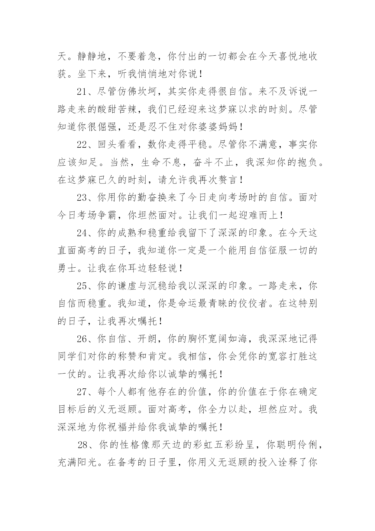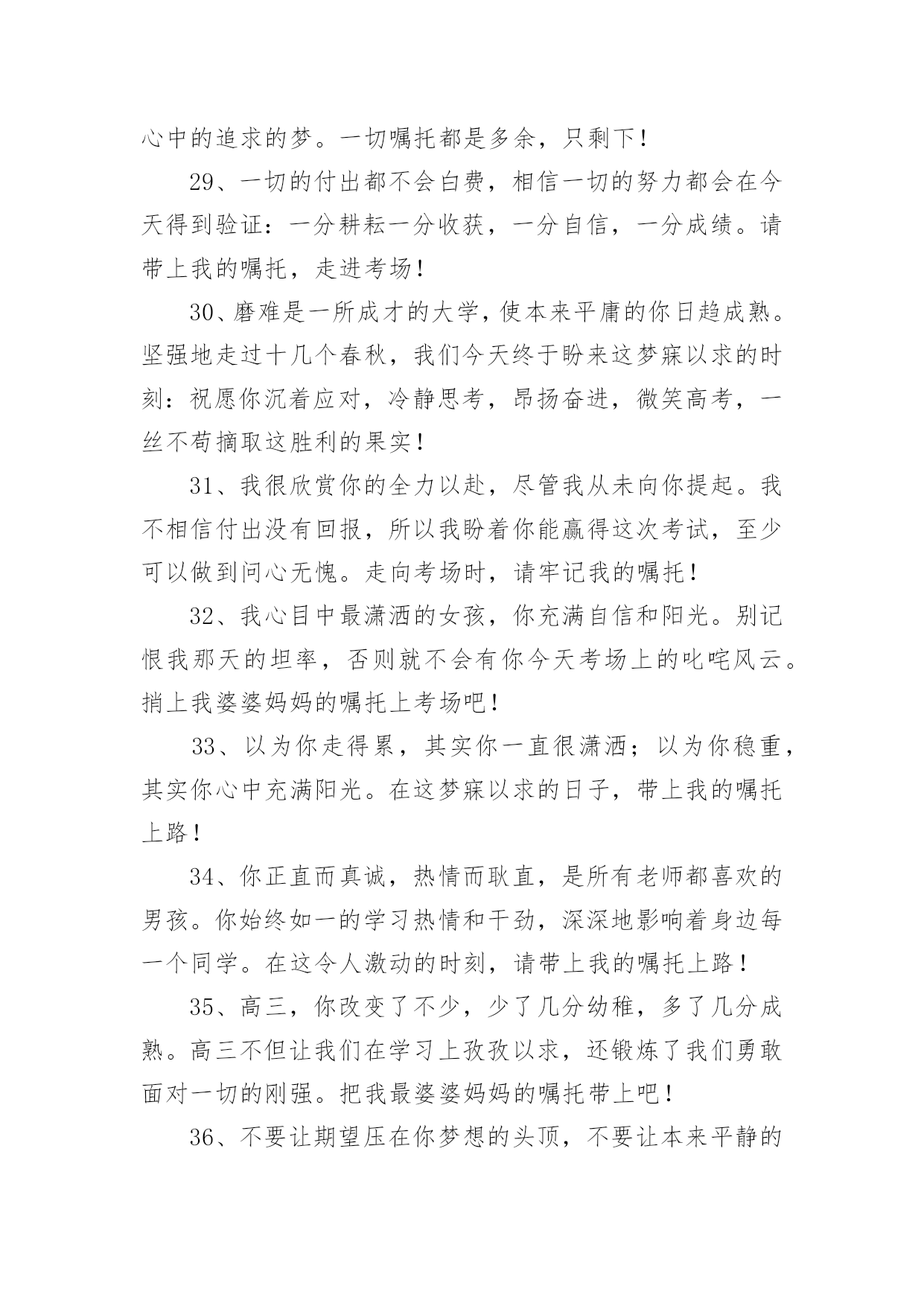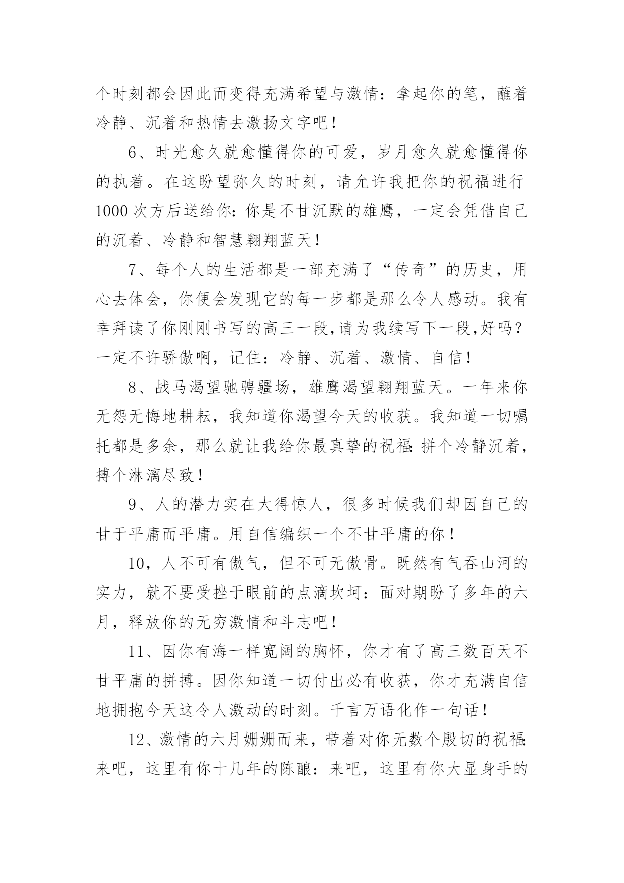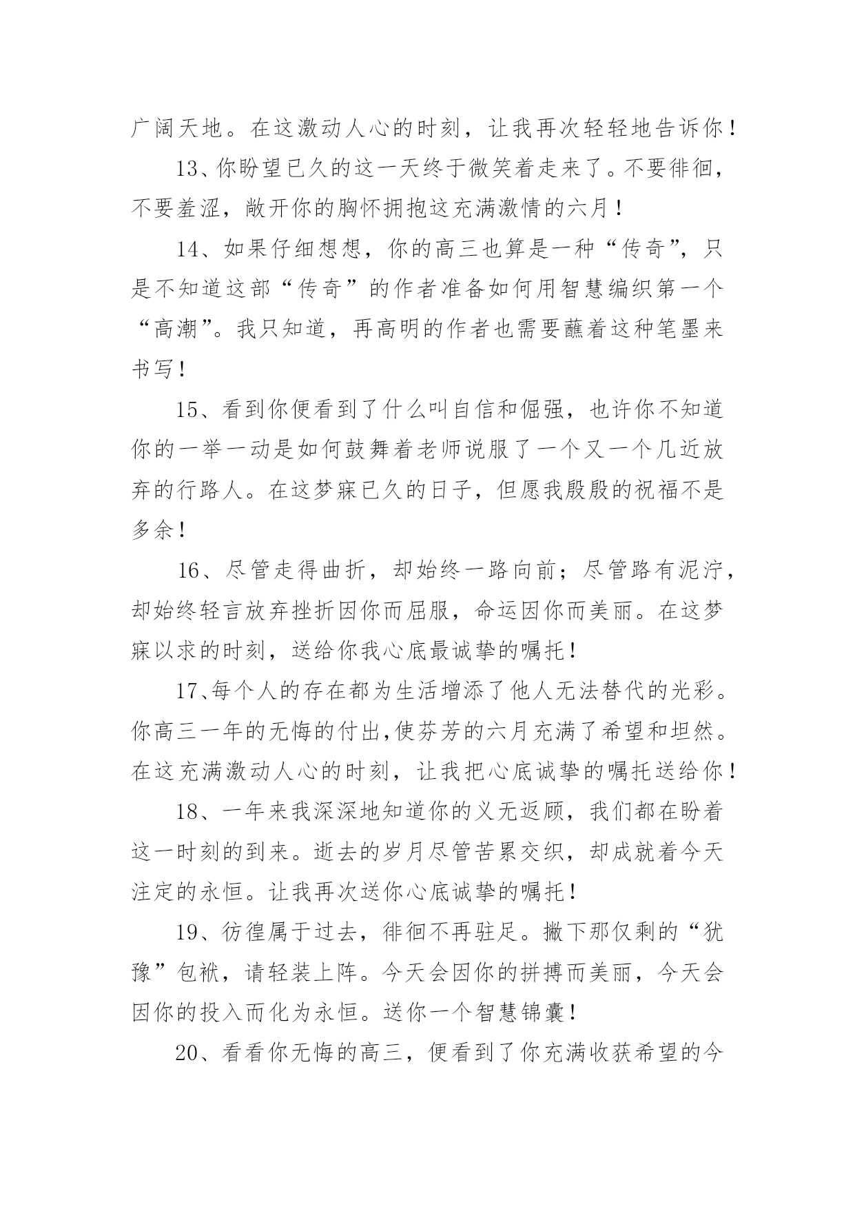 高三高考寄语高三高考寄语在平平淡淡的学习、工作、生活中,大家都经常接触到寄语吧,通过寄语人们可以心中的所思所想表达出来。写寄语时要注意的事项有很多,你都知道吗?以下是小编精心整理的高三高考寄语,仅供参考,大家一起来看看吧。高三高考寄语11、幽默滑稽王子,今天感觉如何?面对这日思夜想的时刻,最好再幽上一默,也好给自己壮壮胆,对吧?我还是老一套,你看有用就捎上吧!2、磨难是一所成才的大学,使本来平庸的你日趋成熟。坚强地走过十几个春秋,我们今天终于盼来这梦寐以求的时刻:祝愿你沉着应对,冷静思考,昂扬奋进,微笑高考,一丝不苟摘取这胜利的果实!3、高考是我们求学十几年一直梦寐以求的时刻,面对这一刻,我们没有理由徘徊和彷徨。每一个懂得珍惜的人都会用沉着、冷静、认真、热情、执着和自信来迎接她!4、如果你心中有梦,你就应当对每一天的生活充满激情;既然你曾为这一刻付出了无数的汗水,那么面对收获就不要犹豫:用冷静来酝酿、用沉着来应对、用激情来收获!5过去的日子写满你的执着、坚强和自信,今天的每一个时刻都会因此而变得充满希望与激情:拿起你的笔,蘸着冷静、沉着和热情去激扬文字吧!6、时光愈久就愈懂得你的可爱,岁月愈久就愈懂得你的执着。在这盼望弥久的时刻,请允许我把你的祝福进行1000次方后送给你:你是不甘沉默的雄鹰,一定会凭借自己的沉着、冷静和智慧翱翔蓝天!7、每个人的生活都是一部充满了“传奇”的历史,用心去体会,你便会发现它的每一步都是那么令人感动。我有幸拜读了你刚刚书写的高三一段,请为我续写下一段,好吗?一定不许骄傲啊,记住:冷静、沉着、激情、自信!8、战马渴望驰骋疆场,雄鹰渴望翱翔蓝天。一年来你无怨无悔地耕耘,我知道你渴望今天的收获。我知道一切嘱托都是多余,那么就让我给你最真挚的祝福:拼个冷静沉着,搏个淋漓尽致!9、人的潜力实在大得惊人,很多时候我们却因自己的甘于平庸而平庸。用自信编织一个不甘平庸的你!10,人不可有傲气,但不可无傲骨。既然有气吞山河的实力,就不要受挫于眼前的点滴坎坷:面对期盼了多年的六月,释放你的无穷激情和斗志吧!11、因你有海一样宽阔的胸怀,你才有了高三数百天不甘平庸的拼搏。因你知道一切付出必有收获,你才充满自信地拥抱今天这令人激动的时刻。千言万语化作一句话!12、激情的六月姗姗而来,带着对你无数个殷切的祝福:来吧,这里有你十几年的陈酿:来吧,这里有你大显身手的广阔天地。在这激动人心的时刻,让我再次轻轻地告诉你!13、你盼望已久的这一天终于微笑着走来了。不要徘徊,不要羞涩,敞开你的胸怀拥抱这充满激情的六月!14、如果仔细想想,你的高三也算是一种“传奇”,只是不知道这部“传奇”的作者准备如何用智慧编织第一个“高潮”。我只知道,再高明的作者也需要蘸着这种笔墨来书写!15、看到你便看到了什么叫自信和倔强,也许你不知道你的一举一动是如何鼓舞着老师说服了一个又一个几近放弃的行路人。在这梦寐已久的日子,但愿我殷殷的祝福不是多余!16、尽管走得曲折,却始终一路向前;尽管路有泥泞,却始终轻言放弃挫折因你而屈服,命运因你而美丽。在这梦寐以求的时刻,送给你我心底最诚挚的嘱托!17、每个人的存在都为生活增添了他人无法替代的光彩。你高三一年的无悔的付出,使芬芳的六月充满了希望和坦然。在这充满激动人心的时刻,让我把心底诚挚的嘱托送给你!18、一年来我深深地知道你的义无返顾,我们都在盼着这一时刻的到来。逝去的岁月尽管苦累交织,却成就着今天注定的永恒。让我再次送你心底诚挚的嘱托!19、彷徨属于过去,徘徊不再驻足。撇下那仅剩的“犹豫”包袱,请轻装上阵。今天会因你的拼搏而美丽,今天会因你的投入而化为永恒。送你一个智慧锦囊!20、看看你无悔的高三,便看到了你充满收获希望的今天。静静地,不要着急,你付出的一切都会在今天喜悦地收获。坐下来,听我悄悄地对你说!21、尽管仿佛坎坷,其实你走得很自信。来不及诉说一路走来的酸甜苦辣,我们已经迎来这梦寐以求的时刻。尽管知道你很倔强,还是忍不住对你婆婆妈妈!22、回头看看,数你走得平稳。尽管你不满意,事实你应该知足。当然,生命不息,奋斗不止,我深知你的抱负。在这梦寐已久的时刻,请允许我再次赘言!23、你用你的勤奋换来了今日走向考场时的自信。面对今日考场争霸,你坦然面对。让我们一起迎难而上!24、你的成熟和稳重给我留下了深深的印象。在今天这直面高考的日子,我知道你一定是一个能用自信征服一切的勇士。让我在你耳边轻轻说!25、你的谦虚与沉稳给我以深深的印象。一路走来,你自信而稳重。我知道,你是命运最青睐的佼佼者。在这特别的日子,让我再次嘱托!26、你自信、开朗,你的胸怀宽阔如海,我深深地记得同学们对你的称赞和肯定。我相信,你会凭你的宽容打胜这一仗的。让我再次给你以诚挚的嘱托!27、每个人都有他存在的价值,你的价值在于你在确定目标