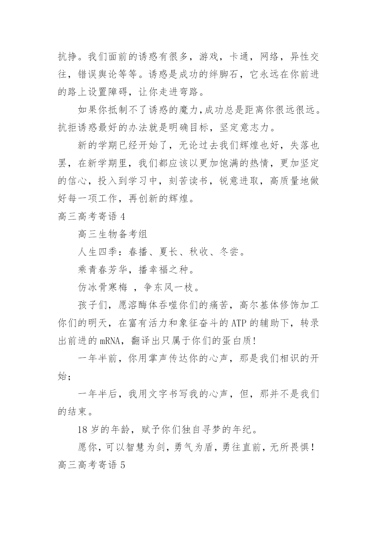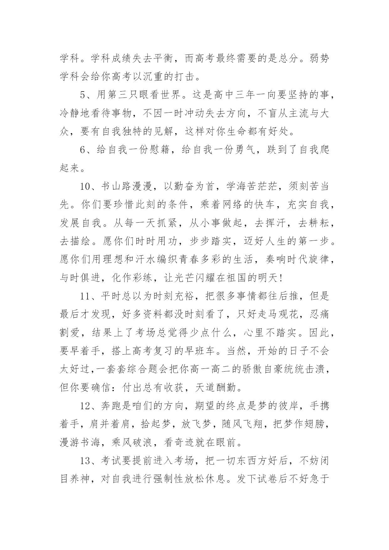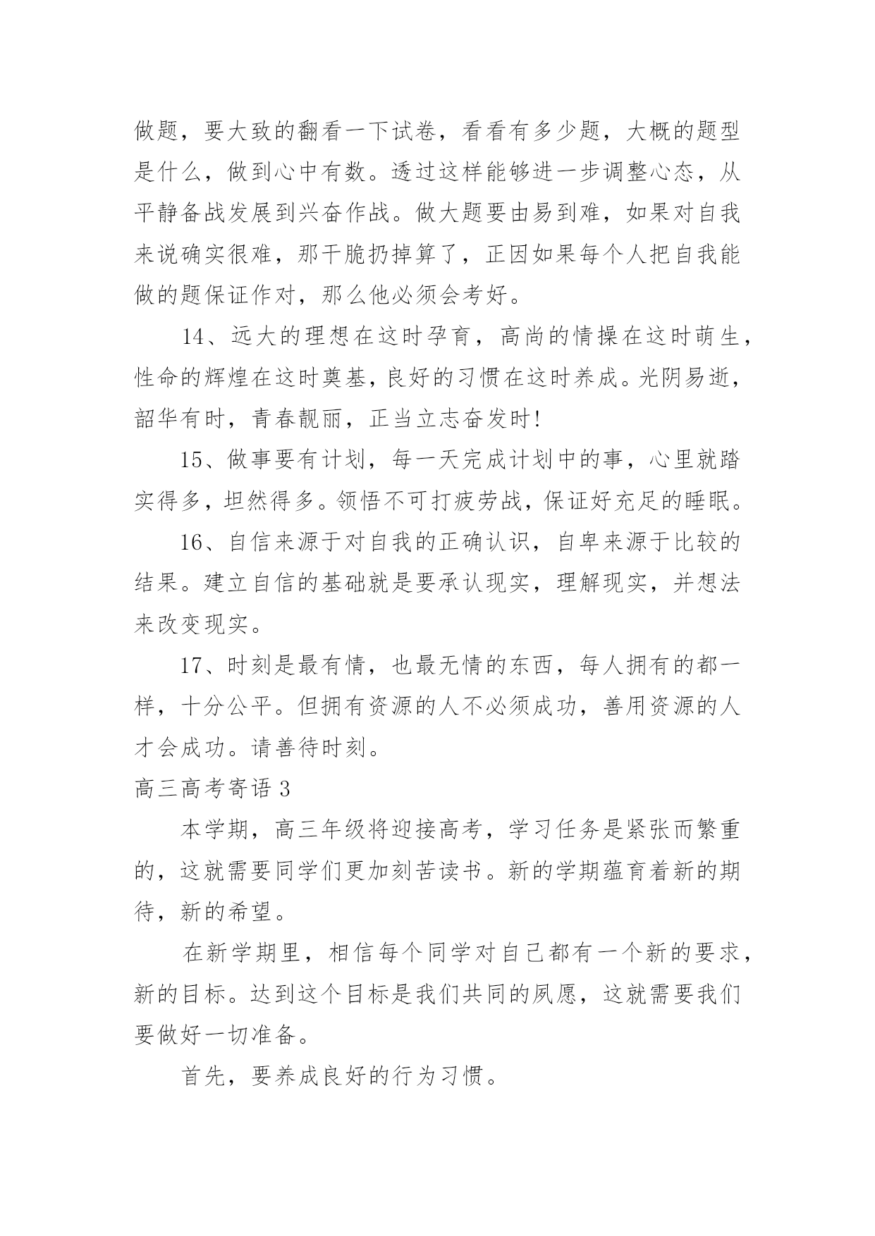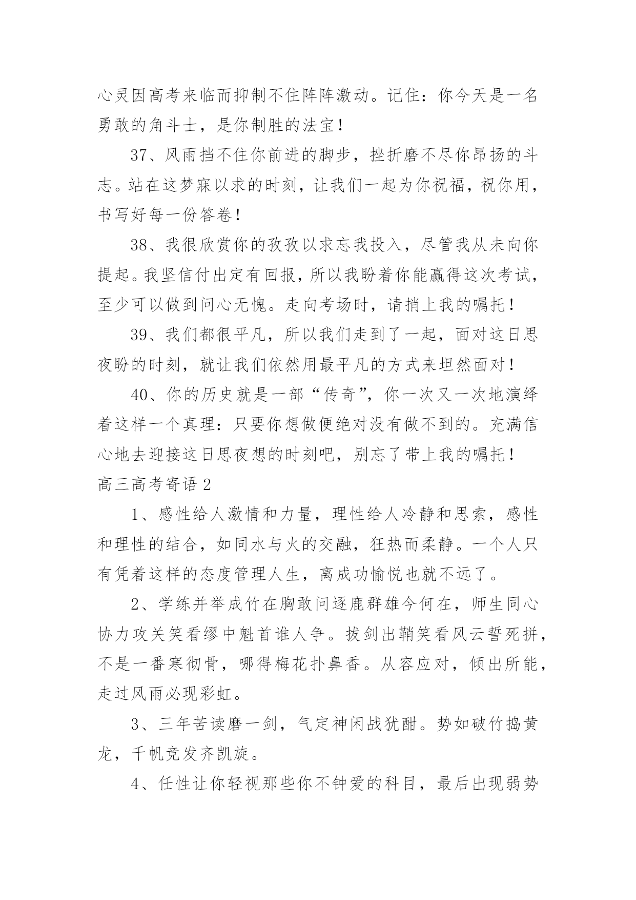 高三高考寄语高三高考寄语在平平淡淡的学习、工作、生活中,大家都经常接触到寄语吧,通过寄语人们可以心中的所思所想表达出来。写寄语时要注意的事项有很多,你都知道吗?以下是小编精心整理的高三高考寄语,仅供参考,大家一起来看看吧。高三高考寄语11、幽默滑稽王子,今天感觉如何?面对这日思夜想的时刻,最好再幽上一默,也好给自己壮壮胆,对吧?我还是老一套,你看有用就捎上吧!2、磨难是一所成才的大学,使本来平庸的你日趋成熟。坚强地走过十几个春秋,我们今天终于盼来这梦寐以求的时刻:祝愿你沉着应对,冷静思考,昂扬奋进,微笑高考,一丝不苟摘取这胜利的果实!3、高考是我们求学十几年一直梦寐以求的时刻,面对这一刻,我们没有理由徘徊和彷徨。每一个懂得珍惜的人都会用沉着、冷静、认真、热情、执着和自信来迎接她!4、如果你心中有梦,你就应当对每一天的生活充满激情;既然你曾为这一刻付出了无数的汗水,那么面对收获就不要犹豫:用冷静来酝酿、用沉着来应对、用激情来收获!5过去的日子写满你的执着、坚强和自信,今天的每一个时刻都会因此而变得充满希望与激情:拿起你的笔,蘸着冷静、沉着和热情去激扬文字吧!6、时光愈久就愈懂得你的可爱,岁月愈久就愈懂得你的执着。在这盼望弥久的时刻,请允许我把你的祝福进行1000次方后送给你:你是不甘沉默的雄鹰,一定会凭借自己的沉着、冷静和智慧翱翔蓝天!7、每个人的生活都是一部充满了“传奇”的历史,用心去体会,你便会发现它的每一步都是那么令人感动。我有幸拜读了你刚刚书写的高三一段,请为我续写下一段,好吗?一定不许骄傲啊,记住:冷静、沉着、激情、自信!8、战马渴望驰骋疆场,雄鹰渴望翱翔蓝天。一年来你无怨无悔地耕耘,我知道你渴望今天的收获。我知道一切嘱托都是多余,那么就让我给你最真挚的祝福:拼个冷静沉着,搏个淋漓尽致!9、人的潜力实在大得惊人,很多时候我们却因自己的甘于平庸而平庸。用自信编织一个不甘平庸的你!10,人不可有傲气,但不可无傲骨。既然有气吞山河的实力,就不要受挫于眼前的点滴坎坷:面对期盼了多年的六月,释放你的无穷激情和斗志吧!11、因你有海一样宽阔的胸怀,你才有了高三数百天不甘平庸的拼搏。因你知道一切付出必有收获,你才充满自信地拥抱今天这令人激动的时刻。千言万语化作一句话!12、激情的六月姗姗而来,带着对你无数个殷切的祝福:来吧,这里有你十几年的陈酿:来吧,这里有你大显身手的广阔天地。在这激动人心的时刻,让我再次轻轻地告诉你!13、你盼望已久的这一天终于微笑着走来了。不要徘徊,不要羞涩,敞开你的胸怀拥抱这充满激情的六月!14、如果仔细想想,你的高三也算是一种“传奇”,只是不知道这部“传奇”的作者准备如何用智慧编织第一个“高潮”。我只知道,再高明的作者也需要蘸着这种笔墨来书写!15、看到你便看到了什么叫自信和倔强,也许你不知道你的一举一动是如何鼓舞着老师说服了一个又一个几近放弃的行路人。在这梦寐已久的日子,但愿我殷殷的祝福不是多余!16、尽管走得曲折,却始终一路向前;尽管路有泥泞,却始终轻言放弃挫折因你而屈服,命运因你而美丽。在这梦寐以求的时刻,送给你我心底最诚挚的嘱托!17、每个人的存在都为生活增添了他人无法替代的光彩。你高三一年的无悔的付出,使芬芳的六月充满了希望和坦然。在这充满激动人心的时刻,让我把心底诚挚的嘱托送给你!18、一年来我深深地知道你的义无返顾,我们都在盼着这一时刻的到来。逝去的岁月尽管苦累交织,却成就着今天注定的永恒。让我再次送你心底诚挚的嘱托!19、彷徨属于过去,徘徊不再驻足。撇下那仅剩的“犹豫”包袱,请轻装上阵。今天会因你的拼搏而美丽,今天会因你的投入而化为永恒。送你一个智慧锦囊!20、看看你无悔的高三,便看到了你充满收获希望的今天。静静地,不要着急,你付出的一切都会在今天喜悦地收获。坐下来,听我悄悄地对你说!21、尽管仿佛坎坷,其实你走得很自信。来不及诉说一路走来的酸甜苦辣,我们已经迎来这梦寐以求的时刻。尽管知道你很倔强,还是忍不住对你婆婆妈妈!22、回头看看,数你走得平稳。尽管你不满意,事实你应该知足。当然,生命不息,奋斗不止,我深知你的抱负。在这梦寐已久的时刻,请允许我再次赘言!23、你用你的勤奋换来了今日走向考场时的自信。面对今日考场争霸,你坦然面对。让我们一起迎难而上!24、你的成熟和稳重给我留下了深深的印象。在今天这直面高考的日子,我知道你一定是一个能用自信征服一切的勇士。让我在你耳边轻轻说!25、你的谦虚与沉稳给我以深深的印象。一路走来,你自信而稳重。我知道,你是命运最青睐的佼佼者。在这特别的日子,让我再次嘱托!26、你自信、开朗,你的胸怀宽阔如海,我深深地记得同学们对你的称赞和肯定。我相信,你会凭你的宽容打胜这一仗的。让我再次给你以诚挚的嘱托!27、每个人都有他存在的价值,你的价值在于你在确定目标