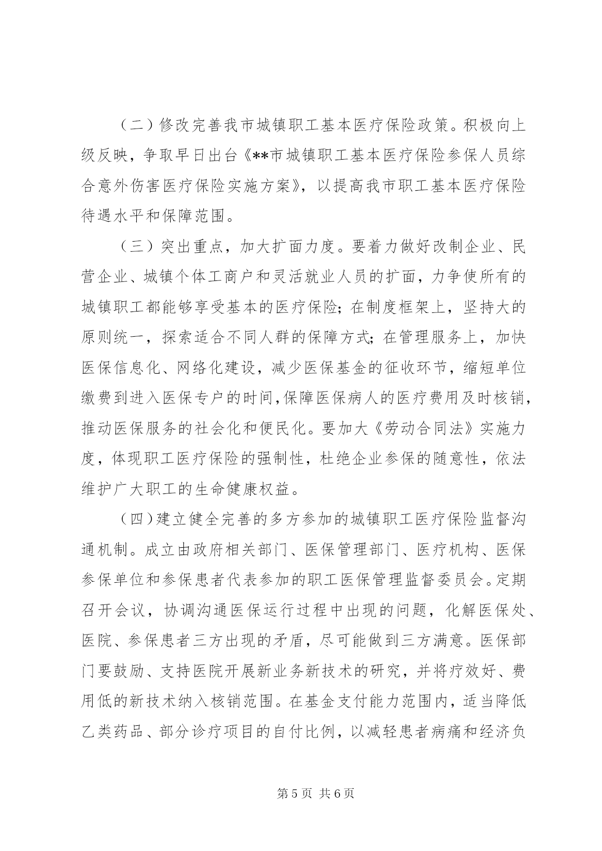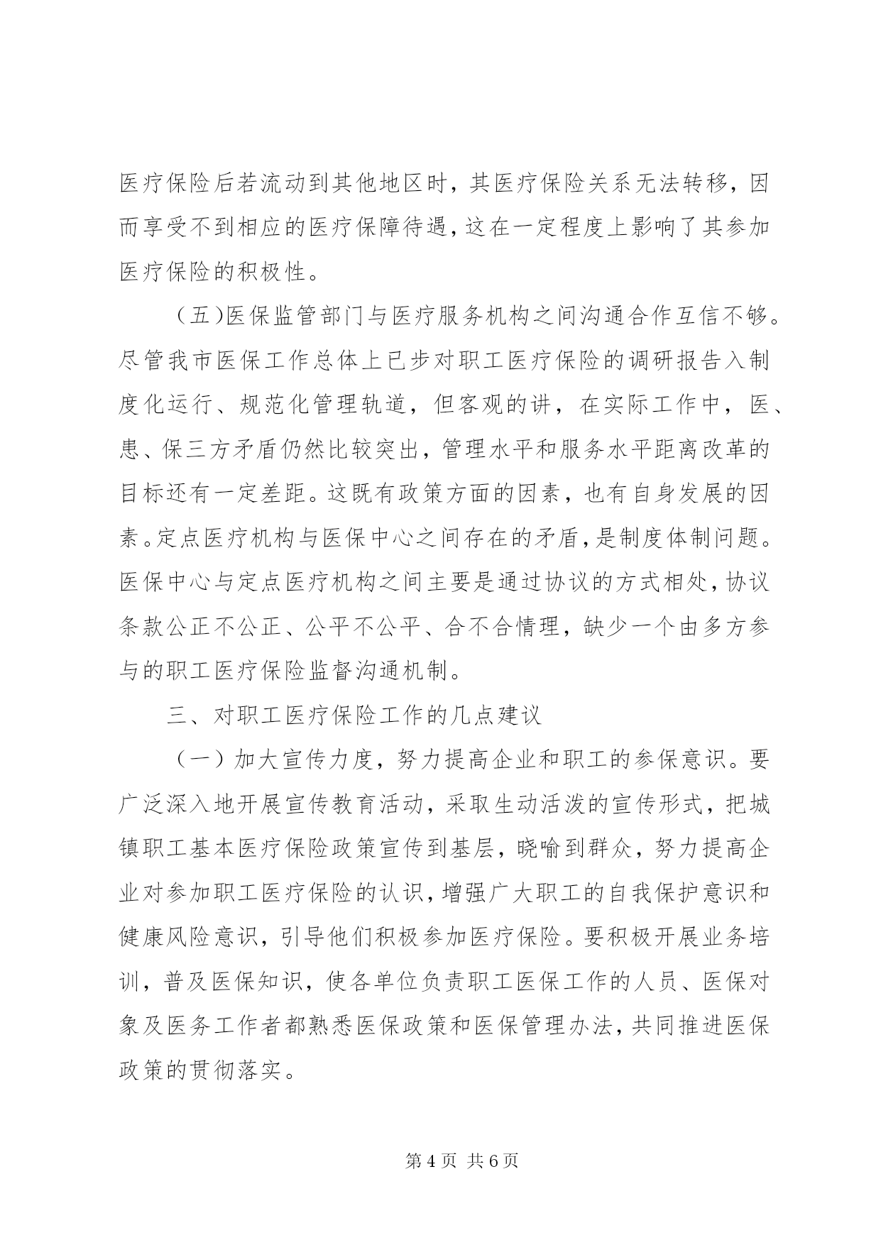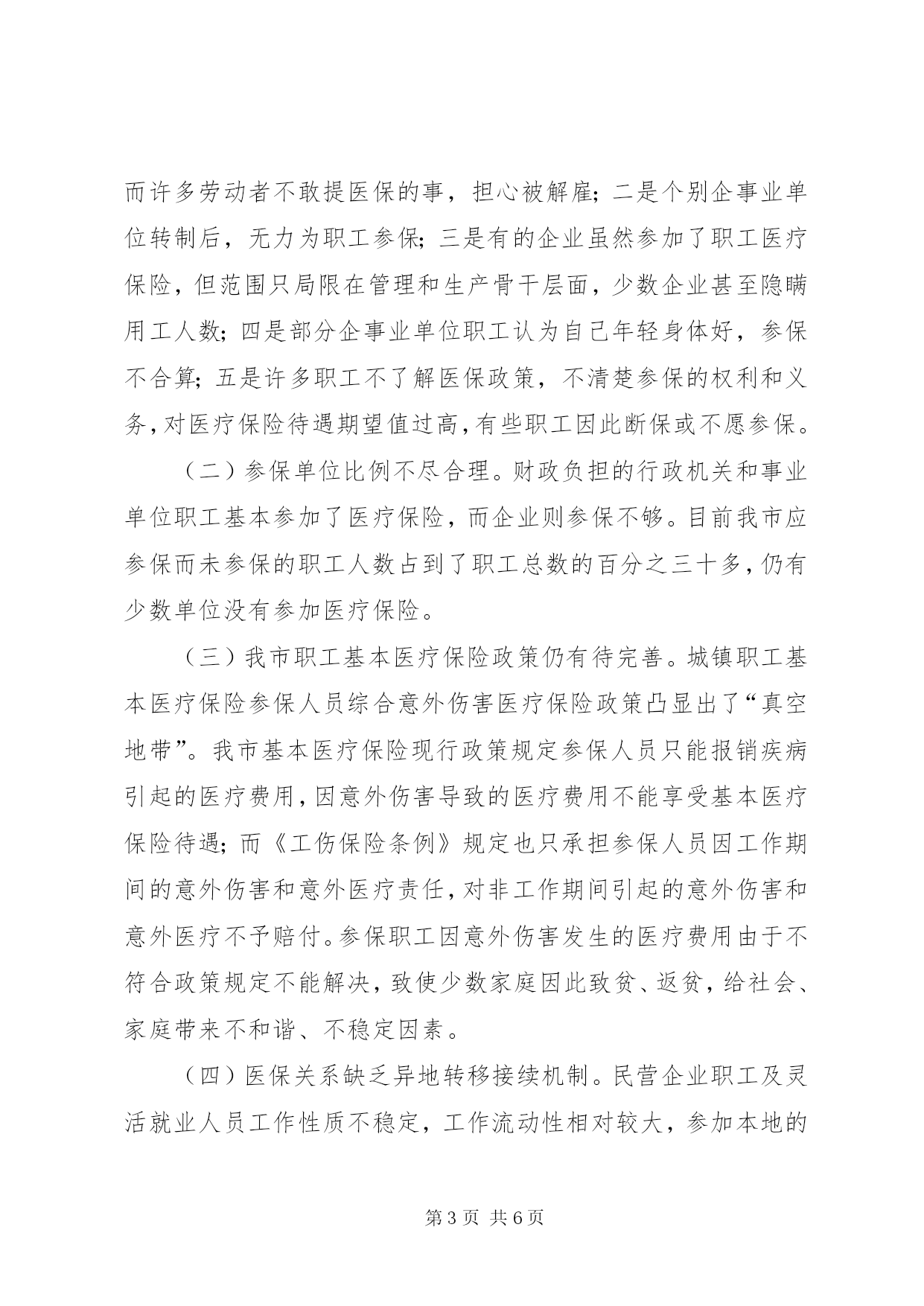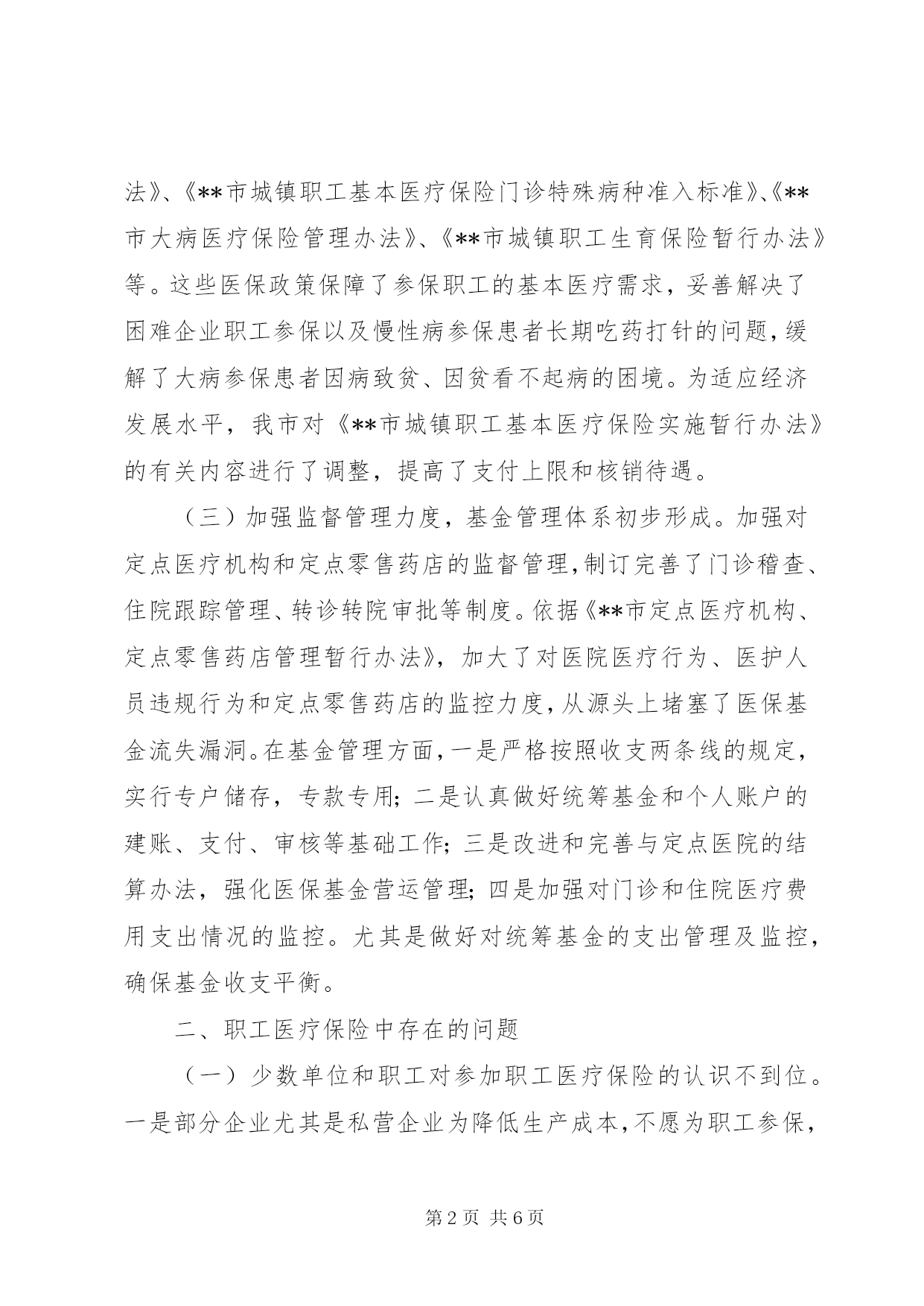 第PAGE\*Arabic\*MERGEFORMAT6页共NUMPAGES\*MERGEFORMAT6页对职工医疗保险的调研报告一、职工医疗保险的现状(一)医保覆盖面逐年扩大,基金收支基本平衡。截止到2008年11月底,我市参加医疗保险、工伤保险、生育保险人数分别为107596人、89646人、40853人;今年前11个月“三险”新增扩面人数分别达到11022人、19149人、2879人,共征收医疗基金、工伤基金、生育基金、大病保险基金分别为12453万元、1008万元、453万元、1161万元,超额完成了上级下达的任务数。今年前11个月,基本医疗保险为全市参保患者提供医疗保险服务86.78万人次,其中门诊84.64万人次,住院2.14万人次,共支出医疗保险基金9910万元(其中统筹基金支出5440万元,个人账户4463万元),大病支付1085万元;工伤基金赔付1442人次,支出754万元;生育保险基金使用466人次,支出169万元。城镇职工医疗保险基金到2008年11月底统筹结余1770万元,累计统筹基金滚存结余3178万元,个人账户沉淀结余3587万元,医疗保险基金收支基本平衡,累计结存合理,抗风险能力较强。(二)不断探索医改难点,多层次医保政策体系逐步建立。2000年市政府出台《**市城镇职工基本医疗保险实施暂行办法》,在此基础上,又先后出台了《**市城镇社会从业人员基本医疗保险实施暂行办法》、《**市困难企业基本医疗保险实施办法》、《**市城镇职工基本医疗保险门诊特殊病种准入标准》、《**市大病医疗保险管理办法》、《**市城镇职工生育保险暂行办法》等。这些医保政策保障了参保职工的基本医疗需求,妥善解决了困难企业职工参保以及慢性病参保患者长期吃药打针的问题,缓解了大病参保患者因病致贫、因贫看不起病的困境。为适应经济发展水平,我市对《**市城镇职工基本医疗保险实施暂行办法》的有关内容进行了调整,提高了支付上限和核销待遇。(三)加强监督管理力度,基金管理体系初步形成。加强对定点医疗机构和定点零售药店的监督管理,制订完善了门诊稽查、住院跟踪管理、转诊转院审批等制度。依据《**市定点医疗机构、定点零售药店管理暂行办法》,加大了对医院医疗行为、医护人员违规行为和定点零售药店的监控力度,从源头上堵塞了医保基金流失漏洞。在基金管理方面,一是严格按照收支两条线的规定,实行专户储存,专款专用;二是认真做好统筹基金和个人账户的建账、支付、审核等基础工作;三是改进和完善与定点医院的结算办法,强化医保基金营运管理;四是加强对门诊和住院医疗费用支出情况的监控。尤其是做好对统筹基金的支出管理及监控,确保基金收支平衡。二、职工医疗保险中存在的问题(一)少数单位和职工对参加职工医疗保险的认识不到位。一是部分企业尤其是私营企业为降低生产成本,不愿为职工参保,而许多劳动者不敢提医保的事,担心被解雇;二是个别企事业单位转制后,无力为职工参保;三是有的企业虽然参加了职工医疗保险,但范围只局限在管理和生产骨干层面,少数企业甚至隐瞒用工人数;四是部分企事业单位职工认为自己年轻身体好,参保不合算;五是许多职工不了解医保政策,不清楚参保的权利和义务,对医疗保险待遇期望值过高,有些职工因此断保或不愿参保。(二)参保单位比例不尽合理。财政负担的行政机关和事业单位职工基本参加了医疗保险,而企业则参保不够。目前我市应参保而未参保的职工人数占到了职工总数的百分之三十多,仍有少数单位没有参加医疗保险。(三)我市职工基本医疗保险政策仍有待完善。城镇职工基本医疗保险参保人员综合意外伤害医疗保险政策凸显出了“真空地带”。我市基本医疗保险现行政策规定参保人员只能报销疾病引起的医疗费用,因意外伤害导致的医疗费用不能享受基本医疗保险待遇;而《工伤保险条例》规定也只承担参保人员因工作期间的意外伤害和意外医疗责任,对非工作期间引起的意外伤害和意外医疗不予赔付。参保职工因意外伤害发生的医疗费用由于不符合政策规定不能解决,致使少数家庭因此致贫、返贫,给社会、家庭带来不和谐、不稳定因素。(四)医保关系缺乏异地转移接续机制。民营企业职工及灵活就业人员工作性质不稳定,工作流动性相对较大,参加本地的医疗保险后若流动到其他地区时,其医疗保险关系无法转移,因而享受不到相应的医疗保障待遇,这在一定程度上影响了其参加医疗保险的积极性。(五)医保监管部门与医疗服务机构之间沟通合作互信不够。尽管我市医保工作总体上已步对职工医疗保险的调研报告入制度化运行、规范化管理轨道,但客观的讲,在实际工作中,医、患、保三方矛盾仍然比较突出,管理水平和服务水平距离改革的目标还有一定差距。这既有政策方面的因素,也有自身发展的因素。定点医疗机构与医保中心之间存在的矛盾,是制度体制问题。医保中心与定点医疗机构之间主