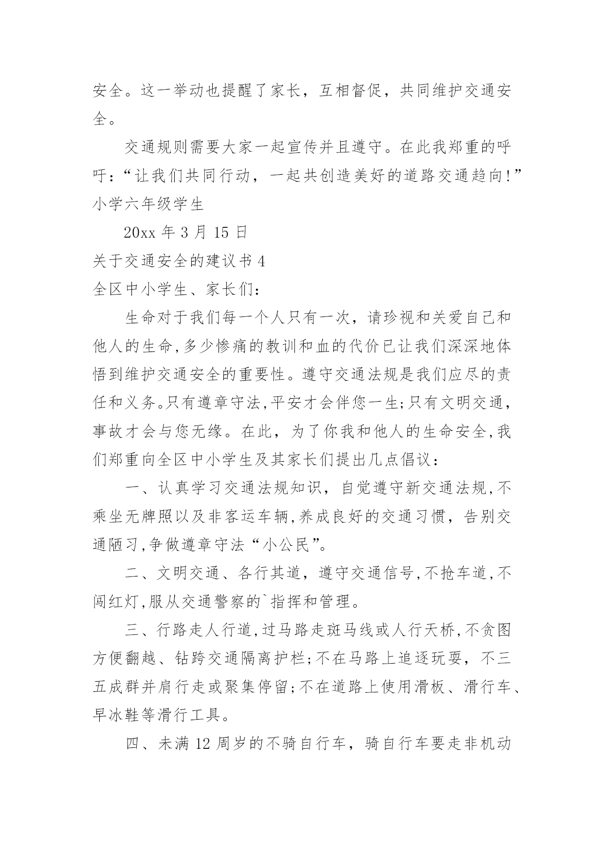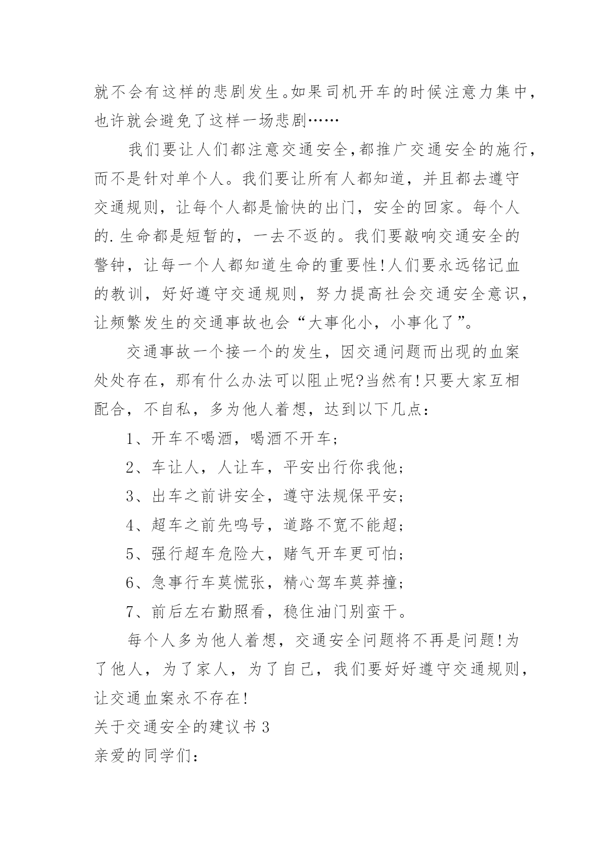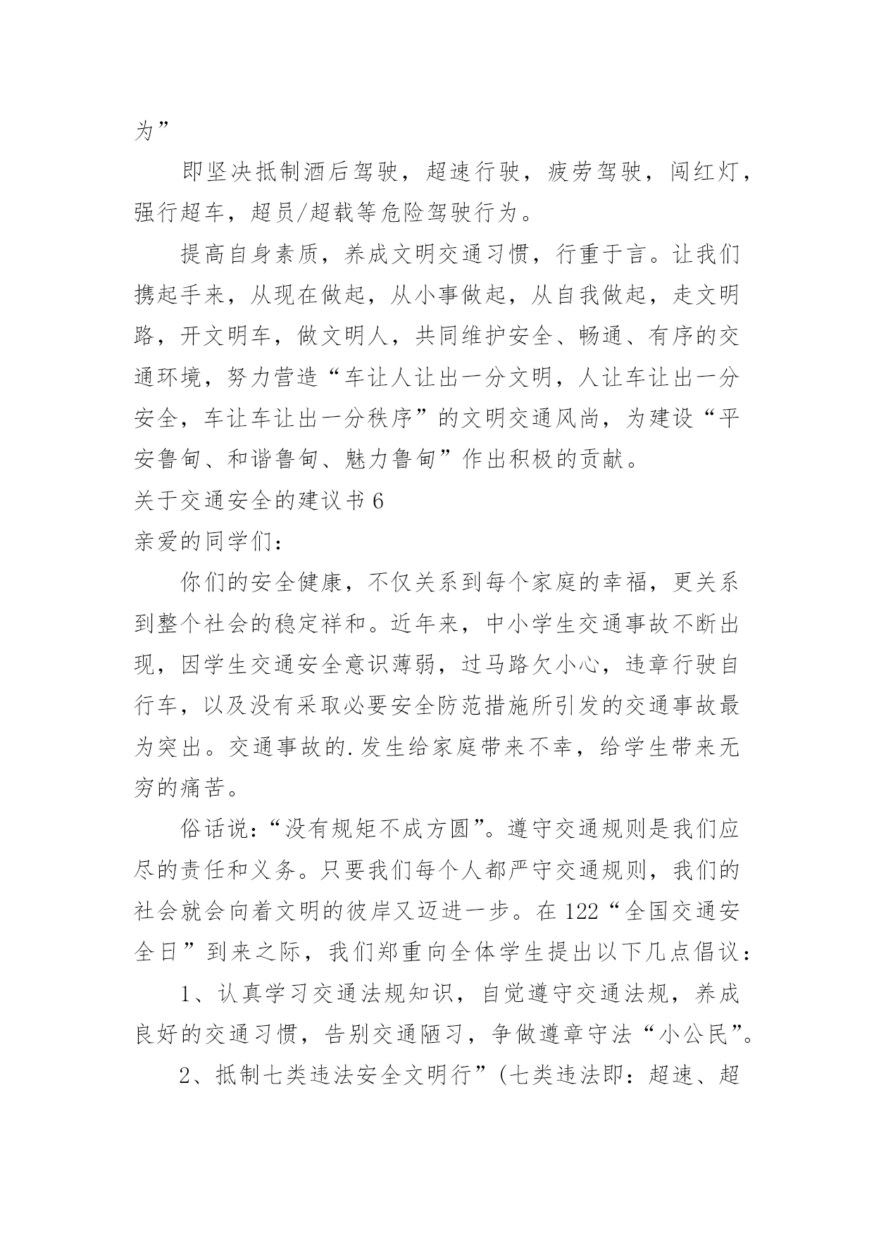 交通安全的建议书关于交通安全的建议书6篇随着社会不断地进步,我们都可能会用到建议书,建议书不是最终的定文形式,它可以被修改,被增删,甚至弃之不用,它具有较强的可塑性。你写建议书时总是没有新意?以下是小编整理的关于交通安全的建议书,欢迎阅读,希望大家能够喜欢。关于交通安全的建议书1为维护良好的城市交通秩序,提升城市文明程度和品味,营造安全、畅通、和谐、文明的交通环境,我们每个人都应该自觉成为文明交通的宣传者、推动者、践行者。自觉遵守道路交通安全法律法规,努力倡导文明交通新风是每个公民应尽的责任和义务。为此,我们发出“文明交通、我们行动”建议:一、从规范停车做起。机动车在道路两侧停车时,应当在施划的道路停车泊位内顺向停放。临时停车时,均不得妨碍其他车辆和行人正常通行。严禁在道路交叉口、应急通道口等法律明令禁止的地点乱停乱放。非机动车也应在指定区域或不妨碍通行的`地点统一摆放整齐。二、倡导文明交通行为。机动车礼让斑马线;机动车按序排队通行;机动车有序停放;文明正确使用车灯;行人、非机动车遵守信号灯,各行其道不影响妨碍道路交通秩序与安全,体现文明交通新风尚。三、摒弃交通陋习。机动车不随意变更车道;不占用应急车道;开车不接打手机;开车、乘车系好安全带;驾乘摩托车戴好安全头盔;行人过街不随意穿行走人行横道线。”四、抵制危险驾驶行为。严禁酒后驾驶、超速行驶、疲劳驾驶、闯红灯、强行超车、超员、超载。”城市文明看交通,广大市民朋友们,为了大家的出行安全,让我们携起手来,从我做起,从现在做起,养成良好的交通行为习惯,自觉抵制交通违法行为,共同创造我县安全、文明、畅通的道路交通环境。关于交通安全的建议书2随着社会的飞快发展,我们的国家进入了高科技信息时代。现代科技越来越发达,人们都过上了小康生活。可是,现在社会上也存在一些不良的问题。比如:交通安全问题。交通安全问题一直是社会上的几大问题之一,然而,由于条件的限制,迟迟没有解决。随着经济飞速的发展,车辆川流不息地在公路上行驶,交通事故时常走进我们的生活,那有没有人想过,这是为什么?那是一个阳光明媚的早晨,一个四年级的学生在路边踢毽子,毽子掉在马路中间了,她跑去捡,就在她玩得高兴的时候,一辆卡车迎面驶来,毫不留情地从她身上压过去,就在这一瞬,丧失了宝贵的生命。难道是阎王爷的生死簿上写着她会在此时死去吗?不是的,这并不是你所想的那样。如果这个小姑娘把安全牢记在心,就不会跑到马路中间去玩,就不会有这样的悲剧发生。如果司机开车的时候注意力集中,也许就会避免了这样一场悲剧……我们要让人们都注意交通安全,都推广交通安全的施行,而不是针对单个人。我们要让所有人都知道,并且都去遵守交通规则,让每个人都是愉快的出门,安全的回家。每个人的.生命都是短暂的,一去不返的。我们要敲响交通安全的警钟,让每一个人都知道生命的重要性!人们要永远铭记血的教训,好好遵守交通规则,努力提高社会交通安全意识,让频繁发生的交通事故也会“大事化小,小事化了”。交通事故一个接一个的发生,因交通问题而出现的血案处处存在,那有什么办法可以阻止呢?当然有!只要大家互相配合,不自私,多为他人着想,达到以下几点:1、开车不喝酒,喝酒不开车;2、车让人,人让车,平安出行你我他;3、出车之前讲安全,遵守法规保平安;4、超车之前先鸣号,道路不宽不能超;5、强行超车危险大,赌气开车更可怕;6、急事行车莫慌张,精心驾车莫莽撞;7、前后左右勤照看,稳住油门别蛮干。每个人多为他人着想,交通安全问题将不再是问题!为了他人,为了家人,为了自己,我们要好好遵守交通规则,让交通血案永不存在!关于交通安全的建议书3亲爱的同学们:我是一名六年级的小学生,每天从所有学生一样上学放学。最近在我们家到学校的路程中,我发现了一个问题,那就是交通安全问题。如果有人向你大讲特讲交通规则,那么你可能会说‘这些我早就知道了!’但是在你随意横穿马路,和汽车擦肩而过时,让人不禁怀疑,你真的知道吗?其实这些都因为我们不重视这些。我们把‘红灯停,绿灯行,黄灯等一等’这类话从小听到现在。但是我们没有把它们记在心里。在我们与汽车争分夺秒时,我们想的.只是要快走,停下来等汽车太慢了。我想这有可能是没有意识到安全对我们的重要性。遵守交通规则并不应该只是听和说,我想在此提出几条建议:1、如果是自己走,那么在过马路之前先左右看看车。宁等一分钟,不争一秒钟。2、如果是和家长一起走,那么一定要听家长的话,千万不要擅自向前冲。3、等绿灯亮时我们才能走,要等另一头的车停下时再走。不要因为着急赶路而冒险。4、自己写一些关于交通规则的提示,时时刻刻提醒自己。5、搜集交通知识,编写歌谣。向周围人普及交通规则。6、看到别人想做违反交通规则的事,一定要极力阻止他。7、把交通规则和家长分享,让大家一起来维护交通的安全。这一举动也提