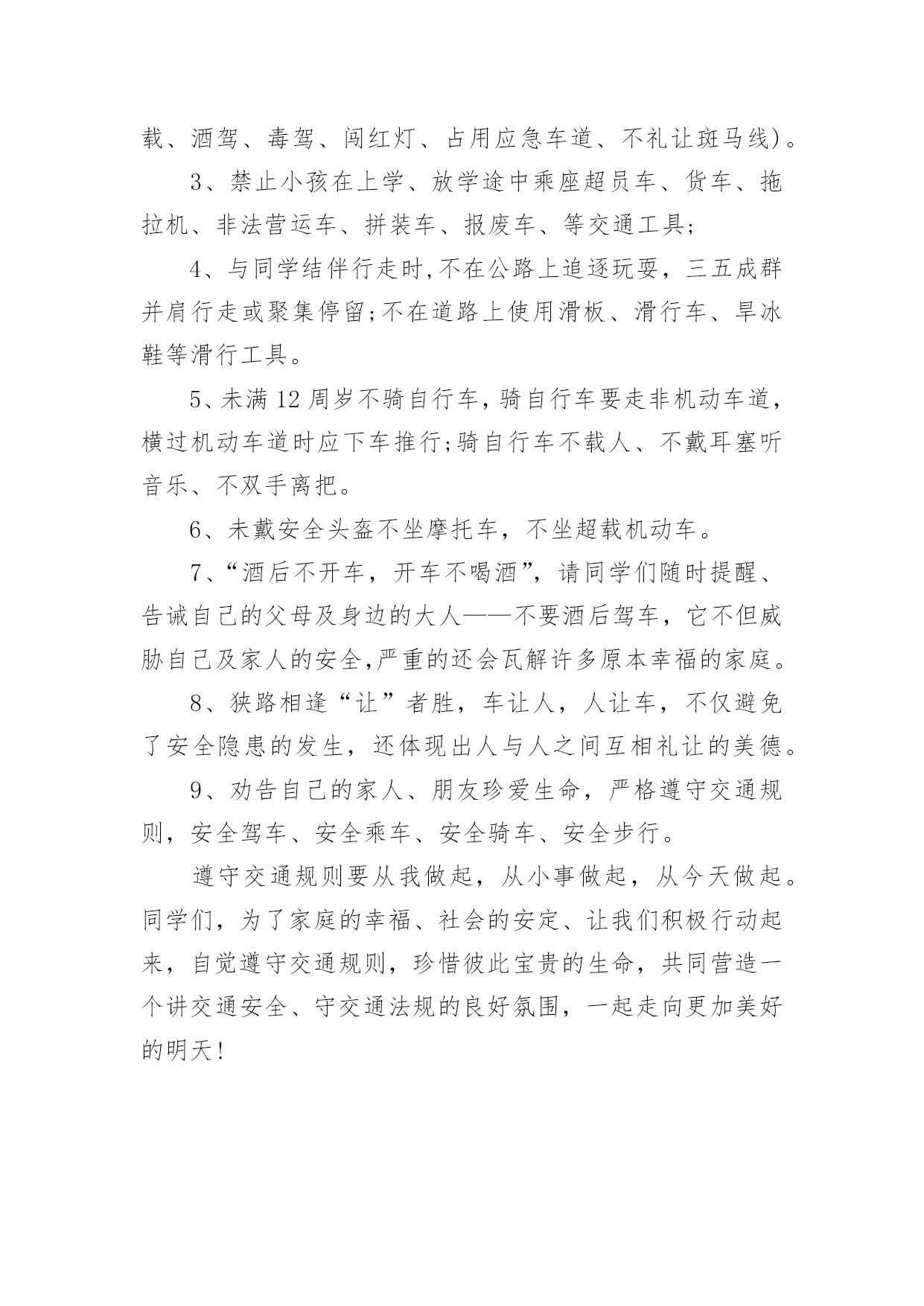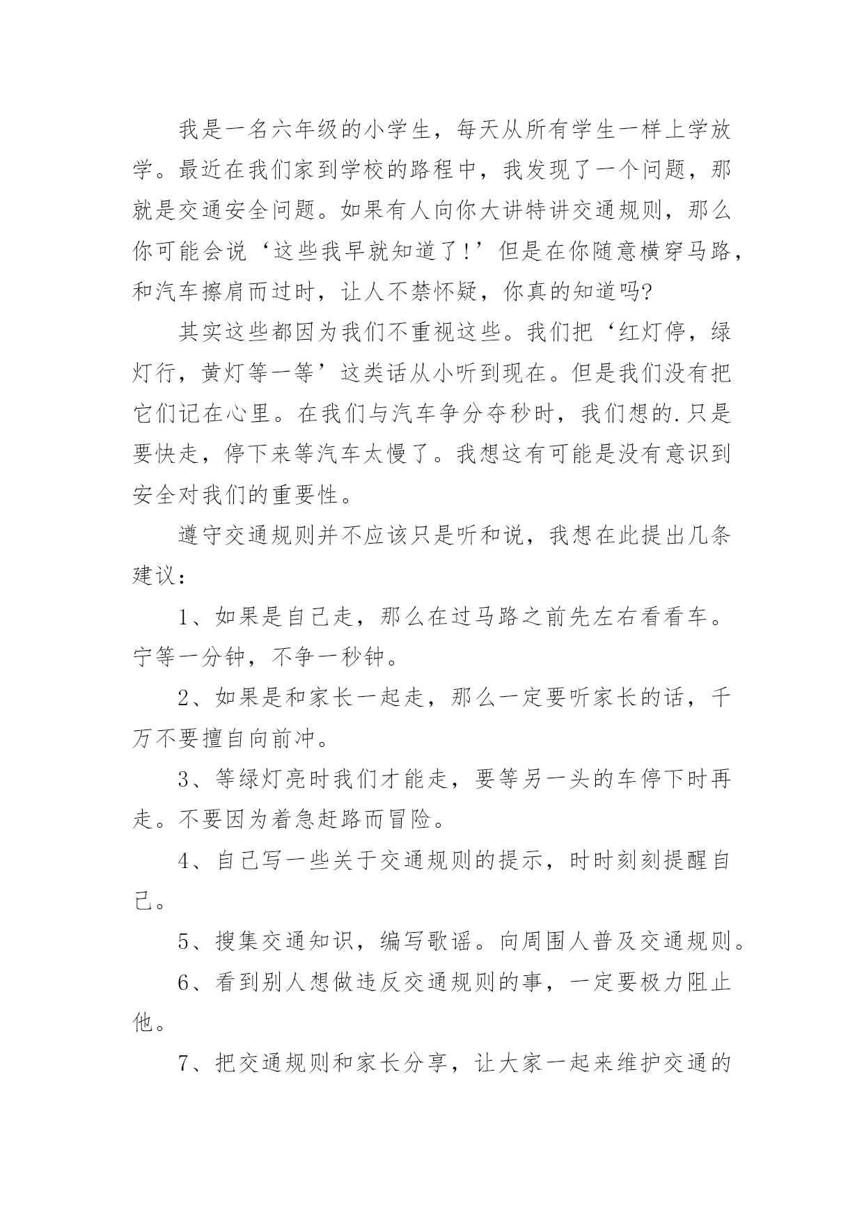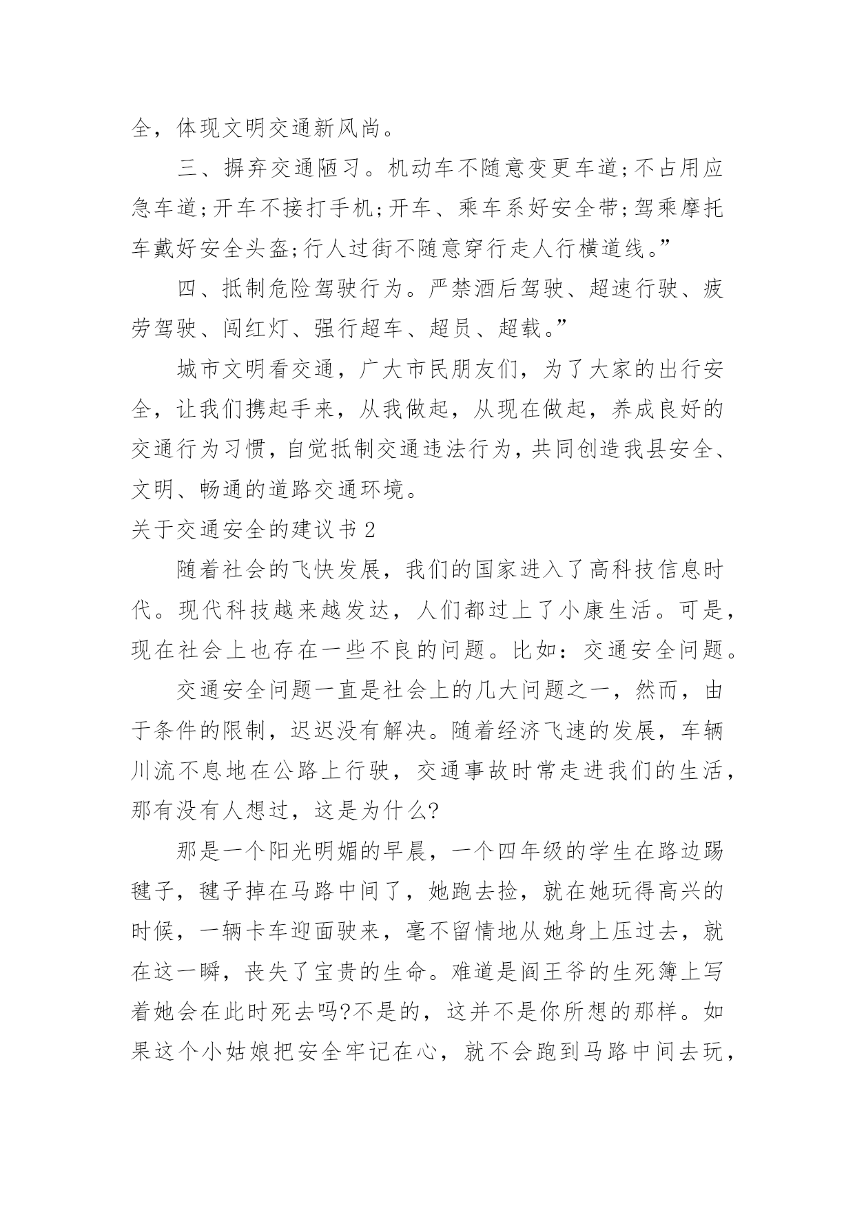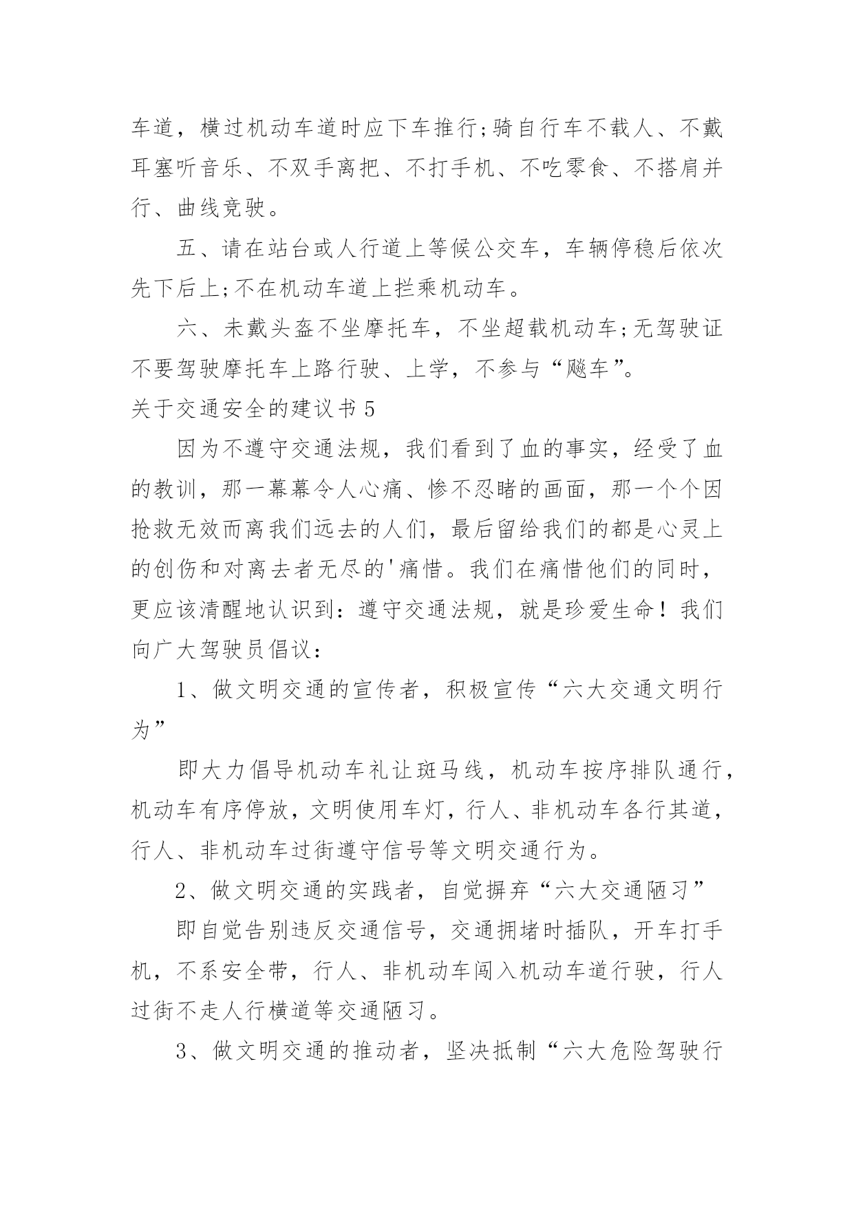 交通安全的建议书关于交通安全的建议书6篇随着社会不断地进步,我们都可能会用到建议书,建议书不是最终的定文形式,它可以被修改,被增删,甚至弃之不用,它具有较强的可塑性。你写建议书时总是没有新意?以下是小编整理的关于交通安全的建议书,欢迎阅读,希望大家能够喜欢。关于交通安全的建议书1为维护良好的城市交通秩序,提升城市文明程度和品味,营造安全、畅通、和谐、文明的交通环境,我们每个人都应该自觉成为文明交通的宣传者、推动者、践行者。自觉遵守道路交通安全法律法规,努力倡导文明交通新风是每个公民应尽的责任和义务。为此,我们发出“文明交通、我们行动”建议:一、从规范停车做起。机动车在道路两侧停车时,应当在施划的道路停车泊位内顺向停放。临时停车时,均不得妨碍其他车辆和行人正常通行。严禁在道路交叉口、应急通道口等法律明令禁止的地点乱停乱放。非机动车也应在指定区域或不妨碍通行的`地点统一摆放整齐。二、倡导文明交通行为。机动车礼让斑马线;机动车按序排队通行;机动车有序停放;文明正确使用车灯;行人、非机动车遵守信号灯,各行其道不影响妨碍道路交通秩序与安全,体现文明交通新风尚。三、摒弃交通陋习。机动车不随意变更车道;不占用应急车道;开车不接打手机;开车、乘车系好安全带;驾乘摩托车戴好安全头盔;行人过街不随意穿行走人行横道线。”四、抵制危险驾驶行为。严禁酒后驾驶、超速行驶、疲劳驾驶、闯红灯、强行超车、超员、超载。”城市文明看交通,广大市民朋友们,为了大家的出行安全,让我们携起手来,从我做起,从现在做起,养成良好的交通行为习惯,自觉抵制交通违法行为,共同创造我县安全、文明、畅通的道路交通环境。关于交通安全的建议书2随着社会的飞快发展,我们的国家进入了高科技信息时代。现代科技越来越发达,人们都过上了小康生活。可是,现在社会上也存在一些不良的问题。比如:交通安全问题。交通安全问题一直是社会上的几大问题之一,然而,由于条件的限制,迟迟没有解决。随着经济飞速的发展,车辆川流不息地在公路上行驶,交通事故时常走进我们的生活,那有没有人想过,这是为什么?那是一个阳光明媚的早晨,一个四年级的学生在路边踢毽子,毽子掉在马路中间了,她跑去捡,就在她玩得高兴的时候,一辆卡车迎面驶来,毫不留情地从她身上压过去,就在这一瞬,丧失了宝贵的生命。难道是阎王爷的生死簿上写着她会在此时死去吗?不是的,这并不是你所想的那样。如果这个小姑娘把安全牢记在心,就不会跑到马路中间去玩,就不会有这样的悲剧发生。如果司机开车的时候注意力集中,也许就会避免了这样一场悲剧……我们要让人们都注意交通安全,都推广交通安全的施行,而不是针对单个人。我们要让所有人都知道,并且都去遵守交通规则,让每个人都是愉快的出门,安全的回家。每个人的.生命都是短暂的,一去不返的。我们要敲响交通安全的警钟,让每一个人都知道生命的重要性!人们要永远铭记血的教训,好好遵守交通规则,努力提高社会交通安全意识,让频繁发生的交通事故也会“大事化小,小事化了”。交通事故一个接一个的发生,因交通问题而出现的血案处处存在,那有什么办法可以阻止呢?当然有!只要大家互相配合,不自私,多为他人着想,达到以下几点:1、开车不喝酒,喝酒不开车;2、车让人,人让车,平安出行你我他;3、出车之前讲安全,遵守法规保平安;4、超车之前先鸣号,道路不宽不能超;5、强行超车危险大,赌气开车更可怕;6、急事行车莫慌张,精心驾车莫莽撞;7、前后左右勤照看,稳住油门别蛮干。每个人多为他人着想,交通安全问题将不再是问题!为了他人,为了家人,为了自己,我们要好好遵守交通规则,让交通血案永不存在!关于交通安全的建议书3亲爱的同学们:我是一名六年级的小学生,每天从所有学生一样上学放学。最近在我们家到学校的路程中,我发现了一个问题,那就是交通安全问题。如果有人向你大讲特讲交通规则,那么你可能会说‘这些我早就知道了!’但是在你随意横穿马路,和汽车擦肩而过时,让人不禁怀疑,你真的知道吗?其实这些都因为我们不重视这些。我们把‘红灯停,绿灯行,黄灯等一等’这类话从小听到现在。但是我们没有把它们记在心里。在我们与汽车争分夺秒时,我们想的.只是要快走,停下来等汽车太慢了。我想这有可能是没有意识到安全对我们的重要性。遵守交通规则并不应该只是听和说,我想在此提出几条建议:1、如果是自己走,那么在过马路之前先左右看看车。宁等一分钟,不争一秒钟。2、如果是和家长一起走,那么一定要听家长的话,千万不要擅自向前冲。3、等绿灯亮时我们才能走,要等另一头的车停下时再走。不要因为着急赶路而冒险。4、自己写一些关于交通规则的提示,时时刻刻提醒自己。5、搜集交通知识,编写歌谣。向周围人普及交通规则。6、看到别人想做违反交通规则的事,一定要极力阻止他。7、把交通规则和家长分享,让大家一起来维护交通的安全。这一举动也提