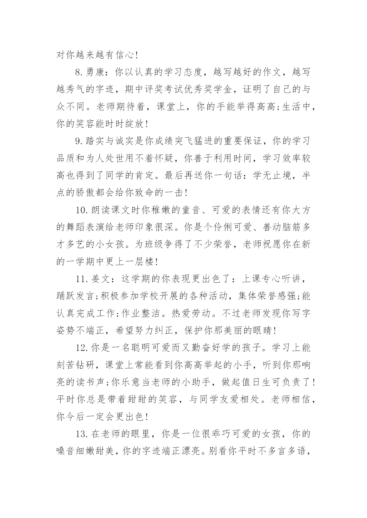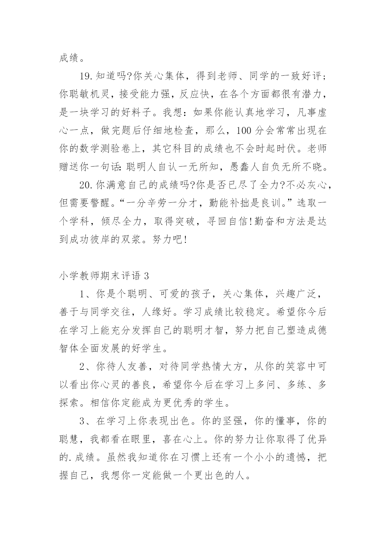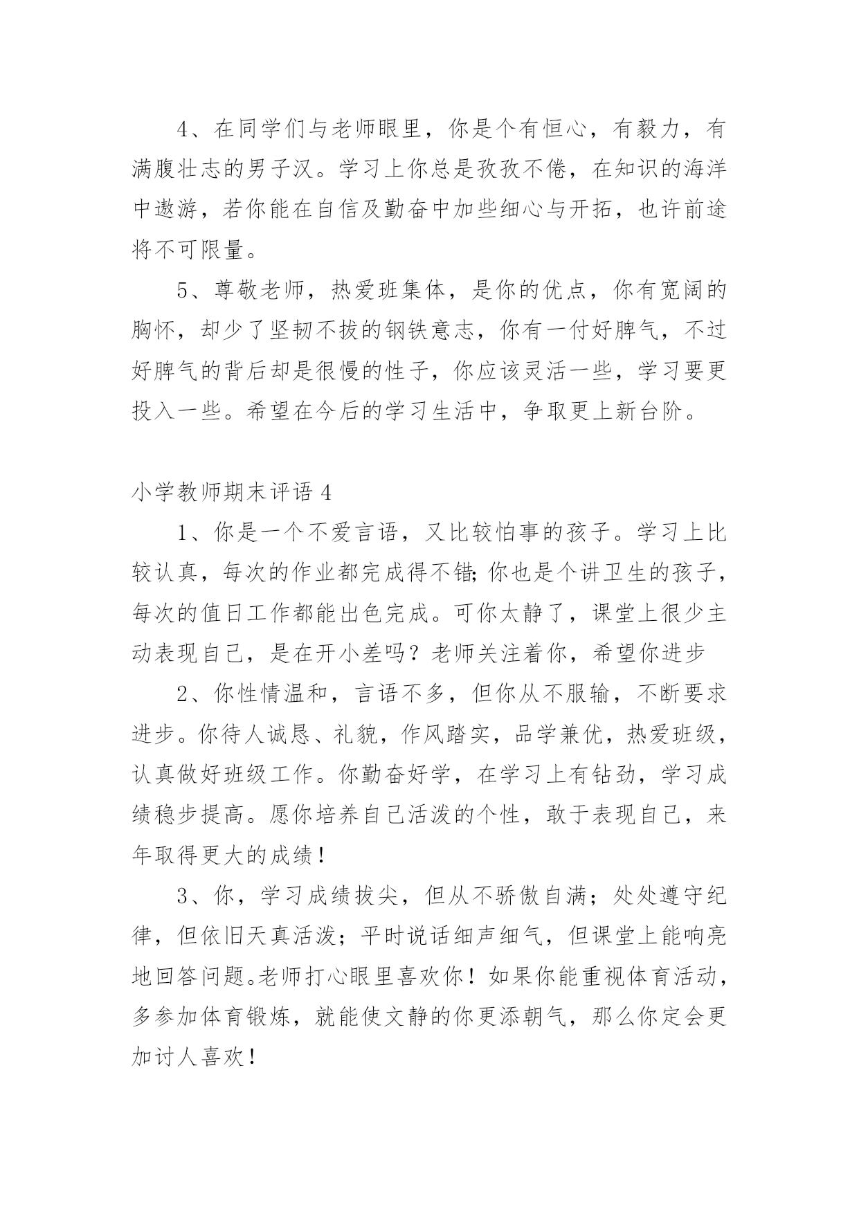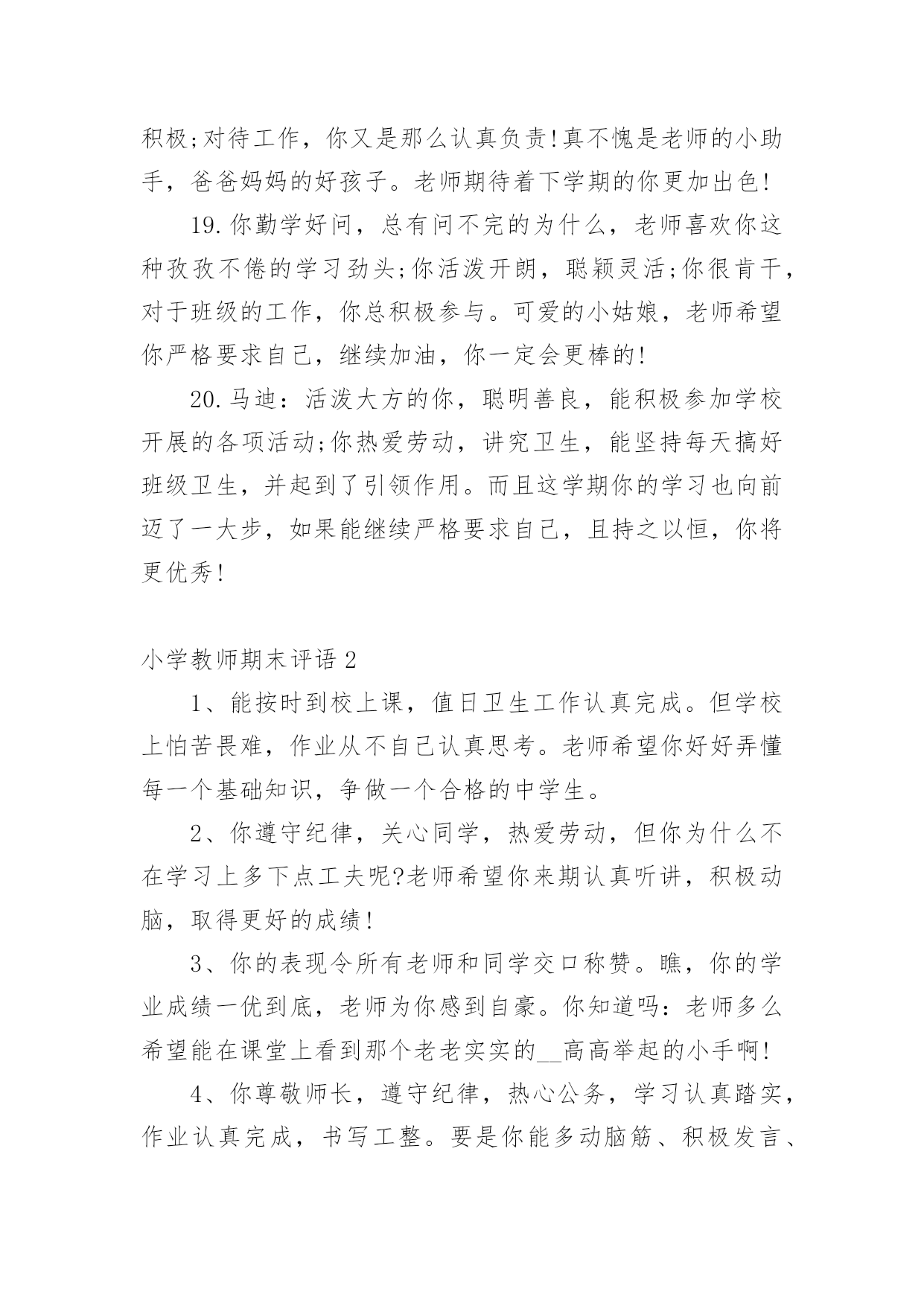 小学教师期末评语小学教师期末评语15篇在学习、工作乃至生活中,大家都不可避免地要接触到评语吧,评语的内容、格式、其实很多朋友都不太清楚什么样的评语才是好的评语,下面是小编精心整理的小学教师期末评语,希望对大家有所帮助。小学教师期末评语11.你是一个文静可爱而又多才多艺的女孩。你有着积极的学习态度,课上你能认真听讲,课下积极完成作业。而且你还特别爱帮助人,有着一颗宽容的心。特别是你漂亮的字迹,栩栩如生的绘画,也给大家留下了深刻的印象。希望下学期,你能在课堂上给自己更多的锻炼的机会,多积累点课外知识,上课要专心听讲,让自己成为一个更加优秀的学生,相信自己你会做得更好的。2.你在打乒乒时,总是那么的专注,那样的认真,高超的技艺使对方措手不及,深得老师的赞许,同学的喝彩,要是有一天,你在课堂上也像打乒乒球那样的专注、认真,那更会博得同学们的称颂,老师也会为见到一个崭新的你而倍感欣慰!3.你是个做事认真的孩子,每次都能认真地完成老师布置的各项任务,课堂上回答问题也比较积极,而且你的街舞和篮球技巧也得到了老师和同学们的欢呼。但是你上课喜欢睡觉的习惯要好好改正过来,所以老师希望在新的学期里你能给自己提出更高的目标,改掉不好的习惯,让自己在各方面都有更大的进步。4.你是个心地善良、乖巧可爱、仔细周到的女孩。看到课堂上,你那专注的神情,认真的学习态度,老师也感到欣慰。最令同学和老师难忘的是你扎实的基本功,漂亮的书写,还有就是你初为班级干部的认真与执着,每次尾随老师走进办公室时,老师就会觉得你特别亲人,那委婉的'笑容以深深地印在老师的脑中。如果你再自信些,平时能多思、多问、多读,更加大胆的展示自我,相信你会有更大的收获。5.你上课基本上能专心听讲,但成绩一般;能独立完成作业,但是经常会迟交、漏做;而你上课老是迟到的毛病也改过来了,希望你能遵守学校纪律,做到不迟到、不旷课,更刻苦、努力的争取好成绩!你上课认真听讲,老师给你总的评价是好的,但在学习上一定要加强,作业要认真完成,不会的要多向老师同学请教。同时课后也要抓紧些。只要你能做到相信不久以后你的成绩会有很大的提高。6.何平:刚入学时,你就是一头小牛犊。可现在,你以更工整的字迹,更积极的发言,更虚心的态度,更大的改正错误的勇气,证明了自己的进步!老师有理由相信,来年,你会做得更好!7.盛:人如其名,你就象一棵茁壮成长的小树,越长越“茂盛”。看吧:越来越守纪律,懂礼貌;书写越来越工整,本子上的勾越来越多;成绩越来越好;老师当然越来越喜欢你,对你越来越有信心!8.勇康:你以认真的学习态度,越写越好的作文,越写越秀气的字迹,期中评奖考试优秀奖学金,证明了自己的与众不同。老师期待着,课堂上,你的手能举得高高;生活中,你的笑容能时时绽放!9.踏实与诚实是你成绩突飞猛进的重要保证,你的学习品质和为人处世用不着怀疑,你善于利用时间,学习效率较高也得到了同学的肯定。最后再送你一句话:学无止境,半点的骄傲都会给你致命的一击!10.朗读课文时你稚嫩的童音、可爱的表情还有你大方的舞蹈表演给老师印象很深。你是个伶俐可爱、善动脑筋多才多艺的小女孩。为班级争得了不少荣誉,老师祝愿你在新的一学期中更上一层楼!11.姜文:这学期的你表现更出色了:上课专心听讲,踊跃发言;积极参加学校开展的各种活动,集体荣誉感强;能认真完成工作;作业整洁。热爱劳动。不过老师发现你写字姿势不端正,希望努力纠正,保护你那美丽的眼睛!12.你是一名聪明可爱而又勤奋好学的孩子。学习上能刻苦钻研,课堂上常能看到你高高举起的小手,听到你那响亮的读书声;你乐意当老师的小助手,做起值日生可负责了!平时你总是带着甜甜的笑容,与同学友爱相处。老师相信,你今后一定会更出色!13.在老师的眼里,你是一位很乖巧可爱的女孩,你的嗓音细嫩甜美,你的字迹端正漂亮。别看你平时不多言多语,课堂上你却专心听讲,认真完成作业,常常受到同学和老师的赞赏。如果课堂上你也能把手举得高高的,让同学听听你那独到的见解,那就更好了!14.你是老师很欣赏的学生,你的聪明叫大家惊讶。在语文课堂上的表现真了不起!那么难的问题都回答的那么好,思维真是太敏捷了。如果在课堂上能再专心写,你会更加了不起的。继续努力吧,老师希望你在新的学期里能取得更大的进步。15.少而好学,如日出之阳;壮而好学,如日中之光;老而好学,如灼烛之明,求学的目的是涵养道德,但若只重视学识的增进,就失去了求学的意义,希望你能努力向身边的好榜样学习,明确学习的目的,做一名品学兼优的好学生。16.你是一位聪明可爱、待人真诚的好孩子,对集体和他人的事非常关心,老师喜欢看到你上课高高举起的小手,喜欢听到你响亮的回答,更喜欢你默默努力的样子??但学习不是件轻松简单的事,加油吧,我们一起努力好吗?我相信一定会成功的!17.你真诚可爱,对待同学热情