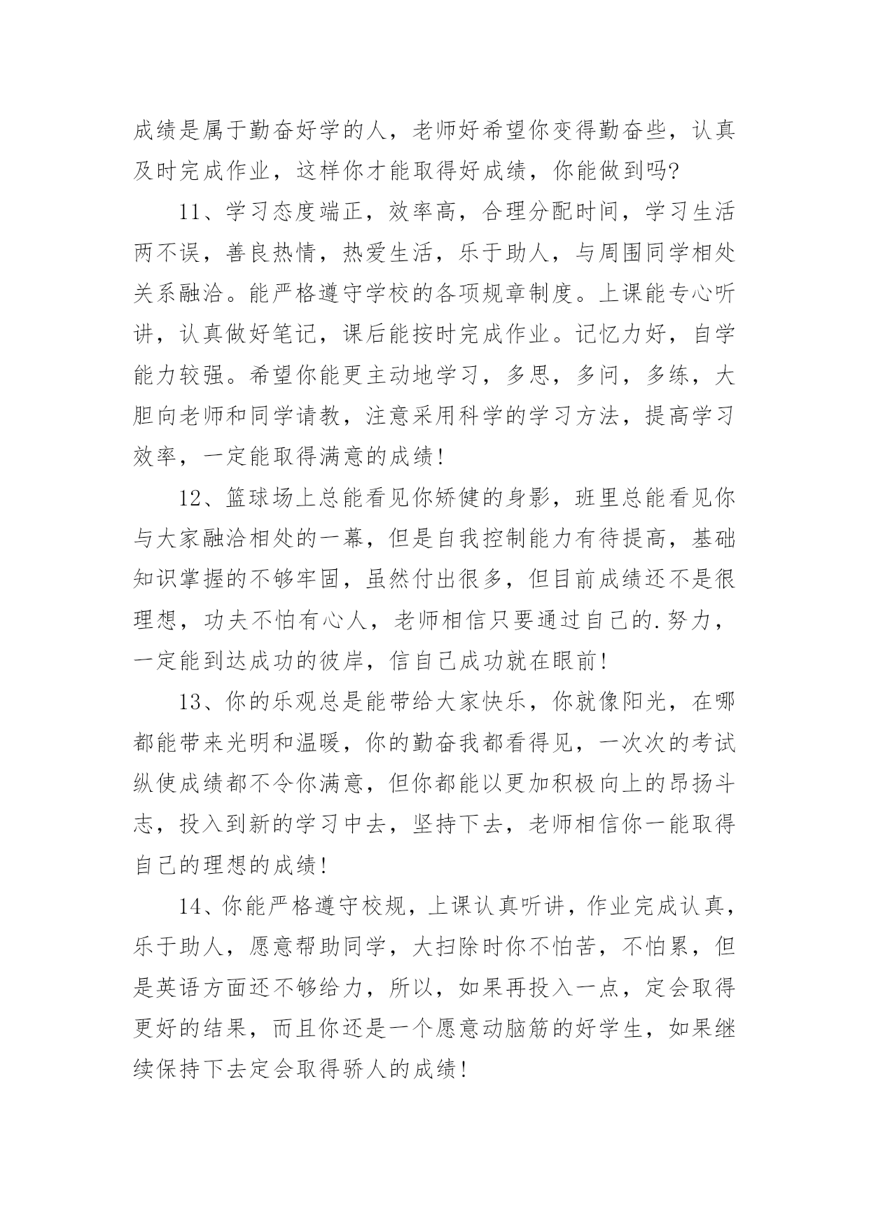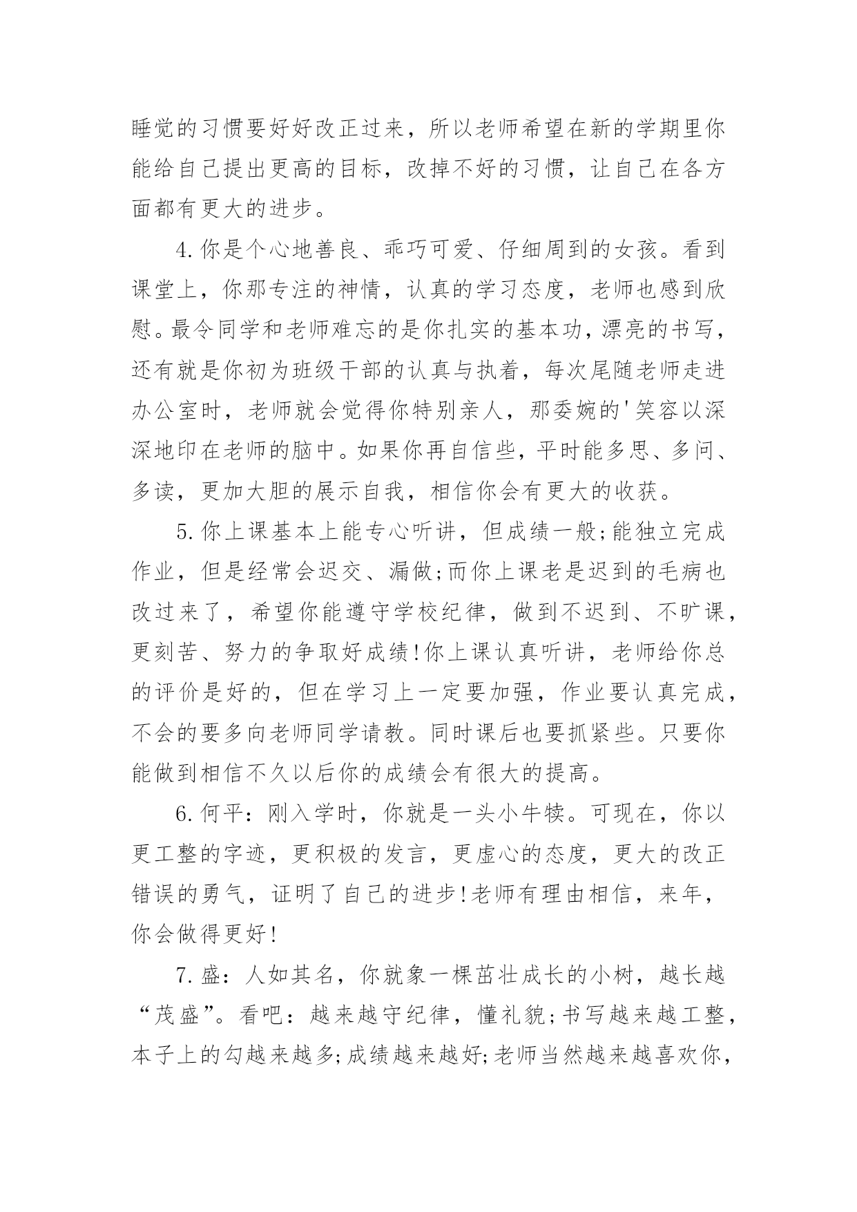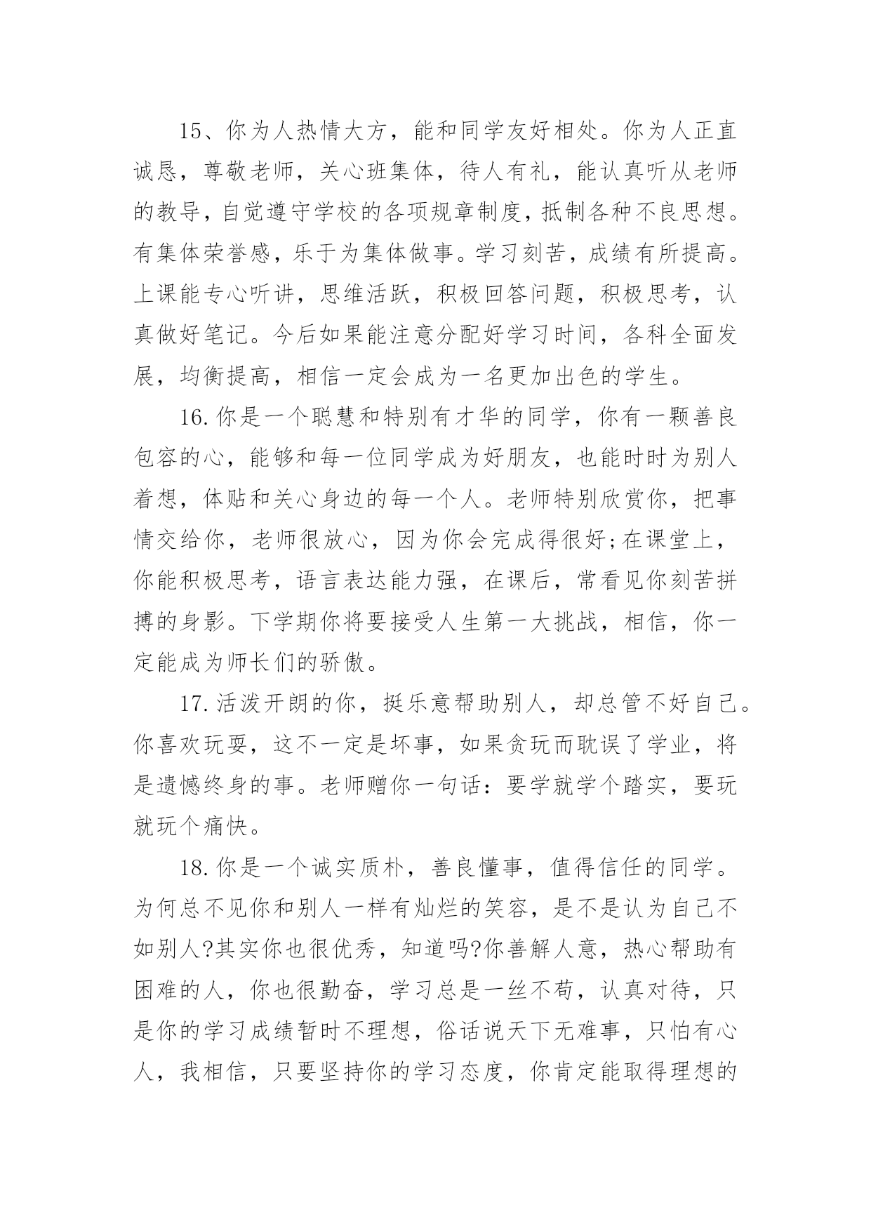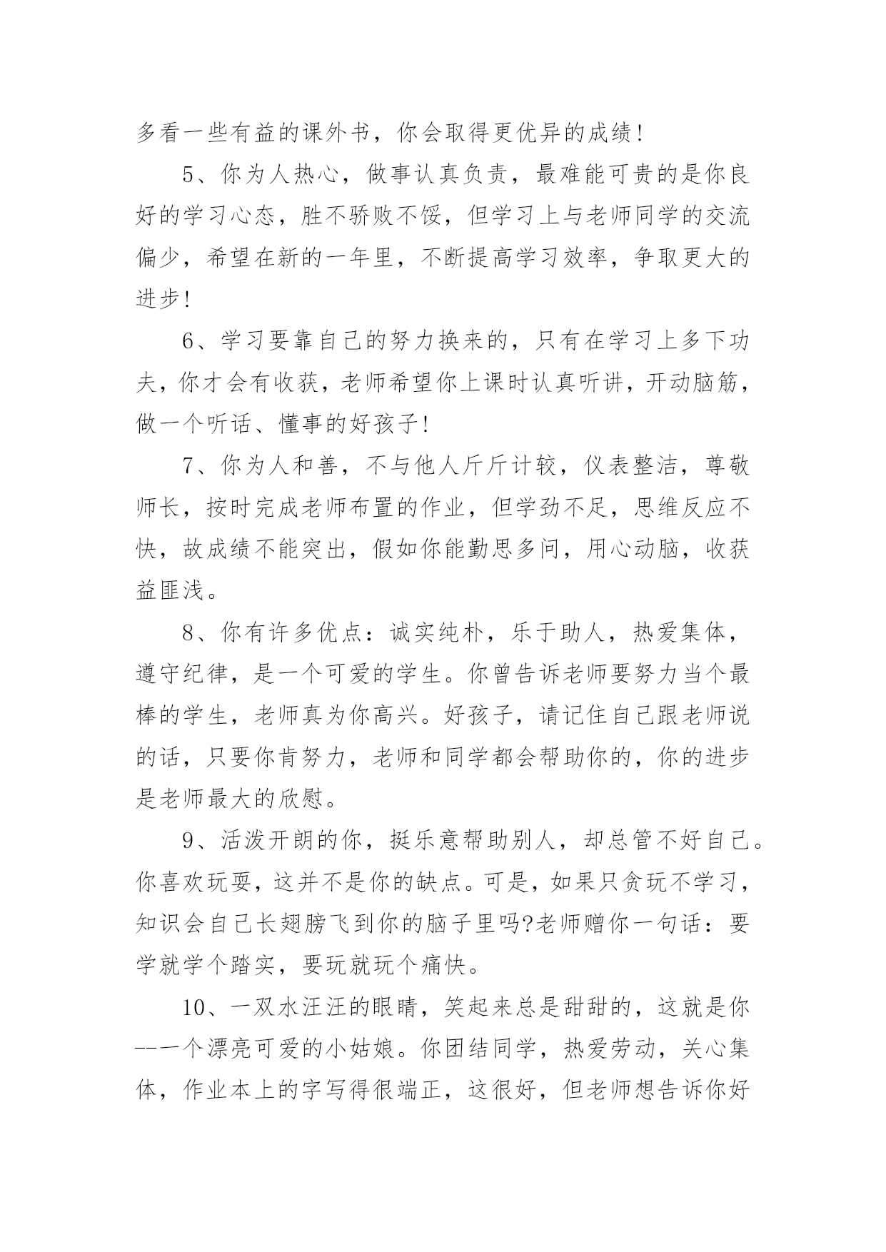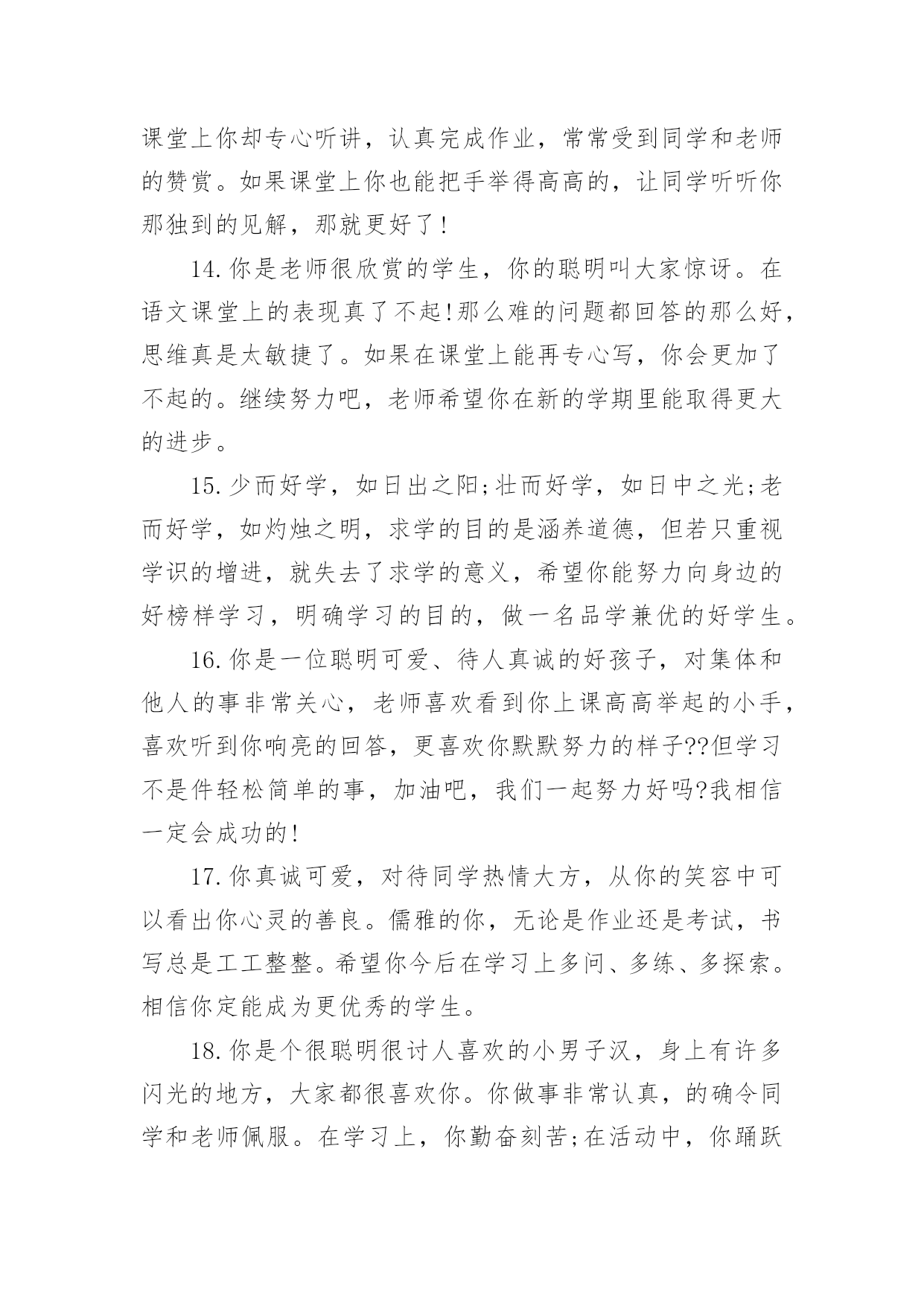 小学教师期末评语小学教师期末评语15篇在学习、工作乃至生活中,大家都不可避免地要接触到评语吧,评语的内容、格式、其实很多朋友都不太清楚什么样的评语才是好的评语,下面是小编精心整理的小学教师期末评语,希望对大家有所帮助。小学教师期末评语11.你是一个文静可爱而又多才多艺的女孩。你有着积极的学习态度,课上你能认真听讲,课下积极完成作业。而且你还特别爱帮助人,有着一颗宽容的心。特别是你漂亮的字迹,栩栩如生的绘画,也给大家留下了深刻的印象。希望下学期,你能在课堂上给自己更多的锻炼的机会,多积累点课外知识,上课要专心听讲,让自己成为一个更加优秀的学生,相信自己你会做得更好的。2.你在打乒乒时,总是那么的专注,那样的认真,高超的技艺使对方措手不及,深得老师的赞许,同学的喝彩,要是有一天,你在课堂上也像打乒乒球那样的专注、认真,那更会博得同学们的称颂,老师也会为见到一个崭新的你而倍感欣慰!3.你是个做事认真的孩子,每次都能认真地完成老师布置的各项任务,课堂上回答问题也比较积极,而且你的街舞和篮球技巧也得到了老师和同学们的欢呼。但是你上课喜欢睡觉的习惯要好好改正过来,所以老师希望在新的学期里你能给自己提出更高的目标,改掉不好的习惯,让自己在各方面都有更大的进步。4.你是个心地善良、乖巧可爱、仔细周到的女孩。看到课堂上,你那专注的神情,认真的学习态度,老师也感到欣慰。最令同学和老师难忘的是你扎实的基本功,漂亮的书写,还有就是你初为班级干部的认真与执着,每次尾随老师走进办公室时,老师就会觉得你特别亲人,那委婉的'笑容以深深地印在老师的脑中。如果你再自信些,平时能多思、多问、多读,更加大胆的展示自我,相信你会有更大的收获。5.你上课基本上能专心听讲,但成绩一般;能独立完成作业,但是经常会迟交、漏做;而你上课老是迟到的毛病也改过来了,希望你能遵守学校纪律,做到不迟到、不旷课,更刻苦、努力的争取好成绩!你上课认真听讲,老师给你总的评价是好的,但在学习上一定要加强,作业要认真完成,不会的要多向老师同学请教。同时课后也要抓紧些。只要你能做到相信不久以后你的成绩会有很大的提高。6.何平:刚入学时,你就是一头小牛犊。可现在,你以更工整的字迹,更积极的发言,更虚心的态度,更大的改正错误的勇气,证明了自己的进步!老师有理由相信,来年,你会做得更好!7.盛:人如其名,你就象一棵茁壮成长的小树,越长越“茂盛”。看吧:越来越守纪律,懂礼貌;书写越来越工整,本子上的勾越来越多;成绩越来越好;老师当然越来越喜欢你,对你越来越有信心!8.勇康:你以认真的学习态度,越写越好的作文,越写越秀气的字迹,期中评奖考试优秀奖学金,证明了自己的与众不同。老师期待着,课堂上,你的手能举得高高;生活中,你的笑容能时时绽放!9.踏实与诚实是你成绩突飞猛进的重要保证,你的学习品质和为人处世用不着怀疑,你善于利用时间,学习效率较高也得到了同学的肯定。最后再送你一句话:学无止境,半点的骄傲都会给你致命的一击!10.朗读课文时你稚嫩的童音、可爱的表情还有你大方的舞蹈表演给老师印象很深。你是个伶俐可爱、善动脑筋多才多艺的小女孩。为班级争得了不少荣誉,老师祝愿你在新的一学期中更上一层楼!11.姜文:这学期的你表现更出色了:上课专心听讲,踊跃发言;积极参加学校开展的各种活动,集体荣誉感强;能认真完成工作;作业整洁。热爱劳动。不过老师发现你写字姿势不端正,希望努力纠正,保护你那美丽的眼睛!12.你是一名聪明可爱而又勤奋好学的孩子。学习上能刻苦钻研,课堂上常能看到你高高举起的小手,听到你那响亮的读书声;你乐意当老师的小助手,做起值日生可负责了!平时你总是带着甜甜的笑容,与同学友爱相处。老师相信,你今后一定会更出色!13.在老师的眼里,你是一位很乖巧可爱的女孩,你的嗓音细嫩甜美,你的字迹端正漂亮。别看你平时不多言多语,课堂上你却专心听讲,认真完成作业,常常受到同学和老师的赞赏。如果课堂上你也能把手举得高高的,让同学听听你那独到的见解,那就更好了!14.你是老师很欣赏的学生,你的聪明叫大家惊讶。在语文课堂上的表现真了不起!那么难的问题都回答的那么好,思维真是太敏捷了。如果在课堂上能再专心写,你会更加了不起的。继续努力吧,老师希望你在新的学期里能取得更大的进步。15.少而好学,如日出之阳;壮而好学,如日中之光;老而好学,如灼烛之明,求学的目的是涵养道德,但若只重视学识的增进,就失去了求学的意义,希望你能努力向身边的好榜样学习,明确学习的目的,做一名品学兼优的好学生。16.你是一位聪明可爱、待人真诚的好孩子,对集体和他人的事非常关心,老师喜欢看到你上课高高举起的小手,喜欢听到你响亮的回答,更喜欢你默默努力的样子??但学习不是件轻松简单的事,加油吧,我们一起努力好吗?我相信一定会成功的!17.你真诚可爱,对待同学热情