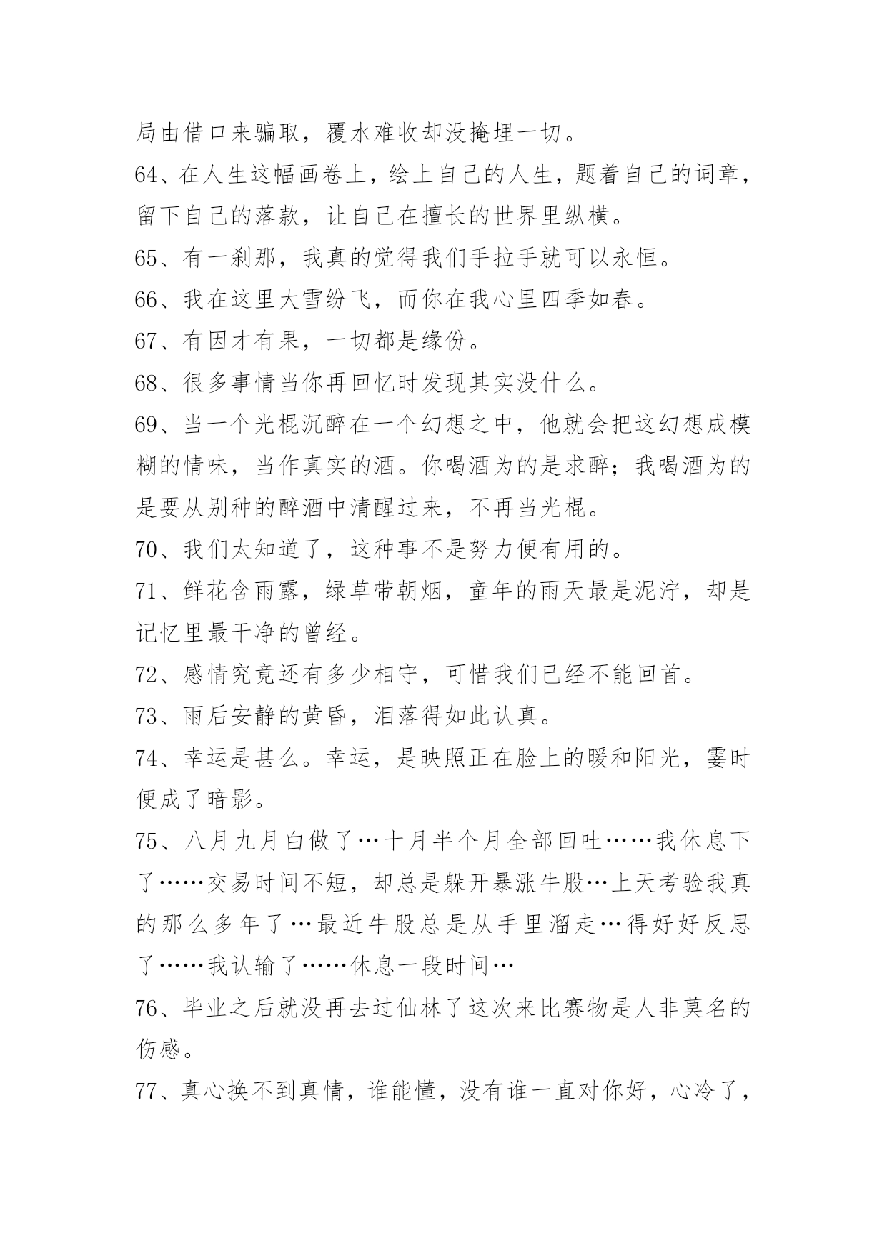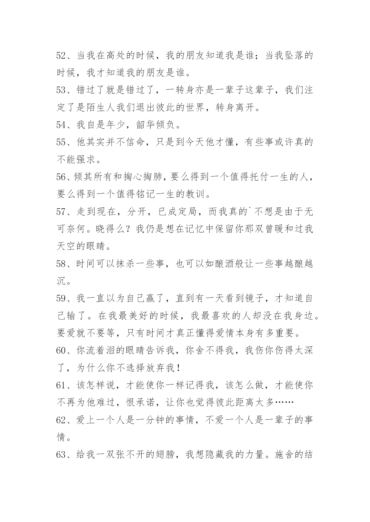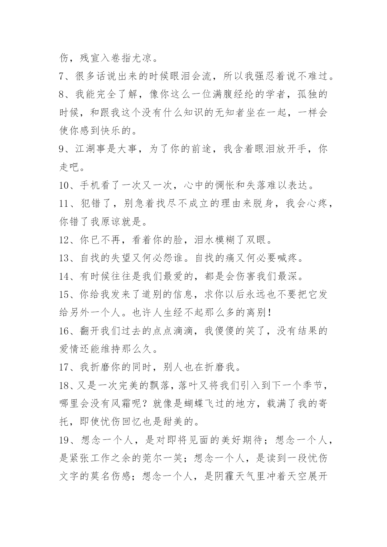 生活伤感句子2022年精选生活伤感句子集锦89句在你眼中,我只是个过客,而我却把真情投入,多少次椅们怅惘,换你一句再见,你说你浪够了,我带你回家。以下是小编搜索整理的生活伤感句子89句,供大家参考借鉴,希望可以帮助到有需要的朋友。1、泪流满面的文字里仍逃不过你清晰的容颜及思念。日日夜夜的期盼里依旧走不掉你真切的厚重与沉静。于是,我依然在感动里静静的倾听,依然在这个午后采一抹初秋的阳光,放在城外的小河旁,放在心城的笑容上,安守寂静的心房,安守岁月时光,日久醇香。2、流年,断章。指尖,断点。很想,为你写快乐,为你画素心,为你衣袂飘然,为你不染纤尘。而每每因你,快乐消失无影,生活只是无尽的沦陷。翩然的衣群牵起今世的沧桑,小心翼翼的行走终惹上迷蒙一片。3、花开,以花的姿态芬芳世界;花落,以花的从容写意人生。等待,总在禅意中慢慢修行。一方静室,一米阳光,让生命恬淡生香!4、我凉薄的记忆,被逆袭的时光裂出一条巨大的裂口。5、告诉自己必须从梦中醒来,心痛的感觉,针扎的感觉。破碎的梦,破碎的心。6、梦回长亭,一场空,佳人何处寻芳踪。九转回廊,多情伤,残宣入卷指尤凉。7、很多话说出来的时候眼泪会流,所以我强忍着说不难过。8、我能完全了解,像你这么一位满腹经纶的学者,孤独的时候,和跟我这个没有什么知识的无知者坐在一起,一样会使你感到快乐的。9、江湖事是大事,为了你的前途,我含着眼泪放开手,你走吧。10、手机看了一次又一次,心中的惆怅和失落难以表达。11、犯错了,别急着找尽不成立的理由来脱身,我会心疼,你错了我原谅就是。12、你已不再,看着你的脸,泪水模糊了双眼。13、自找的失望又何必怨谁。自找的痛又何必要喊疼。14、有时候往往是我们最爱的,都是会伤害我们最深。15、你给我发来了道别的信息,求你以后永远也不要把它发给另外一个人。也许人生经不起那么多的离别!16、翻开我们过去的点点滴滴,我傻傻的笑了,没有结果的爱情还能维持那么久。17、我折磨你的同时,别人也在折磨我。18、又是一次完美的飘落,落叶又将我们引入到下一个季节,哪里会没有风霜呢?就像是蝴蝶飞过的地方,载满了我的寄托,即使忧伤回忆也是甜美的。19、想念一个人,是对即将见面的美好期待;想念一个人,是紧张工作之余的莞尔一笑;想念一个人,是读到一段忧伤文字的莫名伤感;想念一个人,是阴霾天气里冲着天空展开的笑颜;想念一个人,是打开手机查看他相片的甜蜜心情;此刻,我正在想念你!20、我的世界不需要太多的人懂,让你懂了,那还得了!爱情字典里没有如果,是与否根本以太明显,只是泪太多,一切才会迷惘。21、你是我最重要的决定,用多少甜甜圈都不换。22、最暖心的QQ状态是"正在输入"23、你会找到一个比我好的人,但我再也不会对一个人这么好了。24、如果有一天,你发现你失去了所有,那么,请回头看看,我是不是还在你的身后。25、多少心牵的漫漫长夜,不知在那些漫漫长夜后的黎明醒来时会是怎样的落寞不堪,我常梦见重逢时刻,泪眼朦胧。26、从来都只有好聚哪有好散。最后喜欢变成了不甘,深爱变成心酸,思念变成了心烦。27、它归去。每当夜深人静时,我望向星空,总有一些锁碎的回忆,却为我寂寞的心灵带来无限的震憾。亦真亦幻皆是情,那既苦且甜的日子,如何能忘。每一份感情都很美,每一程相伴也都令人迷醉。是不能拥有的遗憾让我们更感眷恋。是夜半无眠的思念,让我们更觉得留恋。也许一点遗憾,一丝伤感,会让这份感情更久远。28、也许,我是一个与这个世界格格不入的人,我努力的追求那些完美,保持我的所谓忠诚,却还是在布满瑕疵的生活碰撞得伤痕累累。29、像是只没有了家的野鸽,不论往哪里飞,飞到多温暖的地方,都是受罪。30、日出生情,日落成伤,滚滚的光阴河停下东流的澎湃,我拥尽了千万繁华,却握不住你随风而去的身躯。31、别人回头是为了退步,他回头是为来句告白。32、难受的思念,不是对方不知道你的思念,而是他知道却无所谓。33、我爱的那位少年,你永远不会知道这段时间我怎么过来的。34、生活不易,容颜易老,让心保持鲜活,学无止境。35、所有人都觉得会过去的,只有我自己知道这个遗憾会伴随我着很长很长时间,有多长我也形容不出来。36、脾气泄露了修养,沉默说出了品味。37、我把心烧成火焰,让怕黑的你拥着温暖入眠,你却不领情。38、有的人把心都掏给你了,你却假装没看见,因为你不喜欢;有的人把你的心都掏了,你还假装不疼,因为你不爱。39、习惯了不能习惯的习惯,发现了自己在乎的不能在乎的人和事原来真的就没有这么在乎。40、光阴,单薄而寡言,该怎样的温柔言语,才能抚平那堆满褶皱的心事。我们都是如此念旧的女子,沧桑经年,依然怀揣着往事的暖与殇。回忆里有想念,有温馨,有泪光,更有一个一生私藏的人。41、黑暗中两眼无神夜里不再为我开盏灯。42、一个人孤独的表演,落幕的时候,