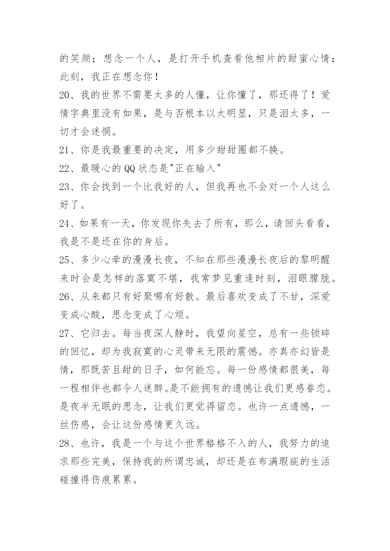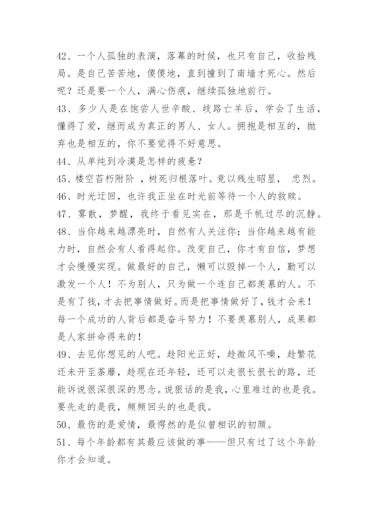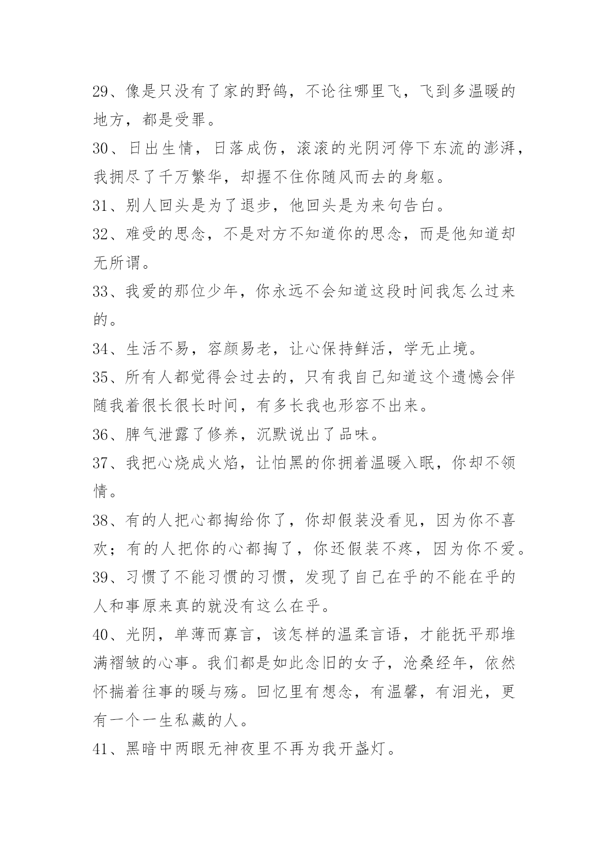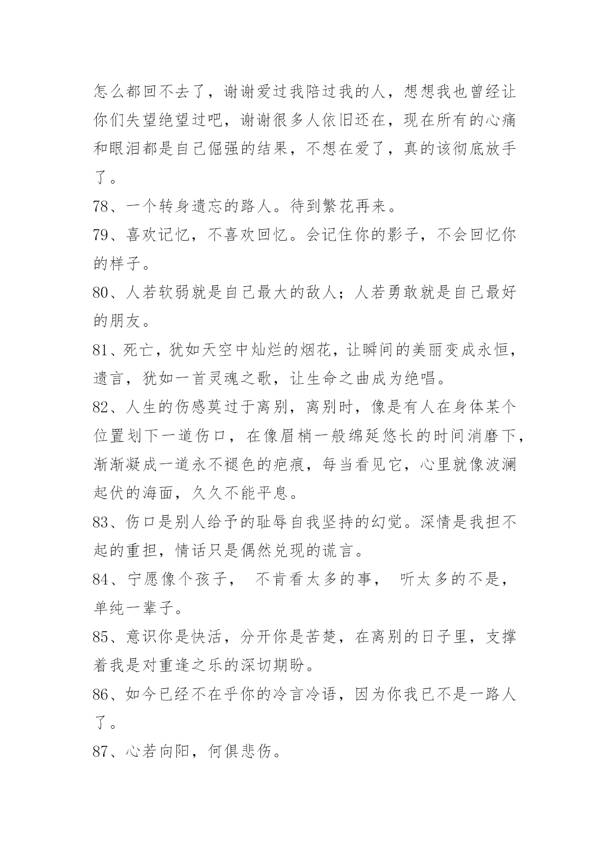 生活伤感句子2022年精选生活伤感句子集锦89句在你眼中,我只是个过客,而我却把真情投入,多少次椅们怅惘,换你一句再见,你说你浪够了,我带你回家。以下是小编搜索整理的生活伤感句子89句,供大家参考借鉴,希望可以帮助到有需要的朋友。1、泪流满面的文字里仍逃不过你清晰的容颜及思念。日日夜夜的期盼里依旧走不掉你真切的厚重与沉静。于是,我依然在感动里静静的倾听,依然在这个午后采一抹初秋的阳光,放在城外的小河旁,放在心城的笑容上,安守寂静的心房,安守岁月时光,日久醇香。2、流年,断章。指尖,断点。很想,为你写快乐,为你画素心,为你衣袂飘然,为你不染纤尘。而每每因你,快乐消失无影,生活只是无尽的沦陷。翩然的衣群牵起今世的沧桑,小心翼翼的行走终惹上迷蒙一片。3、花开,以花的姿态芬芳世界;花落,以花的从容写意人生。等待,总在禅意中慢慢修行。一方静室,一米阳光,让生命恬淡生香!4、我凉薄的记忆,被逆袭的时光裂出一条巨大的裂口。5、告诉自己必须从梦中醒来,心痛的感觉,针扎的感觉。破碎的梦,破碎的心。6、梦回长亭,一场空,佳人何处寻芳踪。九转回廊,多情伤,残宣入卷指尤凉。7、很多话说出来的时候眼泪会流,所以我强忍着说不难过。8、我能完全了解,像你这么一位满腹经纶的学者,孤独的时候,和跟我这个没有什么知识的无知者坐在一起,一样会使你感到快乐的。9、江湖事是大事,为了你的前途,我含着眼泪放开手,你走吧。10、手机看了一次又一次,心中的惆怅和失落难以表达。11、犯错了,别急着找尽不成立的理由来脱身,我会心疼,你错了我原谅就是。12、你已不再,看着你的脸,泪水模糊了双眼。13、自找的失望又何必怨谁。自找的痛又何必要喊疼。14、有时候往往是我们最爱的,都是会伤害我们最深。15、你给我发来了道别的信息,求你以后永远也不要把它发给另外一个人。也许人生经不起那么多的离别!16、翻开我们过去的点点滴滴,我傻傻的笑了,没有结果的爱情还能维持那么久。17、我折磨你的同时,别人也在折磨我。18、又是一次完美的飘落,落叶又将我们引入到下一个季节,哪里会没有风霜呢?就像是蝴蝶飞过的地方,载满了我的寄托,即使忧伤回忆也是甜美的。19、想念一个人,是对即将见面的美好期待;想念一个人,是紧张工作之余的莞尔一笑;想念一个人,是读到一段忧伤文字的莫名伤感;想念一个人,是阴霾天气里冲着天空展开的笑颜;想念一个人,是打开手机查看他相片的甜蜜心情;此刻,我正在想念你!20、我的世界不需要太多的人懂,让你懂了,那还得了!爱情字典里没有如果,是与否根本以太明显,只是泪太多,一切才会迷惘。21、你是我最重要的决定,用多少甜甜圈都不换。22、最暖心的QQ状态是"正在输入"23、你会找到一个比我好的人,但我再也不会对一个人这么好了。24、如果有一天,你发现你失去了所有,那么,请回头看看,我是不是还在你的身后。25、多少心牵的漫漫长夜,不知在那些漫漫长夜后的黎明醒来时会是怎样的落寞不堪,我常梦见重逢时刻,泪眼朦胧。26、从来都只有好聚哪有好散。最后喜欢变成了不甘,深爱变成心酸,思念变成了心烦。27、它归去。每当夜深人静时,我望向星空,总有一些锁碎的回忆,却为我寂寞的心灵带来无限的震憾。亦真亦幻皆是情,那既苦且甜的日子,如何能忘。每一份感情都很美,每一程相伴也都令人迷醉。是不能拥有的遗憾让我们更感眷恋。是夜半无眠的思念,让我们更觉得留恋。也许一点遗憾,一丝伤感,会让这份感情更久远。28、也许,我是一个与这个世界格格不入的人,我努力的追求那些完美,保持我的所谓忠诚,却还是在布满瑕疵的生活碰撞得伤痕累累。29、像是只没有了家的野鸽,不论往哪里飞,飞到多温暖的地方,都是受罪。30、日出生情,日落成伤,滚滚的光阴河停下东流的澎湃,我拥尽了千万繁华,却握不住你随风而去的身躯。31、别人回头是为了退步,他回头是为来句告白。32、难受的思念,不是对方不知道你的思念,而是他知道却无所谓。33、我爱的那位少年,你永远不会知道这段时间我怎么过来的。34、生活不易,容颜易老,让心保持鲜活,学无止境。35、所有人都觉得会过去的,只有我自己知道这个遗憾会伴随我着很长很长时间,有多长我也形容不出来。36、脾气泄露了修养,沉默说出了品味。37、我把心烧成火焰,让怕黑的你拥着温暖入眠,你却不领情。38、有的人把心都掏给你了,你却假装没看见,因为你不喜欢;有的人把你的心都掏了,你还假装不疼,因为你不爱。39、习惯了不能习惯的习惯,发现了自己在乎的不能在乎的人和事原来真的就没有这么在乎。40、光阴,单薄而寡言,该怎样的温柔言语,才能抚平那堆满褶皱的心事。我们都是如此念旧的女子,沧桑经年,依然怀揣着往事的暖与殇。回忆里有想念,有温馨,有泪光,更有一个一生私藏的人。41、黑暗中两眼无神夜里不再为我开盏灯。42、一个人孤独的表演,落幕的时候,