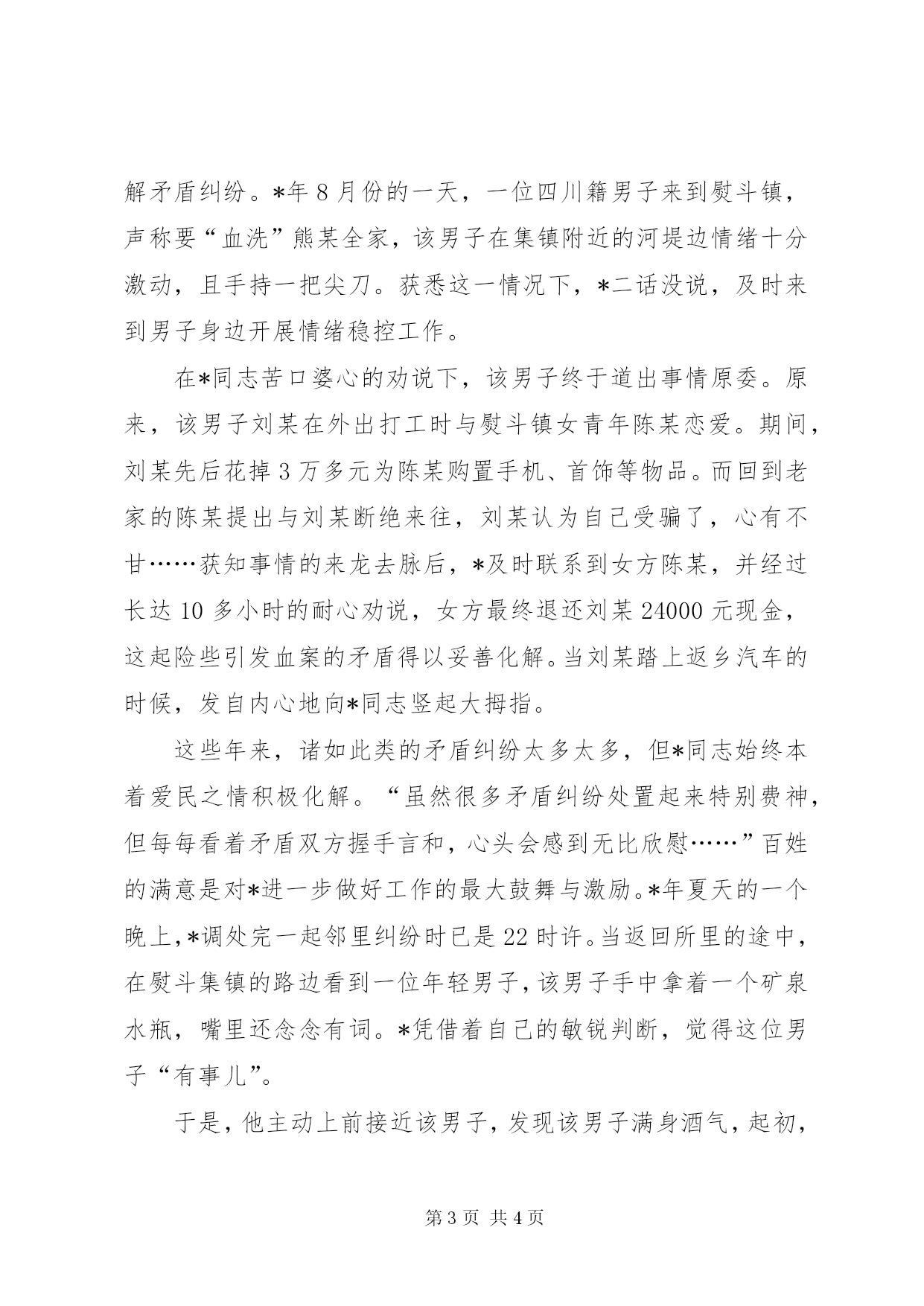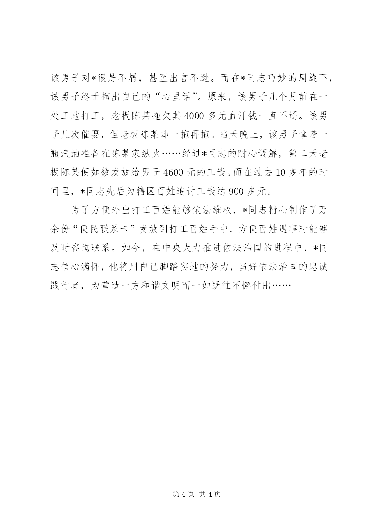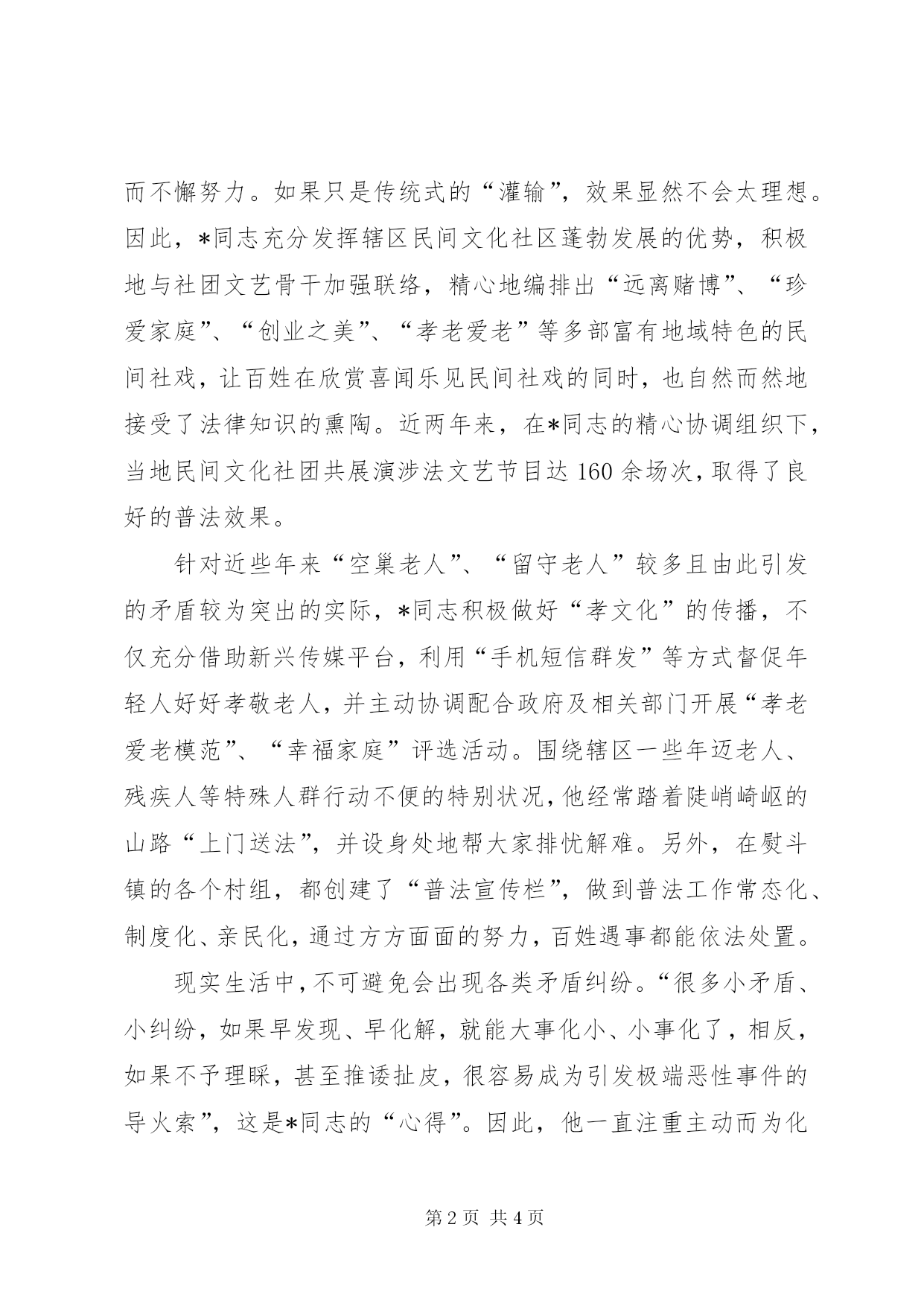 第PAGE\*Arabic\*MERGEFORMAT4页共NUMPAGES\*MERGEFORMAT4页司法所所长先进事迹材料司法所所长先进事迹材料20年扎根基层用忠诚诠释“司法为民”20多年如一日,扎根大山深处用心传播法律知识,潜移默化中引导群众养成尊重法律、崇尚法治的良好习惯;视百姓如亲人,设身处地帮百姓排忧解难,先后及时妥善化解各类矛盾纠纷1200余件,为营造和谐文明乡风夯实根基;主动帮扶贫困家庭谋求发展致富机会,先后助推30多户贫困家庭成为产业大户;依法捍卫群众权益,先后为外出打工百姓讨回工资900多万元;全力扶持“特殊人群”重归社会,引导他们痛改前非、重新做人……*县司法局熨斗司法所所长*,凭借着对司法工作的热情以及对群众的真切关爱,默默坚守基层司法战线20年,通过辛勤的付出与孜孜不倦的努力,诠释着“人民司法为人民”的光荣承诺,力促辖区社会氛围持续向好,百姓学法、懂法、守法、尊法的氛围渐趋浓厚。他凭借着主动而为的努力,赢得了辖区百姓的纷纷“点赞”。*同志通过多年实践经验,提炼出“爱心、耐心、诚心、热心、公心”的“五心”工作法,为全县司法干警更好地开展群众工作提供了“生动教材”。他曾获得“全国模范司法所长”的殊荣,并多次受到省、市、县的表彰。如何在辖区内营造人人学法、懂法、守法的良好氛围。切实引导百姓遇到困难麻烦时能够依法妥善维权,*同志一直在为此而不懈努力。如果只是传统式的“灌输”,效果显然不会太理想。因此,*同志充分发挥辖区民间文化社区蓬勃发展的优势,积极地与社团文艺骨干加强联络,精心地编排出“远离赌博”、“珍爱家庭”、“创业之美”、“孝老爱老”等多部富有地域特色的民间社戏,让百姓在欣赏喜闻乐见民间社戏的同时,也自然而然地接受了法律知识的熏陶。近两年来,在*同志的精心协调组织下,当地民间文化社团共展演涉法文艺节目达160余场次,取得了良好的普法效果。针对近些年来“空巢老人”、“留守老人”较多且由此引发的矛盾较为突出的实际,*同志积极做好“孝文化”的传播,不仅充分借助新兴传媒平台,利用“手机短信群发”等方式督促年轻人好好孝敬老人,并主动协调配合政府及相关部门开展“孝老爱老模范”、“幸福家庭”评选活动。围绕辖区一些年迈老人、残疾人等特殊人群行动不便的特别状况,他经常踏着陡峭崎岖的山路“上门送法”,并设身处地帮大家排忧解难。另外,在熨斗镇的各个村组,都创建了“普法宣传栏”,做到普法工作常态化、制度化、亲民化,通过方方面面的努力,百姓遇事都能依法处置。现实生活中,不可避免会出现各类矛盾纠纷。“很多小矛盾、小纠纷,如果早发现、早化解,就能大事化小、小事化了,相反,如果不予理睬,甚至推诿扯皮,很容易成为引发极端恶性事件的导火索”,这是*同志的“心得”。因此,他一直注重主动而为化解矛盾纠纷。*年8月份的一天,一位四川籍男子来到熨斗镇,声称要“血洗”熊某全家,该男子在集镇附近的河堤边情绪十分激动,且手持一把尖刀。获悉这一情况下,*二话没说,及时来到男子身边开展情绪稳控工作。在*同志苦口婆心的劝说下,该男子终于道出事情原委。原来,该男子刘某在外出打工时与熨斗镇女青年陈某恋爱。期间,刘某先后花掉3万多元为陈某购置手机、首饰等物品。而回到老家的陈某提出与刘某断绝来往,刘某认为自己受骗了,心有不甘……获知事情的来龙去脉后,*及时联系到女方陈某,并经过长达10多小时的耐心劝说,女方最终退还刘某24000元现金,这起险些引发血案的矛盾得以妥善化解。当刘某踏上返乡汽车的时候,发自内心地向*同志竖起大拇指。这些年来,诸如此类的矛盾纠纷太多太多,但*同志始终本着爱民之情积极化解。“虽然很多矛盾纠纷处置起来特别费神,但每每看着矛盾双方握手言和,心头会感到无比欣慰……”百姓的满意是对*进一步做好工作的最大鼓舞与激励。*年夏天的一个晚上,*调处完一起邻里纠纷时已是22时许。当返回所里的途中,在熨斗集镇的路边看到一位年轻男子,该男子手中拿着一个矿泉水瓶,嘴里还念念有词。*凭借着自己的敏锐判断,觉得这位男子“有事儿”。于是,他主动上前接近该男子,发现该男子满身酒气,起初,该男子对*很是不屑,甚至出言不逊。而在*同志巧妙的周旋下,该男子终于掏出自己的“心里话”。原来,该男子几个月前在一处工地打工,老板陈某拖欠其4000多元血汗钱一直不还。该男子几次催要,但老板陈某却一拖再拖。当天晚上,该男子拿着一瓶汽油准备在陈某家纵火……经过*同志的耐心调解,第二天老板陈某便如数发放给男子4600元的工钱。而在过去10多年的时间里,*同志先后为辖区百姓追讨工钱达900多元。为了方便外出打工百姓能够依法维权,*同志精心制作了万余份“便民联系卡”发放到打工百姓手中,方便百姓遇事时能够及时咨询联系。如今,在中央大力推进依法治国的进程中,*同志信心满怀,他将