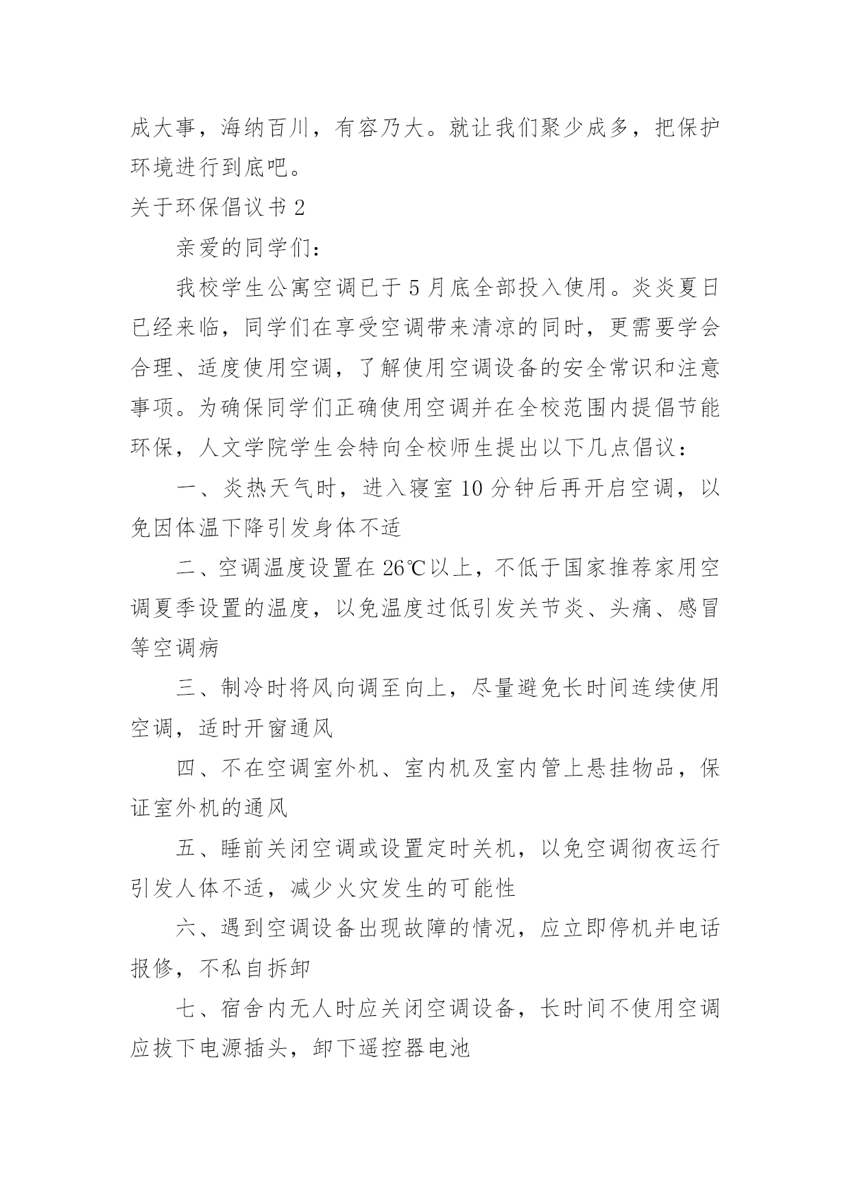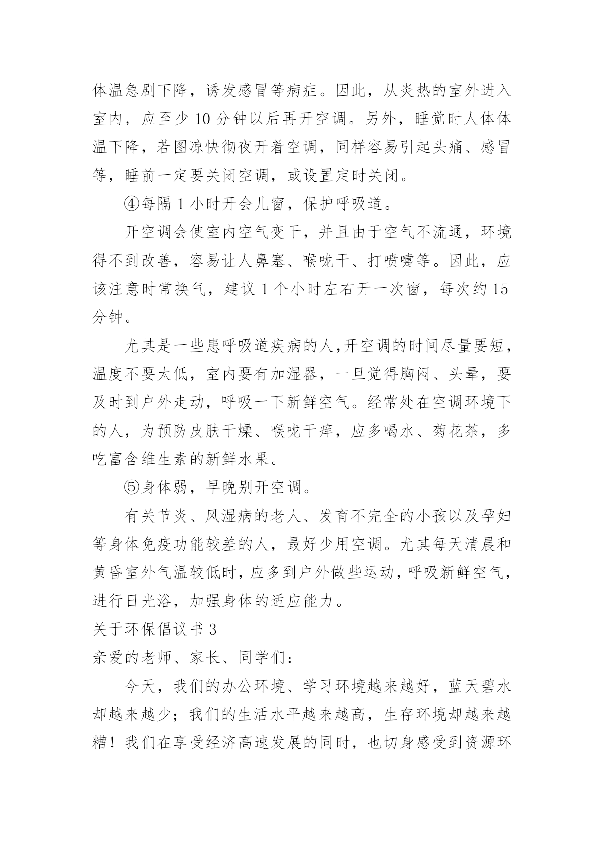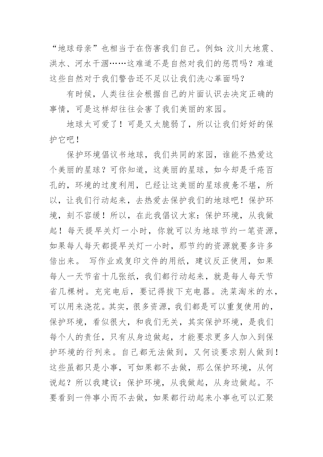 环保倡议书关于环保倡议书在现实社会中,我们可以使用倡议书的机会越来越多,倡议书是由某一组织或社团拟定、就某事向社会提出建议或提议社会成员共同去做某事的书面文章。但是你知道怎样才能写的好吗?下面是小编为大家收集的关于环保倡议书,欢迎阅读与收藏。关于环保倡议书1地球村的小公民们:我们赖以生存的地球只有一个,它多么需要我们的保护啊!但是,有些小公民非但不听,你们看,餐桌上被丢弃的食物,堆积如山的一次性筷子,哗哗流淌的自来水。这样的画面真是触目惊心。地球,这位人类的母亲,生命的摇篮。曾是那样美丽,那么壮观。但此刻,人类为了自己的利益,不惜乱采乱挖,随意排放污染物。于是,一座座挺拔的山变秃了,一条条清澈的河水变黑了。地球母亲正在痛苦的呻吟。如果地球被污染,我们的生命将会毁在自己手上。作为地球上的一员,我们有职责,有义务来保护地球。从小事做起,从身边做起。保护我们的家园,让我们的地球恢复原先的面貌。“地球母亲”不是万能的,它也有脆弱的时候。伤害了“地球母亲”也相当于在伤害我们自己。例如:汶川大地震、洪水、河水干涸……这难道不是自然对我们的惩罚吗?难道这些自然对于我们警告还不足以让我们洗心革面吗?有时候,人类往往会根据自己的片面认识去决定正确的事情,可是这样却往往会害了我们美丽的家园。地球太可爱了!可是又太脆弱了,所以让我们好好的保护它吧!保护环境倡议书地球,我们共同的家园,谁能不热爱这个美丽的星球?可你知道,这美丽的星球,如今却是千疮百孔的,环境的过度利用,已经让这美丽的星球疲惫不堪,所以,让我们行动起来,去热爱去保护我们的地球吧!保护环境,刻不容缓!所以,在此我倡议大家:保护环境,从我做起!每天提早关灯一小时,你就可以为地球节约一笔资源,如果每人每天都提早关灯一小时,那节约的资源就要多许多倍出来。写作业或复印文件的用纸,建议反正使用,如果每人一天节省十几张纸,我们都行动起来,就是每人每天节省几棵树。充完电后,要记得拔下充电器。洗菜淘米的水,可以用来浇花。其实,很多资源,我们都是可以重复使用的,保护环境,看似很大,和我们无关,其实保护环境,是我们每个人的责任,只有从身边做起,才能要求更多人加入到保护环境的行列来。自己都无法做到,又何谈要求别人做到!这些虽都只是小事,可如果都不去做,那么保护环境,从何说起?所以我建议:保护环境,从我做起,从身边做起。不要看到一件事小而不去做,如果都行动起来小事也可以汇聚成大事,海纳百川,有容乃大。就让我们聚少成多,把保护环境进行到底吧。关于环保倡议书2亲爱的同学们:我校学生公寓空调已于5月底全部投入使用。炎炎夏日已经来临,同学们在享受空调带来清凉的同时,更需要学会合理、适度使用空调,了解使用空调设备的安全常识和注意事项。为确保同学们正确使用空调并在全校范围内提倡节能环保,人文学院学生会特向全校师生提出以下几点倡议:一、炎热天气时,进入寝室10分钟后再开启空调,以免因体温下降引发身体不适二、空调温度设置在26℃以上,不低于国家推荐家用空调夏季设置的温度,以免温度过低引发关节炎、头痛、感冒等空调病三、制冷时将风向调至向上,尽量避免长时间连续使用空调,适时开窗通风四、不在空调室外机、室内机及室内管上悬挂物品,保证室外机的通风五、睡前关闭空调或设置定时关机,以免空调彻夜运行引发人体不适,减少火灾发生的可能性六、遇到空调设备出现故障的情况,应立即停机并电话报修,不私自拆卸七、宿舍内无人时应关闭空调设备,长时间不使用空调应拔下电源插头,卸下遥控器电池寝室安装空调有利于营造舒适的学习环境,考试周期间,希望同学们能合理利用空调,积极备考,人文学院学生会预祝全校同学在期末考试中取得优异的成绩!夏季使用空调须知:①夏季26℃最适宜。科学研究发现,夏秋两季人体感觉最舒适的气温为26℃左右,再低3℃—4℃左右,人体会觉得有些凉。另外,由于室内外环境不同,长期处于相对极端的温度下,身体调节能力失调,久而久之会导致免疫功能下降,出现各种不适症状,医学上称之为空调病。因此,建议一般情况下,最好将空调调到26℃左右,室内外温差不可超过7℃,否则会加重体温调节中枢负担。②空调风往上吹。开空调时,冷空气向下沉,因此风最好向上吹,避免冷风直吹身体。靠近空调的人,最好面对空调坐,因为冷风从后面吹着你的背部、腰部,比迎面风对人体造成的损害更大。坐办公室的朋友,如果座位挪不开,最好多预备一条小丝巾,围住颈部。要是长时间坐着办公,如打字、书写等,不妨备件穿脱方便的衣服,穿裙子时可用披肩护住腿部,特别是膝盖。寒从脚下生,应不时站起身活动活动,以增进末梢血液循环。③刚进屋,10分钟后再开空调。有些朋友出了一身汗,回到家马上打开空调猛吹,这样有害健康。因为此时毛孔完全打开,还来不及闭合,容易让体温急剧下降,诱发感冒等病症。因此,从炎热的室外进入室内,应至