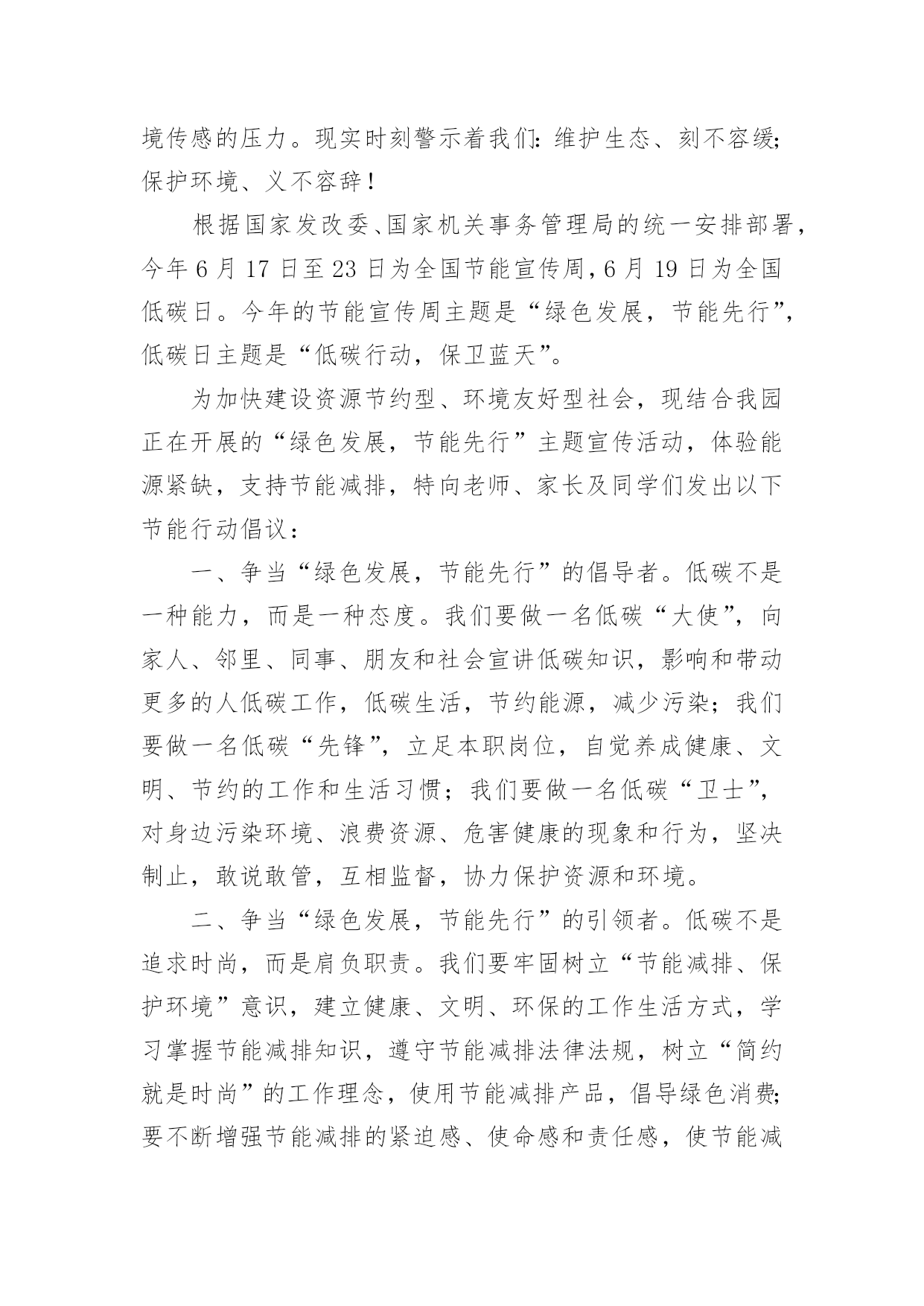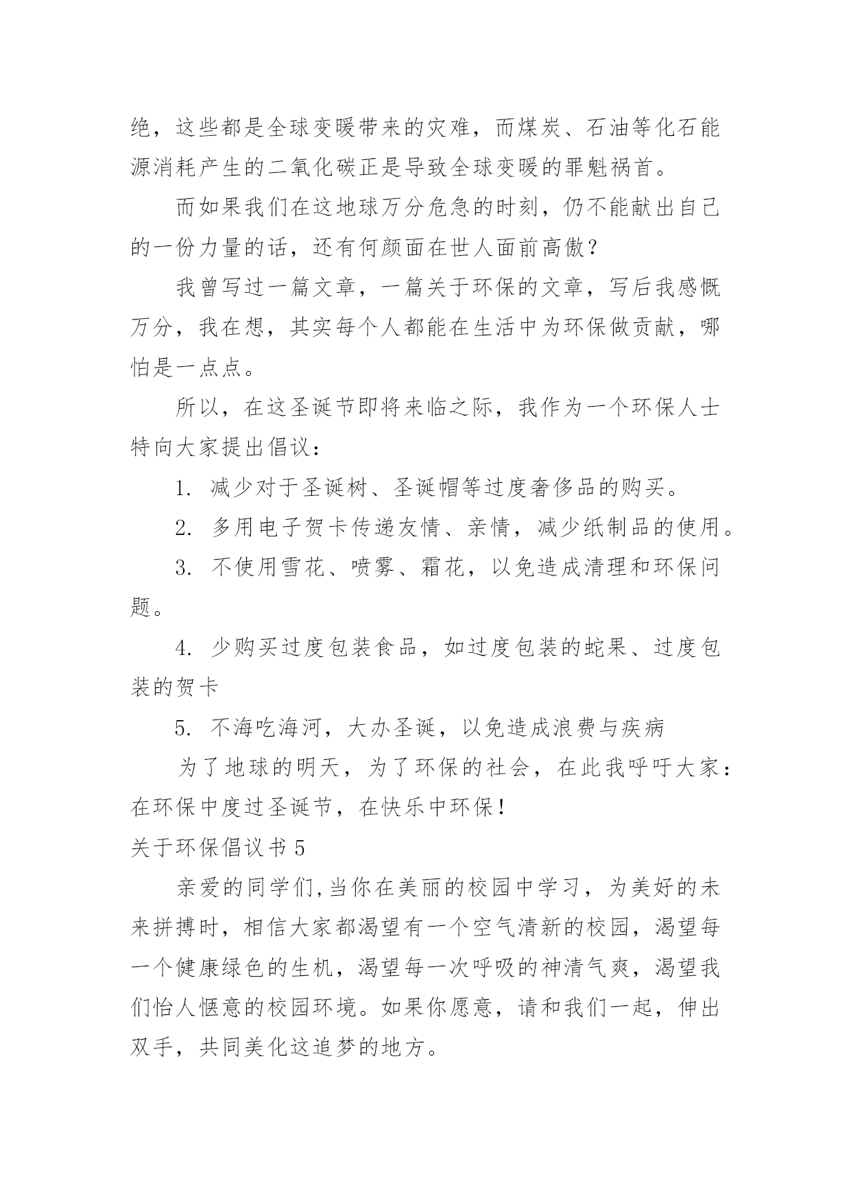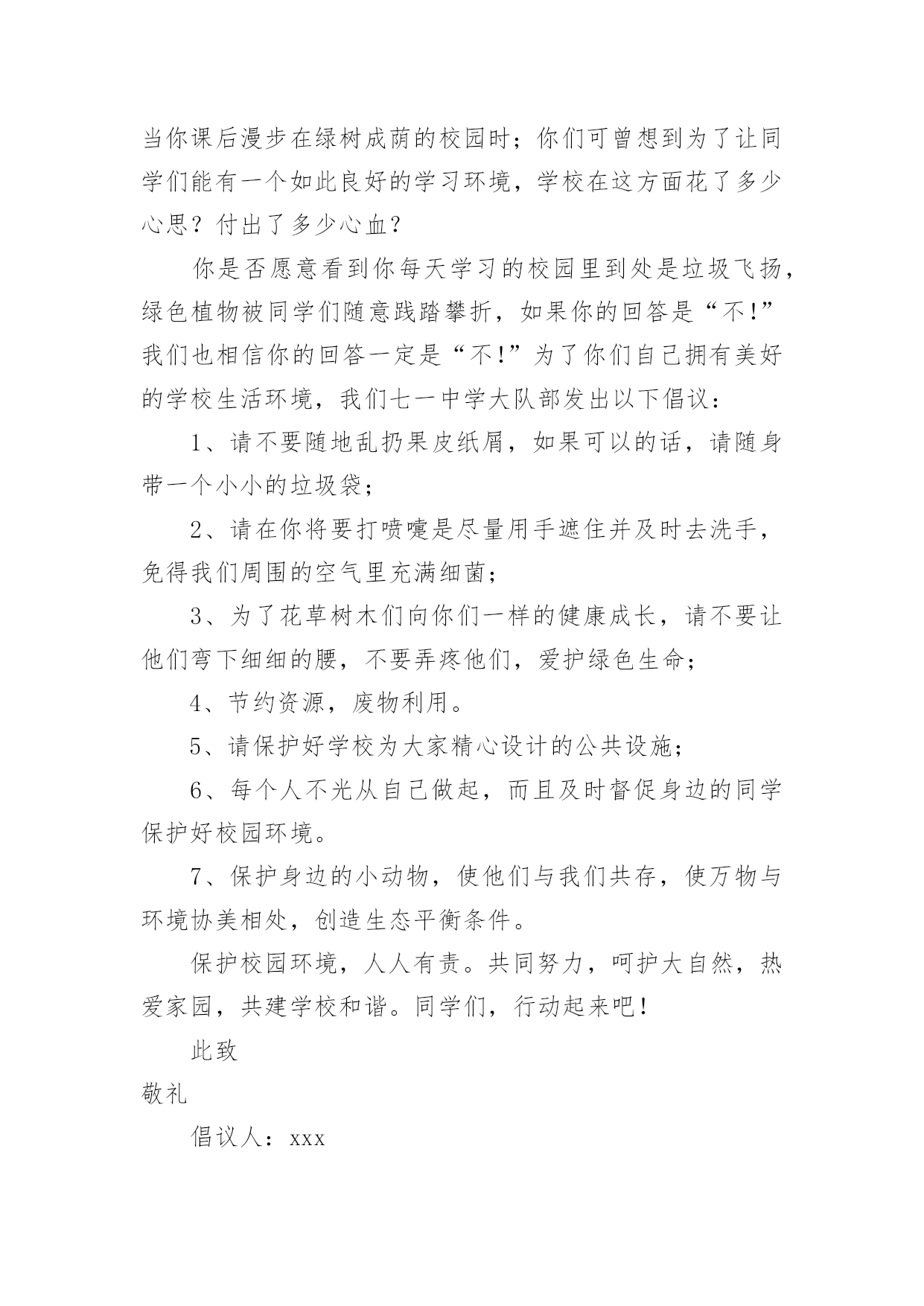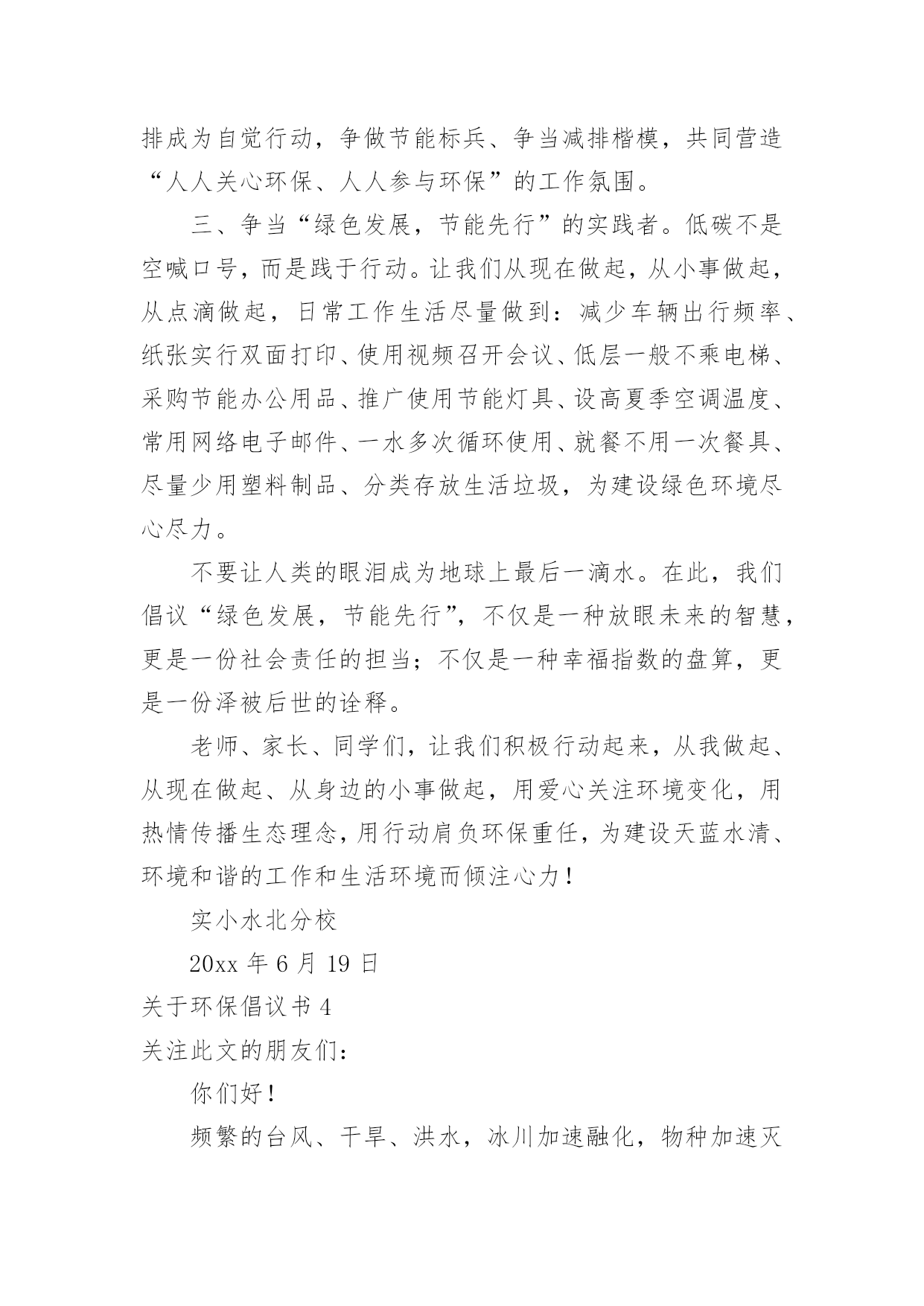 环保倡议书关于环保倡议书在现实社会中,我们可以使用倡议书的机会越来越多,倡议书是由某一组织或社团拟定、就某事向社会提出建议或提议社会成员共同去做某事的书面文章。但是你知道怎样才能写的好吗?下面是小编为大家收集的关于环保倡议书,欢迎阅读与收藏。关于环保倡议书1地球村的小公民们:我们赖以生存的地球只有一个,它多么需要我们的保护啊!但是,有些小公民非但不听,你们看,餐桌上被丢弃的食物,堆积如山的一次性筷子,哗哗流淌的自来水。这样的画面真是触目惊心。地球,这位人类的母亲,生命的摇篮。曾是那样美丽,那么壮观。但此刻,人类为了自己的利益,不惜乱采乱挖,随意排放污染物。于是,一座座挺拔的山变秃了,一条条清澈的河水变黑了。地球母亲正在痛苦的呻吟。如果地球被污染,我们的生命将会毁在自己手上。作为地球上的一员,我们有职责,有义务来保护地球。从小事做起,从身边做起。保护我们的家园,让我们的地球恢复原先的面貌。“地球母亲”不是万能的,它也有脆弱的时候。伤害了“地球母亲”也相当于在伤害我们自己。例如:汶川大地震、洪水、河水干涸……这难道不是自然对我们的惩罚吗?难道这些自然对于我们警告还不足以让我们洗心革面吗?有时候,人类往往会根据自己的片面认识去决定正确的事情,可是这样却往往会害了我们美丽的家园。地球太可爱了!可是又太脆弱了,所以让我们好好的保护它吧!保护环境倡议书地球,我们共同的家园,谁能不热爱这个美丽的星球?可你知道,这美丽的星球,如今却是千疮百孔的,环境的过度利用,已经让这美丽的星球疲惫不堪,所以,让我们行动起来,去热爱去保护我们的地球吧!保护环境,刻不容缓!所以,在此我倡议大家:保护环境,从我做起!每天提早关灯一小时,你就可以为地球节约一笔资源,如果每人每天都提早关灯一小时,那节约的资源就要多许多倍出来。写作业或复印文件的用纸,建议反正使用,如果每人一天节省十几张纸,我们都行动起来,就是每人每天节省几棵树。充完电后,要记得拔下充电器。洗菜淘米的水,可以用来浇花。其实,很多资源,我们都是可以重复使用的,保护环境,看似很大,和我们无关,其实保护环境,是我们每个人的责任,只有从身边做起,才能要求更多人加入到保护环境的行列来。自己都无法做到,又何谈要求别人做到!这些虽都只是小事,可如果都不去做,那么保护环境,从何说起?所以我建议:保护环境,从我做起,从身边做起。不要看到一件事小而不去做,如果都行动起来小事也可以汇聚成大事,海纳百川,有容乃大。就让我们聚少成多,把保护环境进行到底吧。关于环保倡议书2亲爱的同学们:我校学生公寓空调已于5月底全部投入使用。炎炎夏日已经来临,同学们在享受空调带来清凉的同时,更需要学会合理、适度使用空调,了解使用空调设备的安全常识和注意事项。为确保同学们正确使用空调并在全校范围内提倡节能环保,人文学院学生会特向全校师生提出以下几点倡议:一、炎热天气时,进入寝室10分钟后再开启空调,以免因体温下降引发身体不适二、空调温度设置在26℃以上,不低于国家推荐家用空调夏季设置的温度,以免温度过低引发关节炎、头痛、感冒等空调病三、制冷时将风向调至向上,尽量避免长时间连续使用空调,适时开窗通风四、不在空调室外机、室内机及室内管上悬挂物品,保证室外机的通风五、睡前关闭空调或设置定时关机,以免空调彻夜运行引发人体不适,减少火灾发生的可能性六、遇到空调设备出现故障的情况,应立即停机并电话报修,不私自拆卸七、宿舍内无人时应关闭空调设备,长时间不使用空调应拔下电源插头,卸下遥控器电池寝室安装空调有利于营造舒适的学习环境,考试周期间,希望同学们能合理利用空调,积极备考,人文学院学生会预祝全校同学在期末考试中取得优异的成绩!夏季使用空调须知:①夏季26℃最适宜。科学研究发现,夏秋两季人体感觉最舒适的气温为26℃左右,再低3℃—4℃左右,人体会觉得有些凉。另外,由于室内外环境不同,长期处于相对极端的温度下,身体调节能力失调,久而久之会导致免疫功能下降,出现各种不适症状,医学上称之为空调病。因此,建议一般情况下,最好将空调调到26℃左右,室内外温差不可超过7℃,否则会加重体温调节中枢负担。②空调风往上吹。开空调时,冷空气向下沉,因此风最好向上吹,避免冷风直吹身体。靠近空调的人,最好面对空调坐,因为冷风从后面吹着你的背部、腰部,比迎面风对人体造成的损害更大。坐办公室的朋友,如果座位挪不开,最好多预备一条小丝巾,围住颈部。要是长时间坐着办公,如打字、书写等,不妨备件穿脱方便的衣服,穿裙子时可用披肩护住腿部,特别是膝盖。寒从脚下生,应不时站起身活动活动,以增进末梢血液循环。③刚进屋,10分钟后再开空调。有些朋友出了一身汗,回到家马上打开空调猛吹,这样有害健康。因为此时毛孔完全打开,还来不及闭合,容易让体温急剧下降,诱发感冒等病症。因此,从炎热的室外进入室内,应至