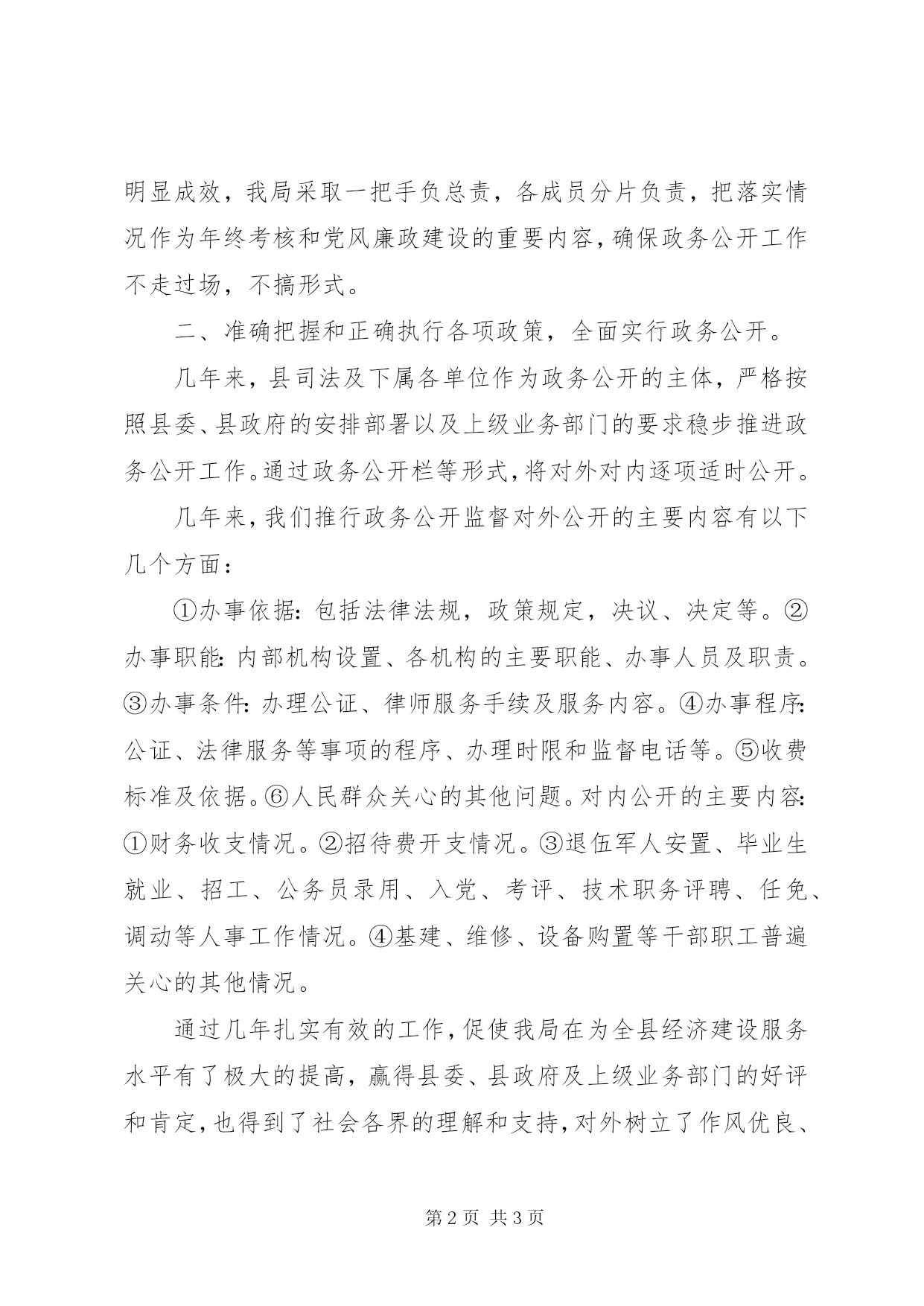 第PAGE\*Arabic\*MERGEFORMAT3页共NUMPAGES\*MERGEFORMAT3页司法局政务公开工作汇报县司法局政务公开工作汇报我局的政务公开工作在县委、县政府以及上级业务部门的正确领导下,坚持以“三个代表”重要思想为指导,坚持科学发展观,坚持以人为本,深入扎实开展司法行政政务公开工作,稳步发展,取得了明显成效。一、统一思想,提高认识,增强做好司法行政政务公开工作的责任感和使命感。近几年来,我局为贯彻落实国务院、省、市县关于推行政务公开的精神和要求,我局积极组织学习有关文件、政策。统一思想,提高认识,制订措施,强化责任,一是成立县司法局政务公开领导小组,根据实际情况及时调整和充实政务公开领导小组成员。每年初局政务公开领导小组都专门召开会议,研究部署本年度的政务公开工作。通过几年的工作,学习与实践,全局上下普遍认识到加强政务公开工作是我国实施依法治国方略的重要举措,是推进依法行政的重要手段,是全面提高依法行政水平的重要保障。二是突出重点,扎实工作,制订切实可行的措施切实提高办事效率,改进工作方法增强政务工作透明度,提高服务水平。我局按照民主、公正、公开的原则,制定本系统政务公开实施方案,明确政务公开监督的内容,步骤和措施。三是加强领导,强化责任,为把本系统政务公开工作各项措施落到实处,切实由到明显成效,我局采取一把手负总责,各成员分片负责,把落实情况作为年终考核和党风廉政建设的重要内容,确保政务公开工作不走过场,不搞形式。二、准确把握和正确执行各项政策,全面实行政务公开。几年来,县司法及下属各单位作为政务公开的主体,严格按照县委、县政府的安排部署以及上级业务部门的要求稳步推进政务公开工作。通过政务公开栏等形式,将对外对内逐项适时公开。几年来,我们推行政务公开监督对外公开的主要内容有以下几个方面:①办事依据:包括法律法规,政策规定,决议、决定等。②办事职能:内部机构设置、各机构的主要职能、办事人员及职责。③办事条件:办理公证、律师服务手续及服务内容。④办事程序:公证、法律服务等事项的程序、办理时限和监督电话等。⑤收费标准及依据。⑥人民群众关心的其他问题。对内公开的主要内容:①财务收支情况。②招待费开支情况。③退伍军人安置、毕业生就业、招工、公务员录用、入党、考评、技术职务评聘、任免、调动等人事工作情况。④基建、维修、设备购置等干部职工普遍关心的其他情况。通过几年扎实有效的工作,促使我局在为全县经济建设服务水平有了极大的提高,赢得县委、县政府及上级业务部门的好评和肯定,也得到了社会各界的理解和支持,对外树立了作风优良、办事高效、服务优质、勤政廉政的良好的部门形象。