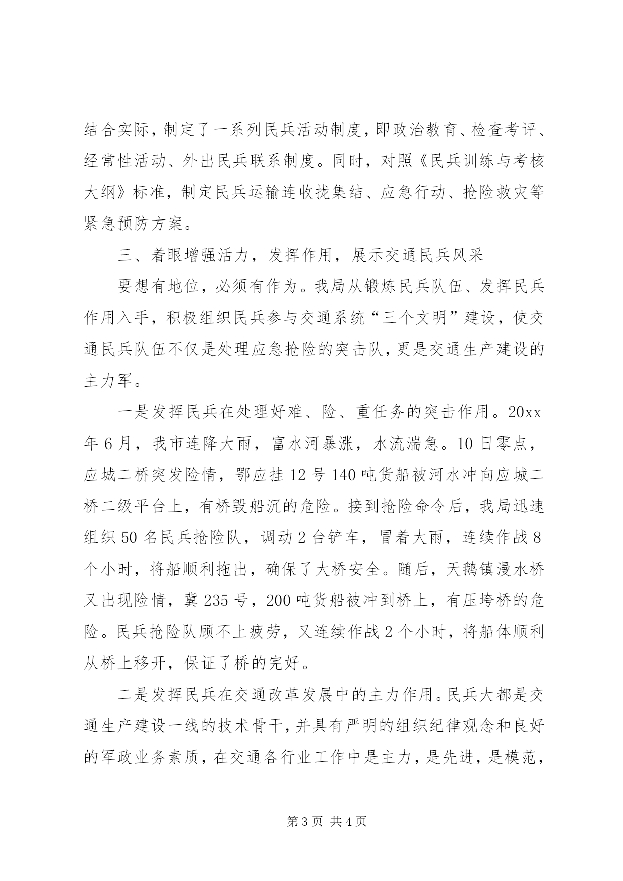 第PAGE\*Arabic\*MERGEFORMAT4页共NUMPAGES\*MERGEFORMAT4页交通局民兵工作经验交通局民兵工作总结近年来,在市委、市政府和市人武部的正确领导和指导下,我局坚持发扬党管武装优良传统,持之以恒重视、支持民兵建设,按照“组织落实、军事落实、政治落实”的要求,不断加强对民兵工作的组织领导,创新机制,狠抓建设,民兵工作呈现出机制灵活、形式多样、活动经常的良好局面。一、着眼认识提高,加强领导,健全民兵工作组织认识是行动的先导。近年来,我局在民兵工作中从抓思想认识入手,加强领导,深入宣传,使民兵工作意识不断增强,民兵工作组织不断健全。一是局总支高度重视,把民兵组织建设摆上重要位置。我局在市人武部门的指导下,依据政策法规,本着“编为用,建为战”的原则,组建了以副局长范志虹为连长、副局长丁焕生为指导员的对口民兵专业分队。该分队分三个排,共50人,主要承担着交通运输、汽车修理、反恐应急抢修路桥等职责。二是加强宣传引导。我局积极开展以民兵性质、任务和职能为主要内容的宣传教育,不断提高民兵的法制意识,切实增强了民兵的国防观念和依法参加民兵组织的自觉性,为组建民兵工作提供了思想保证。二、着眼人本理念,结合实际,狠抓民兵工作落实1、抓教育训练,提高民兵队伍素质。教育训练目的是提高民兵队伍的应变能力和想思素质,以便更好的执行各种急、难、险、重任务。近年来,我局主动与市人武部结成共建对子,不定期开展民兵理论学习、军事训练等活动。一是抓政治理论学习武装头脑。我局采取请市人武部教官和抗美援朝的老红军集中教与民兵各自分散学相结的合方式,加强了“三个代表”重要思想、党的十六大和国防军事理论学习。今年为庆祝我国第四个国防纪念日,我局积极组织民兵开展了“爱中华、奔小康、强国防”知识考试,从而激发他们的爱国之心、报国之情、强国之志。同时为丰富学习内容,我局还订阅了《中国民兵》杂志。二是抓军事训练增强实战经验。我局根据市人武部民兵军事训练方案,结合实际,制定了以车辆集结演练、车辆故障检测及抢修、路桥险段识别及抢修演练为主要内容的训练课程表,定期开展训练。在训练过程中严格要求,严格训练,确保训练任务完成。通过训练,切实提升了民兵综合能力,确保执行任务时能拉得出、靠得住、用得上、打得赢,有力地促进交通民兵战斗力的快速生成和提高。同时也锻炼了交通队伍的体能和意志,增强了纪律,转变了作风,加快了交通队伍向准军事化建设的步伐。2、抓制度建设,提升民兵建设质量。民兵组织建设上台阶,既需要具体的活动来体现,也需要有一套正规的、针对性和操作性都很强的制度来保证,推动我局民兵工作的可持续发展。我局根据《民兵工作条例》和《民兵组织整顿暂行规定》的有关规定,结合实际,制定了一系列民兵活动制度,即政治教育、检查考评、经常性活动、外出民兵联系制度。同时,对照《民兵训练与考核大纲》标准,制定民兵运输连收拢集结、应急行动、抢险救灾等紧急预防方案。三、着眼增强活力,发挥作用,展示交通民兵风采要想有地位,必须有作为。我局从锻炼民兵队伍、发挥民兵作用入手,积极组织民兵参与交通系统“三个文明”建设,使交通民兵队伍不仅是处理应急抢险的突击队,更是交通生产建设的主力军。一是发挥民兵在处理好难、险、重任务的突击作用。20xx年6月,我市连降大雨,富水河暴涨,水流湍急。10日零点,应城二桥突发险情,鄂应挂12号140吨货船被河水冲向应城二桥二级平台上,有桥毁船沉的危险。接到抢险命令后,我局迅速组织50名民兵抢险队,调动2台铲车,冒着大雨,连续作战8个小时,将船顺利拖出,确保了大桥安全。随后,天鹅镇漫水桥又出现险情,冀235号,200吨货船被冲到桥上,有压垮桥的危险。民兵抢险队顾不上疲劳,又连续作战2个小时,将船体顺利从桥上移开,保证了桥的完好。二是发挥民兵在交通改革发展中的主力作用。民兵大都是交通生产建设一线的技术骨干,并具有严明的组织纪律观念和良好的军政业务素质,在交通各行业工作中是主力,是先进,是模范,对促进交通事业的改革发展起着重要作用。目前,全市现有公路通达总里程1160公里,其中省道75.6公里,县道140公里,乡、村公路945公里。干线公路平均好路率达83;有桥梁80座2650.9延米;有五级航道27公里,码头2个,年吞吐量30万吨,拥有渡口39处,船舶114艘;有二级客运站1个,四级客运站4个,占地34000平方米,营运客车332辆,营运货车808辆。