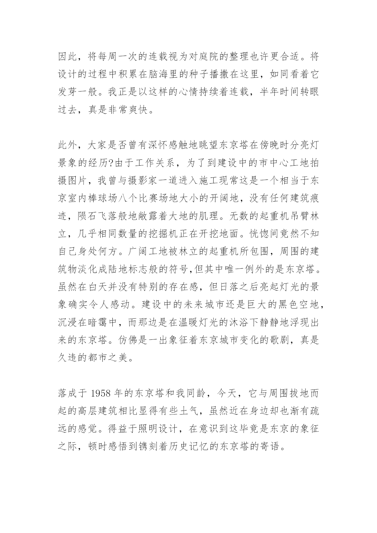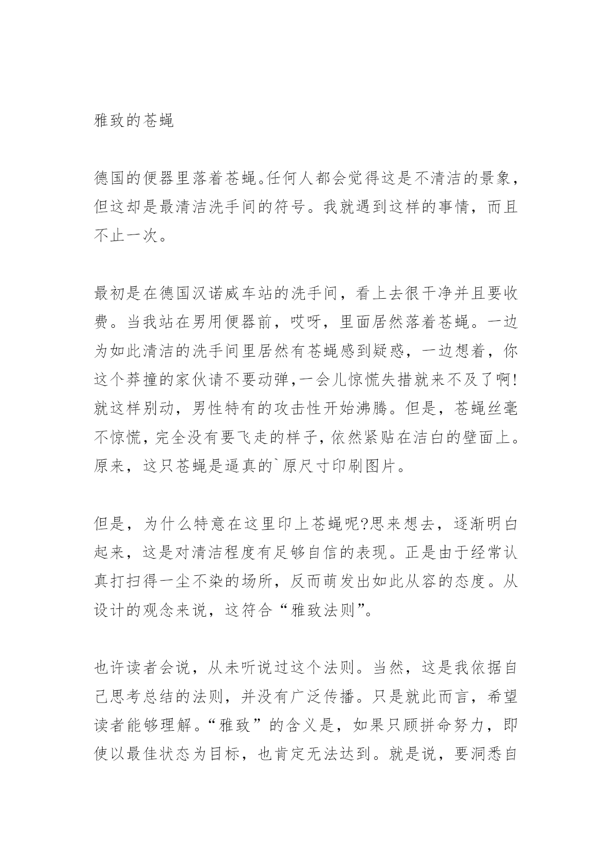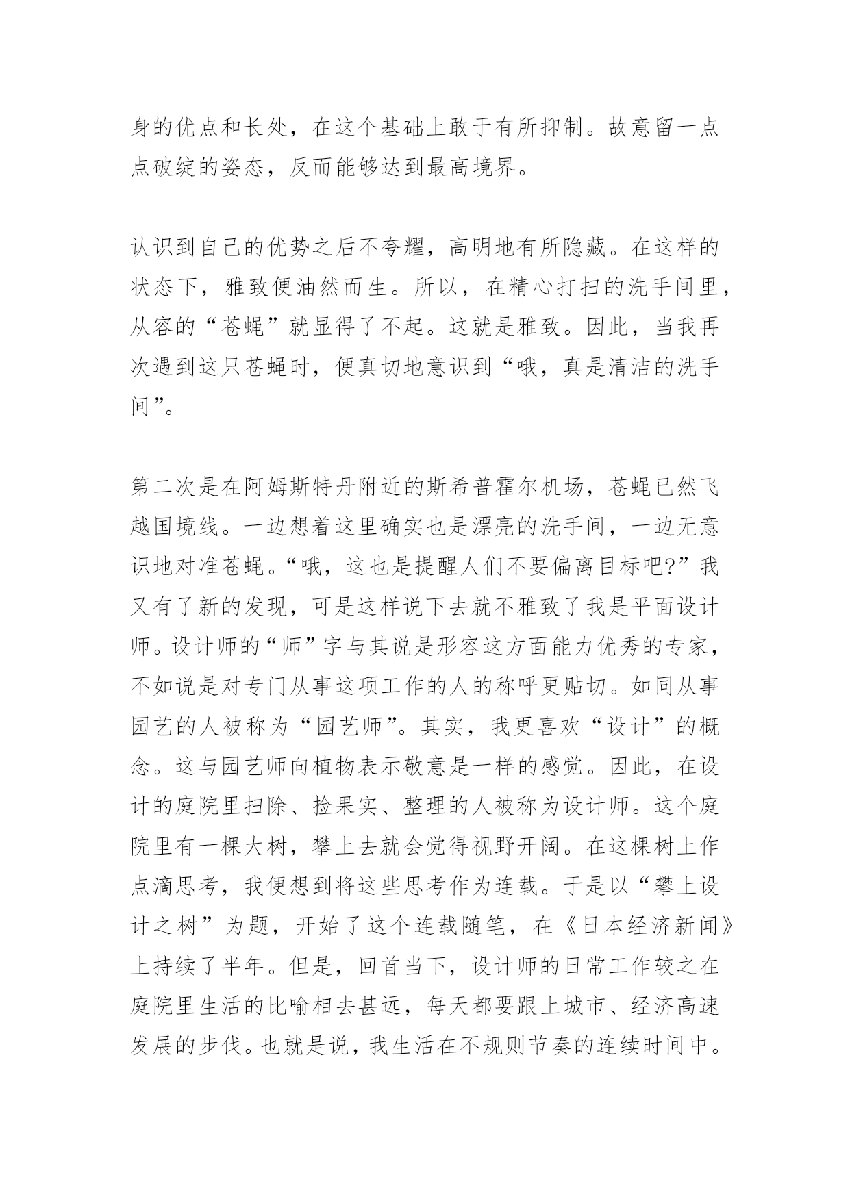 设计私语录设计私语录日本中生代国际级平面设计大师,日本设计中心的代表,武藏野美术大学教授,无印良品(MUJI)艺术总监。曾设计长野冬季奥运会开、闭幕式的节目纪念册和2005年爱知县万国博览会的文宣推广材料,一直致力于对设计本质的探寻。《设计私语录》是原研哉在大陆出版的第一本设计随笔集。让肚子穿上衣服我现在已是42岁的中年人,肚子有些突出,体形也和年轻人明显不同。当被人指出这点时,总是自我安慰道:“哦,这是设计图的规律埃漂亮的独角仙已经回不到幼虫时代了。”一半是玩笑一半是认真。在此,我对服装设计师们有一点希望:让肚子突出的中年人在游泳池里能有尽可能体现出好的体形的泳装、让身材消瘦的人有虽不符规范却是舒适的套装。请一定要在流行的前沿从事这些设计。即使普通地生活,到了一定年龄总会发胖,因为在人的身体里有这样的设计图。当然过于肥胖有危险,但肚子稍微有点突出对于成年人来说应该是正常的吧。“服装是人生的艺术”。屡屡从镜子里看着自己,深知人生的艺术不是一件简单的事情,同时,我也将这种说法如同抽到大吉的上上签之后静悄悄地放进钱包里那样,在心中珍藏着。穿上优秀设计师们倾尽智慧创造出来的服装之际,与此相对应的人也必须有匹配的尺度和光彩。本来,人总是或多或少地带着某种缺陷降生,自己一边认识这些缺陷,一边克服它,使自己逐渐完善起来。因此,以一定的标准整形或以健身运动改变体形等,都与服装的本质相去甚远。认真生活的结果,能够感受到不可改变的独自性的些微自信,这正是感受服装设计师奔放创造性的力量。总而言之,即使肚子有些突出,中年人也有穿着时尚服装的权利。但流行服装大多以年轻人的体形为标准,物理上不合适。因此在这里重复前述的愿望。尤其是冠以个人名字的服装品牌,当设计师本人健在之际,不要谋求再次返老还童般的设计。希望能自然地伴随设计师的一生。作为一位设计师,他的年轻性和过激性、成熟和老去,不正是最宝贵的设计资源吗?通过人的一生,我们希望与这些设计不断地对话。雅致的苍蝇德国的便器里落着苍蝇。任何人都会觉得这是不清洁的景象,但这却是最清洁洗手间的符号。我就遇到这样的事情,而且不止一次。最初是在德国汉诺威车站的洗手间,看上去很干净并且要收费。当我站在男用便器前,哎呀,里面居然落着苍蝇。一边为如此清洁的洗手间里居然有苍蝇感到疑惑,一边想着,你这个莽撞的家伙请不要动弹,一会儿惊慌失措就来不及了啊!就这样别动,男性特有的攻击性开始沸腾。但是,苍蝇丝毫不惊慌,完全没有要飞走的样子,依然紧贴在洁白的壁面上。原来,这只苍蝇是逼真的`原尺寸印刷图片。但是,为什么特意在这里印上苍蝇呢?思来想去,逐渐明白起来,这是对清洁程度有足够自信的表现。正是由于经常认真打扫得一尘不染的场所,反而萌发出如此从容的态度。从设计的观念来说,这符合“雅致法则”。也许读者会说,从未听说过这个法则。当然,这是我依据自己思考总结的法则,并没有广泛传播。只是就此而言,希望读者能够理解。“雅致”的含义是,如果只顾拼命努力,即使以最佳状态为目标,也肯定无法达到。就是说,要洞悉自身的优点和长处,在这个基础上敢于有所抑制。故意留一点点破绽的姿态,反而能够达到最高境界。认识到自己的优势之后不夸耀,高明地有所隐藏。在这样的状态下,雅致便油然而生。所以,在精心打扫的洗手间里,从容的“苍蝇”就显得了不起。这就是雅致。因此,当我再次遇到这只苍蝇时,便真切地意识到“哦,真是清洁的洗手间”。第二次是在阿姆斯特丹附近的斯希普霍尔机场,苍蝇已然飞越国境线。一边想着这里确实也是漂亮的洗手间,一边无意识地对准苍蝇。“哦,这也是提醒人们不要偏离目标吧?”我又有了新的发现,可是这样说下去就不雅致了我是平面设计师。设计师的“师”字与其说是形容这方面能力优秀的专家,不如说是对专门从事这项工作的人的称呼更贴切。如同从事园艺的人被称为“园艺师”。其实,我更喜欢“设计”的概念。这与园艺师向植物表示敬意是一样的感觉。因此,在设计的庭院里扫除、捡果实、整理的人被称为设计师。这个庭院里有一棵大树,攀上去就会觉得视野开阔。在这棵树上作点滴思考,我便想到将这些思考作为连载。于是以“攀上设计之树”为题,开始了这个连载随笔,在《日本经济新闻》上持续了半年。但是,回首当下,设计师的日常工作较之在庭院里生活的比喻相去甚远,每天都要跟上城市、经济高速发展的步伐。也就是说,我生活在不规则节奏的连续时间中。因此,将每周一次的连载视为对庭院的整理也许更合适。将设计的过程中积累在脑海里的种子播撒在这里,如同看着它发芽一般。我正是以这样的心情持续着连载,半年时间转眼过去,真是非常爽快。此外,大家是否曾有深怀感触地眺望东京塔在傍晚时分亮灯景象的经历?由于工作关系,为了到建设中的市中心工地拍摄图片,我曾与摄影家一道进入施工现常这是一个相当于东京室内棒球场八个比赛场地大小的开阔地,没有