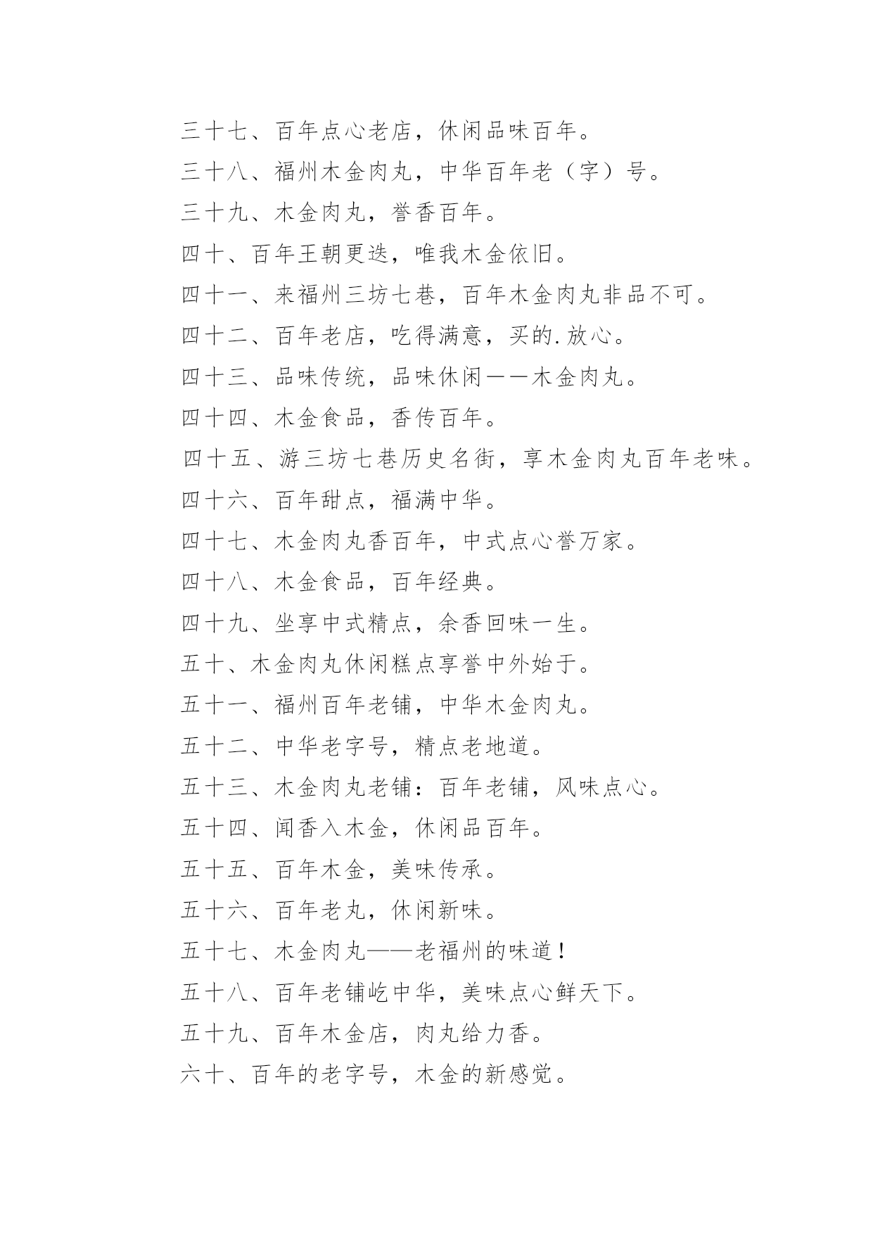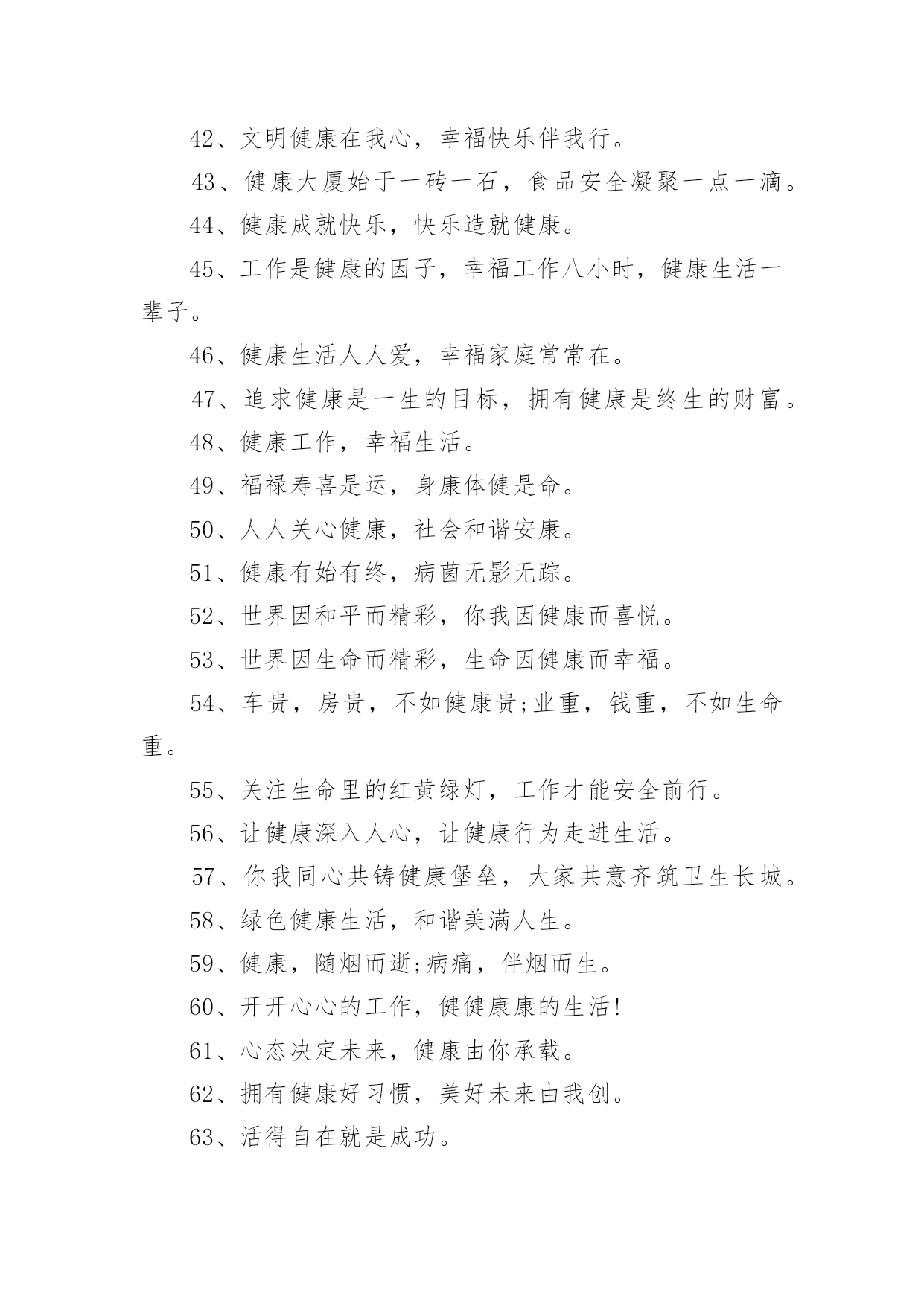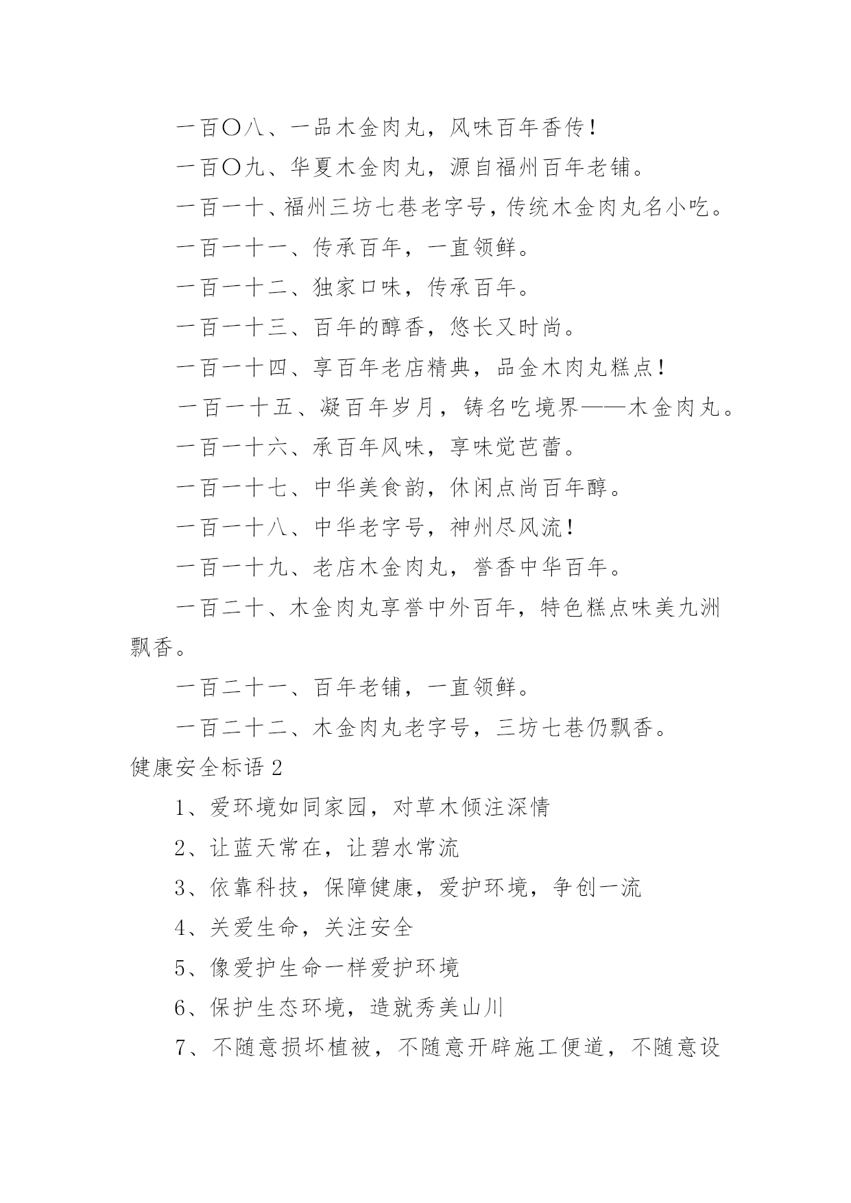 健康安全标语健康安全标语在学习、工作乃至生活中,大家都看到过标语吧,标语在一定程度上反映了社会经济制度的本质和社会的文明程度,它的意义十分重大。那些被广泛运用的标语都是什么样子的呢?以下是小编精心整理的健康安全标语,仅供参考,大家一起来看看吧。健康安全标语1一、百年中华名点,福州木金肉丸。二、老字号,新糕点——木金肉丸。三、百年岁月,休闲新味道;三坊七巷,美食新坐标。四、百年木金,丸美九州。五、木金百年沧桑,味道始终如一。六、木金肉丸,几代人心中的宝。七、百年品质,点心极品,源自福州三坊七巷。八、肉香食尚百年,丸美品味如一。九、跨过时代的肉丸——木金肉丸。十、润百年生活,享休闲点心。十一、木金铸就经典,肉香飘越百年。十二、心意百年,木金如一。十三、悠久传承,经典美味——木金肉丸。十四、木金肉丸字号远,百年老店在福州。十五、肉丸精品,福建木金;中式经典,传承百年。十六、精品生活,日月共鉴。十七、木金肉丸,我辈还要吃。十八、特色传承,中外难忘。十九、怀念三坊七巷,独思木金肉丸。二十、回香百年,面向胃来——福州木金肉丸。二十一、百年经典,木金肉丸。中式名点,味觉盛宴。二十二、木金肉丸休闲品,经典品质中国风。二十三、“丸”美享受,百年流传。二十四、百年木金肉丸,回味悠长久远二十五、恒久品质,木金肉丸。二十六、逛福州老铺,品中华肉丸。二十七、百年木金肉丸,一品中式糕点。二十八、百年木金,品味久远。二十九、百年木金招牌新,老字肉丸味道美。三十、小时候窝窝头的味道——福州木金肉丸店。三十一、口传中华,心甜百年。三十二、味之粹,香之醉,品之魅。三十三、中华老字号,香飘过百年。三十四、不食木金,宛若虚度——木金肉丸,每天选择。三十五、百年木金,丸美完比。三十六、百年老店名扬三坊七巷,风味传承香誉万户千家。三十七、百年点心老店,休闲品味百年。三十八、福州木金肉丸,中华百年老(字)号。三十九、木金肉丸,誉香百年。四十、百年王朝更迭,唯我木金依旧。四十一、来福州三坊七巷,百年木金肉丸非品不可。四十二、百年老店,吃得满意,买的.放心。四十三、品味传统,品味休闲――木金肉丸。四十四、木金食品,香传百年。四十五、游三坊七巷历史名街,享木金肉丸百年老味。四十六、百年甜点,福满中华。四十七、木金肉丸香百年,中式点心誉万家。四十八、木金食品,百年经典。四十九、坐享中式精点,余香回味一生。五十、木金肉丸休闲糕点享誉中外始于。五十一、福州百年老铺,中华木金肉丸。五十二、中华老字号,精点老地道。五十三、木金肉丸老铺:百年老铺,风味点心。五十四、闻香入木金,休闲品百年。五十五、百年木金,美味传承。五十六、百年老丸,休闲新味。五十七、木金肉丸——老福州的味道!五十八、百年老铺屹中华,美味点心鲜天下。五十九、百年木金店,肉丸给力香。六十、百年的老字号,木金的新感觉。六十一、香悦百年,一品丸美。六十二、百年后,爽口依然——木金肉丸,每天选择。六十三、中华老字号,百年齿留香。六十四、铁树开花木成金,榕荫不盖丸子馨。六十五、回味至今,百年木金。六十六、木金老字号,点心肉丸好。六十七、百年经典飘香,入味三坊七巷。六十八、百年老字号,“丸”美老情怀。六十九、一百年木金肉丸,滋味越老越醇香。七十、经典美味,木金荟萃。七十一、闲来吃点木金肉,丸中藏精味更诱。七十二、木金肉丸立百年,三坊七巷福无边。七十三、百年传承,食尚经典。七十四、百年肉丸居深巷,休闲点心味依然。七十五、百年浓情,共品休闲。七十六、木金肉丸,千锤百炼,休闲小吃。七十七、木金肉丸,共享百年美味生活。七十八、百年肉丸,木金精品。七十九、木金肉丸,此辈还要吃。八十、百年老字号,点心新食尚。八十一、百年老号,风味别致。八十二、木金肉丸,香誉百年。八十三、百年精品,休闲正点。八十四、周末去哪玩?只要有木金肉丸,爱去哪玩去哪玩。八十五、百年木金老店,美味食尚休闲。八十六、中华百年老铺,福州木金肉丸。八十七、百年传丞,永久的口味——木金肉丸。八十八、百年自然修炼,成就健康金丸。八十九、肉丸香福州,点心甜百年。九十、木金肉丸老铺,百年一品新尝。九十一、只只肉丸,口口真传。九十二、休闲正点,回味百年。九十三、福州百年老味,中式木金肉丸。九十四、木金是新店的好,肉丸是老味道香。九十五、百年老丸新休闲,三坊七巷人见人馋。九十六、经典美味,开心到胃。九十七、口味百年,依旧醇香——木金肉丸。九十八、百年木金,传承经典。国粹名点,味觉盛宴。九十九、木金肉丸,让百年老铺告诉天下。一百、品味百年老店,品味休闲精“点”。一百〇一、中式之选,百年木金。一百〇二、木金肉丸,中式点心的大哥。一百〇三、木金佳品,百年芳香。一百〇四、木金肉丸,休闲点心,源远流长。一百〇五、悠食经典,营养自然。一百〇六、木金做肉丸,百年在福州。一百〇七、百年祖传点心秘方,密制现