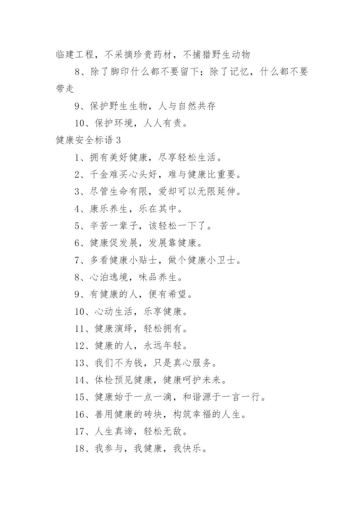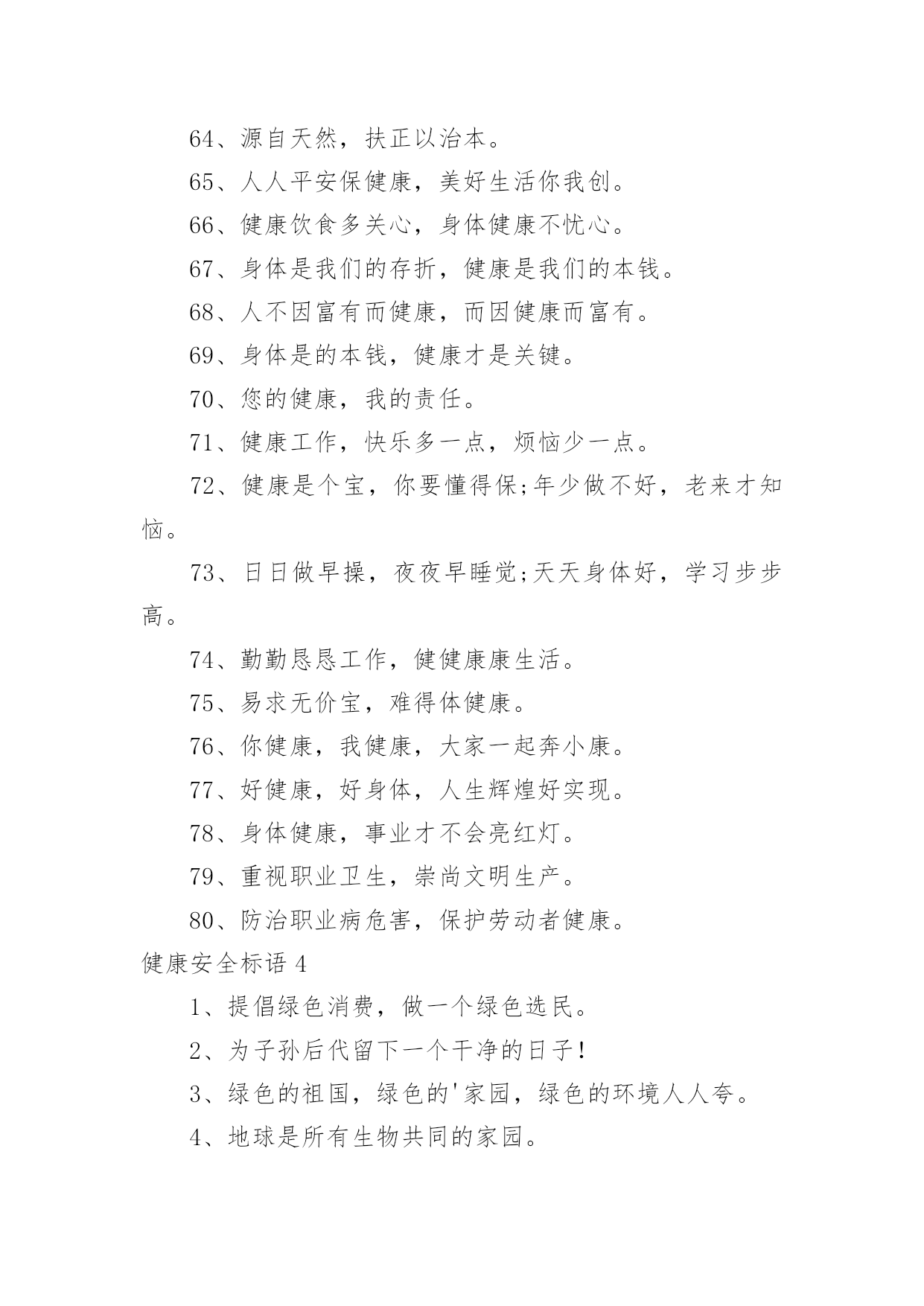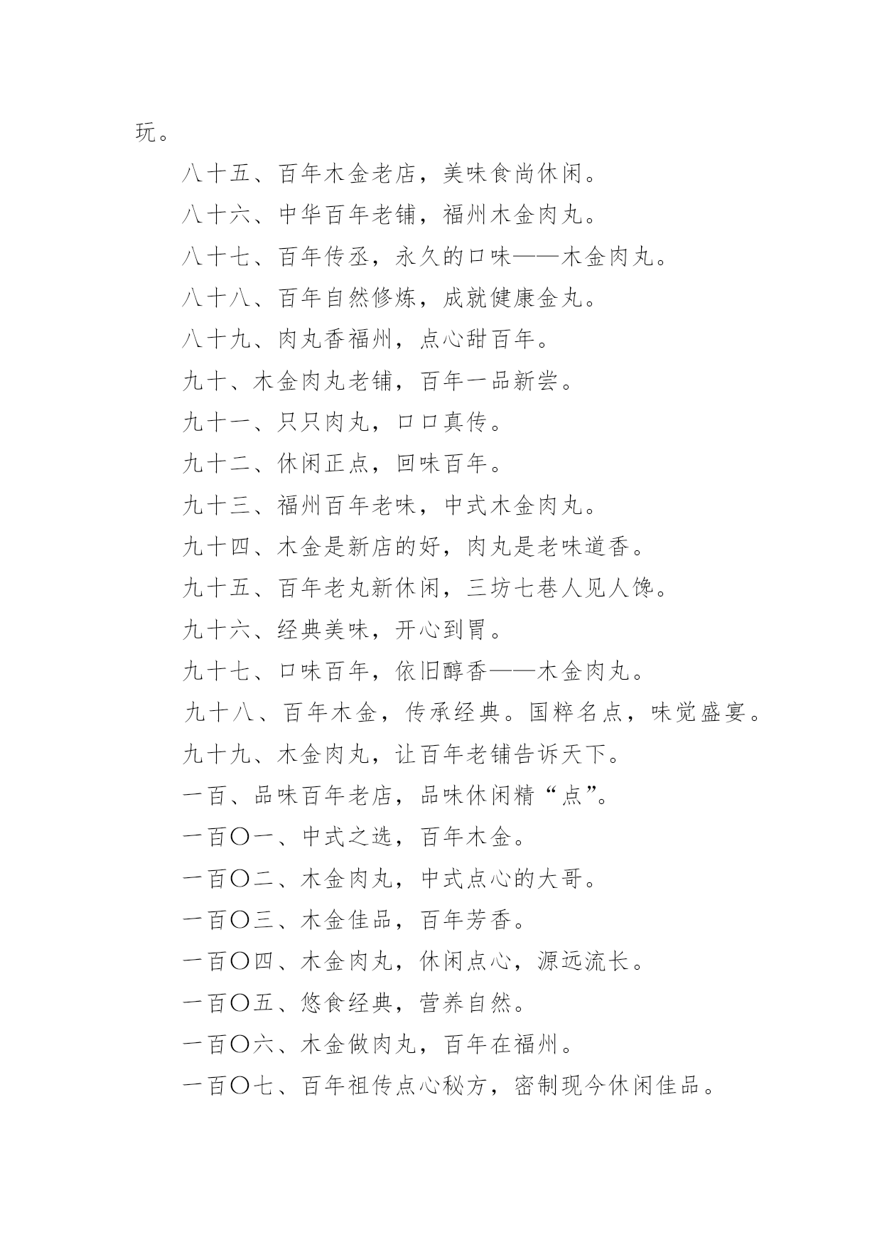 健康安全标语健康安全标语在学习、工作乃至生活中,大家都看到过标语吧,标语在一定程度上反映了社会经济制度的本质和社会的文明程度,它的意义十分重大。那些被广泛运用的标语都是什么样子的呢?以下是小编精心整理的健康安全标语,仅供参考,大家一起来看看吧。健康安全标语1一、百年中华名点,福州木金肉丸。二、老字号,新糕点——木金肉丸。三、百年岁月,休闲新味道;三坊七巷,美食新坐标。四、百年木金,丸美九州。五、木金百年沧桑,味道始终如一。六、木金肉丸,几代人心中的宝。七、百年品质,点心极品,源自福州三坊七巷。八、肉香食尚百年,丸美品味如一。九、跨过时代的肉丸——木金肉丸。十、润百年生活,享休闲点心。十一、木金铸就经典,肉香飘越百年。十二、心意百年,木金如一。十三、悠久传承,经典美味——木金肉丸。十四、木金肉丸字号远,百年老店在福州。十五、肉丸精品,福建木金;中式经典,传承百年。十六、精品生活,日月共鉴。十七、木金肉丸,我辈还要吃。十八、特色传承,中外难忘。十九、怀念三坊七巷,独思木金肉丸。二十、回香百年,面向胃来——福州木金肉丸。二十一、百年经典,木金肉丸。中式名点,味觉盛宴。二十二、木金肉丸休闲品,经典品质中国风。二十三、“丸”美享受,百年流传。二十四、百年木金肉丸,回味悠长久远二十五、恒久品质,木金肉丸。二十六、逛福州老铺,品中华肉丸。二十七、百年木金肉丸,一品中式糕点。二十八、百年木金,品味久远。二十九、百年木金招牌新,老字肉丸味道美。三十、小时候窝窝头的味道——福州木金肉丸店。三十一、口传中华,心甜百年。三十二、味之粹,香之醉,品之魅。三十三、中华老字号,香飘过百年。三十四、不食木金,宛若虚度——木金肉丸,每天选择。三十五、百年木金,丸美完比。三十六、百年老店名扬三坊七巷,风味传承香誉万户千家。三十七、百年点心老店,休闲品味百年。三十八、福州木金肉丸,中华百年老(字)号。三十九、木金肉丸,誉香百年。四十、百年王朝更迭,唯我木金依旧。四十一、来福州三坊七巷,百年木金肉丸非品不可。四十二、百年老店,吃得满意,买的.放心。四十三、品味传统,品味休闲――木金肉丸。四十四、木金食品,香传百年。四十五、游三坊七巷历史名街,享木金肉丸百年老味。四十六、百年甜点,福满中华。四十七、木金肉丸香百年,中式点心誉万家。四十八、木金食品,百年经典。四十九、坐享中式精点,余香回味一生。五十、木金肉丸休闲糕点享誉中外始于。五十一、福州百年老铺,中华木金肉丸。五十二、中华老字号,精点老地道。五十三、木金肉丸老铺:百年老铺,风味点心。五十四、闻香入木金,休闲品百年。五十五、百年木金,美味传承。五十六、百年老丸,休闲新味。五十七、木金肉丸——老福州的味道!五十八、百年老铺屹中华,美味点心鲜天下。五十九、百年木金店,肉丸给力香。六十、百年的老字号,木金的新感觉。六十一、香悦百年,一品丸美。六十二、百年后,爽口依然——木金肉丸,每天选择。六十三、中华老字号,百年齿留香。六十四、铁树开花木成金,榕荫不盖丸子馨。六十五、回味至今,百年木金。六十六、木金老字号,点心肉丸好。六十七、百年经典飘香,入味三坊七巷。六十八、百年老字号,“丸”美老情怀。六十九、一百年木金肉丸,滋味越老越醇香。七十、经典美味,木金荟萃。七十一、闲来吃点木金肉,丸中藏精味更诱。七十二、木金肉丸立百年,三坊七巷福无边。七十三、百年传承,食尚经典。七十四、百年肉丸居深巷,休闲点心味依然。七十五、百年浓情,共品休闲。七十六、木金肉丸,千锤百炼,休闲小吃。七十七、木金肉丸,共享百年美味生活。七十八、百年肉丸,木金精品。七十九、木金肉丸,此辈还要吃。八十、百年老字号,点心新食尚。八十一、百年老号,风味别致。八十二、木金肉丸,香誉百年。八十三、百年精品,休闲正点。八十四、周末去哪玩?只要有木金肉丸,爱去哪玩去哪玩。八十五、百年木金老店,美味食尚休闲。八十六、中华百年老铺,福州木金肉丸。八十七、百年传丞,永久的口味——木金肉丸。八十八、百年自然修炼,成就健康金丸。八十九、肉丸香福州,点心甜百年。九十、木金肉丸老铺,百年一品新尝。九十一、只只肉丸,口口真传。九十二、休闲正点,回味百年。九十三、福州百年老味,中式木金肉丸。九十四、木金是新店的好,肉丸是老味道香。九十五、百年老丸新休闲,三坊七巷人见人馋。九十六、经典美味,开心到胃。九十七、口味百年,依旧醇香——木金肉丸。九十八、百年木金,传承经典。国粹名点,味觉盛宴。九十九、木金肉丸,让百年老铺告诉天下。一百、品味百年老店,品味休闲精“点”。一百〇一、中式之选,百年木金。一百〇二、木金肉丸,中式点心的大哥。一百〇三、木金佳品,百年芳香。一百〇四、木金肉丸,休闲点心,源远流长。一百〇五、悠食经典,营养自然。一百〇六、木金做肉丸,百年在福州。一百〇七、百年祖传点心秘方,密制现