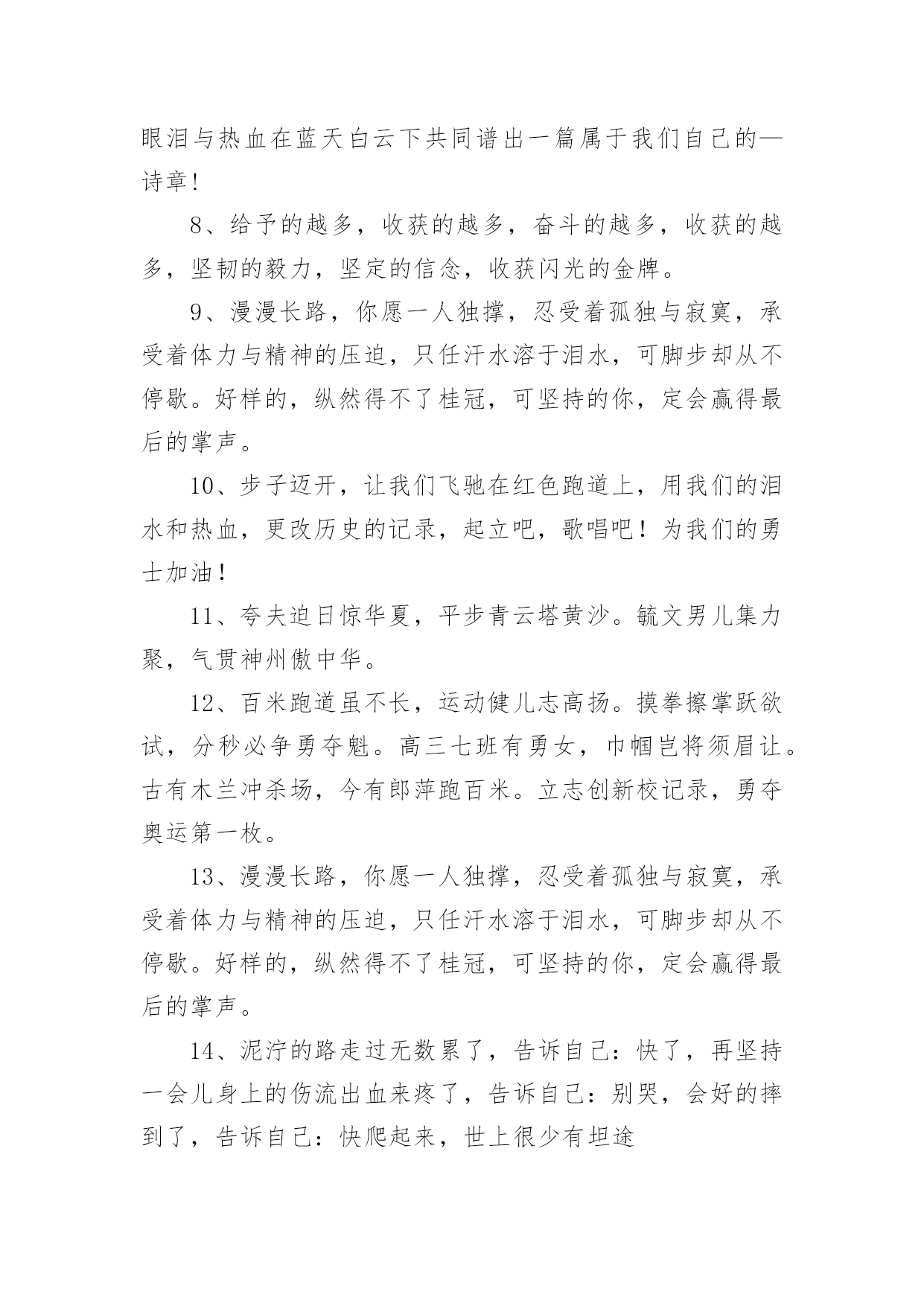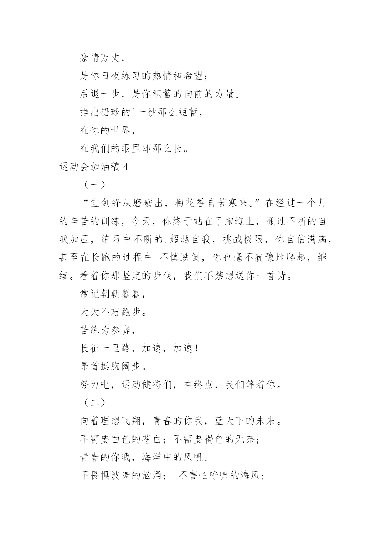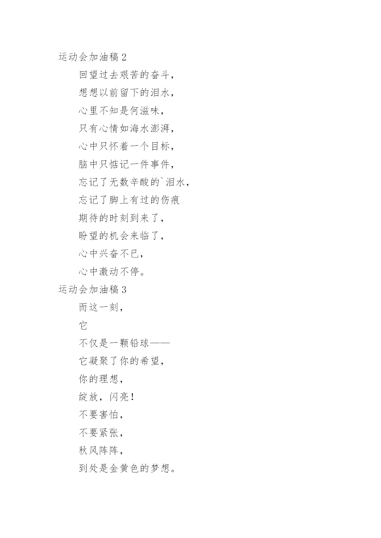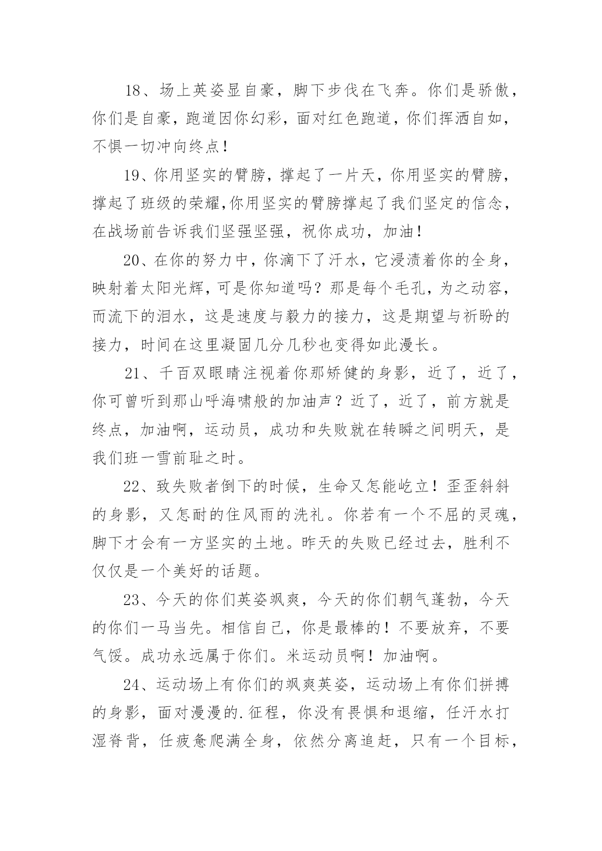 运动会加油稿[精华]运动会加油稿在不断进步的时代,我们可以使用加油稿的机会越来越多,加油稿可以促进对方完成目标的进程。那要怎么写好加油稿呢?下面是小编为大家整理的运动会加油稿,仅供参考,希望能够帮助到大家。运动会加油稿11.不为鲜花的围绕,不为刹那的荣耀,只有执着的信念,化作不停的奔跑,心中燃烧着梦想,脚下不停的步伐,2.你用行动述说着过城的重要,没有无尽的终点,没有无法攀登的险峰,希望载着终点在向你微笑,拼搏吧!经历是一种精彩,迸发你全部的能量,成功是你汗水的写照。3.虽然你们在场上的时间很短暂,但你们的身影依然停留在人们的脑海里,因为你们是赛场上最可爱的.人!4.泥泞的路走过无数,累了,告诉自己:快了,再坚持一会儿。身上的伤流出血来,疼了,告诉自己:别哭,会好的。摔到了,告诉自己:快爬起来,世上很少有坦途。5.心中坚定的信念,脚下沉稳的步伐,你用行动告诉我们一个不变之理,没有走不完的路,没有过不了的山,成功正在终点冲着你高高的招手,用你那顽强的意志去努力,去迎接终点的鲜花与掌声,相信成功一定是属于你。运动会加油稿2回望过去艰苦的奋斗,想想以前留下的泪水,心里不知是何滋味,只有心情如海水澎湃,心中只怀着一个目标,脑中只惦记一件事件,忘记了无数辛酸的`泪水,忘记了脚上有过的伤痕期待的时刻到来了,盼望的机会来临了,心中兴奋不已,心中激动不停。运动会加油稿3而这一刻,它不仅是一颗铅球——它凝聚了你的希望,你的理想,绽放,闪亮!不要害怕,不要紧张,秋风阵阵,到处是金黄色的梦想。豪情万丈,是你日夜练习的热情和希望;后退一步,是你积蓄的向前的力量。推出铅球的'一秒那么短暂,在你的世界,在我们的眼里却那么长。运动会加油稿4(一)“宝剑锋从磨砺出,梅花香自苦寒来。”在经过一个月的辛苦的训练,今天,你终于站在了跑道上,通过不断的自我加压,练习中不断的.超越自我,挑战极限,你自信满满,甚至在长跑的过程中不慎跌倒,你也毫不犹豫地爬起,继续。看着你那坚定的步伐,我们不禁想送你一首诗。常记朝朝暮暮,天天不忘跑步。苦练为参赛,长征一里路,加速,加速!昂首挺胸阔步。努力吧,运动健将们,在终点,我们等着你。(二)向着理想飞翔,青春的你我,蓝天下的未来。不需要白色的苍白;不需要褐色的无奈;青春的你我,海洋中的风帆。不畏惧波涛的汹涌;不害怕呼啸的海风;我们的生命需要拼搏。(三)这一刻,希望在起跑线上放飞,这一刻,时间在永恒中定格。那响起的枪声,是为你们助威的号角;看台上的呼声,是为你们呐喊的旌旗。勇敢地向着希望起飞吧!因为,梦,就在前方,就在前方!运动会加油稿51、面对的依然是蓝色的天空,依然是金色的阳光,依然是绿色的草地,依然是红色的跑道,依然是你,勇敢的你,坚强的你。不同的是,天空更加蔚蓝,阳光更加灿烂,草地更如翡翠一般,跑道更加的鲜艳,而你,定会更加的自信,你的成绩,必然更加辉煌。2、不为鲜花的围绕,不为刹那的荣耀,只有执着的信念,化作不停的奔跑,心中燃烧着梦想,脚下不停的步伐,你用行动述说着过程的重要,没有无尽的终点,没有无法攀登的险峰,希望载着终点在向你微笑,拼搏吧!经历是一种精彩,迸发你全部的能量,成功是你的汗水!3、人生的路,有坦途,也有坎坷;做过的岁月,有欢笑,也有苦涩,泪水告诉我一个跌倒的故事,汗水使我多了一份沉重,几多成熟。4、坚定,执着,耐力与希望,在延伸的白色跑道中点点凝聚!力量,信念,拼搏与奋斗,在遥远的终点线上渐渐明亮!时代的强音正在你的脚下踏响。5、踏着春天的气息,迈着轻盈的脚步,我们迎来了心仪已久的运动会。这里就是展示自我的舞台。我们向往高山的坚忍不拔,我们渴望大海的博大精深,还有,我们更痴迷于你们的速度激情。来吧,尽情释放你的活力。你的每一次冲刺,都叩动着我们的心弦;你的每一次跨越,都吸引着我们的视线;你的每一次起跳,都绷紧我们的神经。我们为你呐喊,我们为你自豪,我们为你疯狂。6、看,终点就在眼前,听,同学为你呼喊。鼓起勇气奋力向前,用你的荣誉带给我们希望。7、看!那一面面迎风飘舞的彩旗,是一朵朵盛开的鲜花;听!那一阵阵惊天动地的欢呼,是回响在耳边胜利的风声。运动场上的你们,是胜利的标志,运动场上的你们,是青春的赞叹。去吧!去迎接那伟大的挑战,去吧!去做一名追风的少年。8、你用行动述说着过程的重要,没有无尽的终点,没有无法攀登的险峰,希望载着终点在向你微笑,拼搏吧!经历是一种精彩,迸发你全部的能量,成功是你汗水的写照。9、温暖的阳光洒在赛场上,男子乙组标枪的比赛即将开始。赛场上,一道道优美的弧线将轻盈地划过天空。健儿们用手中的标枪向距离的权限发起一轮又一轮的挑战。标枪在空中轻盈的姿态,是健儿们强健的力量和熟练的技巧的结合。谁能在这场激烈的竞争中获胜?让我们拭目以待,让我们为他们呐喊助威吧!只有将力量与技巧合二为一的人,才能