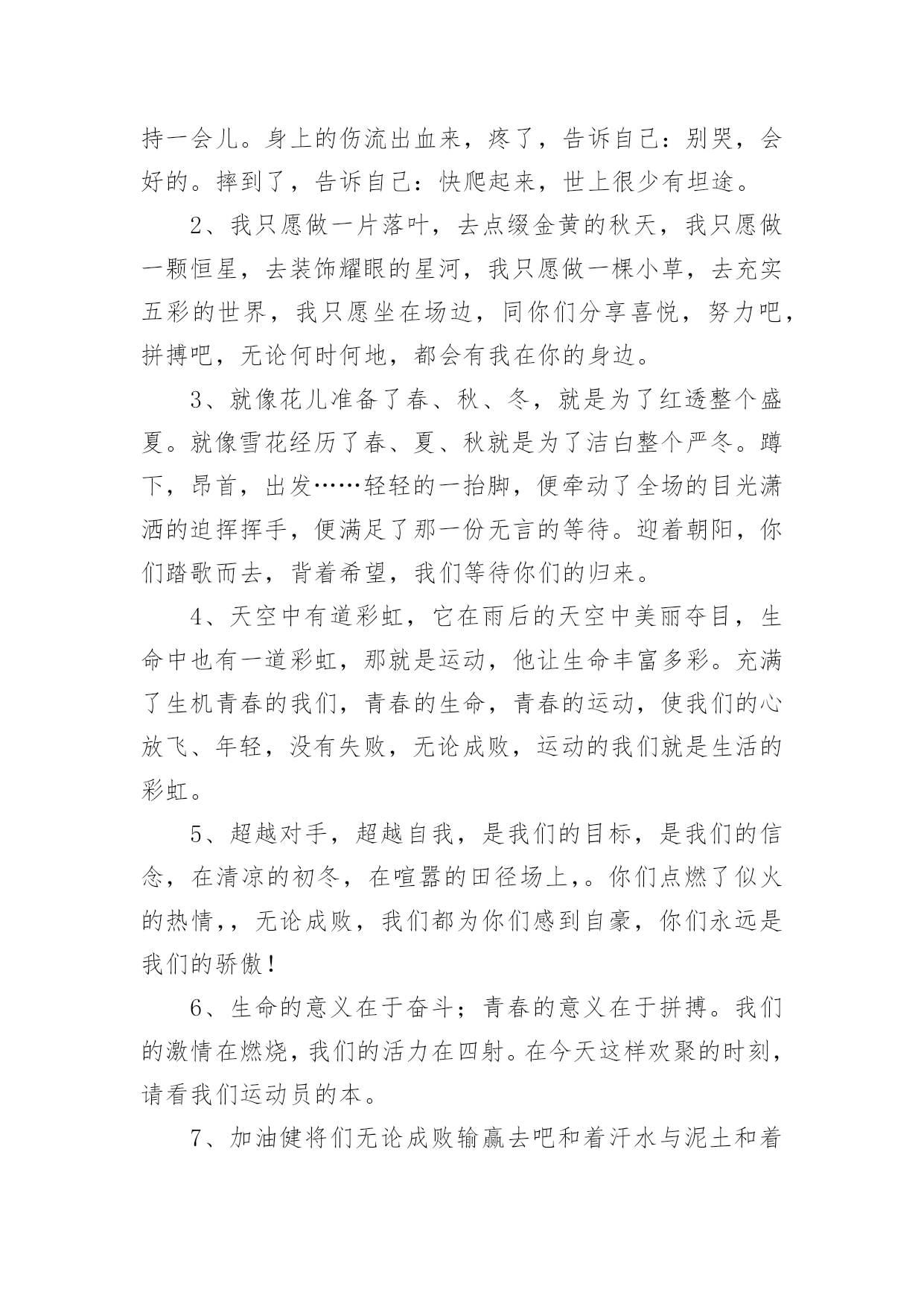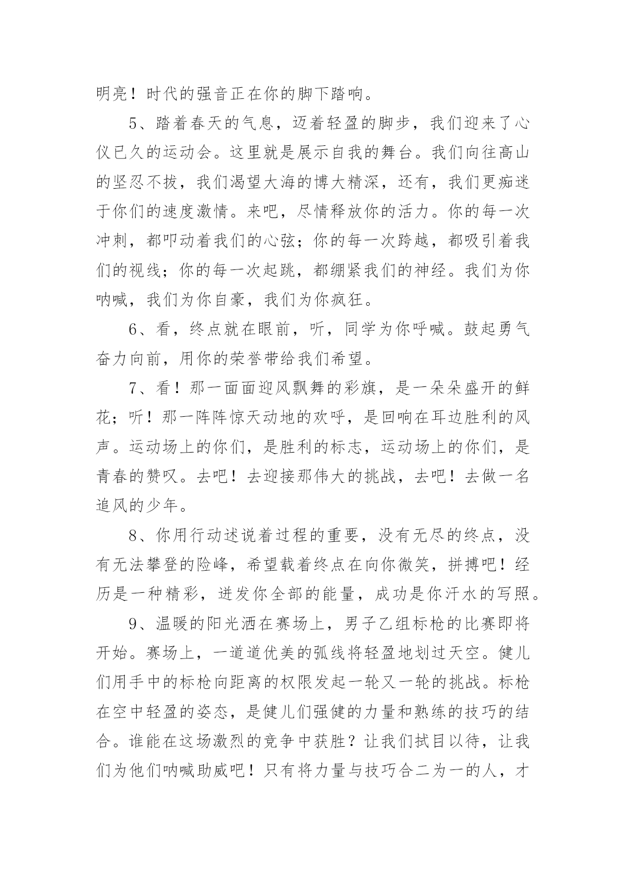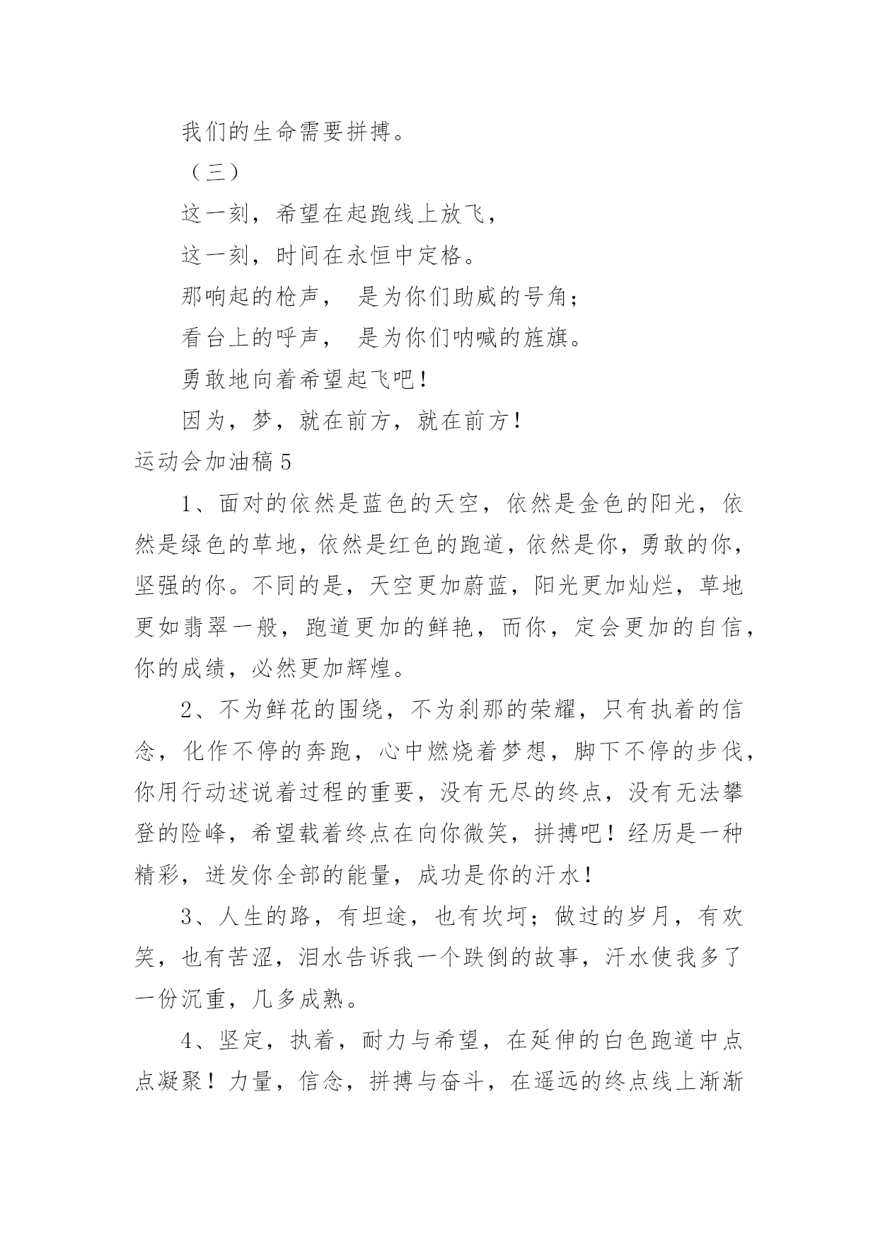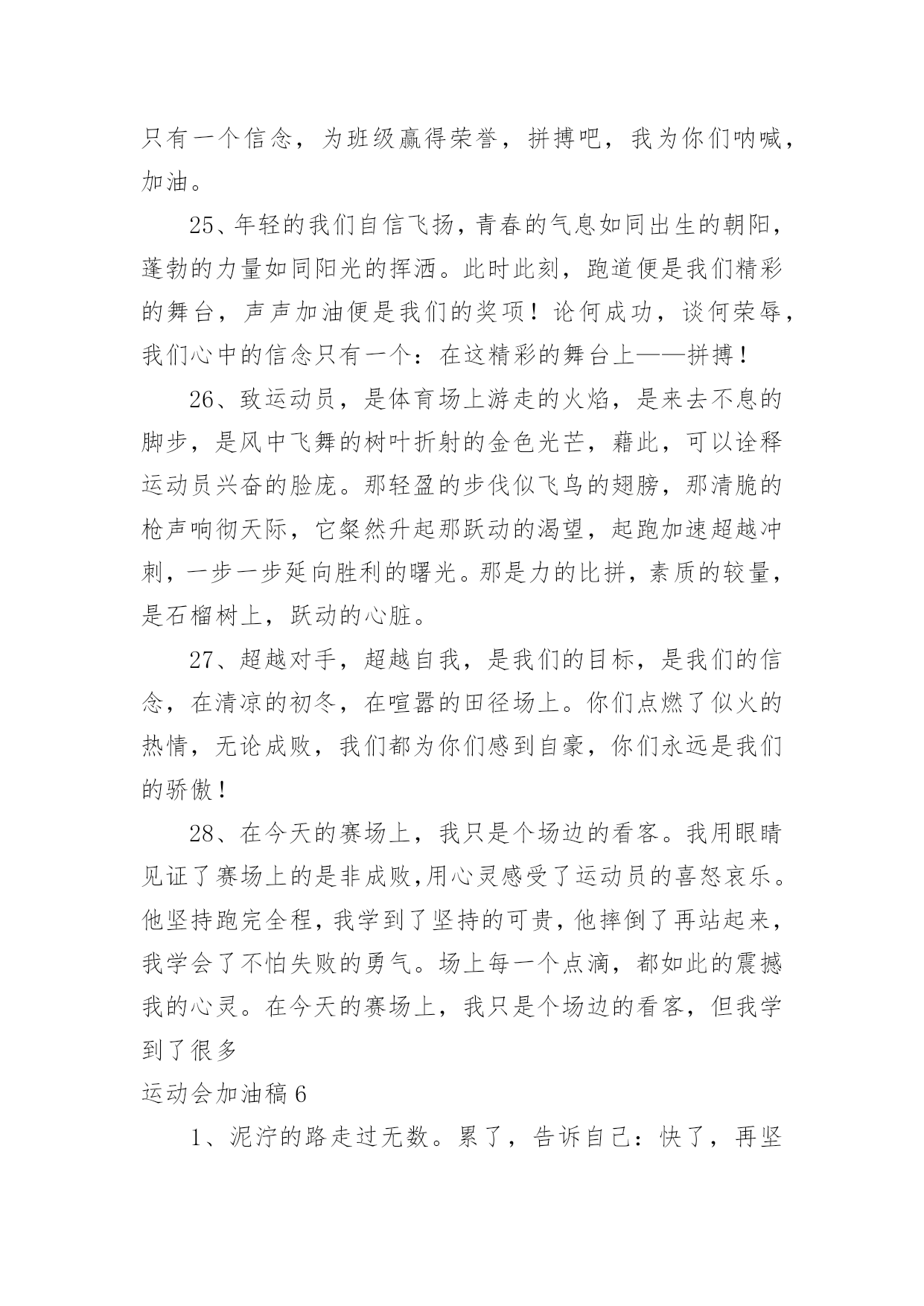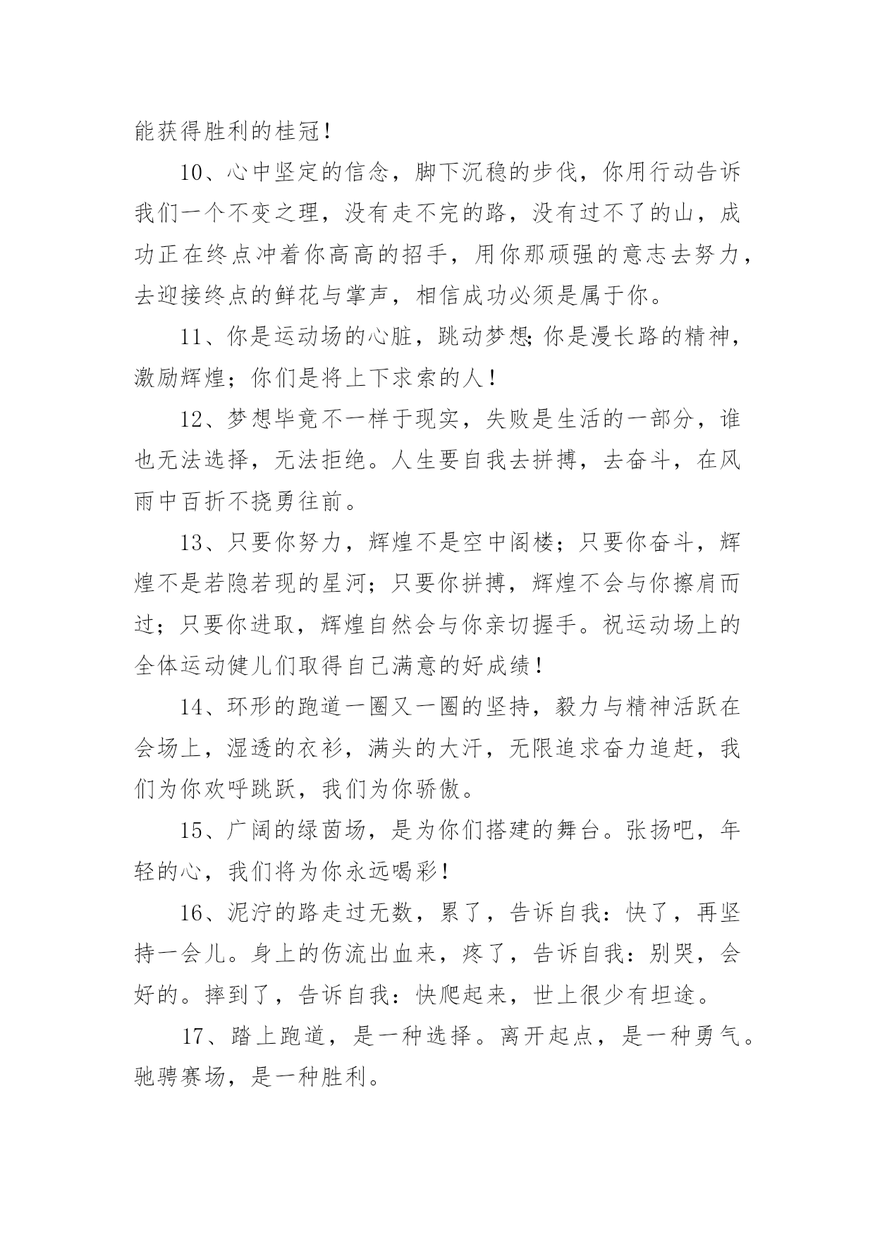 运动会加油稿[精华]运动会加油稿在不断进步的时代,我们可以使用加油稿的机会越来越多,加油稿可以促进对方完成目标的进程。那要怎么写好加油稿呢?下面是小编为大家整理的运动会加油稿,仅供参考,希望能够帮助到大家。运动会加油稿11.不为鲜花的围绕,不为刹那的荣耀,只有执着的信念,化作不停的奔跑,心中燃烧着梦想,脚下不停的步伐,2.你用行动述说着过城的重要,没有无尽的终点,没有无法攀登的险峰,希望载着终点在向你微笑,拼搏吧!经历是一种精彩,迸发你全部的能量,成功是你汗水的写照。3.虽然你们在场上的时间很短暂,但你们的身影依然停留在人们的脑海里,因为你们是赛场上最可爱的.人!4.泥泞的路走过无数,累了,告诉自己:快了,再坚持一会儿。身上的伤流出血来,疼了,告诉自己:别哭,会好的。摔到了,告诉自己:快爬起来,世上很少有坦途。5.心中坚定的信念,脚下沉稳的步伐,你用行动告诉我们一个不变之理,没有走不完的路,没有过不了的山,成功正在终点冲着你高高的招手,用你那顽强的意志去努力,去迎接终点的鲜花与掌声,相信成功一定是属于你。运动会加油稿2回望过去艰苦的奋斗,想想以前留下的泪水,心里不知是何滋味,只有心情如海水澎湃,心中只怀着一个目标,脑中只惦记一件事件,忘记了无数辛酸的`泪水,忘记了脚上有过的伤痕期待的时刻到来了,盼望的机会来临了,心中兴奋不已,心中激动不停。运动会加油稿3而这一刻,它不仅是一颗铅球——它凝聚了你的希望,你的理想,绽放,闪亮!不要害怕,不要紧张,秋风阵阵,到处是金黄色的梦想。豪情万丈,是你日夜练习的热情和希望;后退一步,是你积蓄的向前的力量。推出铅球的'一秒那么短暂,在你的世界,在我们的眼里却那么长。运动会加油稿4(一)“宝剑锋从磨砺出,梅花香自苦寒来。”在经过一个月的辛苦的训练,今天,你终于站在了跑道上,通过不断的自我加压,练习中不断的.超越自我,挑战极限,你自信满满,甚至在长跑的过程中不慎跌倒,你也毫不犹豫地爬起,继续。看着你那坚定的步伐,我们不禁想送你一首诗。常记朝朝暮暮,天天不忘跑步。苦练为参赛,长征一里路,加速,加速!昂首挺胸阔步。努力吧,运动健将们,在终点,我们等着你。(二)向着理想飞翔,青春的你我,蓝天下的未来。不需要白色的苍白;不需要褐色的无奈;青春的你我,海洋中的风帆。不畏惧波涛的汹涌;不害怕呼啸的海风;我们的生命需要拼搏。(三)这一刻,希望在起跑线上放飞,这一刻,时间在永恒中定格。那响起的枪声,是为你们助威的号角;看台上的呼声,是为你们呐喊的旌旗。勇敢地向着希望起飞吧!因为,梦,就在前方,就在前方!运动会加油稿51、面对的依然是蓝色的天空,依然是金色的阳光,依然是绿色的草地,依然是红色的跑道,依然是你,勇敢的你,坚强的你。不同的是,天空更加蔚蓝,阳光更加灿烂,草地更如翡翠一般,跑道更加的鲜艳,而你,定会更加的自信,你的成绩,必然更加辉煌。2、不为鲜花的围绕,不为刹那的荣耀,只有执着的信念,化作不停的奔跑,心中燃烧着梦想,脚下不停的步伐,你用行动述说着过程的重要,没有无尽的终点,没有无法攀登的险峰,希望载着终点在向你微笑,拼搏吧!经历是一种精彩,迸发你全部的能量,成功是你的汗水!3、人生的路,有坦途,也有坎坷;做过的岁月,有欢笑,也有苦涩,泪水告诉我一个跌倒的故事,汗水使我多了一份沉重,几多成熟。4、坚定,执着,耐力与希望,在延伸的白色跑道中点点凝聚!力量,信念,拼搏与奋斗,在遥远的终点线上渐渐明亮!时代的强音正在你的脚下踏响。5、踏着春天的气息,迈着轻盈的脚步,我们迎来了心仪已久的运动会。这里就是展示自我的舞台。我们向往高山的坚忍不拔,我们渴望大海的博大精深,还有,我们更痴迷于你们的速度激情。来吧,尽情释放你的活力。你的每一次冲刺,都叩动着我们的心弦;你的每一次跨越,都吸引着我们的视线;你的每一次起跳,都绷紧我们的神经。我们为你呐喊,我们为你自豪,我们为你疯狂。6、看,终点就在眼前,听,同学为你呼喊。鼓起勇气奋力向前,用你的荣誉带给我们希望。7、看!那一面面迎风飘舞的彩旗,是一朵朵盛开的鲜花;听!那一阵阵惊天动地的欢呼,是回响在耳边胜利的风声。运动场上的你们,是胜利的标志,运动场上的你们,是青春的赞叹。去吧!去迎接那伟大的挑战,去吧!去做一名追风的少年。8、你用行动述说着过程的重要,没有无尽的终点,没有无法攀登的险峰,希望载着终点在向你微笑,拼搏吧!经历是一种精彩,迸发你全部的能量,成功是你汗水的写照。9、温暖的阳光洒在赛场上,男子乙组标枪的比赛即将开始。赛场上,一道道优美的弧线将轻盈地划过天空。健儿们用手中的标枪向距离的权限发起一轮又一轮的挑战。标枪在空中轻盈的姿态,是健儿们强健的力量和熟练的技巧的结合。谁能在这场激烈的竞争中获胜?让我们拭目以待,让我们为他们呐喊助威吧!只有将力量与技巧合二为一的人,才能