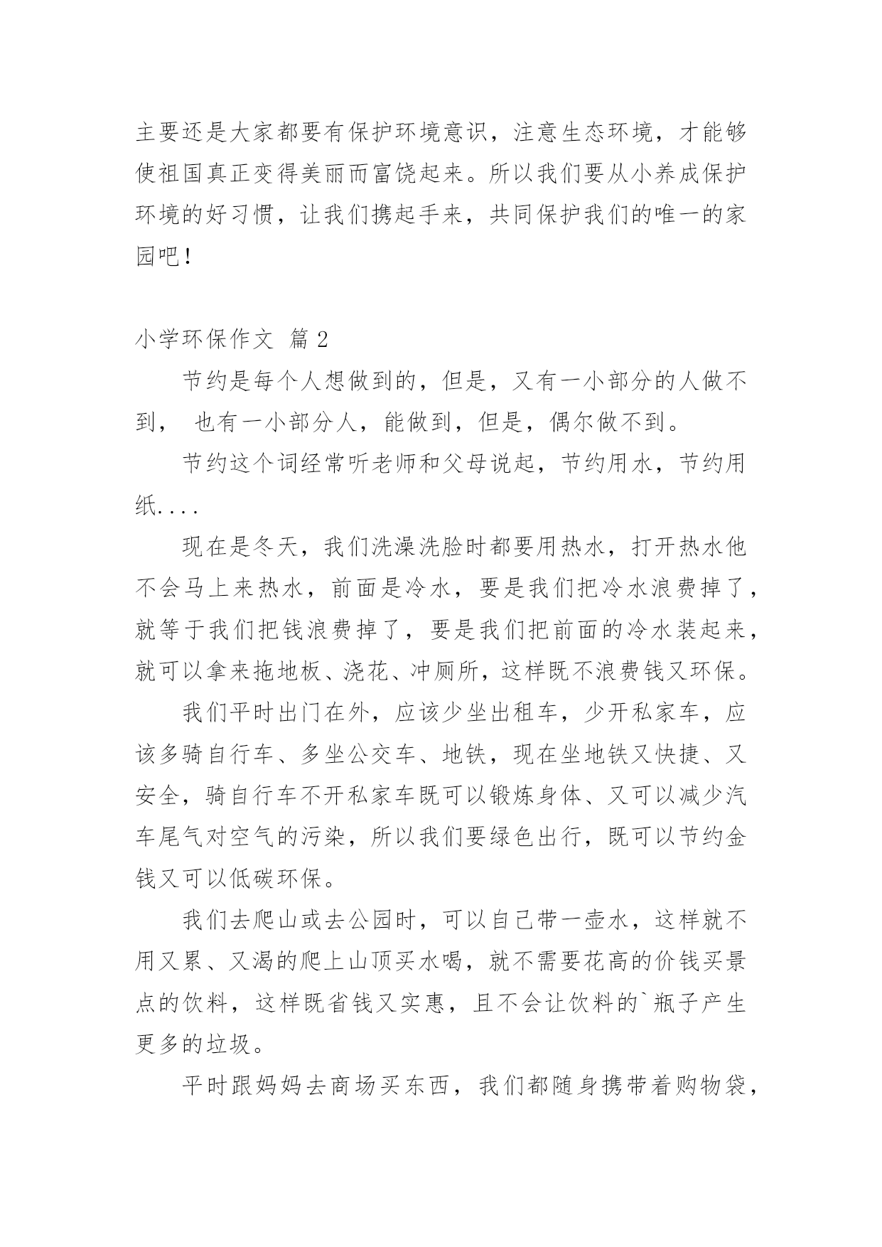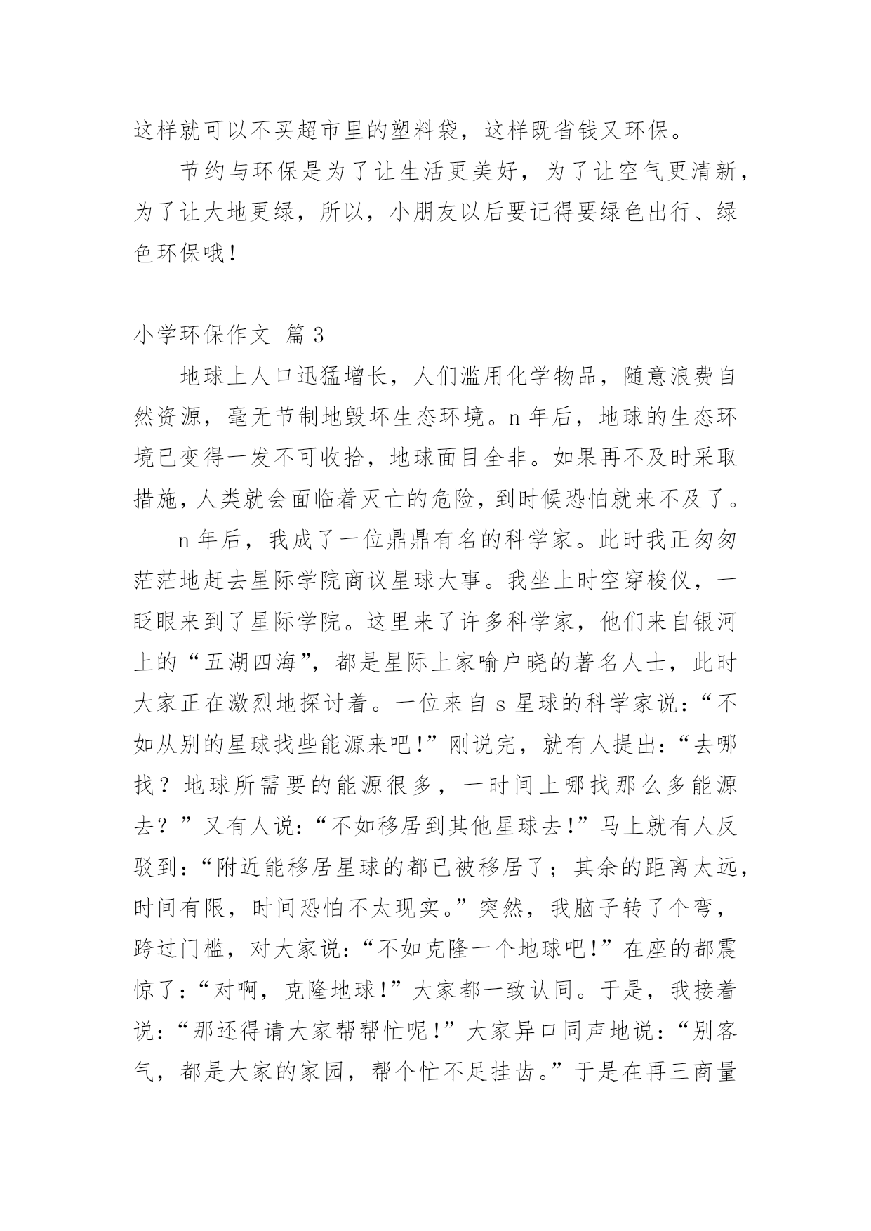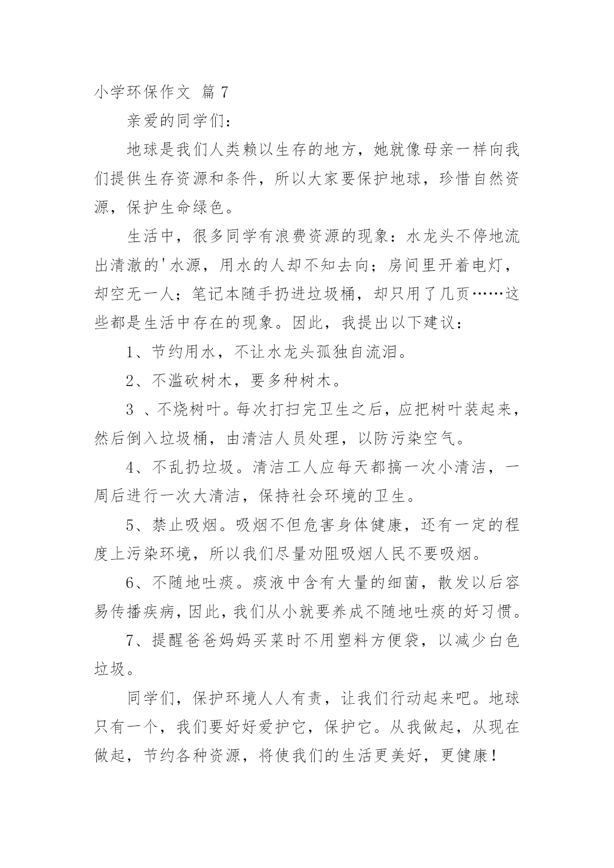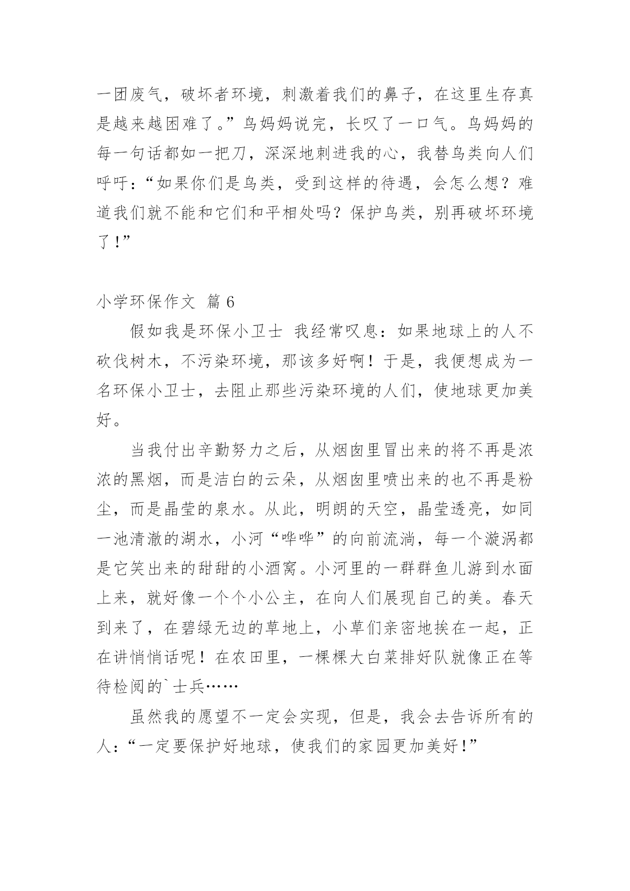 小学环保作文[集合]小学环保作文8篇在平时的学习、工作或生活中,大家都写过作文吧,借助作文可以提高我们的语言组织能力。你知道作文怎样才能写的好吗?下面是小编帮大家整理的小学环保作文9篇,仅供参考,希望能够帮助到大家。小学环保作文篇1人们越来越不重视保护环境,随地扔垃圾、浪费水、随便砍伐树木,在人们的眼里已经是很平常的事,每天不知有多少绿洲变成了沙漠。难道人们的眼里就只有钱、钱、钱吗?我虽是个小学生,但是也懂得保护环境,人人有责。面对这些破坏环境的人,我感到非常痛恨。之后,我查阅了很多关于保护环境的资料,冥思苦想,终于想出了几个保护环境的方法。大家都知道,空气污染是保护环境的大敌。废气中的二氧化硫等有毒物体能够使树木、农作物的叶变黄、枯萎、脱落。二氧化硫与云中的雨滴结合,形成酸雨降落,会使大片的森林、农作物死亡。可见,空气污染是一大要害。于是,我利用吸尘器的原理,想出了“废气处理机”。废气处理机外形跟吸尘器差不多,只不过比吸尘器大好多,而且不用插电,只要放上几节电池就行了。这种废气处理机一打开开关,强大的风力就会把工厂等排出来的废气吸进去,到了废气处理机的尾端,会有空气清新剂把废气变为新鲜的空气,供人呼吸。水,是人们的生命之泉,人们少不了它。可是近几年,水污染非常严重,就拿我家附近的一条小池说吧,刚开始,人们都很爱护它,所以里面的水非常清澈,一眼望去,水底的石头都看得清清楚楚。可是,慢慢的,人们对它的热乎劲没有了,开始往里倒垃圾,污染水源,甚至在里面洗脚、小便。于是,这条清澈见底的水池,变成了浑浊不清的垃圾箱。所以,保护水源也是很重要的。于是,我想出了“吸水机”。它跟油烟机很相似,只是前面是吸尘器似的大口。只要你一打开开关,吸水机就会把废水吸到里面,然后通过吸水机的末端的细长水管排成到“废水池”里,然后经过沉淀、清除等工作使废水变成自来水,送到千家万户,供人们饮用。生活中处处都有垃圾,垃圾不但占地,而且臭气熏天,严重危害人民的`身心健康。虽然路旁都有垃圾箱,但大多数人都不愿意去那么臭的地方去倒垃圾,于是人们都把垃圾扔到了河边、小树旁,使河水变浑浊,小树叶子枯萎。因而,我动脑筋,想出了一种新型垃圾箱,这种垃圾箱是令人愉快的淡粉色的,盖子是天蓝色的拉动式盖,这个垃圾箱分两层,左边一层很小,厚只有1厘米,是放上空气清新剂用的,垃圾箱底下连着垃圾厂,只要垃圾箱一满,那么里面的垃圾会通过地下送到垃圾厂,综合处理。这样,就不用工人开着车去倒垃圾,既不臭也不污染环境,多妙啊。当然,我想的这些只不过是提议罢了,是治标不治本的,主要还是大家都要有保护环境意识,注意生态环境,才能够使祖国真正变得美丽而富饶起来。所以我们要从小养成保护环境的好习惯,让我们携起手来,共同保护我们的唯一的家园吧!小学环保作文篇2节约是每个人想做到的,但是,又有一小部分的人做不到,也有一小部分人,能做到,但是,偶尔做不到。节约这个词经常听老师和父母说起,节约用水,节约用纸....现在是冬天,我们洗澡洗脸时都要用热水,打开热水他不会马上来热水,前面是冷水,要是我们把冷水浪费掉了,就等于我们把钱浪费掉了,要是我们把前面的冷水装起来,就可以拿来拖地板、浇花、冲厕所,这样既不浪费钱又环保。我们平时出门在外,应该少坐出租车,少开私家车,应该多骑自行车、多坐公交车、地铁,现在坐地铁又快捷、又安全,骑自行车不开私家车既可以锻炼身体、又可以减少汽车尾气对空气的污染,所以我们要绿色出行,既可以节约金钱又可以低碳环保。我们去爬山或去公园时,可以自己带一壶水,这样就不用又累、又渴的爬上山顶买水喝,就不需要花高的价钱买景点的饮料,这样既省钱又实惠,且不会让饮料的`瓶子产生更多的垃圾。平时跟妈妈去商场买东西,我们都随身携带着购物袋,这样就可以不买超市里的塑料袋,这样既省钱又环保。节约与环保是为了让生活更美好,为了让空气更清新,为了让大地更绿,所以,小朋友以后要记得要绿色出行、绿色环保哦!小学环保作文篇3地球上人口迅猛增长,人们滥用化学物品,随意浪费自然资源,毫无节制地毁坏生态环境。n年后,地球的生态环境已变得一发不可收拾,地球面目全非。如果再不及时采取措施,人类就会面临着灭亡的危险,到时候恐怕就来不及了。n年后,我成了一位鼎鼎有名的科学家。此时我正匆匆茫茫地赶去星际学院商议星球大事。我坐上时空穿梭仪,一眨眼来到了星际学院。这里来了许多科学家,他们来自银河上的“五湖四海”,都是星际上家喻户晓的著名人士,此时大家正在激烈地探讨着。一位来自s星球的科学家说:“不如从别的星球找些能源来吧!”刚说完,就有人提出:“去哪找?地球所需要的能源很多,一时间上哪找那么多能源去?”又有人说:“不如移居到其他星球去!”马上就有人反驳到:“附近能移居星球的都已被移居了;其余的距离太远,时间有限,时间恐怕不太现实。”突然