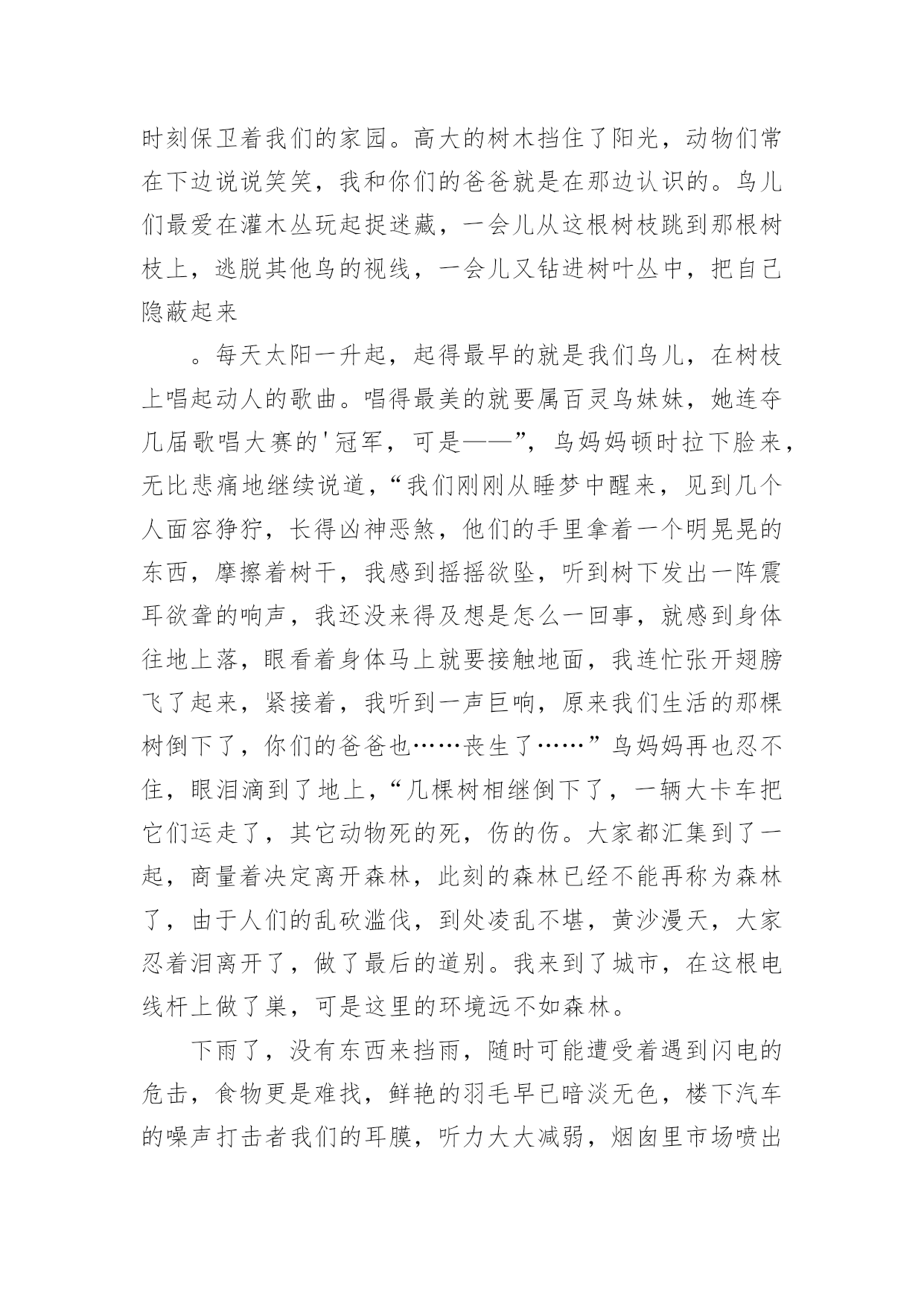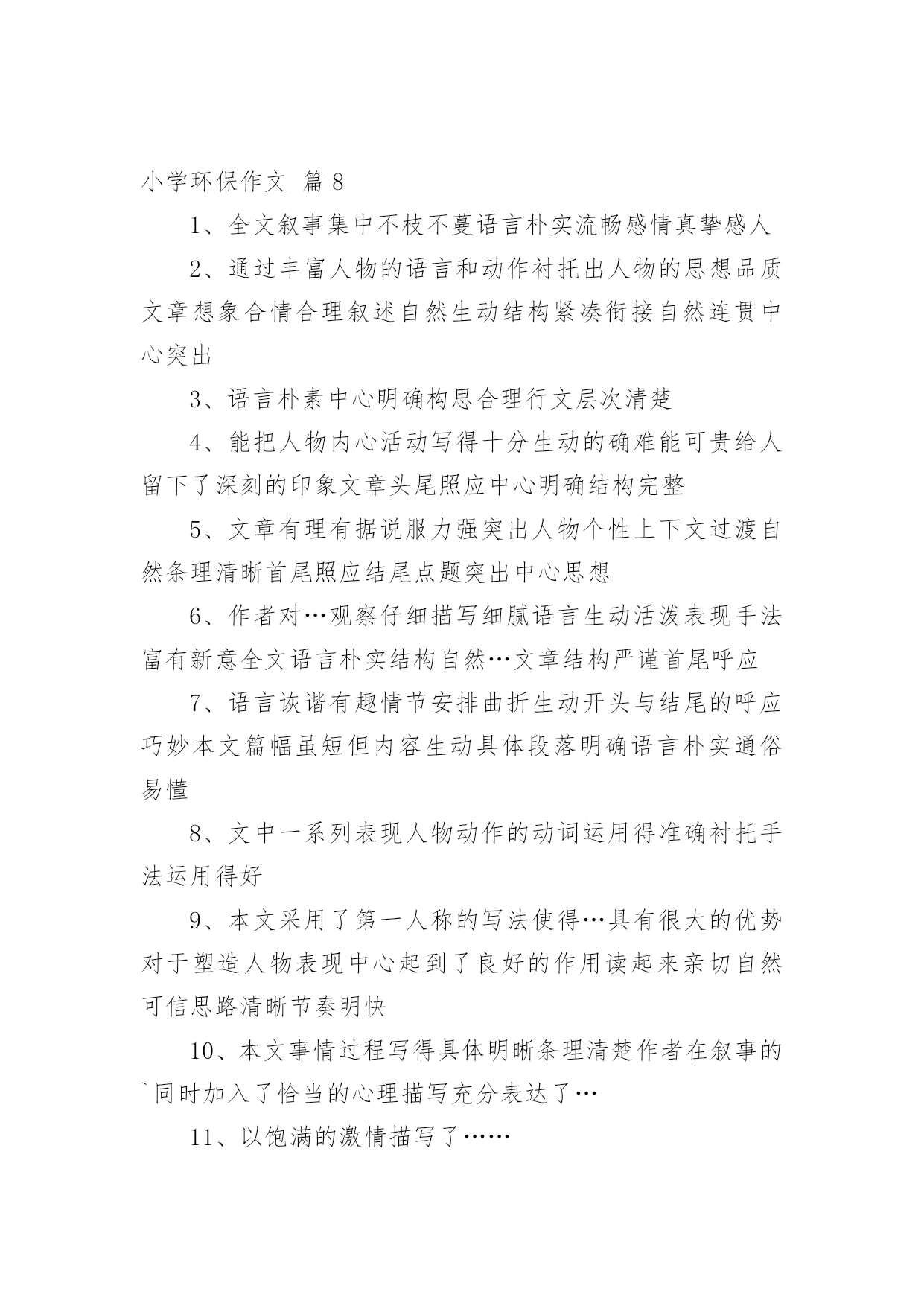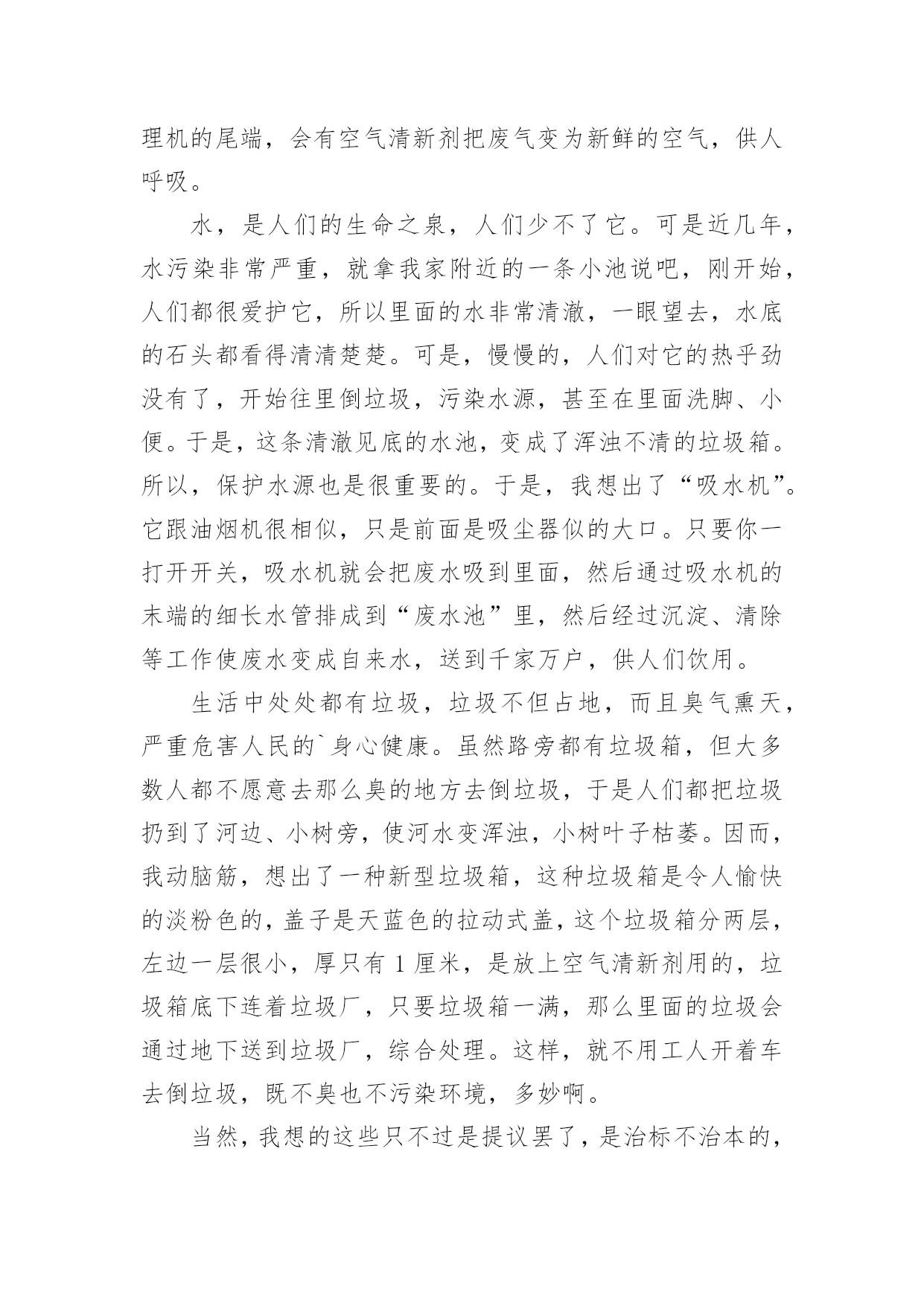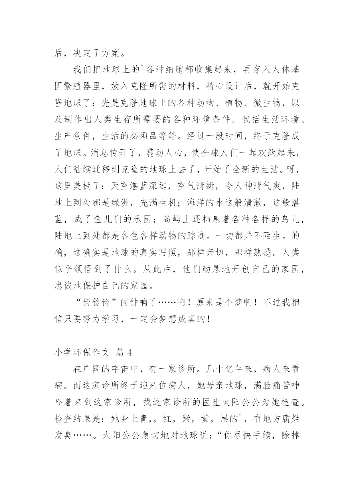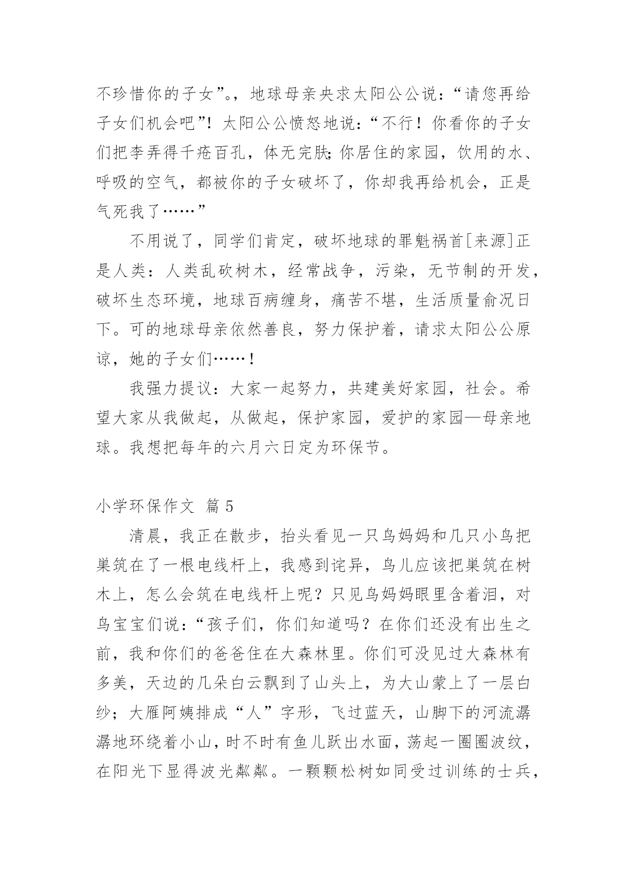 小学环保作文[集合]小学环保作文8篇在平时的学习、工作或生活中,大家都写过作文吧,借助作文可以提高我们的语言组织能力。你知道作文怎样才能写的好吗?下面是小编帮大家整理的小学环保作文9篇,仅供参考,希望能够帮助到大家。小学环保作文篇1人们越来越不重视保护环境,随地扔垃圾、浪费水、随便砍伐树木,在人们的眼里已经是很平常的事,每天不知有多少绿洲变成了沙漠。难道人们的眼里就只有钱、钱、钱吗?我虽是个小学生,但是也懂得保护环境,人人有责。面对这些破坏环境的人,我感到非常痛恨。之后,我查阅了很多关于保护环境的资料,冥思苦想,终于想出了几个保护环境的方法。大家都知道,空气污染是保护环境的大敌。废气中的二氧化硫等有毒物体能够使树木、农作物的叶变黄、枯萎、脱落。二氧化硫与云中的雨滴结合,形成酸雨降落,会使大片的森林、农作物死亡。可见,空气污染是一大要害。于是,我利用吸尘器的原理,想出了“废气处理机”。废气处理机外形跟吸尘器差不多,只不过比吸尘器大好多,而且不用插电,只要放上几节电池就行了。这种废气处理机一打开开关,强大的风力就会把工厂等排出来的废气吸进去,到了废气处理机的尾端,会有空气清新剂把废气变为新鲜的空气,供人呼吸。水,是人们的生命之泉,人们少不了它。可是近几年,水污染非常严重,就拿我家附近的一条小池说吧,刚开始,人们都很爱护它,所以里面的水非常清澈,一眼望去,水底的石头都看得清清楚楚。可是,慢慢的,人们对它的热乎劲没有了,开始往里倒垃圾,污染水源,甚至在里面洗脚、小便。于是,这条清澈见底的水池,变成了浑浊不清的垃圾箱。所以,保护水源也是很重要的。于是,我想出了“吸水机”。它跟油烟机很相似,只是前面是吸尘器似的大口。只要你一打开开关,吸水机就会把废水吸到里面,然后通过吸水机的末端的细长水管排成到“废水池”里,然后经过沉淀、清除等工作使废水变成自来水,送到千家万户,供人们饮用。生活中处处都有垃圾,垃圾不但占地,而且臭气熏天,严重危害人民的`身心健康。虽然路旁都有垃圾箱,但大多数人都不愿意去那么臭的地方去倒垃圾,于是人们都把垃圾扔到了河边、小树旁,使河水变浑浊,小树叶子枯萎。因而,我动脑筋,想出了一种新型垃圾箱,这种垃圾箱是令人愉快的淡粉色的,盖子是天蓝色的拉动式盖,这个垃圾箱分两层,左边一层很小,厚只有1厘米,是放上空气清新剂用的,垃圾箱底下连着垃圾厂,只要垃圾箱一满,那么里面的垃圾会通过地下送到垃圾厂,综合处理。这样,就不用工人开着车去倒垃圾,既不臭也不污染环境,多妙啊。当然,我想的这些只不过是提议罢了,是治标不治本的,主要还是大家都要有保护环境意识,注意生态环境,才能够使祖国真正变得美丽而富饶起来。所以我们要从小养成保护环境的好习惯,让我们携起手来,共同保护我们的唯一的家园吧!小学环保作文篇2节约是每个人想做到的,但是,又有一小部分的人做不到,也有一小部分人,能做到,但是,偶尔做不到。节约这个词经常听老师和父母说起,节约用水,节约用纸....现在是冬天,我们洗澡洗脸时都要用热水,打开热水他不会马上来热水,前面是冷水,要是我们把冷水浪费掉了,就等于我们把钱浪费掉了,要是我们把前面的冷水装起来,就可以拿来拖地板、浇花、冲厕所,这样既不浪费钱又环保。我们平时出门在外,应该少坐出租车,少开私家车,应该多骑自行车、多坐公交车、地铁,现在坐地铁又快捷、又安全,骑自行车不开私家车既可以锻炼身体、又可以减少汽车尾气对空气的污染,所以我们要绿色出行,既可以节约金钱又可以低碳环保。我们去爬山或去公园时,可以自己带一壶水,这样就不用又累、又渴的爬上山顶买水喝,就不需要花高的价钱买景点的饮料,这样既省钱又实惠,且不会让饮料的`瓶子产生更多的垃圾。平时跟妈妈去商场买东西,我们都随身携带着购物袋,这样就可以不买超市里的塑料袋,这样既省钱又环保。节约与环保是为了让生活更美好,为了让空气更清新,为了让大地更绿,所以,小朋友以后要记得要绿色出行、绿色环保哦!小学环保作文篇3地球上人口迅猛增长,人们滥用化学物品,随意浪费自然资源,毫无节制地毁坏生态环境。n年后,地球的生态环境已变得一发不可收拾,地球面目全非。如果再不及时采取措施,人类就会面临着灭亡的危险,到时候恐怕就来不及了。n年后,我成了一位鼎鼎有名的科学家。此时我正匆匆茫茫地赶去星际学院商议星球大事。我坐上时空穿梭仪,一眨眼来到了星际学院。这里来了许多科学家,他们来自银河上的“五湖四海”,都是星际上家喻户晓的著名人士,此时大家正在激烈地探讨着。一位来自s星球的科学家说:“不如从别的星球找些能源来吧!”刚说完,就有人提出:“去哪找?地球所需要的能源很多,一时间上哪找那么多能源去?”又有人说:“不如移居到其他星球去!”马上就有人反驳到:“附近能移居星球的都已被移居了;其余的距离太远,时间有限,时间恐怕不太现实。”突然