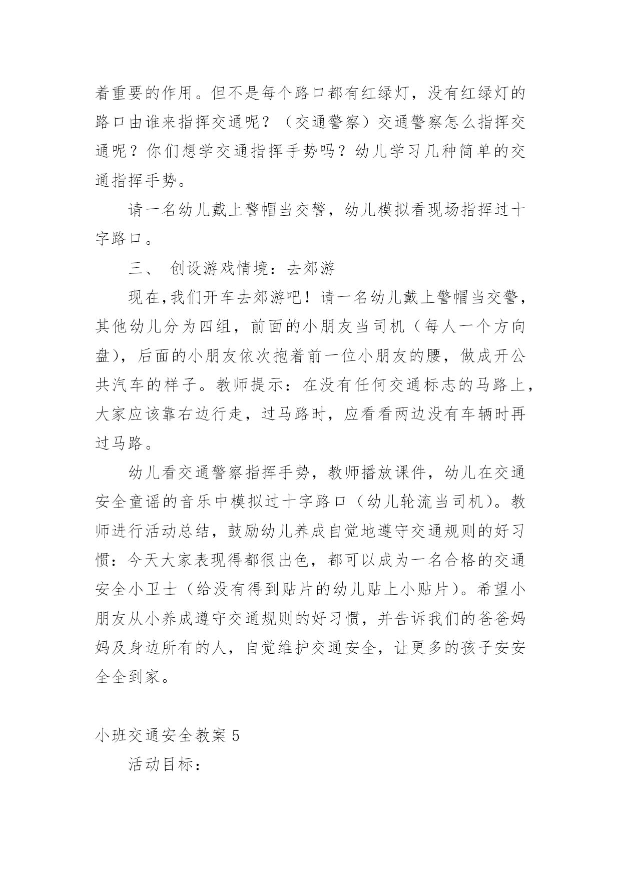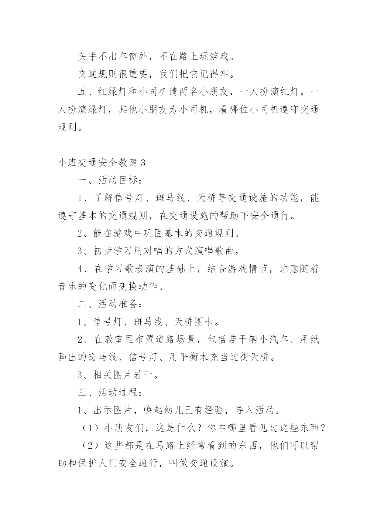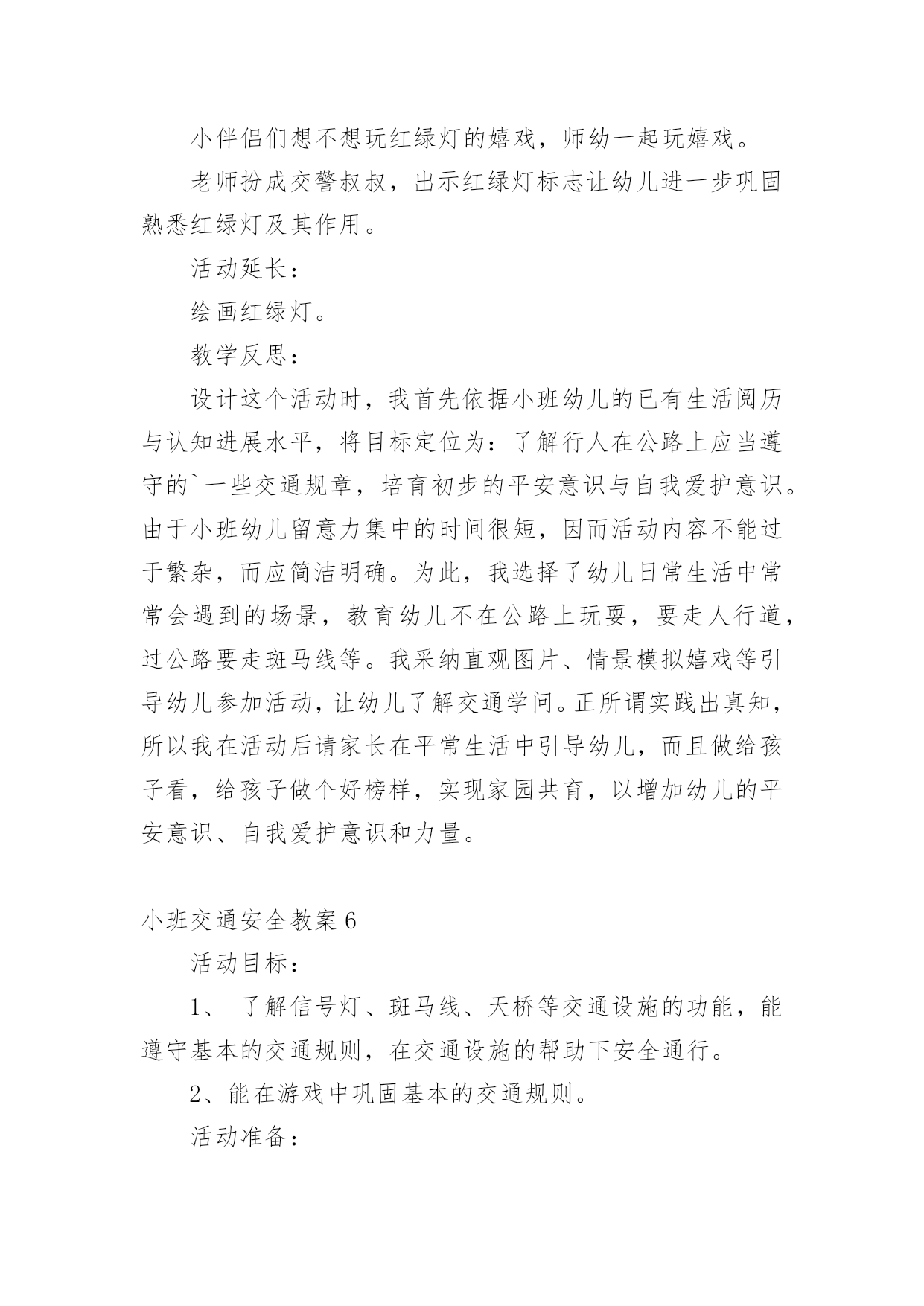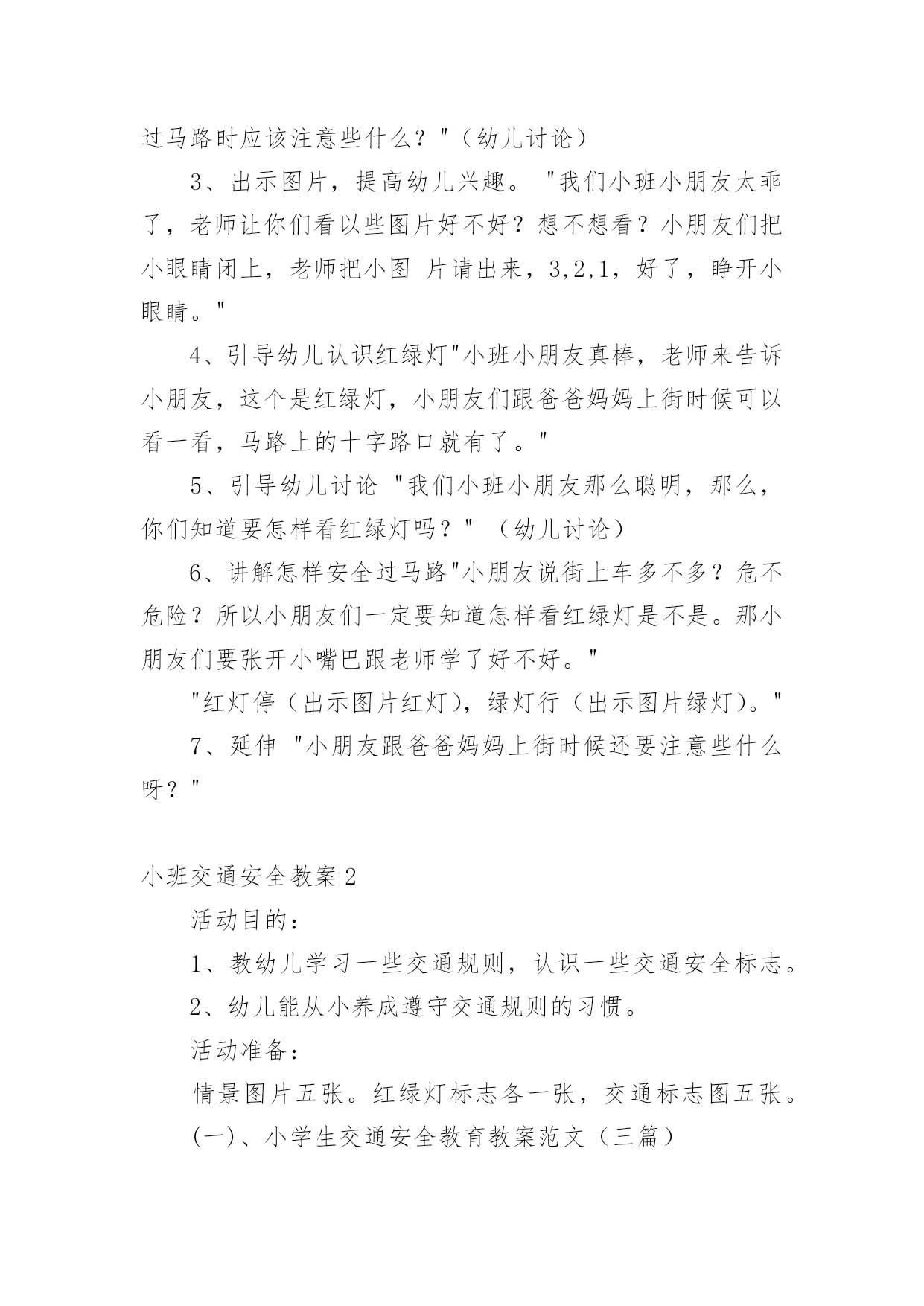 小班交通安全教案小班交通安全教案精选15篇作为一位杰出的教职工,往往需要进行教案编写工作,教案是保证教学取得成功、提高教学质量的基本条件。那么优秀的教案是什么样的呢?下面是小编收集整理的小班交通安全教案,欢迎大家分享。小班交通安全教案1活动目标:1、让幼儿了解一些基本的交通安全知识,知道红灯停,绿灯行的'道理。2、知道过马路时要注意自己的安全,让幼儿知道不走斑马线的危险性。3、让幼儿学会念儿歌,进一步培养幼儿的幼儿的语言表达能力。活动准备:1、图片红绿灯、斑马线2、儿歌《交通灯》活动过程:1、手指游戏,稳定幼儿情绪。"小朋友们伸出小手,跟老师一起玩个手指游戏好不好?"2、谈话,引入主题。"小朋友们知道怎样过马路吗?过马路时应该注意些什么?"(幼儿讨论)3、出示图片,提高幼儿兴趣。"我们小班小朋友太乖了,老师让你们看以些图片好不好?想不想看?小朋友们把小眼睛闭上,老师把小图片请出来,3,2,1,好了,睁开小眼睛。"4、引导幼儿认识红绿灯"小班小朋友真棒,老师来告诉小朋友,这个是红绿灯,小朋友们跟爸爸妈妈上街时候可以看一看,马路上的十字路口就有了。"5、引导幼儿讨论"我们小班小朋友那么聪明,那么,你们知道要怎样看红绿灯吗?"(幼儿讨论)6、讲解怎样安全过马路"小朋友说街上车多不多?危不危险?所以小朋友们一定要知道怎样看红绿灯是不是。那小朋友们要张开小嘴巴跟老师学了好不好。""红灯停(出示图片红灯),绿灯行(出示图片绿灯)。"7、延伸"小朋友跟爸爸妈妈上街时候还要注意些什么呀?"小班交通安全教案2活动目的:1、教幼儿学习一些交通规则,认识一些交通安全标志。2、幼儿能从小养成遵守交通规则的习惯。活动准备:情景图片五张。红绿灯标志各一张,交通标志图五张。(一)、小学生交通安全教育教案范文(三篇)(二)、高中交通安全教育班会教案设计范文(三)、学校交通安全应急预案范文(三篇)(四)、小学生交通安全会议记录模板范文(两篇)(五)、小学生交通安全教育主题班会记录(两篇)(六)、幼儿园小班交通安全教案安全过马路活动反思范文(七)、幼儿园小班交通安全活动教案策划(五篇)(八)、幼儿园小班交通安全教案设计(四篇)(九)、交通安全事故心得体会范文(三篇)(十)、幼儿园大班交通安全教案设计(三篇)活动过程:一、猜谜语,导入新课。红绿灯和斑马线,可结合班内墙上的斑马线图案介绍斑马线的作用。二、结合情景图片,学习交通规则。1、幼儿自由举手回答,自己还知道哪些交通规则?2、幼儿说出来的可结合图片讲解,没想到的`出示图片,说说图片上的幼儿做的对不对,应该怎样做才是遵守交通规则。三、认识交通安全标志。出示图片,请幼儿猜猜它表示什么?四、学儿歌记交通规则儿歌:交通安全歌红灯停,绿灯行,黄灯请你准备好。天桥地道人行道,横穿马路离不了。头手不出车窗外,不在路上玩游戏。交通规则很重要,我们把它记得牢。五、红绿灯和小司机请两名小朋友,一人扮演红灯,一人扮演绿灯,其他小朋友为小司机,看哪位小司机遵守交通规则。小班交通安全教案3一、活动目标:1、了解信号灯、斑马线、天桥等交通设施的功能,能遵守基本的交通规则,在交通设施的帮助下安全通行。2、能在游戏中巩固基本的交通规则。3、初步学习用对唱的方式演唱歌曲。4、在学习歌表演的基础上,结合游戏情节,注意随着音乐的变化而变换动作。二、活动准备:1、信号灯、斑马线、天桥图卡。2、在教室里布置道路场景,包括若干辆小汽车、用纸画出的斑马线、信号灯、用平衡木充当过街天桥。3、相关图片若干。三、活动过程:1、出示图片,唤起幼儿已有经验,导入活动。(1)小朋友们,这是什么?你在哪里看见过这些东西?(2)这些都是在马路上经常看到的东西,他们可以帮助和保护人们安全通行,叫做交通设施。2、使用道具布置道路场景,引导幼儿观看情景表演,了解常见交通设施的功能。爸爸送丫丫去幼儿园,他们一路上会经过哪些交通设施呢?小朋友,一起来看一看吧。(1)在情景表演中了解信号灯和斑马线的作用。爸爸和丫丫站在那路边,他们想过马路。马路对面有个信号灯,这个信号灯是帮助我们过马路的',他会告诉我们红灯停,绿灯行,黄灯亮了等一等。(2)绿灯亮啦可以走了,等等你看地上有什么?好多白线好像斑马身上的花纹一样。这就是斑马线。"条条斑马线,连着路两边,过街线内走,大家才安全。是保护我们安全通行的,我们一起走斑马线过马路吧。"(3)没有斑马线怎么过马路呢?你看,这是天桥,它使行人从车辆的上面通行,避开了车辆,避免了被车撞到的危险,所以天桥也是保护我们安全的交通设施。"空中一座大桥,横跨马路架牢,行人桥上走过,汽车桥下奔跑。"3、邀请幼儿扮演行人在情境中游戏,参与表演。教学反思设计这个活动时,我首先根据小班幼儿的已有生活经验与认知发展水平,将目标定位为:了解行人在马路上应该遵守的一些交通