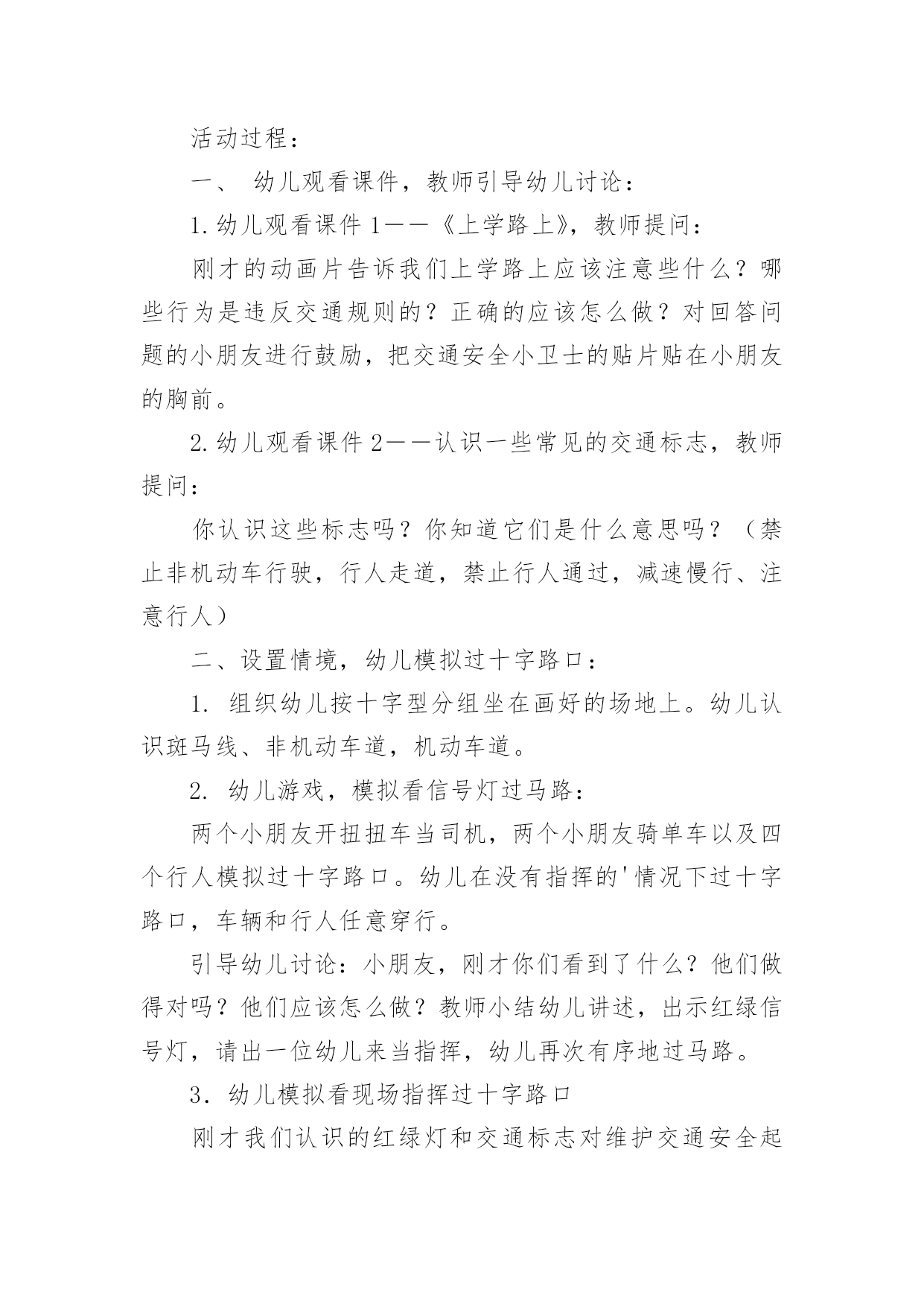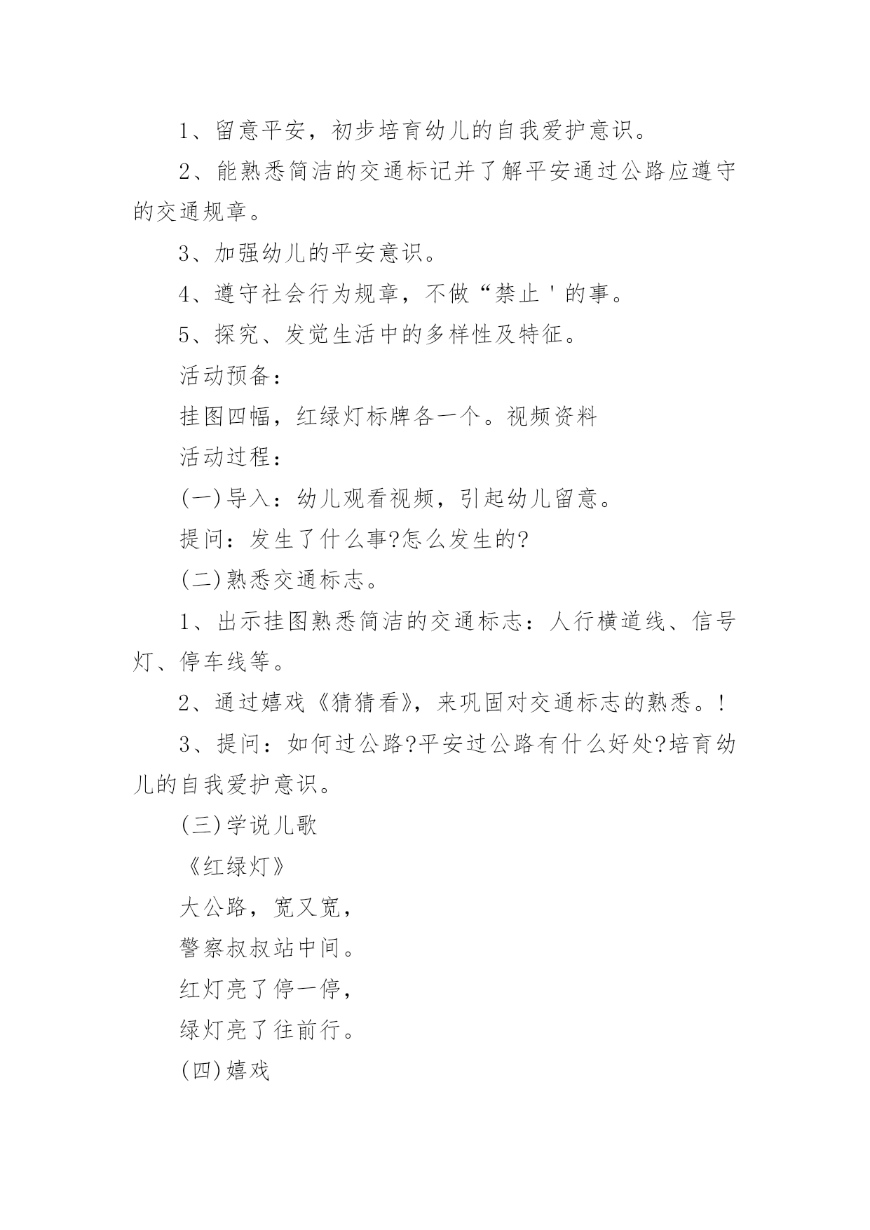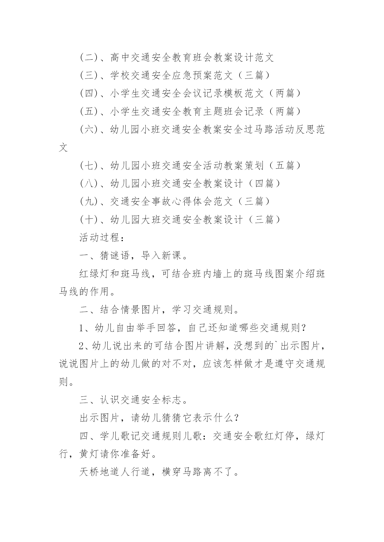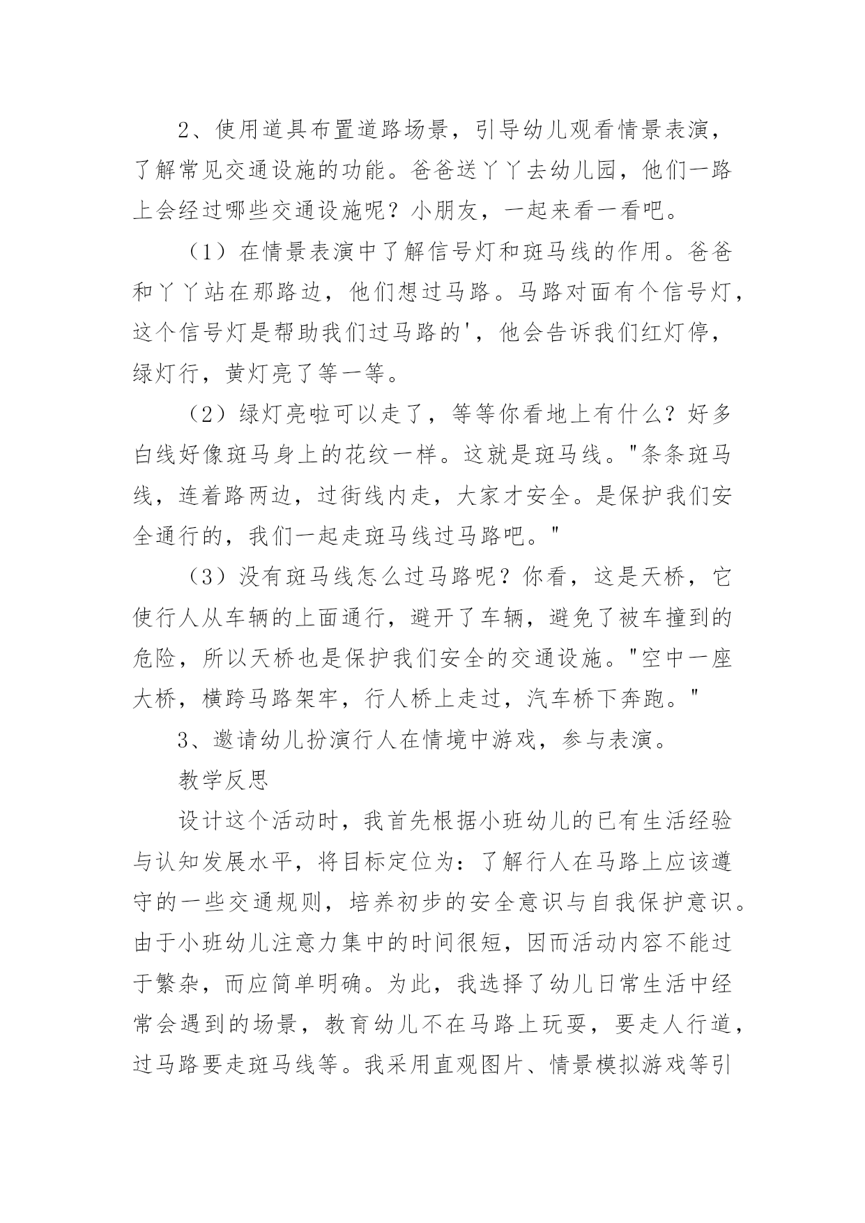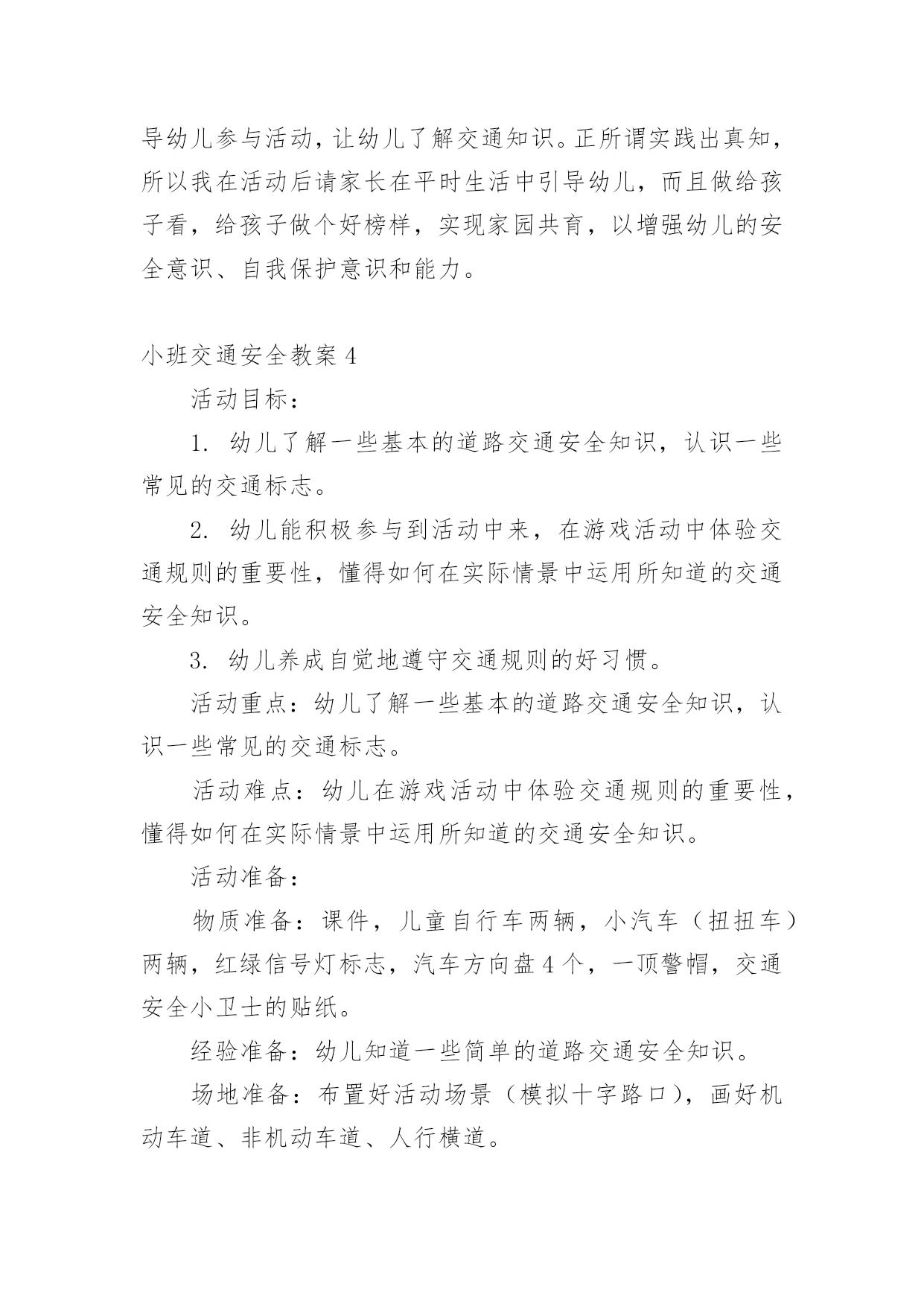 小班交通安全教案小班交通安全教案精选15篇作为一位杰出的教职工,往往需要进行教案编写工作,教案是保证教学取得成功、提高教学质量的基本条件。那么优秀的教案是什么样的呢?下面是小编收集整理的小班交通安全教案,欢迎大家分享。小班交通安全教案1活动目标:1、让幼儿了解一些基本的交通安全知识,知道红灯停,绿灯行的'道理。2、知道过马路时要注意自己的安全,让幼儿知道不走斑马线的危险性。3、让幼儿学会念儿歌,进一步培养幼儿的幼儿的语言表达能力。活动准备:1、图片红绿灯、斑马线2、儿歌《交通灯》活动过程:1、手指游戏,稳定幼儿情绪。"小朋友们伸出小手,跟老师一起玩个手指游戏好不好?"2、谈话,引入主题。"小朋友们知道怎样过马路吗?过马路时应该注意些什么?"(幼儿讨论)3、出示图片,提高幼儿兴趣。"我们小班小朋友太乖了,老师让你们看以些图片好不好?想不想看?小朋友们把小眼睛闭上,老师把小图片请出来,3,2,1,好了,睁开小眼睛。"4、引导幼儿认识红绿灯"小班小朋友真棒,老师来告诉小朋友,这个是红绿灯,小朋友们跟爸爸妈妈上街时候可以看一看,马路上的十字路口就有了。"5、引导幼儿讨论"我们小班小朋友那么聪明,那么,你们知道要怎样看红绿灯吗?"(幼儿讨论)6、讲解怎样安全过马路"小朋友说街上车多不多?危不危险?所以小朋友们一定要知道怎样看红绿灯是不是。那小朋友们要张开小嘴巴跟老师学了好不好。""红灯停(出示图片红灯),绿灯行(出示图片绿灯)。"7、延伸"小朋友跟爸爸妈妈上街时候还要注意些什么呀?"小班交通安全教案2活动目的:1、教幼儿学习一些交通规则,认识一些交通安全标志。2、幼儿能从小养成遵守交通规则的习惯。活动准备:情景图片五张。红绿灯标志各一张,交通标志图五张。(一)、小学生交通安全教育教案范文(三篇)(二)、高中交通安全教育班会教案设计范文(三)、学校交通安全应急预案范文(三篇)(四)、小学生交通安全会议记录模板范文(两篇)(五)、小学生交通安全教育主题班会记录(两篇)(六)、幼儿园小班交通安全教案安全过马路活动反思范文(七)、幼儿园小班交通安全活动教案策划(五篇)(八)、幼儿园小班交通安全教案设计(四篇)(九)、交通安全事故心得体会范文(三篇)(十)、幼儿园大班交通安全教案设计(三篇)活动过程:一、猜谜语,导入新课。红绿灯和斑马线,可结合班内墙上的斑马线图案介绍斑马线的作用。二、结合情景图片,学习交通规则。1、幼儿自由举手回答,自己还知道哪些交通规则?2、幼儿说出来的可结合图片讲解,没想到的`出示图片,说说图片上的幼儿做的对不对,应该怎样做才是遵守交通规则。三、认识交通安全标志。出示图片,请幼儿猜猜它表示什么?四、学儿歌记交通规则儿歌:交通安全歌红灯停,绿灯行,黄灯请你准备好。天桥地道人行道,横穿马路离不了。头手不出车窗外,不在路上玩游戏。交通规则很重要,我们把它记得牢。五、红绿灯和小司机请两名小朋友,一人扮演红灯,一人扮演绿灯,其他小朋友为小司机,看哪位小司机遵守交通规则。小班交通安全教案3一、活动目标:1、了解信号灯、斑马线、天桥等交通设施的功能,能遵守基本的交通规则,在交通设施的帮助下安全通行。2、能在游戏中巩固基本的交通规则。3、初步学习用对唱的方式演唱歌曲。4、在学习歌表演的基础上,结合游戏情节,注意随着音乐的变化而变换动作。二、活动准备:1、信号灯、斑马线、天桥图卡。2、在教室里布置道路场景,包括若干辆小汽车、用纸画出的斑马线、信号灯、用平衡木充当过街天桥。3、相关图片若干。三、活动过程:1、出示图片,唤起幼儿已有经验,导入活动。(1)小朋友们,这是什么?你在哪里看见过这些东西?(2)这些都是在马路上经常看到的东西,他们可以帮助和保护人们安全通行,叫做交通设施。2、使用道具布置道路场景,引导幼儿观看情景表演,了解常见交通设施的功能。爸爸送丫丫去幼儿园,他们一路上会经过哪些交通设施呢?小朋友,一起来看一看吧。(1)在情景表演中了解信号灯和斑马线的作用。爸爸和丫丫站在那路边,他们想过马路。马路对面有个信号灯,这个信号灯是帮助我们过马路的',他会告诉我们红灯停,绿灯行,黄灯亮了等一等。(2)绿灯亮啦可以走了,等等你看地上有什么?好多白线好像斑马身上的花纹一样。这就是斑马线。"条条斑马线,连着路两边,过街线内走,大家才安全。是保护我们安全通行的,我们一起走斑马线过马路吧。"(3)没有斑马线怎么过马路呢?你看,这是天桥,它使行人从车辆的上面通行,避开了车辆,避免了被车撞到的危险,所以天桥也是保护我们安全的交通设施。"空中一座大桥,横跨马路架牢,行人桥上走过,汽车桥下奔跑。"3、邀请幼儿扮演行人在情境中游戏,参与表演。教学反思设计这个活动时,我首先根据小班幼儿的已有生活经验与认知发展水平,将目标定位为:了解行人在马路上应该遵守的一些交通