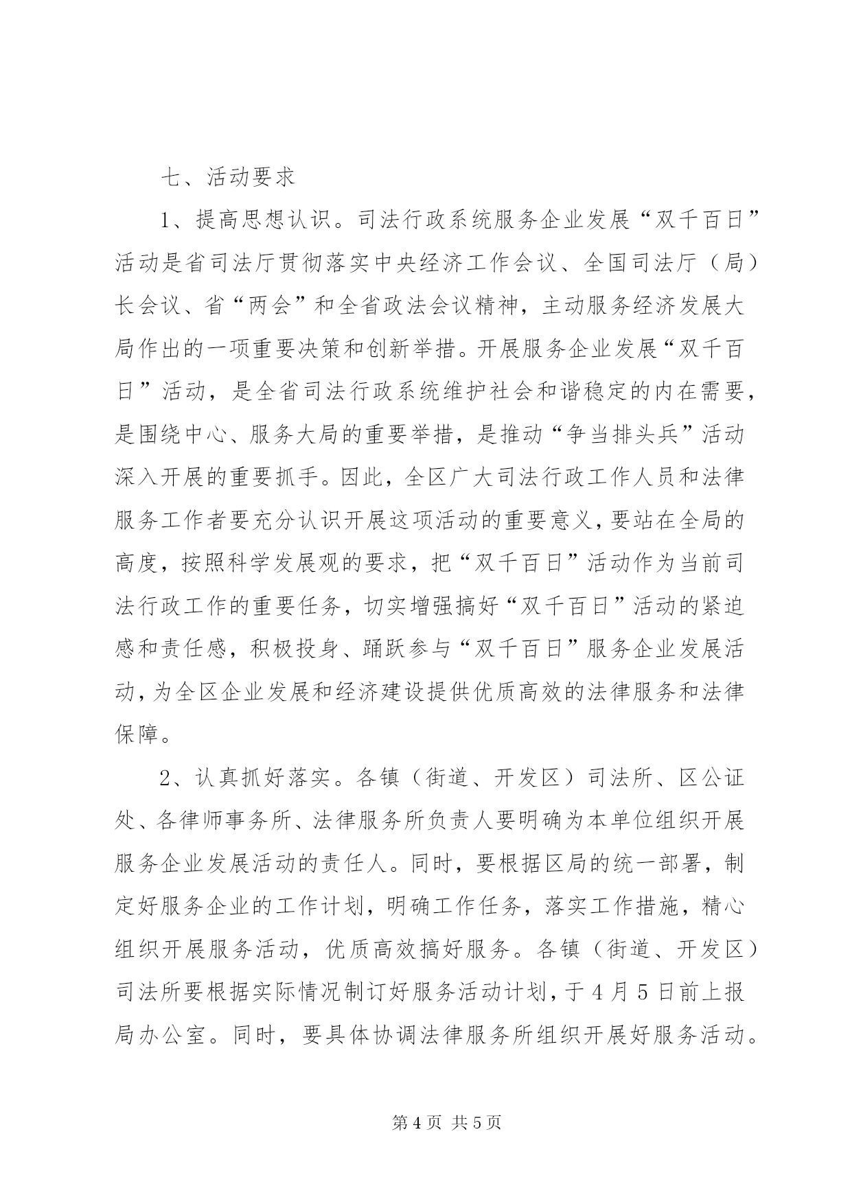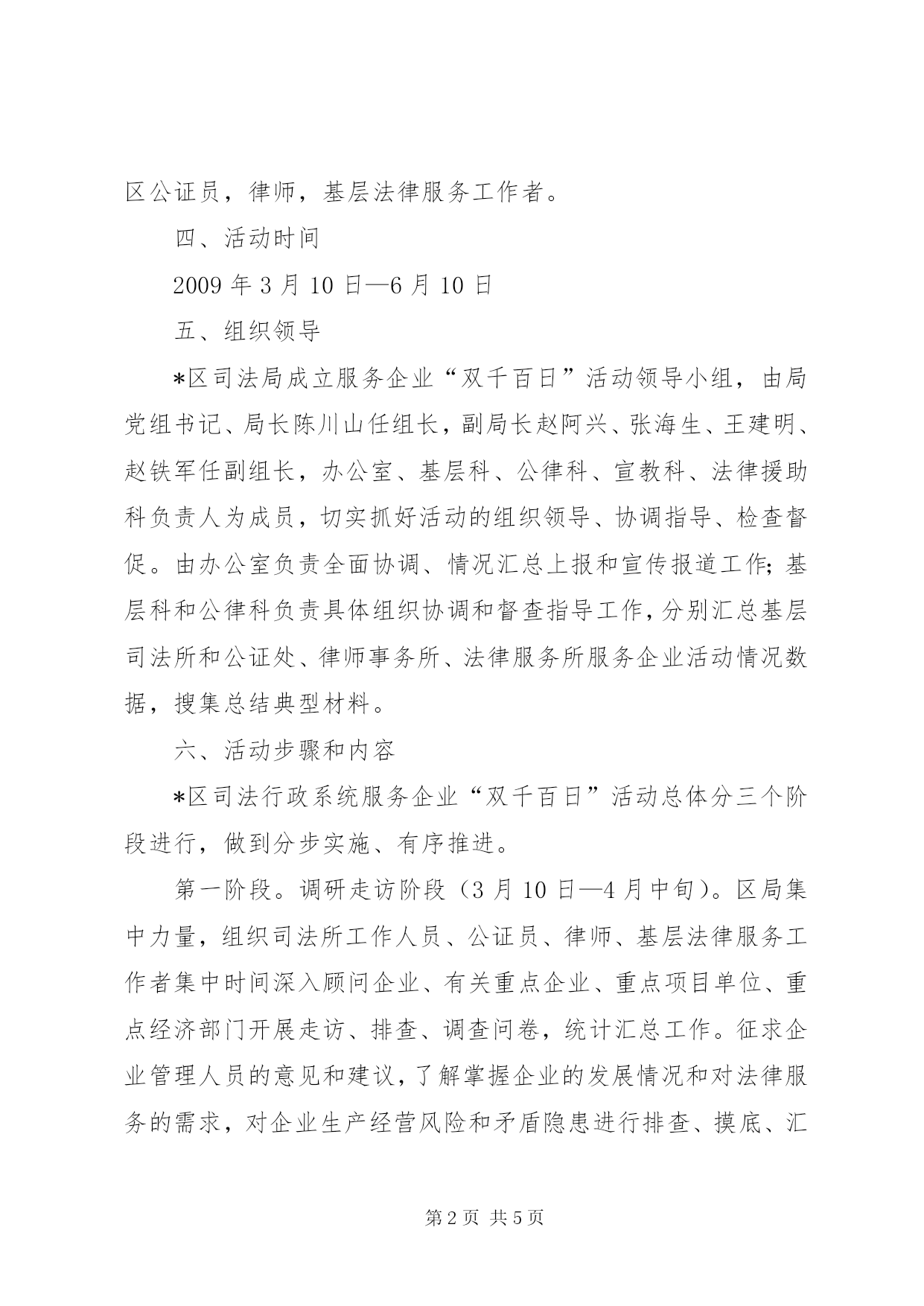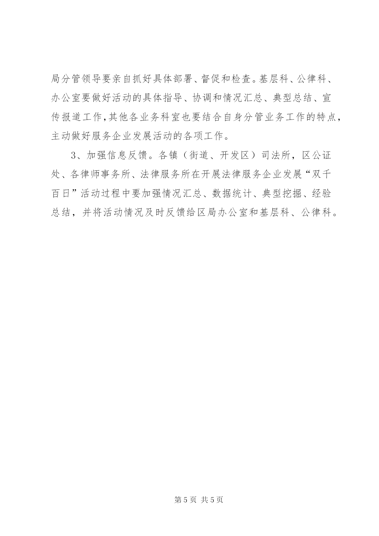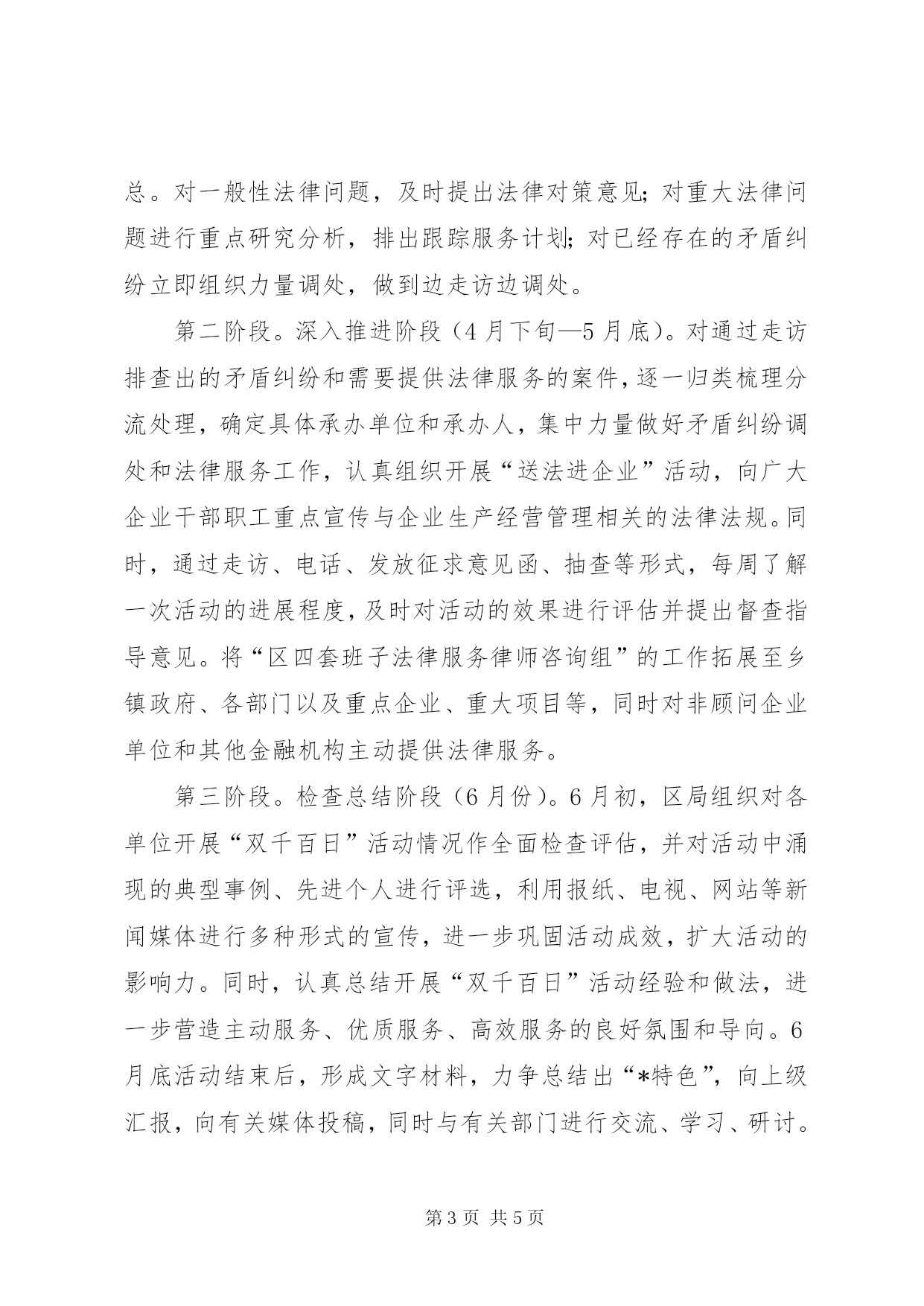 第PAGE\*Arabic\*MERGEFORMAT5页共NUMPAGES\*MERGEFORMAT5页司法行政服务企业发展活动意见一、指导思想按照“围绕中心,服务大局,维护稳定,促进发展”的要求,积极主动地在我区企业中开展调查研究、矛盾排查、纠纷调处和法律服务专项活动,为应对金融危机给企业带来的影响,进一步加大对企业的全方位法律服务力度,主动为企业献计献策,保驾护航,排忧解难,努力减少影响企业稳定和经济发展的不利因素,最大限度地防范因企业生产经营风险而引发的群体性事件的发生,为促进我区经济平稳发展做出新贡献。二、主要任务1、宣传法制。开展法制宣传,认真组织开展送法进企业活动,进一步增强广大企业经营管理人员和职工的法律意识,促进依法经营管理,依法处理矛盾纠纷,依法维护权益。2、化解矛盾。开展纠纷排查,认真组织排查及时化解全区各类企业当前在生产经营过程中出现的矛盾纠纷,排除纠纷隐患,为企业创造和谐稳定的发展环境。3、法律护航。开展法律服务,认真组织公证员、律师、基层法律服务工作者积极为企业提供全方位优质高效的法律服务,当好法律参谋把好法律关口,为企业发展排忧解难,保驾护航。三、参与人员区司法局机关、各镇(街道、开发区)司法所工作人员,全区公证员,律师,基层法律服务工作者。四、活动时间2009年3月10日—6月10日五、组织领导*区司法局成立服务企业“双千百日”活动领导小组,由局党组书记、局长陈川山任组长,副局长赵阿兴、张海生、王建明、赵铁军任副组长,办公室、基层科、公律科、宣教科、法律援助科负责人为成员,切实抓好活动的组织领导、协调指导、检查督促。由办公室负责全面协调、情况汇总上报和宣传报道工作;基层科和公律科负责具体组织协调和督查指导工作,分别汇总基层司法所和公证处、律师事务所、法律服务所服务企业活动情况数据,搜集总结典型材料。六、活动步骤和内容*区司法行政系统服务企业“双千百日”活动总体分三个阶段进行,做到分步实施、有序推进。第一阶段。调研走访阶段(3月10日—4月中旬)。区局集中力量,组织司法所工作人员、公证员、律师、基层法律服务工作者集中时间深入顾问企业、有关重点企业、重点项目单位、重点经济部门开展走访、排查、调查问卷,统计汇总工作。征求企业管理人员的意见和建议,了解掌握企业的发展情况和对法律服务的需求,对企业生产经营风险和矛盾隐患进行排查、摸底、汇总。对一般性法律问题,及时提出法律对策意见;对重大法律问题进行重点研究分析,排出跟踪服务计划;对已经存在的矛盾纠纷立即组织力量调处,做到边走访边调处。第二阶段。深入推进阶段(4月下旬—5月底)。对通过走访排查出的矛盾纠纷和需要提供法律服务的案件,逐一归类梳理分流处理,确定具体承办单位和承办人,集中力量做好矛盾纠纷调处和法律服务工作,认真组织开展“送法进企业”活动,向广大企业干部职工重点宣传与企业生产经营管理相关的法律法规。同时,通过走访、电话、发放征求意见函、抽查等形式,每周了解一次活动的进展程度,及时对活动的效果进行评估并提出督查指导意见。将“区四套班子法律服务律师咨询组”的工作拓展至乡镇政府、各部门以及重点企业、重大项目等,同时对非顾问企业单位和其他金融机构主动提供法律服务。第三阶段。检查总结阶段(6月份)。6月初,区局组织对各单位开展“双千百日”活动情况作全面检查评估,并对活动中涌现的典型事例、先进个人进行评选,利用报纸、电视、网站等新闻媒体进行多种形式的宣传,进一步巩固活动成效,扩大活动的影响力。同时,认真总结开展“双千百日”活动经验和做法,进一步营造主动服务、优质服务、高效服务的良好氛围和导向。6月底活动结束后,形成文字材料,力争总结出“*特色”,向上级汇报,向有关媒体投稿,同时与有关部门进行交流、学习、研讨。七、活动要求1、提高思想认识。司法行政系统服务企业发展“双千百日”活动是省司法厅贯彻落实中央经济工作会议、全国司法厅(局)长会议、省“两会”和全省政法会议精神,主动服务经济发展大局作出的一项重要决策和创新举措。开展服务企业发展“双千百日”活动,是全省司法行政系统维护社会和谐稳定的内在需要,是围绕中心、服务大局的重要举措,是推动“争当排头兵”活动深入开展的重要抓手。因此,全区广大司法行政工作人员和法律服务工作者要充分认识开展这项活动的重要意义,要站在全局的高度,按照科学发展观的要求,把“双千百日”活动作为当前司法行政工作的重要任务,切实增强搞好“双千百日”活动的紧迫感和责任感,积极投身、踊跃参与“双千百日”服务企业发展活动,为全区企业发展和经济建设提供优质高效的法律服务和法律保障。2、认真抓好落实。各镇(街道、开发区)司法所、区公证处、各律师事务所、法律服务所负责人要明确为本单位组织开展服务企业发展活动的责任人。同时,要根据区局的统一部