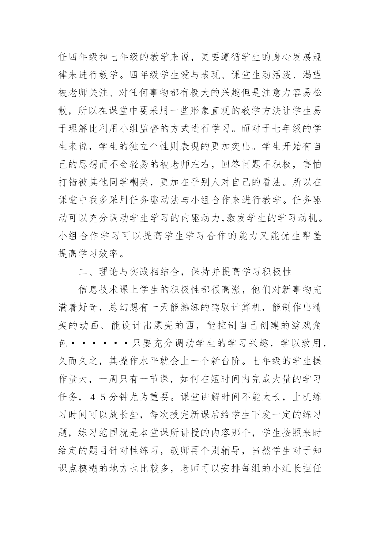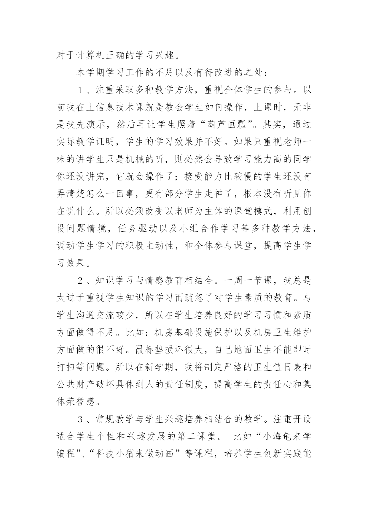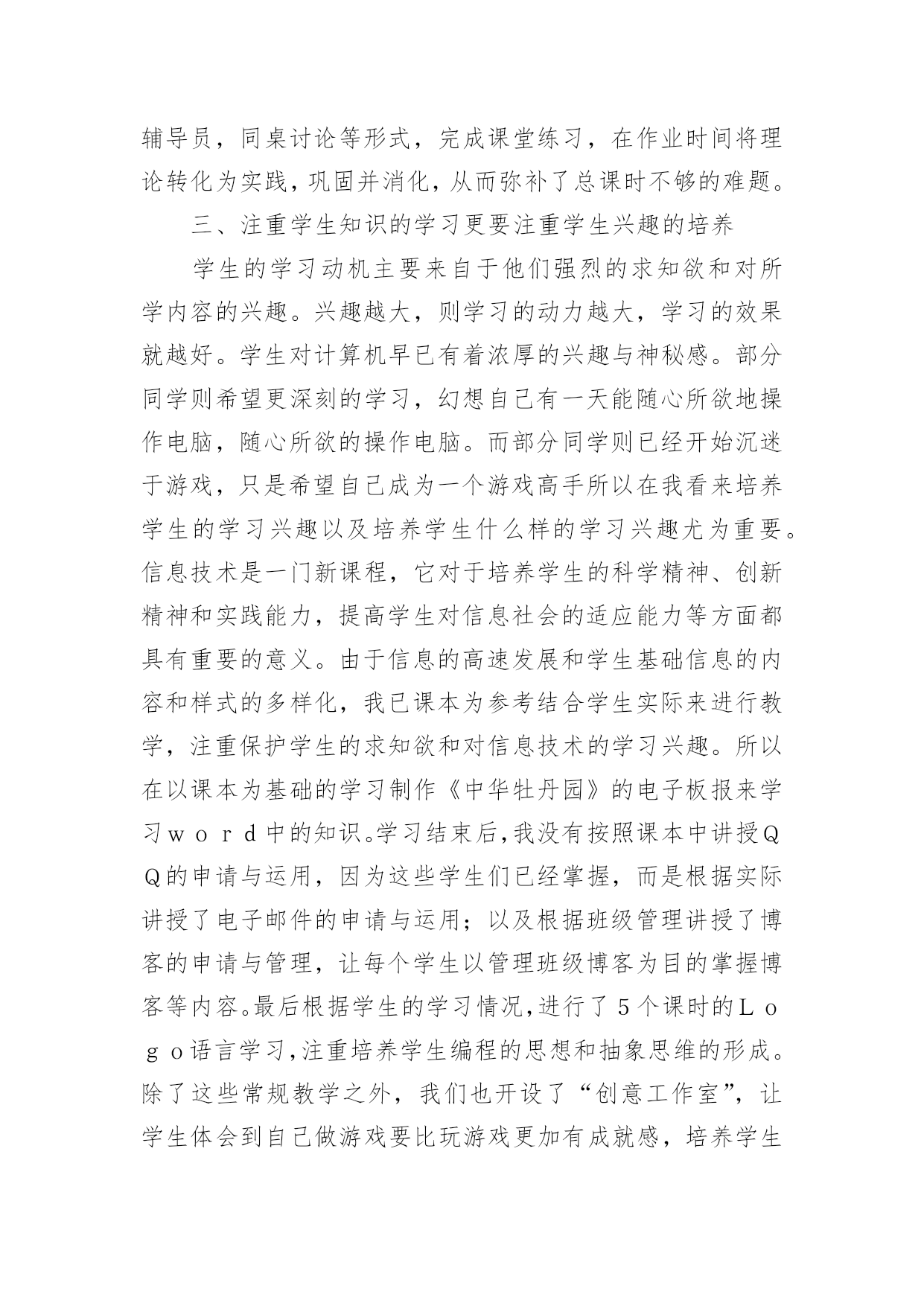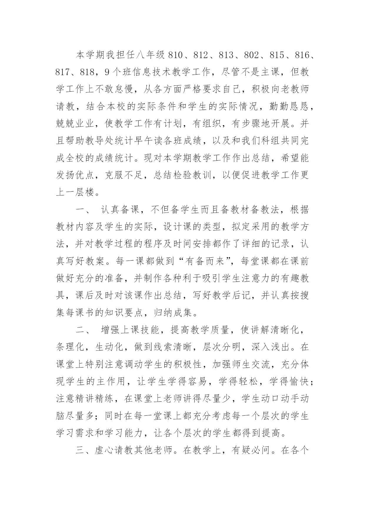 信息技术教学工作总结信息技术教学工作总结集合六篇总结是在一段时间内对学习和工作生活等表现加以总结和概括的一种书面材料,它可使零星的、肤浅的、表面的感性认知上升到全面的、系统的、本质的理性认识上来,让我们一起认真地写一份总结吧。但是总结有什么要求呢?下面是小编帮大家整理的信息技术教学工作总结6篇,仅供参考,希望能够帮助到大家。信息技术教学工作总结篇1信息技术作为一门重要的技术,已经被越来越多的人们所使用。在当今及未来社会,掌握信息技术是对人的一种基本要求,人们都知道不懂得信息技术的人必将被现代社会所淘汰。但是,信息技术课作为一门新课,还很年轻,需要我们教师同行及社会各界人士等不断地关心、支持、探索、交流,使我们的信息技术课教学内容不断更新,教学水平不断提高。本学期在学校的领导下,并结合我校计算机的硬件实际情况开展了信息技术教育、教学工作。学期临近结束,回顾一学期以来的工作,现总结如下1、结合计算机的硬件实际,开展好常规教学。开学初,便结合我校的计算机硬件实际,制定出切实可行的教学计划,并严格按教学计划进行上课。在教学过程中,对具体的教学内容都进行了认真的教学分析,思考在现有计算机软硬件的实际情况下如何实施教学,并写成教案上课。收到较好的效果。2、理论与实践相结合。任何教学活动总离不开理论与实践相结合这条主线。信息技术更是如此。在学习知识阶段,由于学生一周一节课,理论与实践时间差大,四十五分钟时间,基本按“讲—练—讲—练—总结”这个模式,教师利用10分钟左右的时间通过教师主机边讲边操作演示,把每一个知识点视难易程度,进行一至二遍讲解和演示,然后让学生模仿练习15分钟左右,接着教师利用5分钟的时间对学生练习中出现的问题及重点进行第二次讲解,之后学生再练习10至15分钟,最后5分钟时间教师抓住教学重点进行总结,把所学知识点系统起来。每一节课根据教学内容不同,可以有不同的时间安排。这样一路走下来,学生基本上能够掌握所学知识。在教学中,我经常研究学生的思想发展变化,为了提高学生学习信息技术的兴趣,在不影响教学的情况下,我们从光盘上或到其它学校去找了一些有利于学生智力发展的小游戏,把这些游戏在学生完成学习任务后给学生玩,让学生既巩固了所学知识,又提高了学习兴趣,并有助于学生智力发展。经本期实践,取得了很好的效果。学生不但掌握了规定的信息技术知识和达到了规定的操作技能水平,而且还从游戏中学到了许多其它的知识。信息技术课已经成了学生十分喜欢的课程之一。3、教师要不断更新知识、提高自身素质。信息技术领域发展迅速、更新很快,新知识、新产品、新术语几乎天天出现。作为信息技术教师,只有不断地更新自己的知识,不断地提高自身的素质,不断地自我加压,才能将信息知识更流畅地、轻松地、完整地讲授给学生,才能让学生始终走在信息技术知识的前端,跟上不断发展的时代的步伐。4、结合现状,激发学生为强国而学习的信心和决心。我认为,信息技术课,不仅仅是让学生学会几种操作,更重要的是培养学生的一种思想、一种意识,为我国各产业的长足发展营造一种良好的氛围。学生,是未来国家的建设者,如何使将来有更多的有志者为我国的信息技术产业作贡献,这就需要我们教师在教学中不断地把我国信息技术业的现状讲述给学生,让他们知道我国信息技术业在世界上的位5、充分发挥的优势,提高学校办学的信息化发展的水平。作为信息技术教师,应走在学校信息技术发展的前沿,除了搞好信息技术教育教学外我们还担负着许多其它的任务。学校其它学科公开课的课件制作,全由电脑室来承担,本学期帮助其他教师制作了课件,受到了同事们的一致好评。信息技术是一门不断发展的学科,展望学校的发展和学科的发展,我觉得还有许多知识要学,还有许多事情要做。在今后的教育教学工作中,我将更严格要求自己,努力工作,发扬优点,改正缺点,开拓前进,争取取得更大的进步。信息技术教学工作总结篇2本学期我担任八年级810、812、813、802、815、816、817、818,9个班信息技术教学工作,尽管不是主课,但教学工作上不敢怠慢,从各方面严格要求自己,积极向老教师请教,结合本校的实际条件和学生的实际情况,勤勤恳恳,兢兢业业,使教学工作有计划,有组织,有步骤地开展。并且帮助教导处统计早午读各班成绩,以及和我们科组共同完成全校的成绩统计。现对本学期教学工作作出总结,希望能发扬优点,克服不足,总结检验教训,以便促进教学工作更上一层楼。一、认真备课,不但备学生而且备教材备教法,根据教材内容及学生的实际,设计课的类型,拟定采用的教学方法,并对教学过程的程序及时间安排都作了详细的记录,认真写好教案。每一课都做到“有备而来”,每堂课都在课前做好充分的准备,并制作各种利于吸引学生注意力的有趣教具,课后及时对该课作出总结,写好教学后记,并认真按搜集每课书的知识要点,归纳成集。二