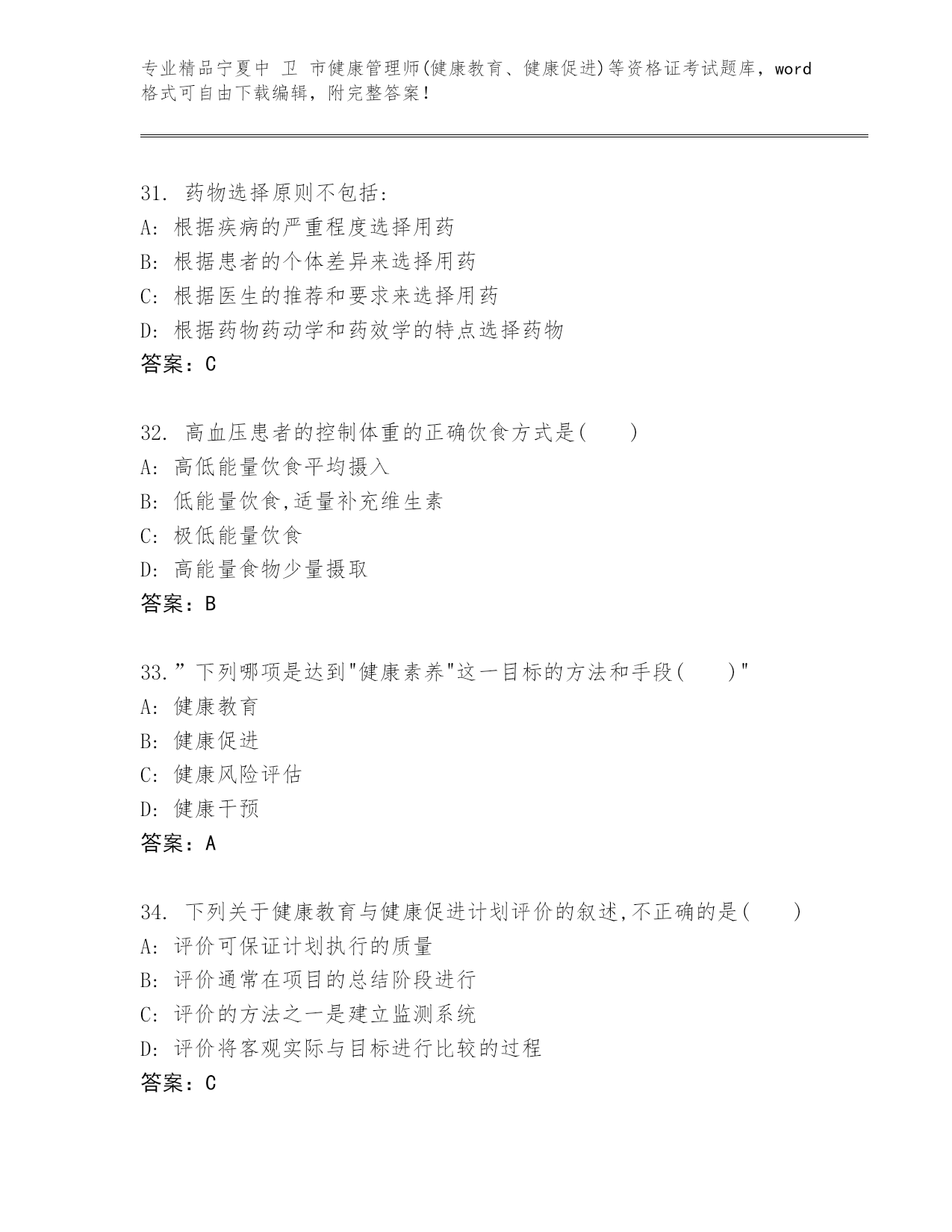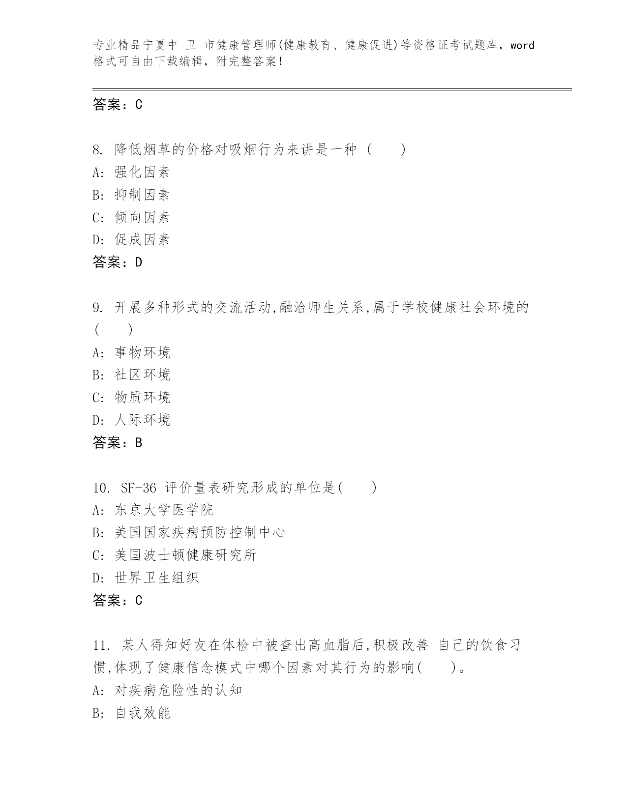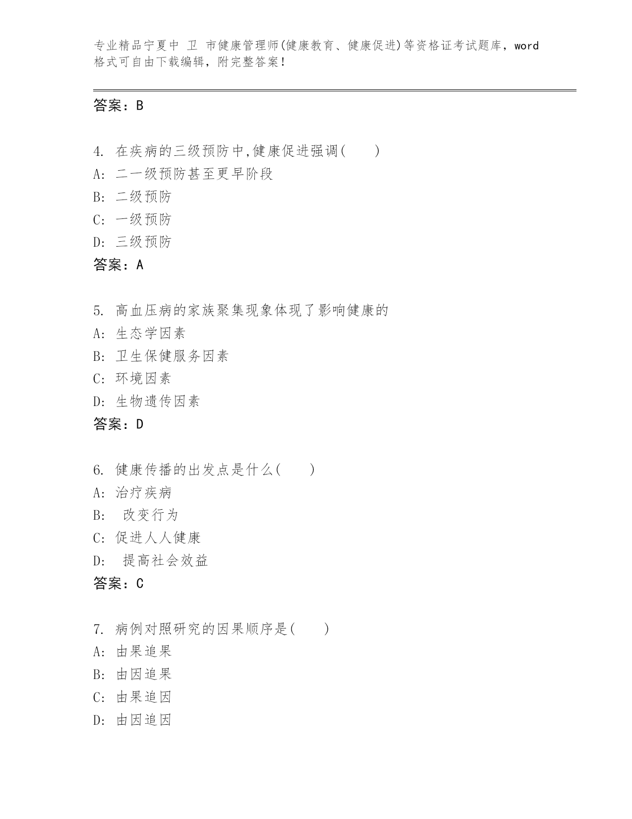 内部培训宁夏中卫市健康管理师(健康教育、健康促进)等资格证考试王牌题库带答案(精练).docx
