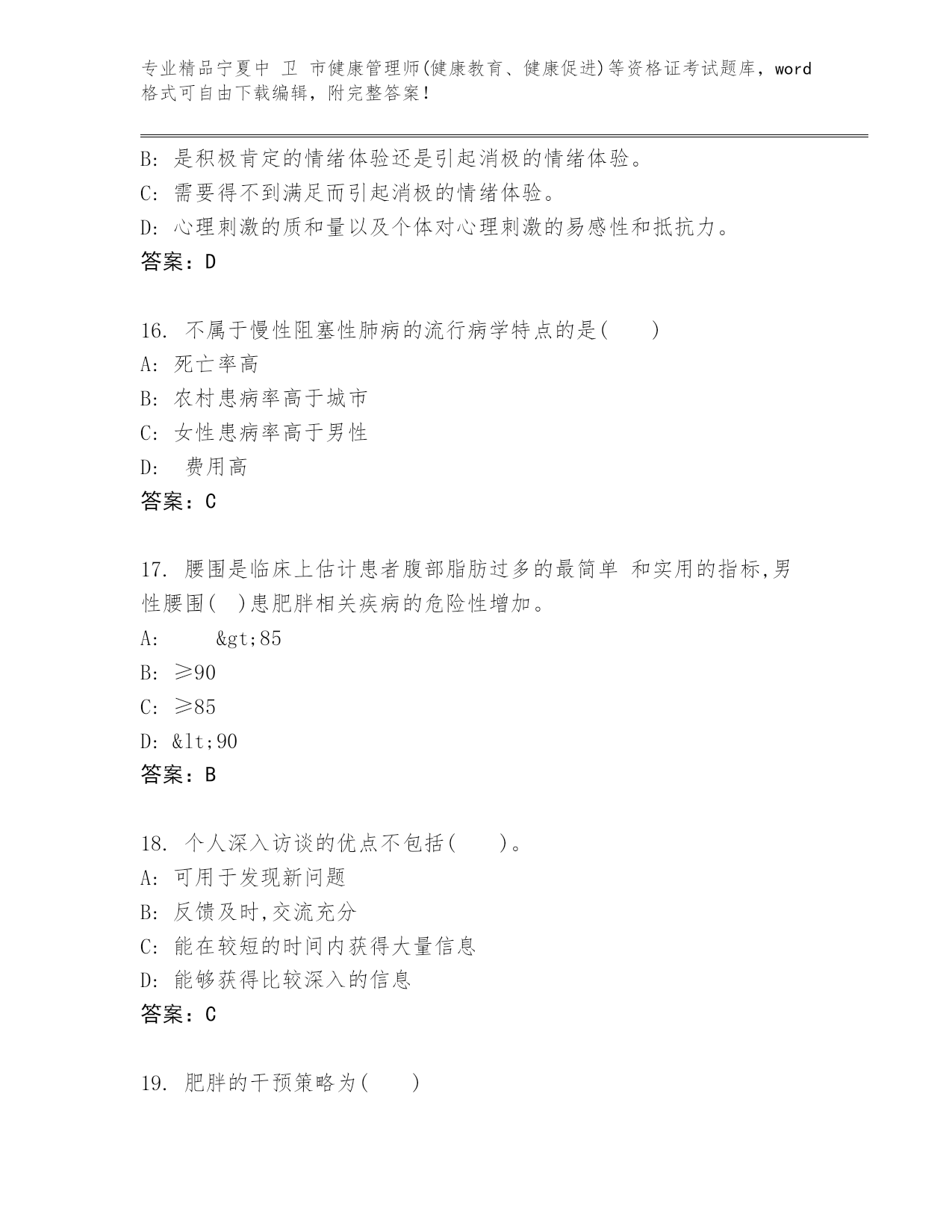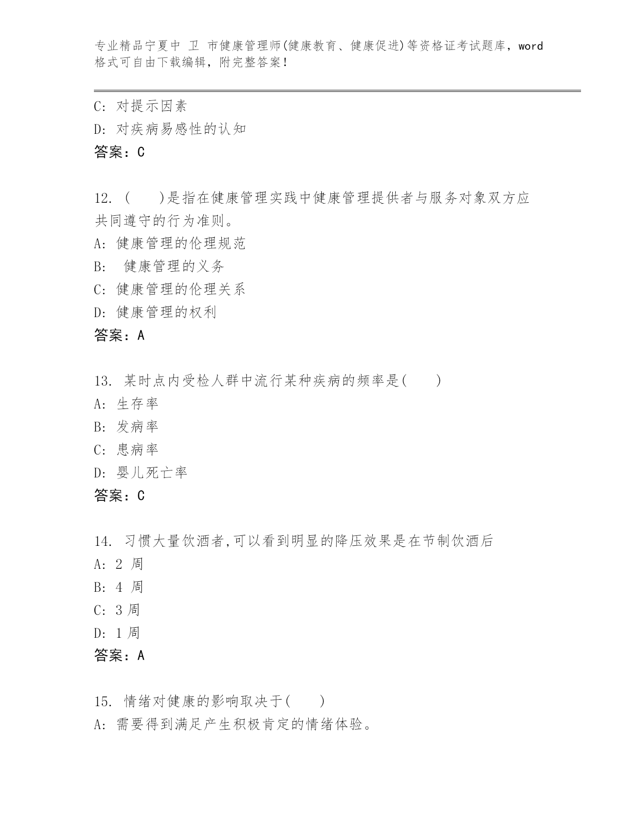 内部培训宁夏中 卫 市健康管理师(健康教育、健康促进)等资格证考试王牌题库带答案(精练)