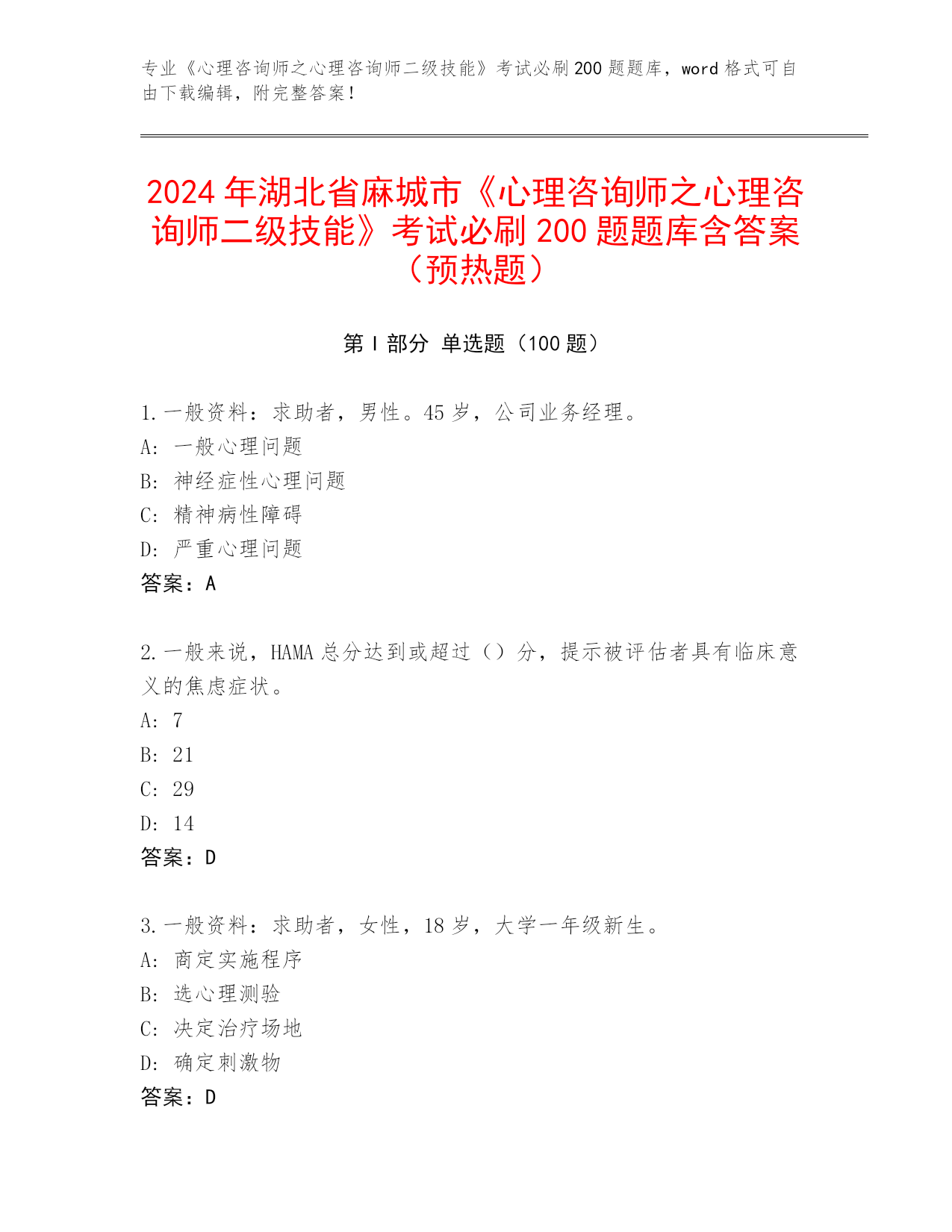 2024年湖北省麻城市《心理咨询师之心理咨询师二级技能》考试必刷200题题库含答案(预热题)