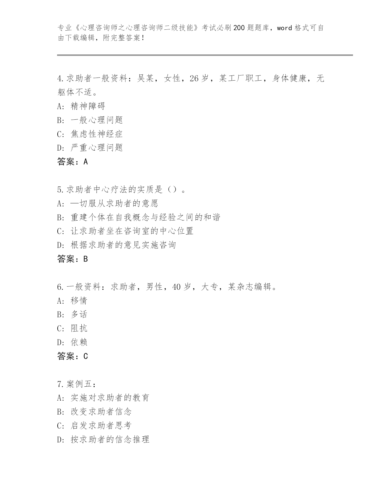 河南省《心理咨询师之心理咨询师二级技能》考试必刷200题真题题库(预热题)