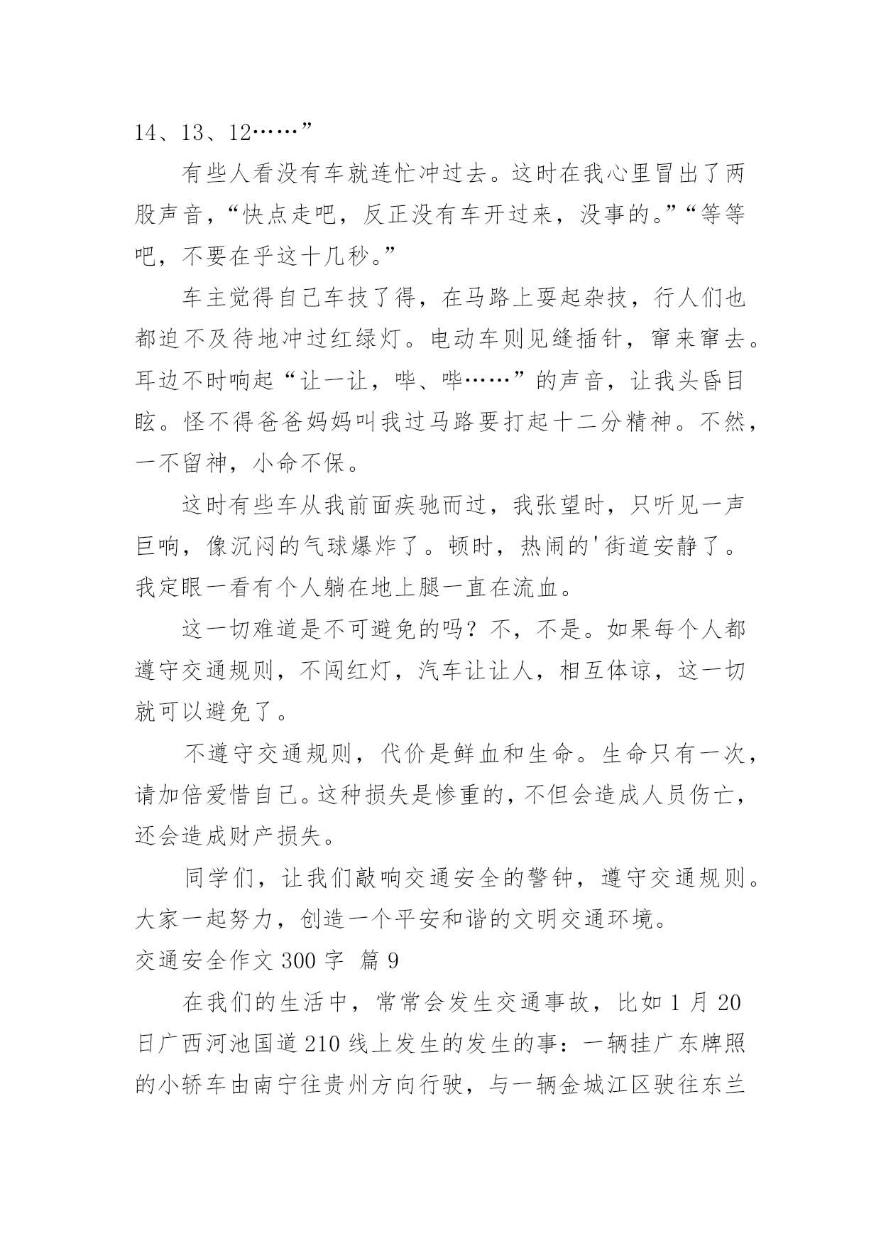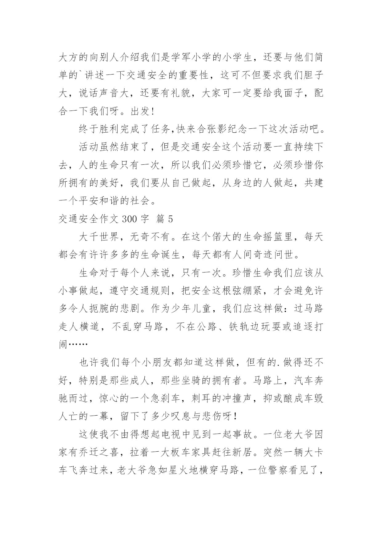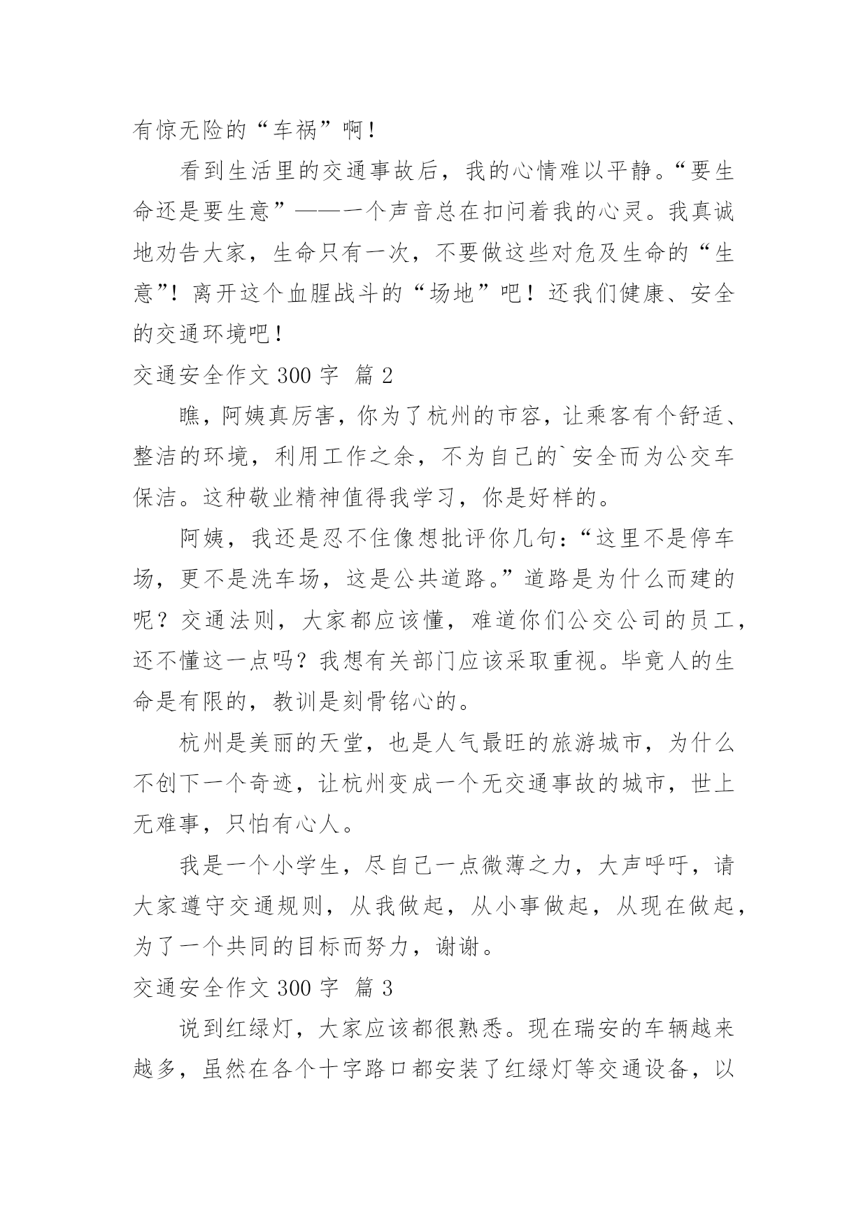 交通安全作文300字交通安全作文300字汇总[9篇]无论是在学校还是在社会中,大家都不可避免地会接触到作文吧,作文是经过人的思想考虑和语言组织,通过文字来表达一个主题意义的记叙方法。那么你有了解过作文吗?下面是小编精心整理的交通安全作文300字10篇,仅供参考,欢迎大家阅读。交通安全作文300字篇1“要生意还是要生命”这一个宣传口号醒目地摆在我眼前,接着,是一幅幅让人不安的图片。瞧!一个身穿红外套,手中拿着毛巾,额头上布满了皱纹的中年妇女,在车水马龙的公路上穿梭着,离后面的汽车距离不到5厘米,所谓天有不不测风云,一旦发生交通事故,也许她就会离开这个世界!这位妇女,真得要多加小心啊!我劝你不要玩这种把生命做赌博的“游戏”!自然而然,令我回想起放学的路上发生的一件事。一个驼着背,腰弯成九十度的老妇女引起我的注意。只见她那斑斑白发中依稀穿插着几根黑发,她身穿一件破旧的背心,手里拿着一个碗,瘦弱的'身影穿梭在川流不息的“汽车天地”中,突然,一辆小轿车风似的驶向她那,我捂着脸,生怕自己看到血腥的一幕,爸爸猛地拍了拍我,我长舒了口气:“没事!”我缓缓地放下手,原来,车主及时停了车,真是一场有惊无险的“车祸”啊!看到生活里的交通事故后,我的心情难以平静。“要生命还是要生意”——一个声音总在扣问着我的心灵。我真诚地劝告大家,生命只有一次,不要做这些对危及生命的“生意”!离开这个血腥战斗的“场地”吧!还我们健康、安全的交通环境吧!交通安全作文300字篇2瞧,阿姨真厉害,你为了杭州的市容,让乘客有个舒适、整洁的环境,利用工作之余,不为自己的`安全而为公交车保洁。这种敬业精神值得我学习,你是好样的。阿姨,我还是忍不住像想批评你几句:“这里不是停车场,更不是洗车场,这是公共道路。”道路是为什么而建的呢?交通法则,大家都应该懂,难道你们公交公司的员工,还不懂这一点吗?我想有关部门应该采取重视。毕竟人的生命是有限的,教训是刻骨铭心的。杭州是美丽的天堂,也是人气最旺的旅游城市,为什么不创下一个奇迹,让杭州变成一个无交通事故的城市,世上无难事,只怕有心人。我是一个小学生,尽自己一点微薄之力,大声呼吁,请大家遵守交通规则,从我做起,从小事做起,从现在做起,为了一个共同的目标而努力,谢谢。交通安全作文300字篇3说到红绿灯,大家应该都很熟悉。现在瑞安的车辆越来越多,虽然在各个十字路口都安装了红绿灯等交通设备,以保证车辆顺利通行和行人安全。但是现有的红绿灯的绿灯通行和红灯停止时间是固定不变的,即东西方向没有车辆通行,南北方向车辆也要等待30秒甚至更长时间的`红灯,特别是在上学和放学等交通高峰时间,有的接送的家长为了抢时间,时常发生闯红灯现象,导致交通堵塞,容易造成交通事故。我想到了一种可以根据车流量自动调节的红绿灯——交通信号识别控制仪,它是一种智能交通信号控制设备,它能根据每个车道车辆的多少确定绿灯放行时间的长短,一般按照4秒通过一辆车计算,系统可以自动检测有几辆车,缩短了等红灯的时间,也避免了闯红灯等违章行为,以确保交通安全。交通安全作文300字篇4我们七彩阳光假日小分队,积极响应学校关于”红领巾共建平安浙江“活动,在西溪湿地博物馆组织一次向大家倡议交通安全的活动。非常有意义。大家快来看看我们的活动吧。快快坐下,仔细聆听小分队大组长应孜妈妈给我们讲平安活动安排以及交通安全注意事项,我们一个个竖着小耳朵,听的可认真了。听完了,大组长将交通安全的倡仪书发给我们,我们要仔细再看看,记记住,等会要发给大家,让他们与我们一起遵守交通安全,文明出行呢。这是我们的交通安全倡议书,是不是很全面呀,开始要向大家发倡议书,这对我们来说可是不小挑战,我们首先要大方的向别人介绍我们是学军小学的小学生,还要与他们简单的`讲述一下交通安全的重要性,这可不但要求我们胆子大,说话声音大,还要有礼貌,大家可一定要给我面子,配合一下我们呀。出发!终于胜利完成了任务,快来合张影纪念一下这次活动吧。活动虽然结束了,但是交通安全这个活动要一直持续下去,人的生命只有一次,所以我们必须珍惜它,必须珍惜你所拥有的美好,我们要从自己做起,从身边的人做起,共建一个平安和谐的社会。交通安全作文300字篇5大千世界,无奇不有。在这个偌大的生命摇篮里,每天都会有许许多多的生命诞生,每天都有人间奇迹问世。生命对于每个人来说,只有一次。珍惜生命我们应该从小事做起,遵守交通规则,把安全这根弦绷紧,才会避免许多令人扼腕的悲剧。作为少年儿童,我们应这样做:过马路走人横道,不乱穿马路,不在公路、铁轨边玩耍或追逐打闹……也许我们每个小朋友都知道这样做,但有的.做得还不好,特别是那些成人,那些坐骑的拥有者。马路上,汽车奔驰而过,惊心的一个急刹车,刺耳的冲撞声,抑或酿成车毁人亡的一幕,留下了多少叹息与悲伤呀!这使我不由得想起电视中