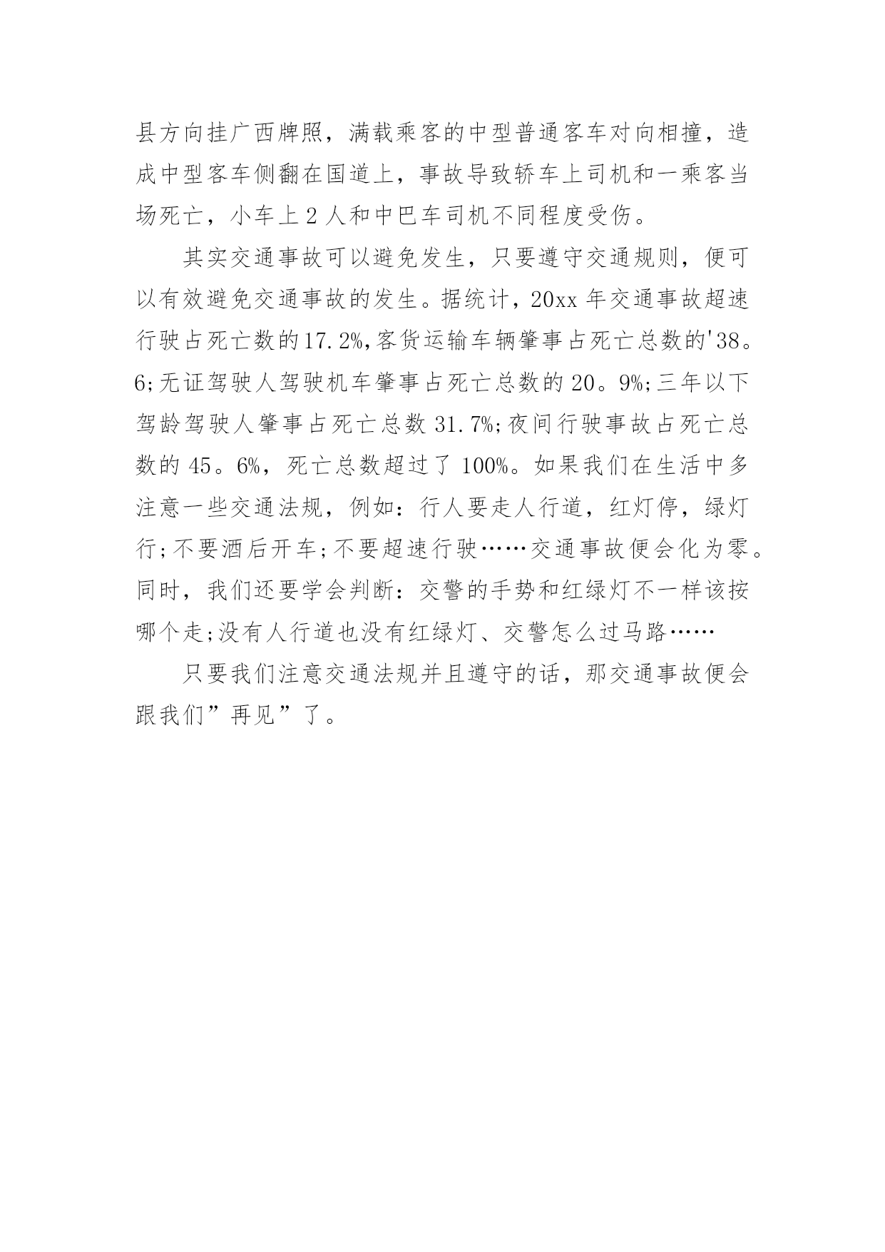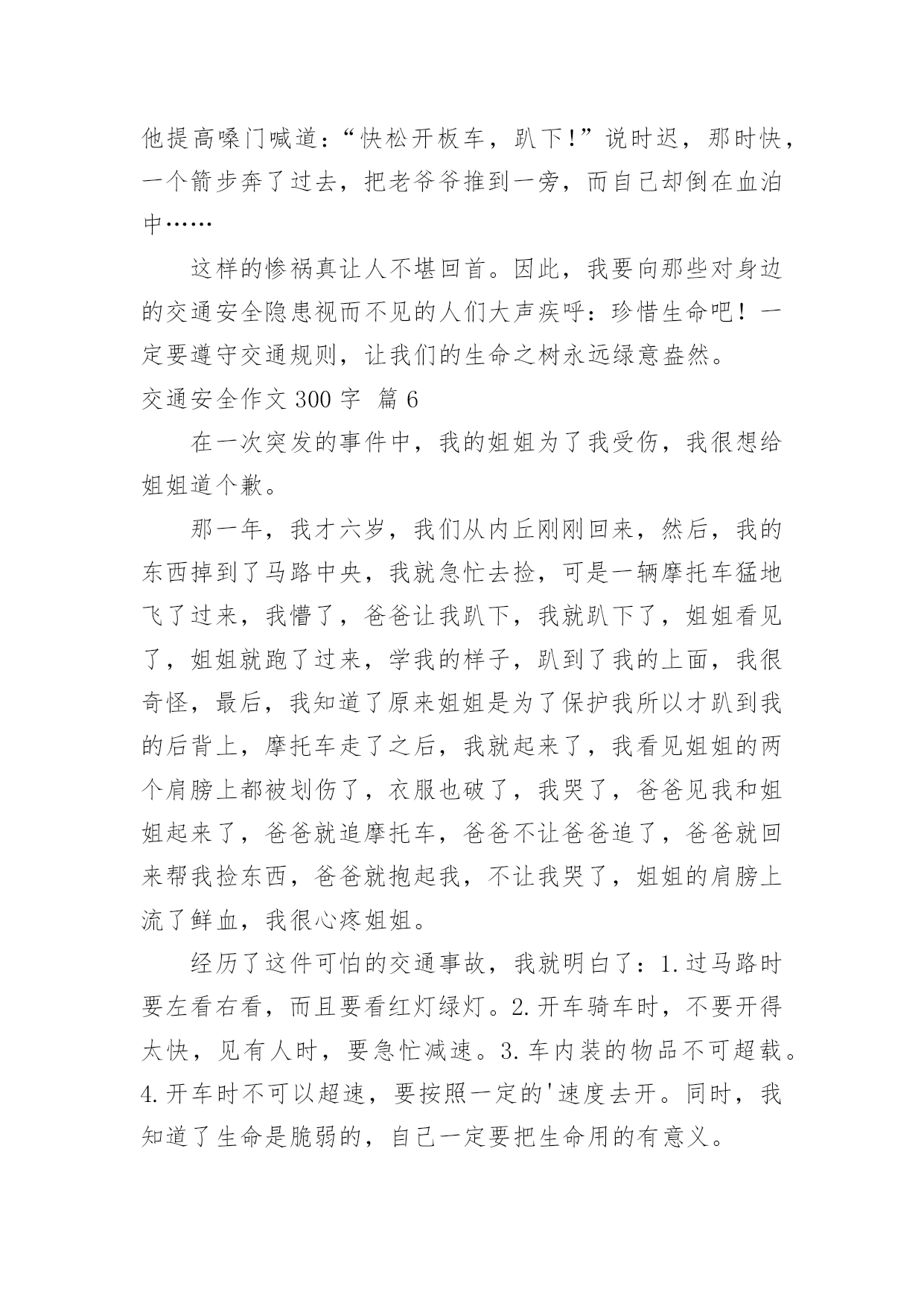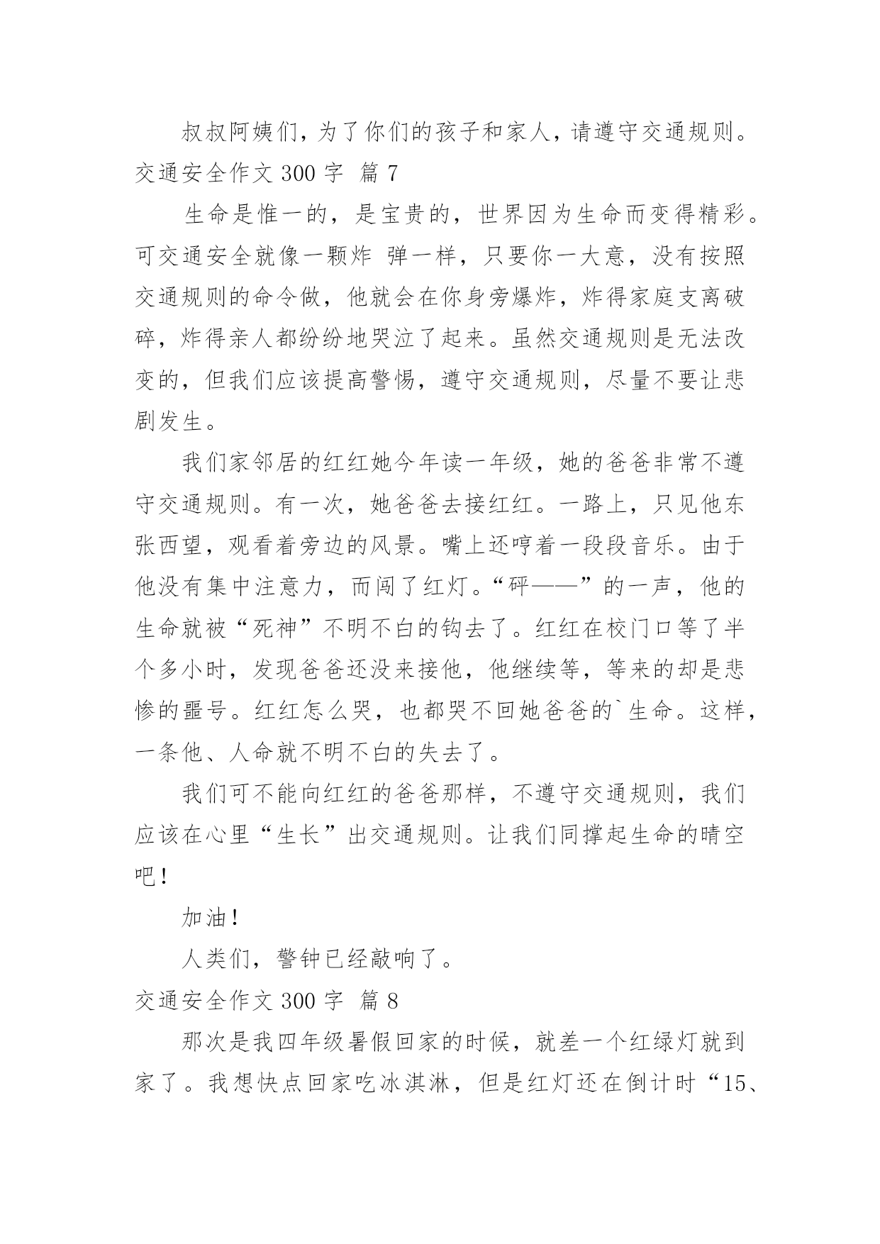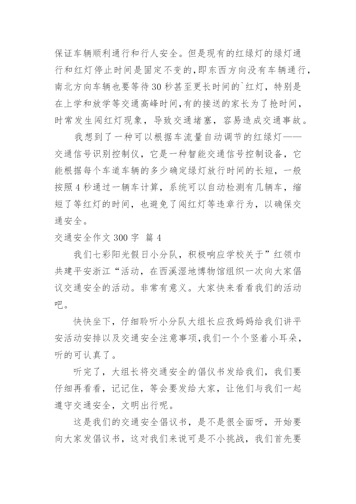 交通安全作文300字交通安全作文300字汇总[9篇]无论是在学校还是在社会中,大家都不可避免地会接触到作文吧,作文是经过人的思想考虑和语言组织,通过文字来表达一个主题意义的记叙方法。那么你有了解过作文吗?下面是小编精心整理的交通安全作文300字10篇,仅供参考,欢迎大家阅读。交通安全作文300字篇1“要生意还是要生命”这一个宣传口号醒目地摆在我眼前,接着,是一幅幅让人不安的图片。瞧!一个身穿红外套,手中拿着毛巾,额头上布满了皱纹的中年妇女,在车水马龙的公路上穿梭着,离后面的汽车距离不到5厘米,所谓天有不不测风云,一旦发生交通事故,也许她就会离开这个世界!这位妇女,真得要多加小心啊!我劝你不要玩这种把生命做赌博的“游戏”!自然而然,令我回想起放学的路上发生的一件事。一个驼着背,腰弯成九十度的老妇女引起我的注意。只见她那斑斑白发中依稀穿插着几根黑发,她身穿一件破旧的背心,手里拿着一个碗,瘦弱的'身影穿梭在川流不息的“汽车天地”中,突然,一辆小轿车风似的驶向她那,我捂着脸,生怕自己看到血腥的一幕,爸爸猛地拍了拍我,我长舒了口气:“没事!”我缓缓地放下手,原来,车主及时停了车,真是一场有惊无险的“车祸”啊!看到生活里的交通事故后,我的心情难以平静。“要生命还是要生意”——一个声音总在扣问着我的心灵。我真诚地劝告大家,生命只有一次,不要做这些对危及生命的“生意”!离开这个血腥战斗的“场地”吧!还我们健康、安全的交通环境吧!交通安全作文300字篇2瞧,阿姨真厉害,你为了杭州的市容,让乘客有个舒适、整洁的环境,利用工作之余,不为自己的`安全而为公交车保洁。这种敬业精神值得我学习,你是好样的。阿姨,我还是忍不住像想批评你几句:“这里不是停车场,更不是洗车场,这是公共道路。”道路是为什么而建的呢?交通法则,大家都应该懂,难道你们公交公司的员工,还不懂这一点吗?我想有关部门应该采取重视。毕竟人的生命是有限的,教训是刻骨铭心的。杭州是美丽的天堂,也是人气最旺的旅游城市,为什么不创下一个奇迹,让杭州变成一个无交通事故的城市,世上无难事,只怕有心人。我是一个小学生,尽自己一点微薄之力,大声呼吁,请大家遵守交通规则,从我做起,从小事做起,从现在做起,为了一个共同的目标而努力,谢谢。交通安全作文300字篇3说到红绿灯,大家应该都很熟悉。现在瑞安的车辆越来越多,虽然在各个十字路口都安装了红绿灯等交通设备,以保证车辆顺利通行和行人安全。但是现有的红绿灯的绿灯通行和红灯停止时间是固定不变的,即东西方向没有车辆通行,南北方向车辆也要等待30秒甚至更长时间的`红灯,特别是在上学和放学等交通高峰时间,有的接送的家长为了抢时间,时常发生闯红灯现象,导致交通堵塞,容易造成交通事故。我想到了一种可以根据车流量自动调节的红绿灯——交通信号识别控制仪,它是一种智能交通信号控制设备,它能根据每个车道车辆的多少确定绿灯放行时间的长短,一般按照4秒通过一辆车计算,系统可以自动检测有几辆车,缩短了等红灯的时间,也避免了闯红灯等违章行为,以确保交通安全。交通安全作文300字篇4我们七彩阳光假日小分队,积极响应学校关于”红领巾共建平安浙江“活动,在西溪湿地博物馆组织一次向大家倡议交通安全的活动。非常有意义。大家快来看看我们的活动吧。快快坐下,仔细聆听小分队大组长应孜妈妈给我们讲平安活动安排以及交通安全注意事项,我们一个个竖着小耳朵,听的可认真了。听完了,大组长将交通安全的倡仪书发给我们,我们要仔细再看看,记记住,等会要发给大家,让他们与我们一起遵守交通安全,文明出行呢。这是我们的交通安全倡议书,是不是很全面呀,开始要向大家发倡议书,这对我们来说可是不小挑战,我们首先要大方的向别人介绍我们是学军小学的小学生,还要与他们简单的`讲述一下交通安全的重要性,这可不但要求我们胆子大,说话声音大,还要有礼貌,大家可一定要给我面子,配合一下我们呀。出发!终于胜利完成了任务,快来合张影纪念一下这次活动吧。活动虽然结束了,但是交通安全这个活动要一直持续下去,人的生命只有一次,所以我们必须珍惜它,必须珍惜你所拥有的美好,我们要从自己做起,从身边的人做起,共建一个平安和谐的社会。交通安全作文300字篇5大千世界,无奇不有。在这个偌大的生命摇篮里,每天都会有许许多多的生命诞生,每天都有人间奇迹问世。生命对于每个人来说,只有一次。珍惜生命我们应该从小事做起,遵守交通规则,把安全这根弦绷紧,才会避免许多令人扼腕的悲剧。作为少年儿童,我们应这样做:过马路走人横道,不乱穿马路,不在公路、铁轨边玩耍或追逐打闹……也许我们每个小朋友都知道这样做,但有的.做得还不好,特别是那些成人,那些坐骑的拥有者。马路上,汽车奔驰而过,惊心的一个急刹车,刺耳的冲撞声,抑或酿成车毁人亡的一幕,留下了多少叹息与悲伤呀!这使我不由得想起电视中