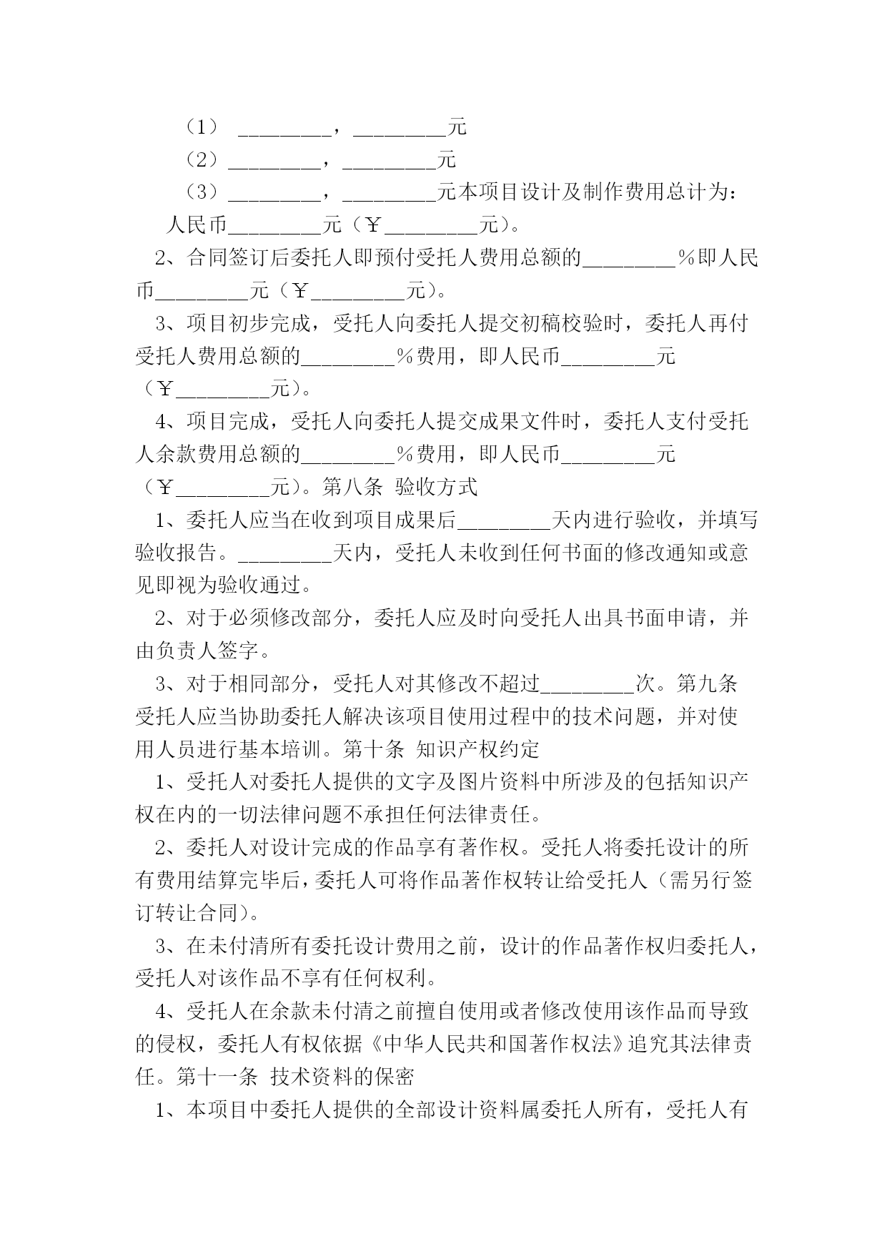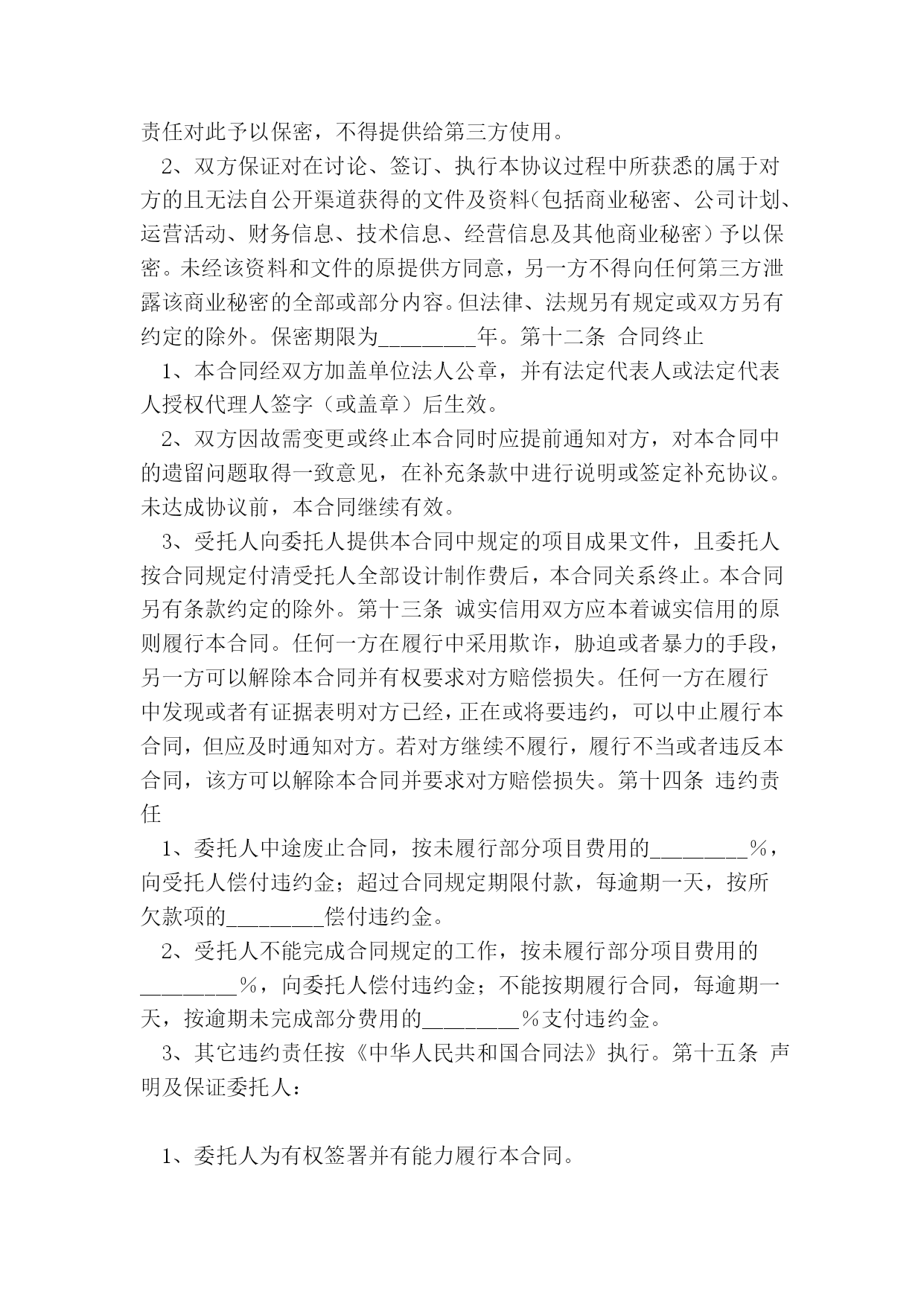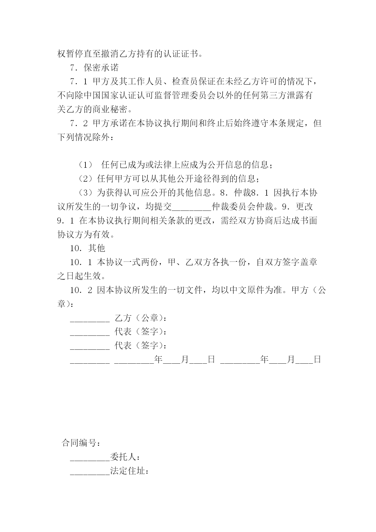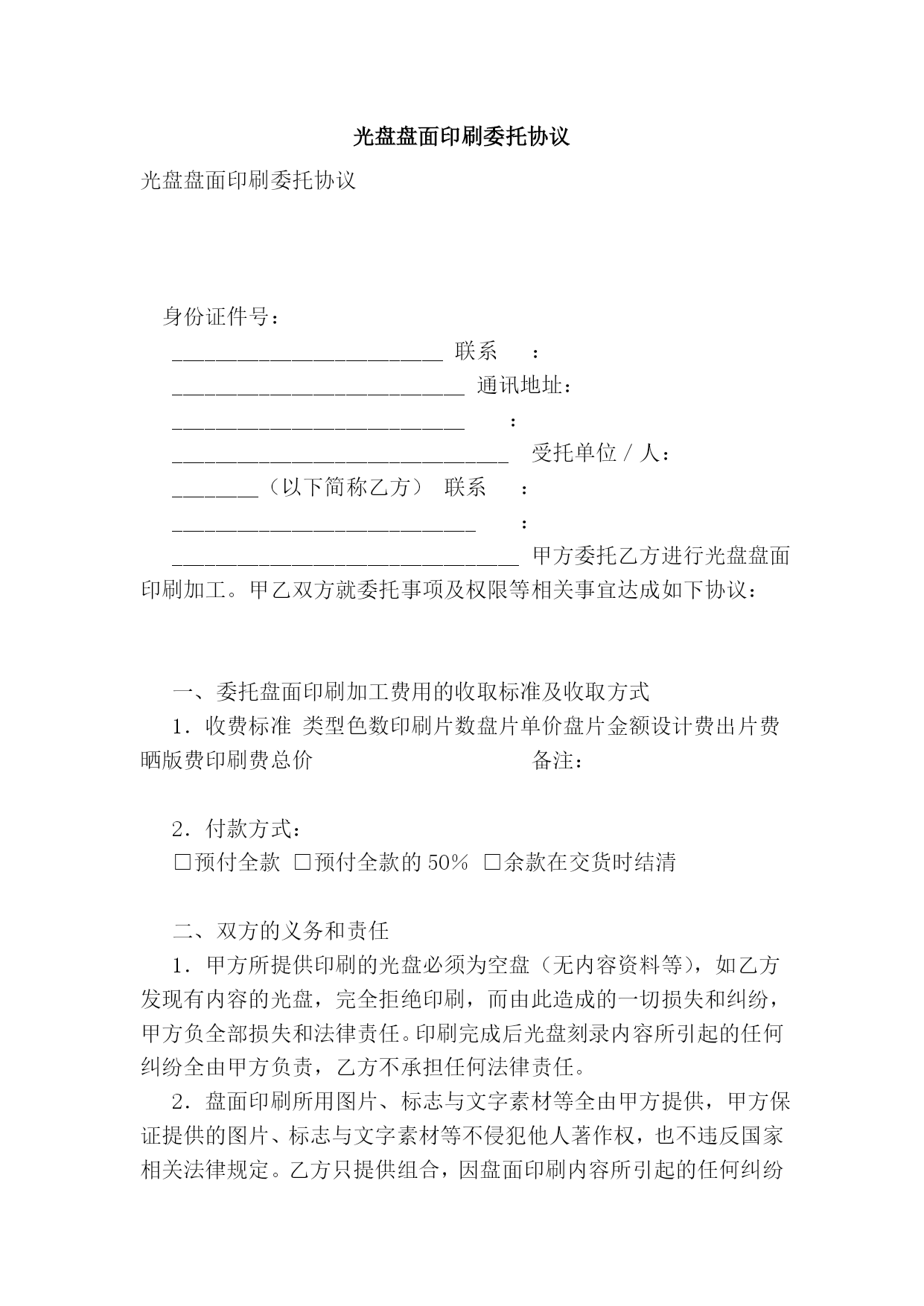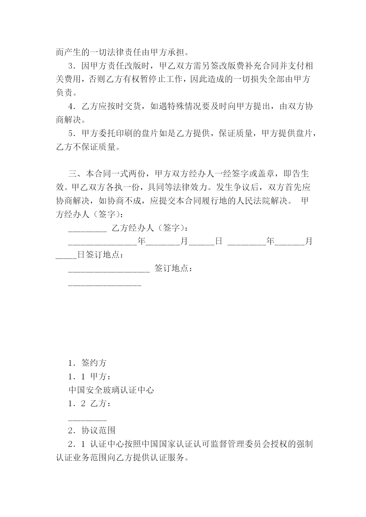 光盘盘面印刷委托协议(完整版)(文档可以直接使用,也可根据实际需要修改使用,可编辑欢迎下载)光盘盘面印刷委托协议光盘盘面印刷委托协议身份证件号:_________________________联系:___________________________通讯地址:___________________________:_______________________________受托单位/人:________(以下简称乙方)联系:____________________________:________________________________甲方委托乙方进行光盘盘面印刷加工。甲乙双方就委托事项及权限等相关事宜达成如下协议:一、委托盘面印刷加工费用的收取标准及收取方式1.收费标准类型色数印刷片数盘片单价盘片金额设计费出片费晒版费印刷费总价备注:2.付款方式:□预付全款□预付全款的50%□余款在交货时结清二、双方的义务和责任1.甲方所提供印刷的光盘必须为空盘(无内容资料等),如乙方发现有内容的光盘,完全拒绝印刷,而由此造成的一切损失和纠纷,甲方负全部损失和法律责任。印刷完成后光盘刻录内容所引起的任何纠纷全由甲方负责,乙方不承担任何法律责任。2.盘面印刷所用图片、标志与文字素材等全由甲方提供,甲方保证提供的图片、标志与文字素材等不侵犯他人著作权,也不违反国家相关法律规定。乙方只提供组合,因盘面印刷内容所引起的任何纠纷而产生的一切法律责任由甲方承担。3.因甲方责任改版时,甲乙双方需另签改版费补充合同并支付相关费用,否则乙方有权暂停止工作,因此造成的一切损失全部由甲方负责。4.乙方应按时交货,如遇特殊情况要及时向甲方提出,由双方协商解决。5.甲方委托印刷的盘片如是乙方提供,保证质量,甲方提供盘片,乙方不保证质量。三、本合同一式两份,甲方双方经办人一经签字或盖章,即告生效。甲乙双方各执一份,具同等法律效力。发生争议后,双方首先应协商解决,如协商不成,应提交本合同履行地的人民法院解决。甲方经办人(签字):_________乙方经办人(签字):________________年________月______日_________年_______月_____日签订地点:___________________签订地点:_________________1.签约方1.1甲方:中国安全玻璃认证中心1.2乙方:_________2.协议范围2.1认证中心按照中国国家认证认可监督管理委员会授权的强制认证业务范围向乙方提供认证服务。2.2乙方确保向认证中心提供为实施认证所需的信息和设施。3.认证人员3.1认证中心确保使用经评定合格的评审人员和技术专家或本机构的专职人员,对乙方实施认证检查和证后监督。4.费用4.1认证中心按中国国家认证认可监督管理委员会批准发布的强制认证收费管理办法,向乙方收取认证费用。4.2乙方确保按甲方要求的时限缴纳相关认证费用。4.3认证中心检查员/技术专家实施认证的差旅费由乙方支付。5.协议的终止5.1本协议的终止条件包括:5.1.1当乙方不能满足强制性产品认证的相关规定时,甲方有权决定终止本协议,并不退回乙方已支付的相关费用;5.1.2当乙方决定终止时,应书面通知甲方,本协议立即终止。5.2本协议终止之日,乙方应立即将认证证书及相关附件交回甲方。6.权利与义务6.1乙方的权利和义务(1)乙方有向中国国家认证认可监督管理委员会申诉的权利。(2)乙方应向甲方提交书面申请,并按甲方的要求提交质量手册等体系文件。(3)乙方确保按甲方要求的时限缴纳相关认证费用。6.2当乙方是获证方时,乙方具有以下权利和义务;当乙方不是最终获证方时,乙方应确保获证方享有以下权利并承担相应义务。6.2.1获证方的权利(1)在证书有效期内,认证证书可用作广告、展销会、订货会或推销产品时进行宣传和展示。