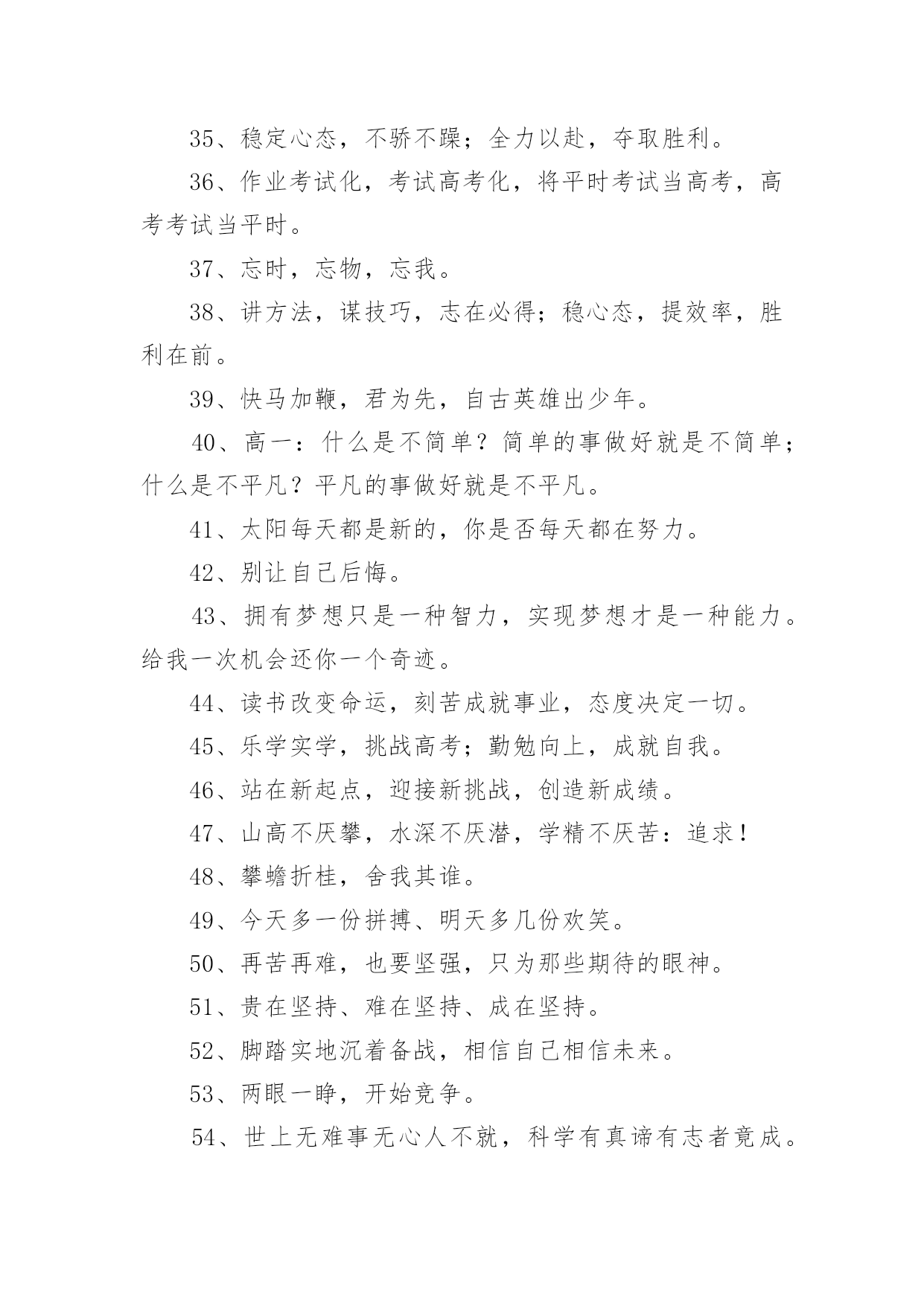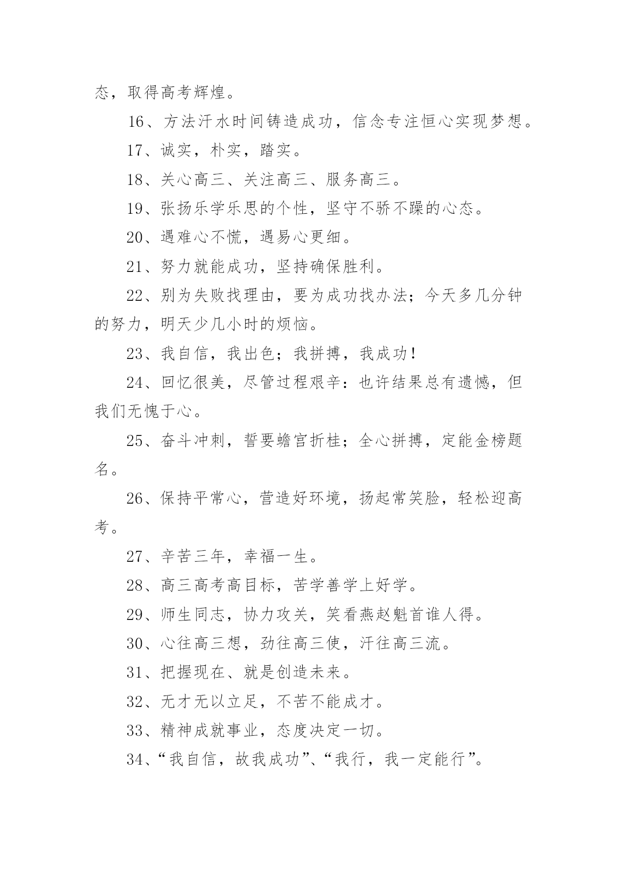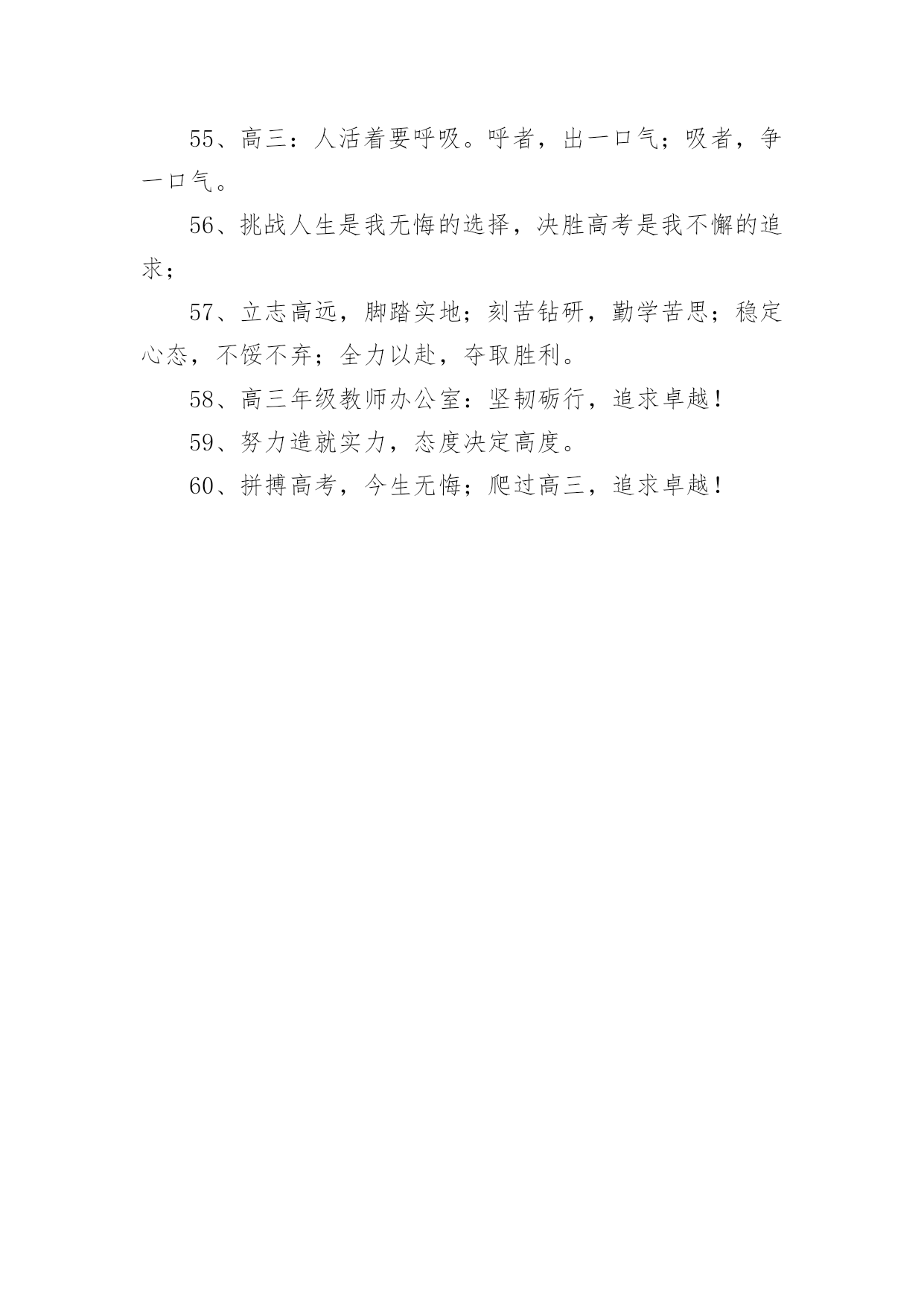 高三高考口号在日常学习、工作和生活中,说到口号,大家肯定都不陌生吧,口号一般简短有力,富节奏感,指示明确。那么什么样的口号才是好的口号呢?下面是小编帮大家整理的高三高考口号,欢迎阅读与收藏。1、不经风雨,怎见彩虹?2、有志者事竟成,破釜沉舟,百二秦关终属楚;苦心人天不负,卧薪尝胆,三千越甲可吞吴。3、争分夺秒巧复习,勤学苦练创佳绩。4、不敢高声语,恐惊读书人。5、送给高一、高二、高三学生的三句话。6、精神成人,知识成才,态度成全。7、不经风雨怎见彩虹;敢搏则过,爱拼才会赢!8、天道酬勤。9、宝剑锋从磨砺出,梅花香自苦寒来。10、狠抓基础是成功的基础,持之以恒是胜利的保证。11、我心飞翔,路在脚下。12、拧成一股绳,搏尽一份力,狠下一条心,共圆一个梦。13、胸怀远志奔理想,脚踏实地迎高考。14、学练并举,成竹在胸,敢问逐鹿群雄今何在?15、高二:弥补高一过失,铸就高二完美,进入高三状态,取得高考辉煌。16、方法汗水时间铸造成功,信念专注恒心实现梦想。17、诚实,朴实,踏实。18、关心高三、关注高三、服务高三。19、张扬乐学乐思的个性,坚守不骄不躁的心态。20、遇难心不慌,遇易心更细。21、努力就能成功,坚持确保胜利。22、别为失败找理由,要为成功找办法;今天多几分钟的努力,明天少几小时的烦恼。23、我自信,我出色;我拼搏,我成功!24、回忆很美,尽管过程艰辛:也许结果总有遗憾,但我们无愧于心。25、奋斗冲刺,誓要蟾宫折桂;全心拼搏,定能金榜题名。26、保持平常心,营造好环境,扬起常笑脸,轻松迎高考。27、辛苦三年,幸福一生。28、高三高考高目标,苦学善学上好学。29、师生同志,协力攻关,笑看燕赵魁首谁人得。30、心往高三想,劲往高三使,汗往高三流。31、把握现在、就是创造未来。32、无才无以立足,不苦不能成才。33、精神成就事业,态度决定一切。34、“我自信,故我成功”、“我行,我一定能行”。35、稳定心态,不骄不躁;全力以赴,夺取胜利。36、作业考试化,考试高考化,将平时考试当高考,高考考试当平时。37、忘时,忘物,忘我。38、讲方法,谋技巧,志在必得;稳心态,提效率,胜利在前。39、快马加鞭,君为先,自古英雄出少年。40、高一:什么是不简单?简单的事做好就是不简单;什么是不平凡?平凡的事做好就是不平凡。41、太阳每天都是新的,你是否每天都在努力。42、别让自己后悔。43、拥有梦想只是一种智力,实现梦想才是一种能力。给我一次机会还你一个奇迹。44、读书改变命运,刻苦成就事业,态度决定一切。45、乐学实学,挑战高考;勤勉向上,成就自我。46、站在新起点,迎接新挑战,创造新成绩。47、山高不厌攀,水深不厌潜,学精不厌苦:追求!48、攀蟾折桂,舍我其谁。49、今天多一份拼搏、明天多几份欢笑。50、再苦再难,也要坚强,只为那些期待的眼神。51、贵在坚持、难在坚持、成在坚持。52、脚踏实地沉着备战,相信自己相信未来。53、两眼一睁,开始竞争。54、世上无难事无心人不就,科学有真谛有志者竟成。55、高三:人活着要呼吸。呼者,出一口气;吸者,争一口气。56、挑战人生是我无悔的选择,决胜高考是我不懈的追求;57、立志高远,脚踏实地;刻苦钻研,勤学苦思;稳定心态,不馁不弃;全力以赴,夺取胜利。58、高三年级教师办公室:坚韧砺行,追求卓越!59、努力造就实力,态度决定高度。60、拼搏高考,今生无悔;爬过高三,追求卓越!