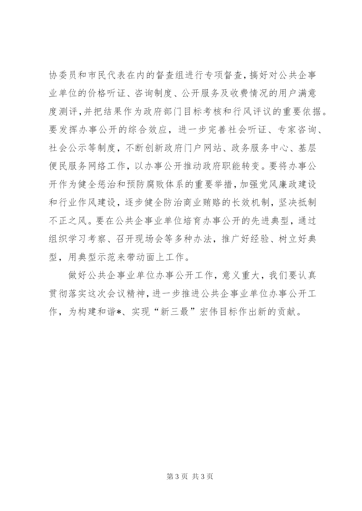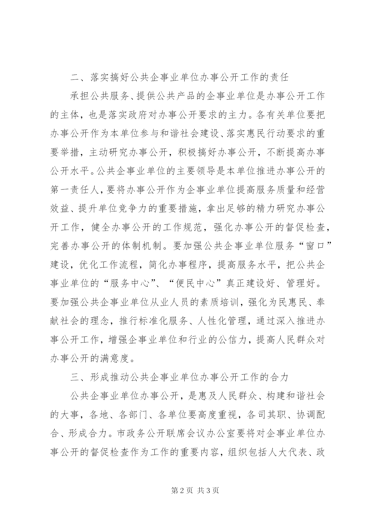 第PAGE\*Arabic\*MERGEFORMAT3页共NUMPAGES\*MERGEFORMAT3页公共企事业办事公开会议讲话一、加强对公共企事业单位办事公开工作的领导加强对公共企事业单位办事公开的领导是各级政府的重要职责,各级政府及其政务公开领导机构要把公共企事业单位办事公开工作放在重要位置,将其纳入全市政务公开的整体工作,切实加强领导,突出工作重点,强化工作督查,推动公共企事业单位办事公开的健康发展。政府有关部门是本系统公共企事业单位办事公开的主管部门,要切实担当起公共企事业单位办事公开的指导责任,下深水,对本系统企事业单位办事公开工作进行深入研究,提出推进办事公开工作的具体举措,推动本部门公共企事业单位办事公开工作的深入发展。当前特别要紧紧抓住学校、医疗、住房和电信、旅游、金融等行业存在的问题,下大力气解决“上学难、看病贵”和“信息不对称、资费不透明、监管不到位”等问题,紧紧抓住群众生产生活安全方面存在的隐患和问题,推动食品药品、生活环境、农用物资等方面存在的热点难点问题的有效解决。涉及公共服务的行业协会等组织,也要结合各自特点,开展多种形式的行业自律活动,推动本行业企事业单位办事公开工作的纵深发展。要认真贯彻《中华人民共和国政府信息公开条例》、《*市政府信息公开规定》,完善社情民意的沟通反馈机制,加强市长信箱、行风热线、政府网站工作,推进办事公开向制度化、规范化、科学化发展。二、落实搞好公共企事业单位办事公开工作的责任承担公共服务、提供公共产品的企事业单位是办事公开工作的主体,也是落实政府对办事公开要求的主力。各有关单位要把办事公开作为本单位参与和谐社会建设、落实惠民行动要求的重要举措,主动研究办事公开,积极搞好办事公开,不断提高办事公开水平。公共企事业单位的主要领导是本单位推进办事公开的第一责任人,要将办事公开作为企事业单位提高服务质量和经营效益、提升单位竞争力的重要措施,拿出足够的精力研究办事公开工作,健全办事公开的工作规范,强化办事公开的督促检查,完善办事公开的体制机制。要加强公共企事业单位服务“窗口”建设,优化工作流程,简化办事程序,提高服务水平,把公共企事业单位的“服务中心”、“便民中心”真正建设好、管理好。要加强公共企事业单位从业人员的素质培训,强化为民惠民、奉献社会的理念,推行标准化服务、人性化管理,通过深入推进办事公开工作,增强企事业单位和行业的公信力,提高人民群众对办事公开的满意度。三、形成推动公共企事业单位办事公开工作的合力公共企事业单位办事公开,是惠及人民群众、构建和谐社会的大事,各地、各部门、各单位要高度重视,各司其职、协调配合、形成合力。市政务公开联席会议办公室要将对企事业单位办事公开的督促检查作为工作的重要内容,组织包括人大代表、政协委员和市民代表在内的督查组进行专项督查,搞好对公共企事业单位的价格听证、咨询制度、公开服务及收费情况的用户满意度测评,并把结果作为政府部门目标考核和行风评议的重要依据。要发挥办事公开的综合效应,进一步完善社会听证、专家咨询、社会公示等制度,不断创新政府门户网站、政务服务中心、基层便民服务网络工作,以办事公开推动政府职能转变。要将办事公开作为健全惩治和预防腐败体系的重要举措,加强党风廉政建设和行业作风建设,逐步健全防治商业贿赂的长效机制,坚决抵制不正之风。要在公共企事业单位培育办事公开的先进典型,通过组织学习考察、召开现场会等多种办法,推广好经验、树立好典型,用典型示范来带动面上工作。做好公共企事业单位办事公开工作,意义重大,我们要认真贯彻落实这次会议精神,进一步推进公共企事业单位办事公开工作,为构建和谐*、实现“新三最”宏伟目标作出新的贡献。