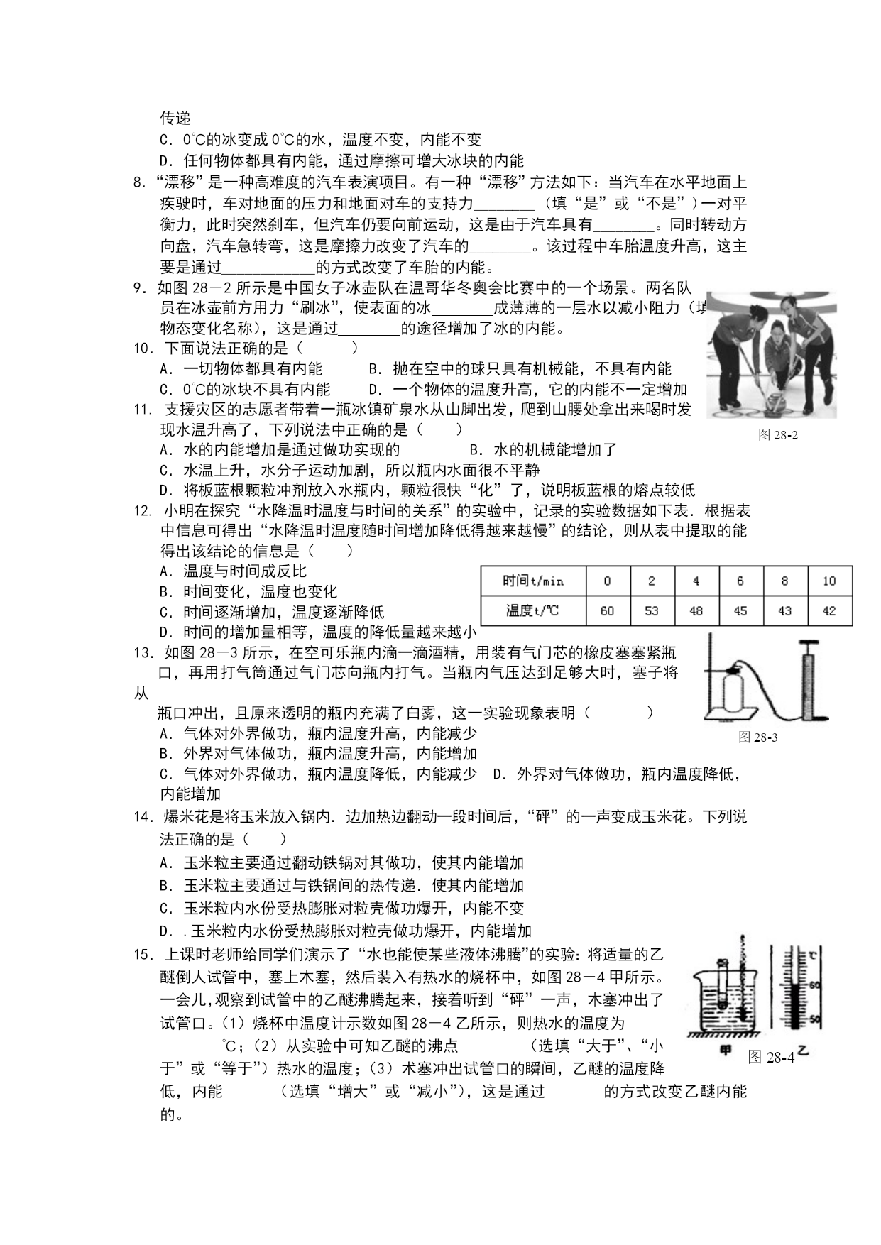 考点28分子动理论和内能基础知识梳理1.两种物质相互接触彼此进入对方的现象叫做_________;这种现象说明了,一切物体里的分子都在___________________.红墨水在热水里的扩散速度______在冷水里的扩散速度.由于分子的运动跟温度有关,所以这种无规则运动叫做分子的________________.2.分子间有___________,使得固体和液体能够保持一定的体积;由于分子间有____________,所以固体和液体很难被压缩。分子距离很小时,分子的作用力表现为__________;当分子的距离稍大时,分子的作用力表现为_________;如果分子相距很远时,作用力就变得很微弱,所以气体很容易被压缩.3.内能是指物体内部____________做____________运动所具有的动能和____________的总和.因为物质都是由分子组成的,并且分子在永不停息地做______________运动,分子之间总存在相互作用的______________和____________,因此可以肯定,一切物体都具有______.物体温度越高,物体内部分子的无规则运动越__________,物体的内能越________.内能是不同于机械能的一种能量的存在形式.机械能与整个物体______________的情况有关.内能与物体内部分子的_______________情况有关.4.物体内大量分子做无规则运动的激烈程度跟________________有关,当物体的温度升高时,它的内能________________;温度降低时,内能________________.5.内能从温度高的物体传给温度低的物体的过程叫做___________.在热传递的过程中,____________________________________叫热量;热量的单位是__________.6.改变内能的方法有________________和_____________两种,在改变内能方面它们是_________的;但它们的实质是不同的,热传递改变内能的实质是同一物体上温度不同的部分的能量___________过程;而做功改变物体内能的实质是_____________的转化过程.典例赏析例1:下列关于温度、内能、热量和做功的说法中,正确的是()A.物体温度降低,内能一定减少B.物体吸收热量,温度一定升高C.温度高的物体把温度传给温度低的物体D.一个物体温度升高,一定是物体对外做了功拓展延伸1:下列说法正确的是__________________A.物体的温度越高,所含热量越多B.温度高的物体,内能一定大C.0℃的冰块,内能一定为零D.温度相同的两物体间不会发生热传递E.钢水冷却,温度降低,内能一定不减少F.运动速度大的物体内能大G.物体对外做功其内能一定增大H.水的温度降低到0℃就会结冰I.温度相等的一杯水和一桶水的内能相同J.同一种晶体的熔点和凝固点不同K.一杯水放在高处比放在低处时具有的内能大L.给冰加热,冰的温度一定升高M.把5℃的水放入0℃的房间,水将会结冰N.物体吸收热量后,温度一定升高O.任何情况下冰的温度一定低于0℃P.物体内能增加,一定是吸收了热量Q.冰在熔化过程中比热容、内能、温度都不变R.物体在发生物态变化时都要吸热例2:下列关于能量转化的说法中,不正确的是()A.用砂轮磨刀时,内能转化为机械能。B.陨石进入大气层成为流星时,机械能转化为内能C.壶中水沸腾时,壶盖不停地跳动,内能转化为动能D.给车胎打气时,打气筒内空气内能转移到气筒上。图28-1拓展延伸2:将装有酒精的金属管固定在桌子上,并用塞子塞紧。快速来回拉动绕在管上的绳子,过一会儿塞子跳起来,如图28-1所示,则()A.拉动绳子过程,金属管温度升高,内能增加B.拉动绳子过程,管内酒精温度升高,蒸发加快C.塞子跳起时,管内气体温度升高,内能增加D.塞子跳起时,管内气体内能全部转化为塞子的机械能巩固练习1.夏日荷塘里荷花盛开,微风吹过,飘来阵阵花香,说明分子在;荷叶上的两滴露珠接触后合成一滴.表明分子间有力;风吹荷叶摇晃,说明力能.2.冬天孩子们围着火炉取暖,这是利用的方式获取内能;而远离火炉的孩子同时还要靠双手反复摩擦让手感到温暖,这是利用的方式增加了手的内能。给自行车打气时,气筒壁会发热,这是通过的方法使打气筒的内能增加的;反复弯折铁丝,弯折处会发烫,这是通过的方法使铁丝的内能增加的.(以上各空选填“做功”或“热传递”)3.救灾汽车正在公路上急驰,突然发现山体滑坡,紧急刹车。此时刹车片和轮胎都变热,汽车的机械能转化为___________能,这一过程是通过_____________实现的,但能量的总量是__