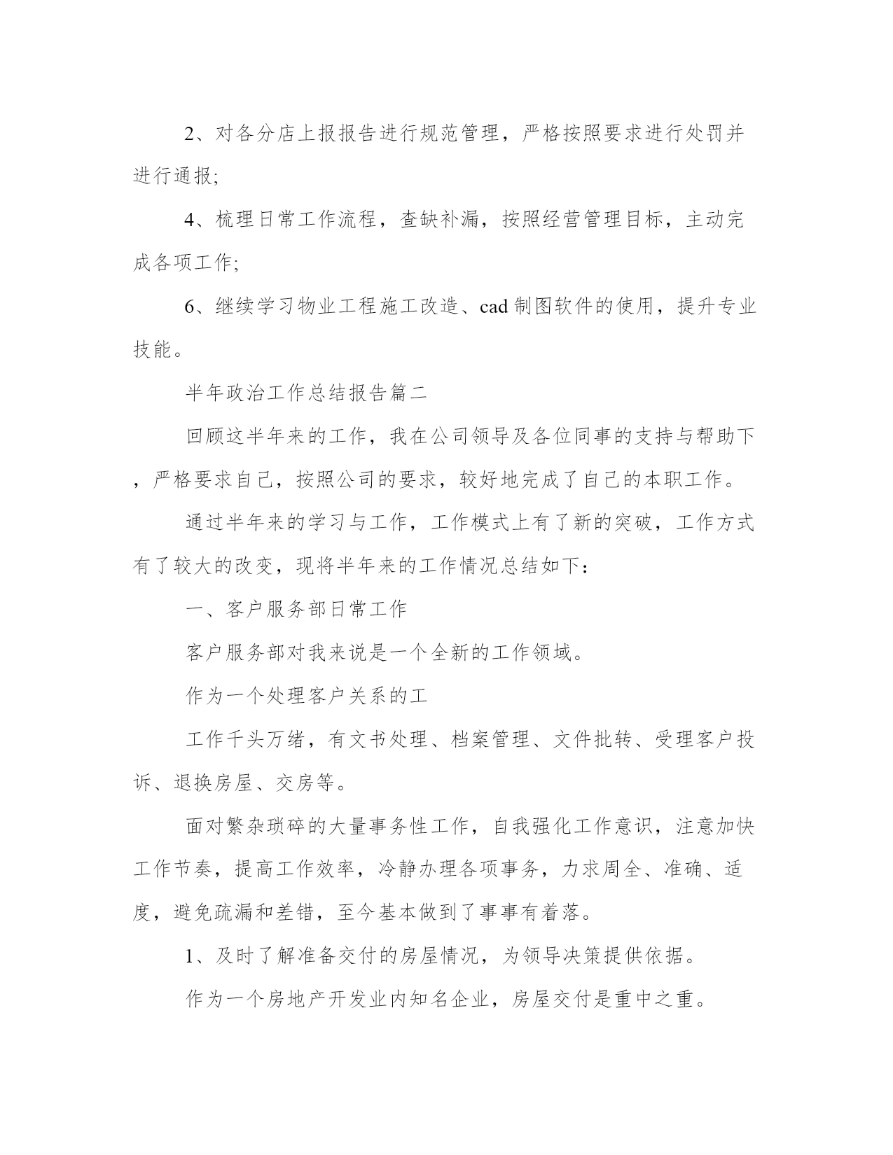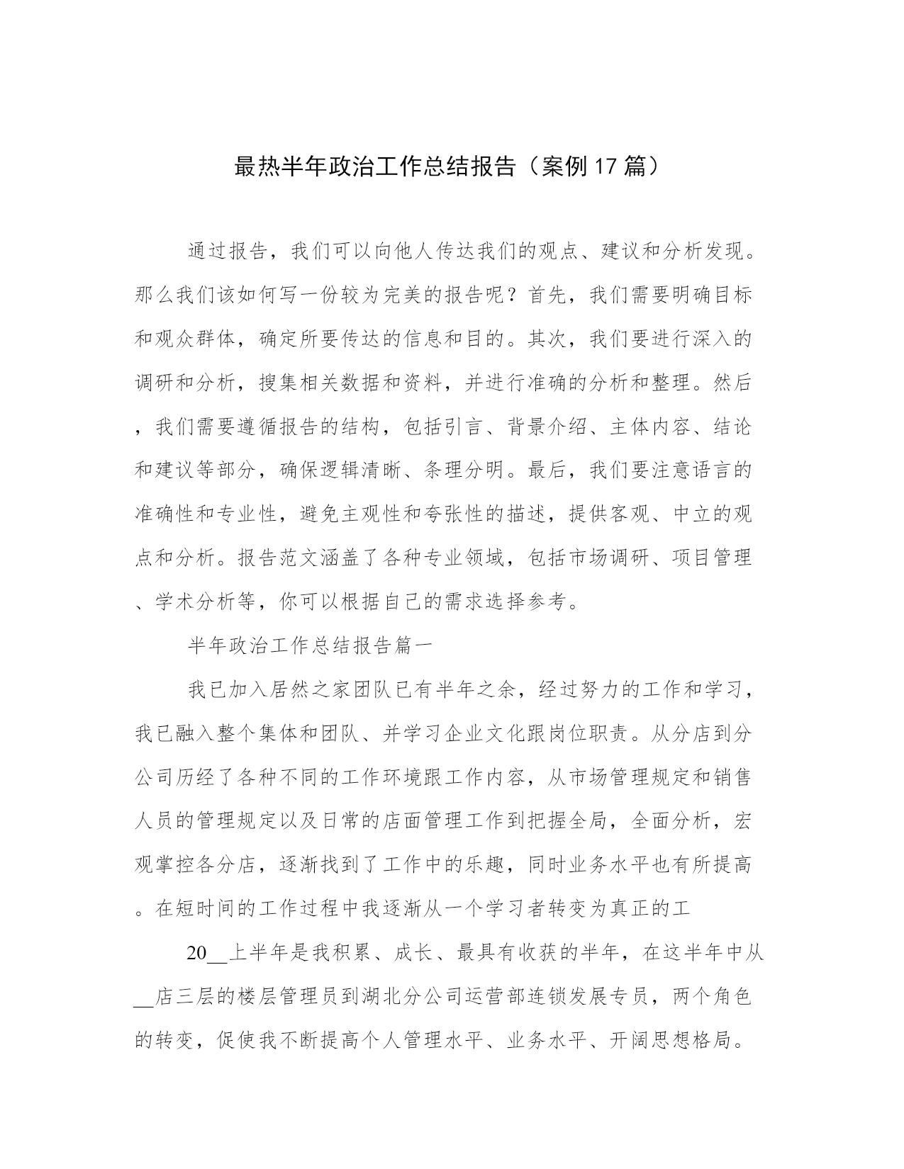 最热半年政治工作总结报告(案例17篇)通过报告,我们可以向他人传达我们的观点、建议和分析发现。那么我们该如何写一份较为完美的报告呢?首先,我们需要明确目标和观众群体,确定所要传达的信息和目的。其次,我们要进行深入的调研和分析,搜集相关数据和资料,并进行准确的分析和整理。然后,我们需要遵循报告的结构,包括引言、背景介绍、主体内容、结论和建议等部分,确保逻辑清晰、条理分明。最后,我们要注意语言的准确性和专业性,避免主观性和夸张性的描述,提供客观、中立的观点和分析。报告范文涵盖了各种专业领域,包括市场调研、项目管理、学术分析等,你可以根据自己的需求选择参考。半年政治工作总结报告篇一我已加入居然之家团队已有半年之余,经过努力的工作和学习,我已融入整个集体和团队、并学习企业文化跟岗位职责。从分店到分公司历经了各种不同的工作环境跟工作内容,从市场管理规定和销售人员的管理规定以及日常的店面管理工作到把握全局,全面分析,宏观掌控各分店,逐渐找到了工作中的乐趣,同时业务水平也有所提高。在短时间的工作过程中我逐渐从一个学习者转变为真正的工20__上半年是我积累、成长、最具有收获的半年,在这半年中从__店三层的楼层管理员到湖北分公司运营部连锁发展专员,两个角色的转变,促使我不断提高个人管理水平、业务水平、开阔思想格局。这半年的不断尝试中有挫折、有喜悦、有失败、有成功,现将今年上半年的工作情况及感受作出以下总结:一、__店工作情况:三月份之前我主要负责__店三楼的收费、销售、店面管理等日常管理工作。在工作中,我学会了如何抓住工作重点,并对工作的轻重缓急进行合理分工,能够保质保量的完成领导安排的各项工作。比如在收费工作中,秉承收支两条线,桥归桥路归路的原则,除了通过日常对账中的扣费,对于销售情况不理想,收费有困难的商户,做到心中有数,提前预警,提前催收。在完成销售的工作中,按照销售任务,参照去年同期销售数据,提前划分好每月每周的销售任务,及时并提前关注弱势区域及弱势品牌的销售,积极推动营销思路超前的强势品牌在卖场内不间断的举办促销活动,提高某一区域甚至整个卖场的人气。与其同时,积极与弱势品牌负责人进行沟通,提供帮助,给他们灌输先进的经营理念,利用我们的优势,积极组织弱势品牌形成联盟,帮助其提高销售。在对内工作方面主要协助部门负责人完成部门内各项工作。在店里做为楼层管理员,我只需完成所管区域内各项工作,然而现要在完成个人整体工作的同时,还要配合各部门、各店完成集团公司下达的各项经营管理目标。在此期间,我学会了梳理各项工作流程,对各项工作的时间节点进行把控,由原先被动的完成好领导交办的工作逐渐转变为主动的完成各项经营管理目标。并在大局观上有了新的认识,能够把工作落实到实处,可以提出合理化建议。在卖场管理工作中狠抓细节,通过日常检查,对问题详细记录,及时检查整改结果,不断提高卖场管理要求。对商户出现的违规问题首先提出整改要求,并按照居然之家的相关规定明确告知其违规的危害性,让商户发自内心的明白为什么居然之家对待现场管理是如此重视。在每天的例行巡场中,我都仔细观察每一家商户导购员的工服、卫生、价签、形象展示、样品陈列等,以此判断是否具备有良好的经营秩序。每次发现不妥的地方都会在第一时间上前指正并要求立即整改,以教育为主的方式不断提高商户的服务经营意识,通过勤检查,多监督的方式为顾客营造出良好的购物环境。培养导购员的微笑服务,整齐着装体现居然之家销售员的优质精神面貌,让顾客在居然之家购物的同时能够感受到“五星级”卖场的服务氛围,使消费者买的放心,用的舒心。在售后问题的处理过程中,根据实际情况严格按照居然之家对待顾客投诉的管理有关规定进行相关处理,切实履行了首问责任制,利用晨会等形式不间断的向商户宣传居然之家的服务理念,通过“软实力”的打造不断提升服务水平,强化商户诚信守诺的服务态度。要求商户在遇到顾客投诉后,首先无论责任在哪一方都要能够全力解决好的服务态度。顾客不会无缘无故投诉,因此商家应该做到的第一步就是耐心的接待,热心的帮助顾客解决问题。在双方同时存在问题僵持不下的情况下按照居然之家的“五大服务承诺”,坚决协助顾客按“居然销售合同”维权条款,为顾排忧解难,努力保证了该区域无任何重大投诉,杜绝了一切可能因为投诉而给居然之家造成负面影响的事情,维护了企业的口碑。通过服务理念的不断深入,使商户一改往日生硬的服务态度,表现好的我们就大力赞扬,在商户中树立了一批优秀的服务型标兵。尽最大努力提高自己,不断将居然之家的“服务理念”一直贯彻下去。二、华中分公司运营管理部工作情况:由于分店领导的推荐和分公司领导提携,我从三月中旬由__店业务部调至华中分公司运营管理部,担任连锁拓展专员一职。在这一个多月中,对于我的成长是非常重要的一段时间,在分公司我将眼