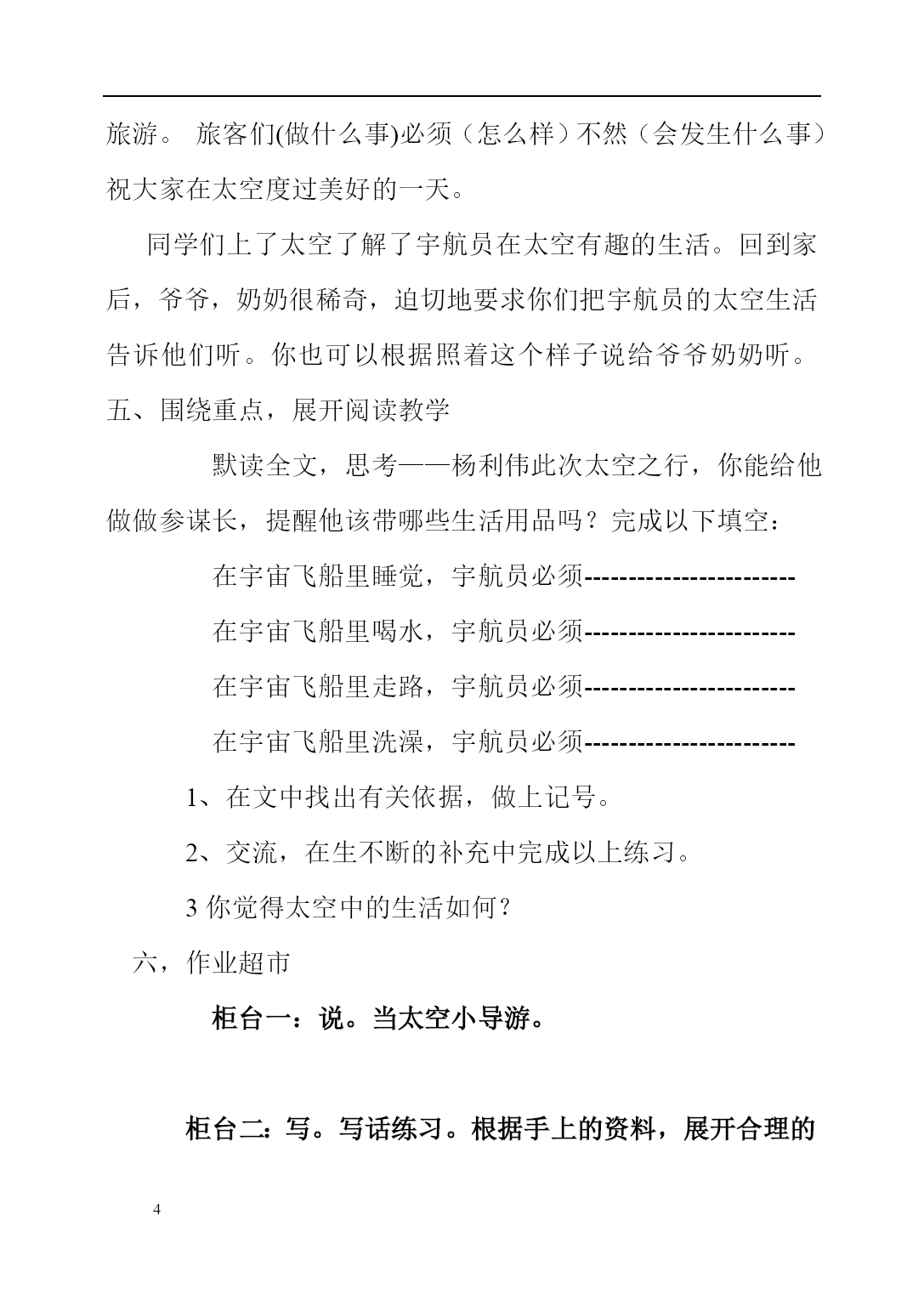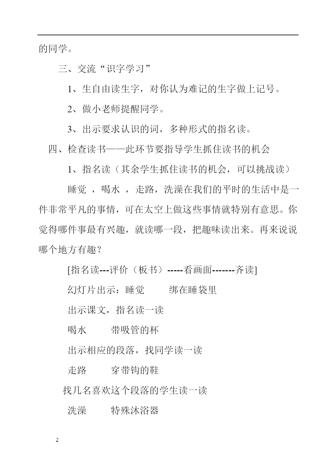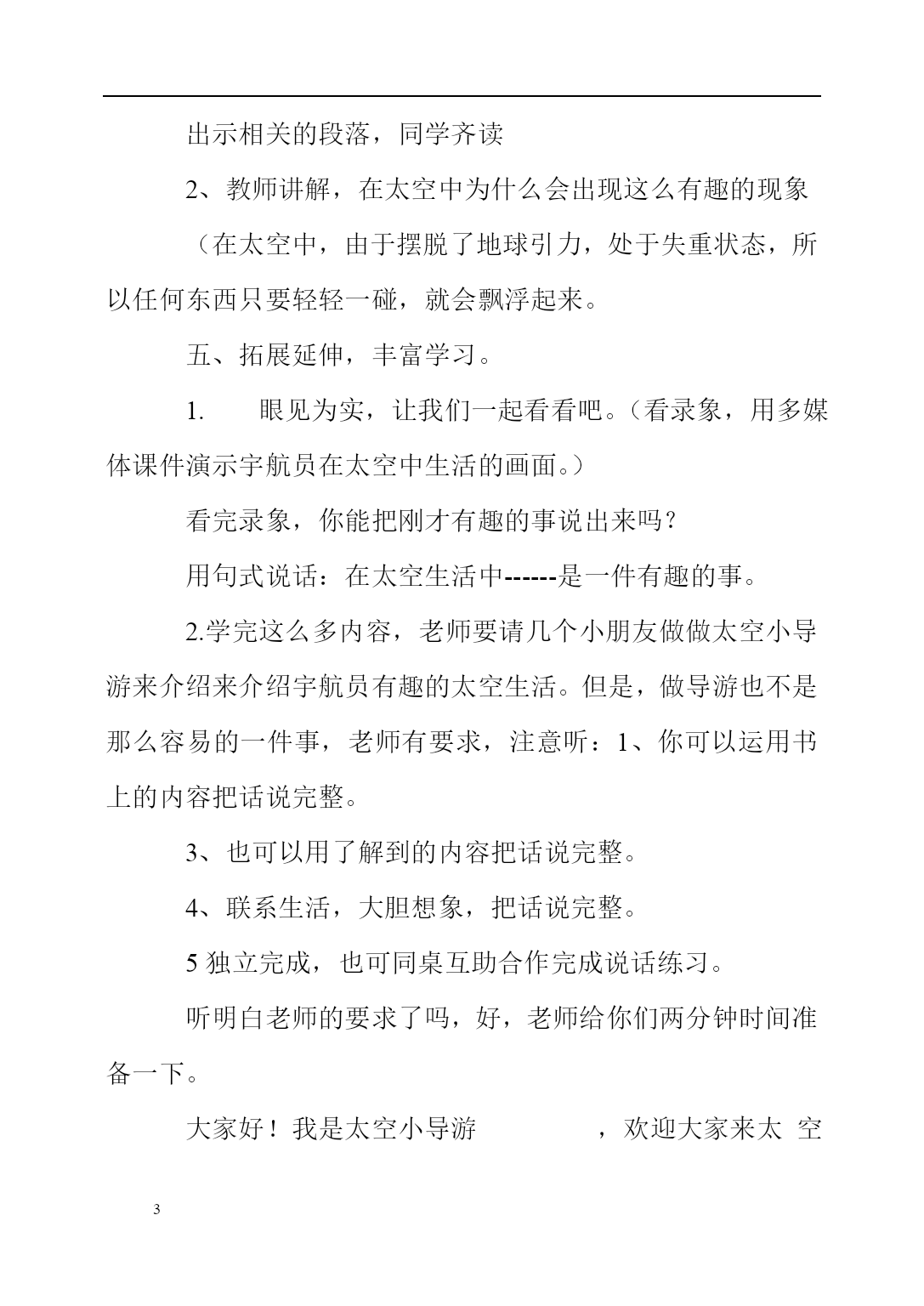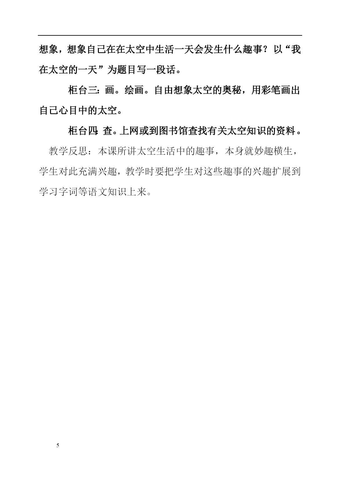PAGE5《太空生活趣事多》教案设计理念:充分利用学生的好奇心,引导他们把课文读好,使他们在了解一些航天知识的同时,接受语言文字的训练。教学目标:1、认识14个生字,会写8个字。2、有感情地朗读课文,读出新奇、有趣的语气。3、初步了解一些太空生活的常识,激发了解科技的兴趣。教学环节设计:一、激趣导入出示杨利伟乘坐神州5号遨游太空的课件,让孩子说说心里话之后,师导入新课——今天我们没有神州5号可坐,只能在文中遨游太空了。那么宇航员在太空中究竟是怎样生活的呢?我们到文中找答案。二、引导学生自由读文提出读书要求:把课文读正确,不认识的字请教身边的同学。三、交流“识字学习”1、生自由读生字,对你认为难记的生字做上记号。2、做小老师提醒同学。3、出示要求认识的词,多种形式的指名读。四、检查读书——此环节要指导学生抓住读书的机会1、指名读(其余学生抓住读书的机会,可以挑战读)睡觉,喝水,走路,洗澡在我们的平时的生活中是一件非常平凡的事情,可在太空上做这些事情就特别有意思。你觉得哪件事最有兴趣,就读哪一段,把趣味读出来。再来说说哪个地方有趣?[指名读---评价(板书)-----看画面-------齐读]幻灯片出示:睡觉绑在睡袋里出示课文,指名读一读喝水带吸管的杯出示相应的段落,找同学读一读走路穿带钩的鞋找几名喜欢这个段落的学生读一读洗澡特殊沐浴器出示相关的段落,同学齐读2、教师讲解,在太空中为什么会出现这么有趣的现象(在太空中,由于摆脱了地球引力,处于失重状态,所以任何东西只要轻轻一碰,就会飘浮起来。五、拓展延伸,丰富学习。1.眼见为实,让我们一起看看吧。(看录象,用多媒体课件演示宇航员在太空中生活的画面。)看完录象,你能把刚才有趣的事说出来吗?用句式说话:在太空生活中------是一件有趣的事。2.学完这么多内容,老师要请几个小朋友做做太空小导游来介绍来介绍宇航员有趣的太空生活。但是,做导游也不是那么容易的一件事,老师有要求,注意听:1、你可以运用书上的内容把话说完整。3、也可以用了解到的内容把话说完整。4、联系生活,大胆想象,把话说完整。5独立完成,也可同桌互助合作完成说话练习。听明白老师的要求了吗,好,老师给你们两分钟时间准备一下。大家好!我是太空小导游,欢迎大家来太空旅游。旅客们(做什么事)必须(怎么样)不然(会发生什么事)祝大家在太空度过美好的一天。同学们上了太空了解了宇航员在太空有趣的生活。回到家后,爷爷,奶奶很稀奇,迫切地要求你们把宇航员的太空生活告诉他们听。你也可以根据照着这个样子说给爷爷奶奶听。五、围绕重点,展开阅读教学默读全文,思考——杨利伟此次太空之行,你能给他做做参谋长,提醒他该带哪些生活用品吗?完成以下填空:在宇宙飞船里睡觉,宇航员必须------------------------在宇宙飞船里喝水,宇航员必须------------------------在宇宙飞船里走路,宇航员必须------------------------在宇宙飞船里洗澡,宇航员必须------------------------1、在文中找出有关依据,做上记号。2、交流,在生不断的补充中完成以上练习。3你觉得太空中的生活如何?六,作业超市柜台一:说。当太空小导游。柜台二:写。写话练习。根据手上的资料,展开合理的想象,想象自己在在太空中生活一天会发生什么趣事?以“我在太空的一天”为题目写一段话。柜台三:画。绘画。自由想象太空的奥秘,用彩笔画出自己心目中的太空。柜台四:查。上网或到图书馆查找有关太空知识的资料。教学反思:本课所讲太空生活中的趣事,本身就妙趣横生,学生对此充满兴趣,教学时要把学生对这些趣事的兴趣扩展到学习字词等语文知识上来。