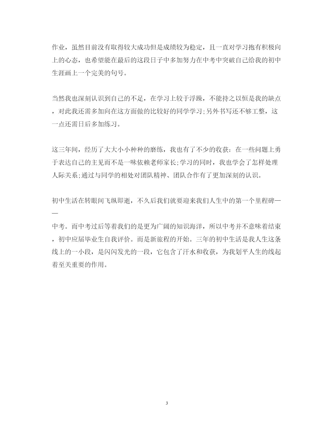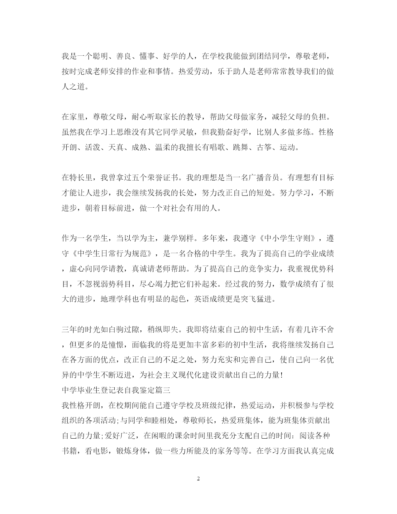 此资料由网络收集而来,如有侵权请告知上传者立即删除。资料共分享,我们负责传递知识。PAGEPAGE3中学毕业生登记表自我鉴定毕业季到了,中专的学生也毕业了,在毕业之前,中专毕业生要填好毕业登记表中的自我鉴定,可以提高对自己的了解,从而提高个人的能力。下面由本小编精心整理的中学毕业生登记表自我鉴定,希望可以帮到你哦!中学毕业生登记表自我鉴定篇一初中三年的学习中刻苦努力,知进取,做到课前预习,课上认真听讲,课后复习。学习是一件追求完美的事情,因此我及时弥补不懂不会的漏洞,在学习上做一个“完人”,不会让问题周而复始的叠加,从而造成人生的败笔和遗憾,有自己的学习方法,并在学习中不断寻求新的适合自己的高效的学习方法,从而提高学习效率和成绩。我深知学习的基础是要先学会做人,做一个有知识、有文化、有理想、有抱负的青少年,因此我严格要求自己的言行举止,尊敬师长,团结同学,关心集体。同时我作为班长,是班中的凝聚点,所以更加以身作则,积极地参加班级、学校组织的各项活动,并有序的组织同学加入其中,替老师分担班中的事务,做老师的得力助手。青春光阴匆匆,我已由刚升入初中的懵懂的男孩儿成长为了一名全面发展的优秀的共青团员。我坚信时间会证明一切,同时也会带走一切,所以我会更加珍惜今天的光阴,以百分之百的精神迎接美好的明天。中学毕业生登记表自我鉴定篇二三年的初中校园生活是我人生的一大转折点。我于xxxx年9月以优异的成绩考入xx中学。三年的校园生涯和社会实践生活我不断的挑战自我、充实自己,为实现人生的价值打下坚实的基础。我是一个聪明、善良、懂事、好学的人,在学校我能做到团结同学,尊敬老师,按时完成老师安排的作业和事情。热爱劳动,乐于助人是老师常常教导我们的做人之道。在家里,尊敬父母,耐心听取家长的教导,帮助父母做家务,减轻父母的负担。虽然我在学习上思维没有其它同学灵敏,但我勤奋好学,比别人多做多练。性格开朗、活泼、天真、成熟、温柔的我擅长有唱歌、跳舞、古筝、运动。在特长里,我曾拿过五个荣誉证书。我的理想是当一名广播音员。有理想有目标才能让人进步,我会继续发扬我的长处,努力改正自己的短处。努力学习,不断进步,朝着目标前进,做一个对社会有用的人。作为一名学生,当以学为主,兼学别样。多年来,我遵守《中小学生守则》,遵守《中学生日常行为规范》,是一名合格的中学生。我为了提高自己的学业成绩,虚心向同学请教,真诚请老师帮助。为了提高自己的竞争实力,我重视优势科目,不忽视弱势科目,尽心竭力把它们补起来。经过我的努力,数学成绩有了很大的进步,地理学科也有明显的起色,英语成绩更是突飞猛进。三年的时光如白驹过隙,稍纵即失。我即将结束自己的初中生活,有着几许不舍,但更多的是憧憬,面临我的将是更加丰富多彩的初中生活,我将继续发扬自己在各方面的优点,改正自己的不足之处,努力充实和完善自己,使自己向一名优异的中学生不断迈进,为社会主义现代化建设贡献出自己的力量!中学毕业生登记表自我鉴定篇三我性格开朗,在校期间能自己遵守学校及班级纪律,热爱运动,并积极参与学校组织的各项活动;与同学和睦相处,尊敬师长,热爱班集体,能为班集体贡献出自己的力量;爱好广泛,在闲暇的课余时间里我充分支配自己的时间:阅读各种书籍,看电影,锻炼身体,做一些力所能及的家务等等。在学习方面我认真完成作业,虽然目前没有取得较大成功但是成绩较为稳定,且一直对学习抱有积极向上的心态,也希望能在最后的这段日子中多加努力在中考中突破自己给我的初中生涯画上一个完美的句号。当然我也深刻认识到自己的不足,在学习上较于浮躁,不能持之以恒是我的缺点,对此我还需多加向在这方面做的比较好的同学学习;另外书写还不够工整,这一点还需日后多加练习。这三年间,经历了大大小小种种的磨练,我也有了不少的收获:在一些问题上勇于表达自己的主见而不是一味依赖老师家长;学习的同时,我也学会了怎样处理人际关系;通过与同学的相处对团队精神、团队合作有了更加深刻的认识。初中生活在转眼间飞纵即逝,不久后我们就要迎来我们人生中的第一个里程碑——中考。而中考过后等着我们的是更为广阔的知识海洋,所以中考并不意味着结束,初中应届毕业生自我评价。而是新旅程的开始。三年的初中生活是我人生这条线上的一小段,是闪闪发光的一段,它包含了汗水和收获,为我划平人生的线起着至关重要的作用。