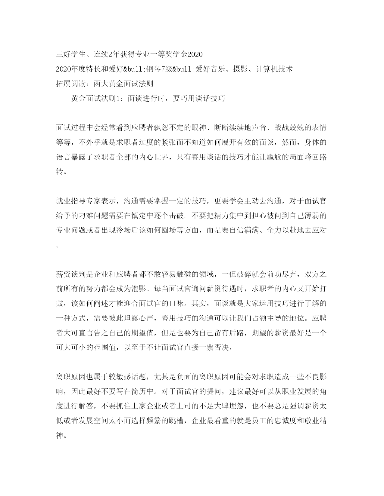 此资料由网络收集而来,如有侵权请告知上传者立即删除。资料共分享,我们负责传递知识。工商管理专业的工作简历模板面试是求职过程的最关键的一步,一份不错的工作简历可以帮你争取到不少面试机会,但是面试时主要还是要靠你的现场发挥!下面为大家提供工商管理专业的工作简历模板,以供参考!工商管理专业的工作简历模板电话:(+86)13xxxxxxxxxx电子邮件:XXX@.com地址:上海乔布区乔布东路婚姻状况:未婚求职城市:上海知乎ID:xxx求职意向人事专员/人力资源相关岗位教育经历乔布大学管理学院工商管理专业本科2020.09-2020.06乔布堂大学外语学院英语辅修2020.09-2020.06社团活动上海展览馆人事助理2020.09-至今•负责会展人员调动、人事工作安排、场馆分配等助理工作•筛选简历,分类整理候选人材料•协助培训部经理进行培训规划、人员开发校广播电视中心负责人2020.09-至今•建立主持人”;租用”;制度,使学校各晚会活动主持人出台主持的规范化•通过调研,建立起时段长、节目负责人、模块负责人由下至上的节目审核制•组织和协调50人的工作,搭建校广电中心的组织架构,建立管理准则上海图书馆志愿者活动团体负责人上图志愿队组长助理2020.09-2020.08•宣传志愿活动、招募选拔组员并进行培训•处理突发事件、组织协调管理人事调动•与上图志愿者管理方协调解决志愿过程中暴露的问题•任职期间,所带团队每年获上图志愿”;先进集体”;称号,个人获”;优秀组织者”;称号上海大学信息学院学生会办公室部干事2020.09-2020.08•在校园里推广和宣传,受到广泛欢迎•处理好学生会的经费,与负责老师保持良好的协商•与每个部门进行良好的沟通与交流,收集人员考核表语言和计算机能力大学英语六级(CET6)通过计算机等级考试3级(数据库)通过MSOffice办公套件、Photoshop,Dreamweaver熟练使用获奖经历•市优秀毕业生(TOP0.05%)2020.06•校三好学生、连续2年获得专业一等奖学金2020-2020年度特长和爱好•钢琴7级•爱好音乐、摄影、计算机技术拓展阅读:两大黄金面试法则黄金面试法则1:面谈进行时,要巧用谈话技巧面试过程中会经常看到应聘者飘忽不定的眼神、断断续续地声音、战战兢兢的表情等等,不外乎就是求职者过度的紧张而不知道如何展开有效的面谈,然而,身体的语言暴露了求职者全部的内心世界,只有善用谈话的技巧才能让尴尬的局面峰回路转。就业指导专家表示,沟通需要掌握一定的技巧,更要学会主动去沟通,对于面试官给予的刁难问题需要在镇定中逐个击破。不要把精力集中到担心被问到自己薄弱的专业问题或者出现冷场后该如何圆场等方面,而是要自信满满、全力以赴地去应对。薪资谈判是企业和应聘者都不敢轻易触碰的领域,一但破碎就会前功尽弃,双方之前所有的努力都会成为泡影。每当面试官询问薪资待遇时,求职者的内心又开始打鼓,该如何阐述才能迎合面试官的口味。其实,面谈就是大家运用技巧进行了解的一种方式,需要彼此坦露心声,善用技巧的沟通可以让我们占领主导的地位。应聘者大可直言告之自己的期望值,但是也要为自己留有后路,期望的薪资最好是一个可大可小的范围值,以至于不让面试官直接一票否决。离职原因也属于较敏感话题,尤其是负面的离职原因可能会对求职造成一些不良影响,因此最好不要写在简历中。对于面试官的提问,建议最好可以从职业发展的角度进行解答,不要抓住上家企业或者上司的不足大肆埋怨,也不要总是强调薪资太低或者发展空间太小而选择频繁的跳槽,企业最看重的就是员工的忠诚度和敬业精神。就业指导专家表示,深受企业HR青睐的应聘者并不一定在于你是否是名牌大学毕业的、是否有非常丰富的实战经验、是否有多么华丽的外表,而可能更在乎的是你的面试细节。对于面试,要做好充分准备,只有你在意了、重视了,有一个好的求职的心态才有可能做好一件事情,真正能吸引HR眼球。所以,做好面试前的准备工作,依据自身的职业爱好和兴趣设计好匹配的职业发展路线,制作一份完整的简历,客观地表达出你的真实想法,才能成为HR眼中的亮点,才能备受HR的青睐。黄金面试法则2:面谈前夕,要注重职场礼仪职场的基本礼仪不仅可以增加求职者的职业素养,也会体现出应聘的诚意。就业指导专家表示,大多数的求职者在技能方面不相上下,但是企业在招聘过程中除了看重专业优势以外,更关注员工的外在能力。首先,对于约定好的面试时间,应聘者需要整理好面部表情以及着装后提前十五分钟到场熟悉环境,一定要身着正装,到场后不要因为紧张大肆东张西望而留下不好印象。