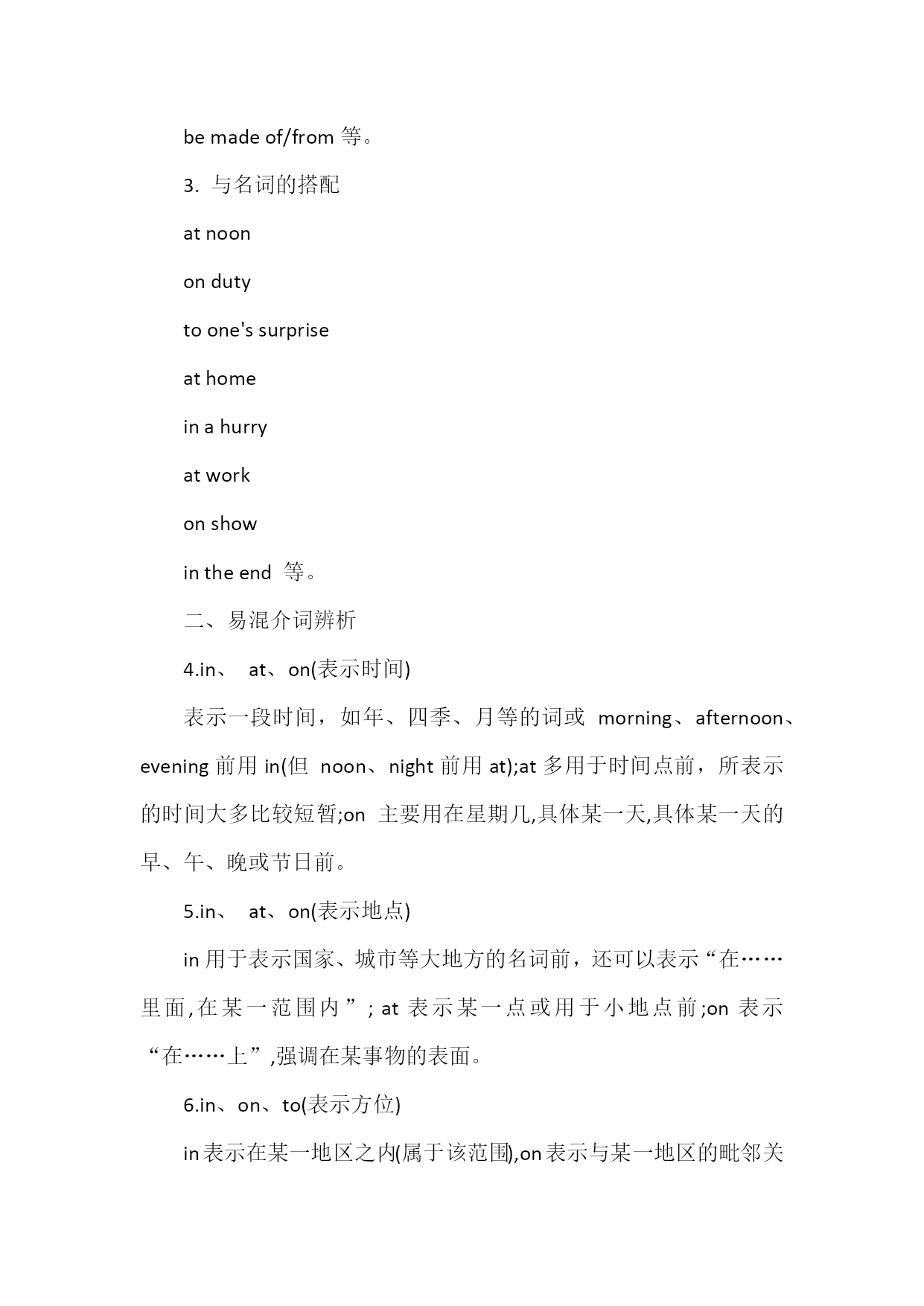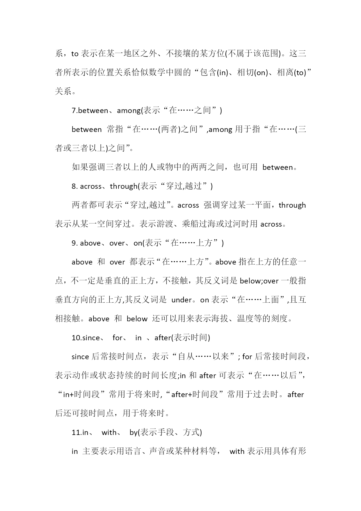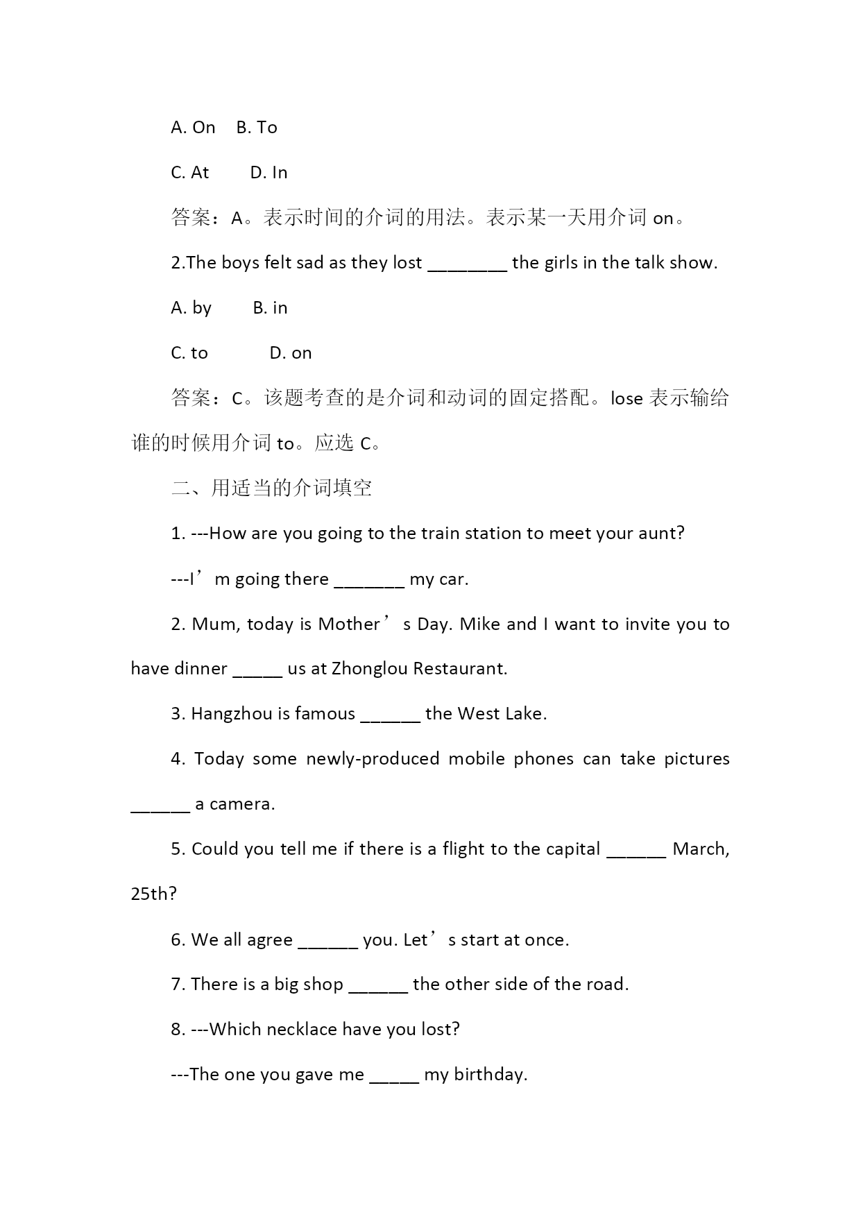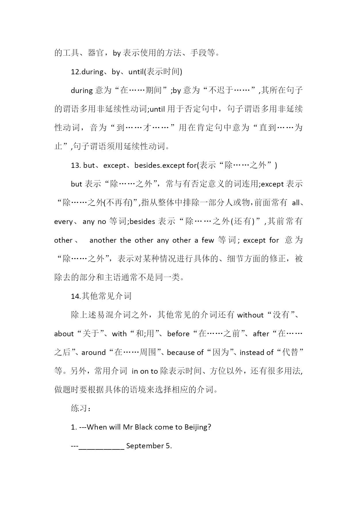 中考英语介词的用法及练习介词介词是一种虚词,用来表示名词或相当于名词的其它词语句中其它词的关系,不能单独使用。介词可与名词或相当于名词的其它词构成介词短语。介词短语可在句中作定语,状语,表语和宾语补足语。例如:TheboyoverthereisJohn’sbrother.(定语)Thegirlwillbebackintwohours.(状语)OurEnglishteacherisfromAustralia.(表语)Helpyourselftosomefish.(宾语补足语)一、常见介词的固定搭配1.与形容词的搭配bestrictwithbeproudofbeangrywithbebusywithbegoodat等2.与动词的搭配lookatarrivein/atlookaftercatchupwithbemadeof/from等。3.与名词的搭配atnoonondutytoone'ssurpriseathomeinahurryatworkonshowintheend等。二、易混介词辨析4.in、at、on(表示时间)表示一段时间,如年、四季、月等的词或morning、afternoon、evening前用in(但noon、night前用at);at多用于时间点前,所表示的时间大多比较短暂;on主要用在星期几,具体某一天,具体某一天的早、午、晚或节日前。5.in、at、on(表示地点)in用于表示国家、城市等大地方的名词前,还可以表示“在……里面,在某一范围内”;at表示某一点或用于小地点前;on表示“在……上”,强调在某事物的表面。6.in、on、to(表示方位)in表示在某一地区之内(属于该范围),on表示与某一地区的毗邻关系,to表示在某一地区之外、不接壤的某方位(不属于该范围)。这三者所表示的位置关系恰似数学中圆的“包含(in)、相切(on)、相离(to)”关系。7.between、among(表示“在……之间”)between常指“在……(两者)之间”,among用于指“在……(三者或三者以上)之间”。如果强调三者以上的人或物中的两两之间,也可用between。8.across、through(表示“穿过,越过”)两者都可表示“穿过,越过”。across强调穿过某一平面,through表示从某一空间穿过。表示游渡、乘船过海或过河时用across。9.above、over、on(表示“在……上方”)above和over都表示“在……上方”。above指在上方的任意一点,不一定是垂直的正上方,不接触,其反义词是below;over一般指垂直方向的正上方,其反义词是under。on表示“在……上面”,且互相接触。above和below还可以用来表示海拔、温度等的刻度。10.since、for、in、after(表示时间)since后常接时间点,表示“自从……以来”;for后常接时间段,表示动作或状态持续的时间长度;in和after可表示“在……以后”,“in+时间段”常用于将来时,“after+时间段”常用于过去时。after后还可接时间点,用于将来时。11.in、with、by(表示手段、方式)in主要表示用语言、声音或某种材料等,with表示用具体有形的工具、器官,by表示使用的方法、手段等。12.during、by、until(表示时间)during意为“在……期间”;by意为“不迟于……”,其所在句子的谓语多用非延续性动词;until用于否定句中,句子谓语多用非延续性动词,音为“到……才……”用在肯定句中意为“直到……为止”,句子谓语须用延续性动词。13.but、except、besides.exceptfor(表示“除……之外”)but表示“除……之外”,常与有否定意义的词连用;except表示“除……之外(不再有)”,指从整体中排除一部分人或物,前面常有all、every、anyno等词;besides表示“除……之外(还有)”,其前常有other、anothertheotheranyotherafew等词;exceptfor意为“除……之外”,表示对某种情况进行具体的、细节方面的修正,被除去的部分和主语通常不是同一类。14.其他常见介词除上述易混介词之外,其他常见的介词还有without“没有”、about“关于”、with“和;用”、before“在……之前”、after“在……之后”、around“在……周围”、becauseof“因为”、insteadof“代替”等。另外,常用介词inonto除表示时间、方位以外,还有很多用法,做题时要根据具体的语境来选择相应的介词。练习:1.---Whenwill